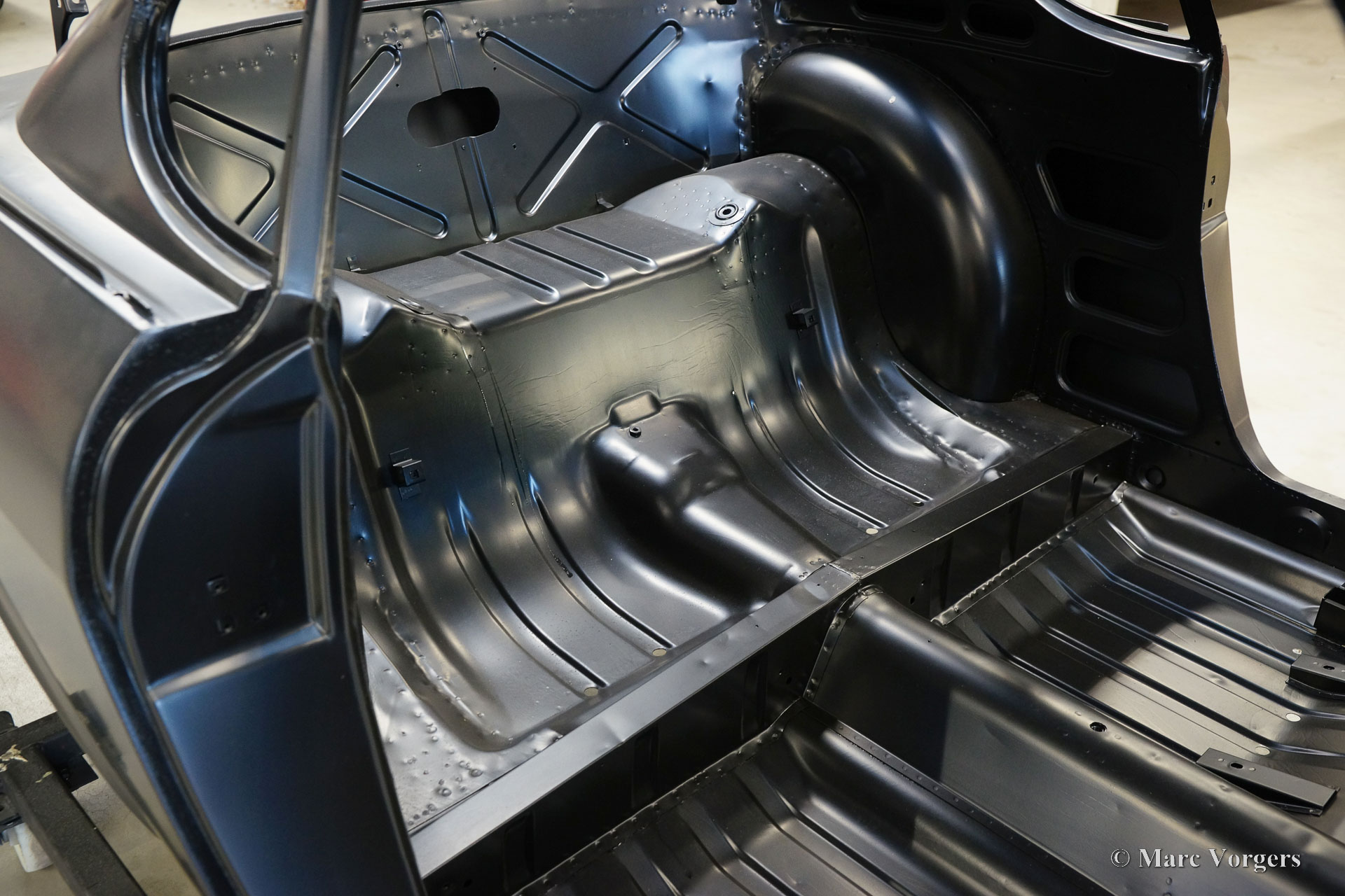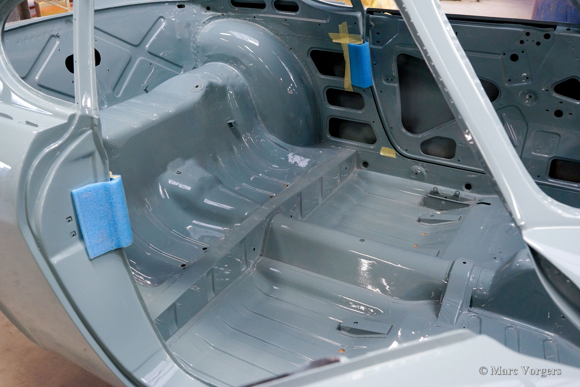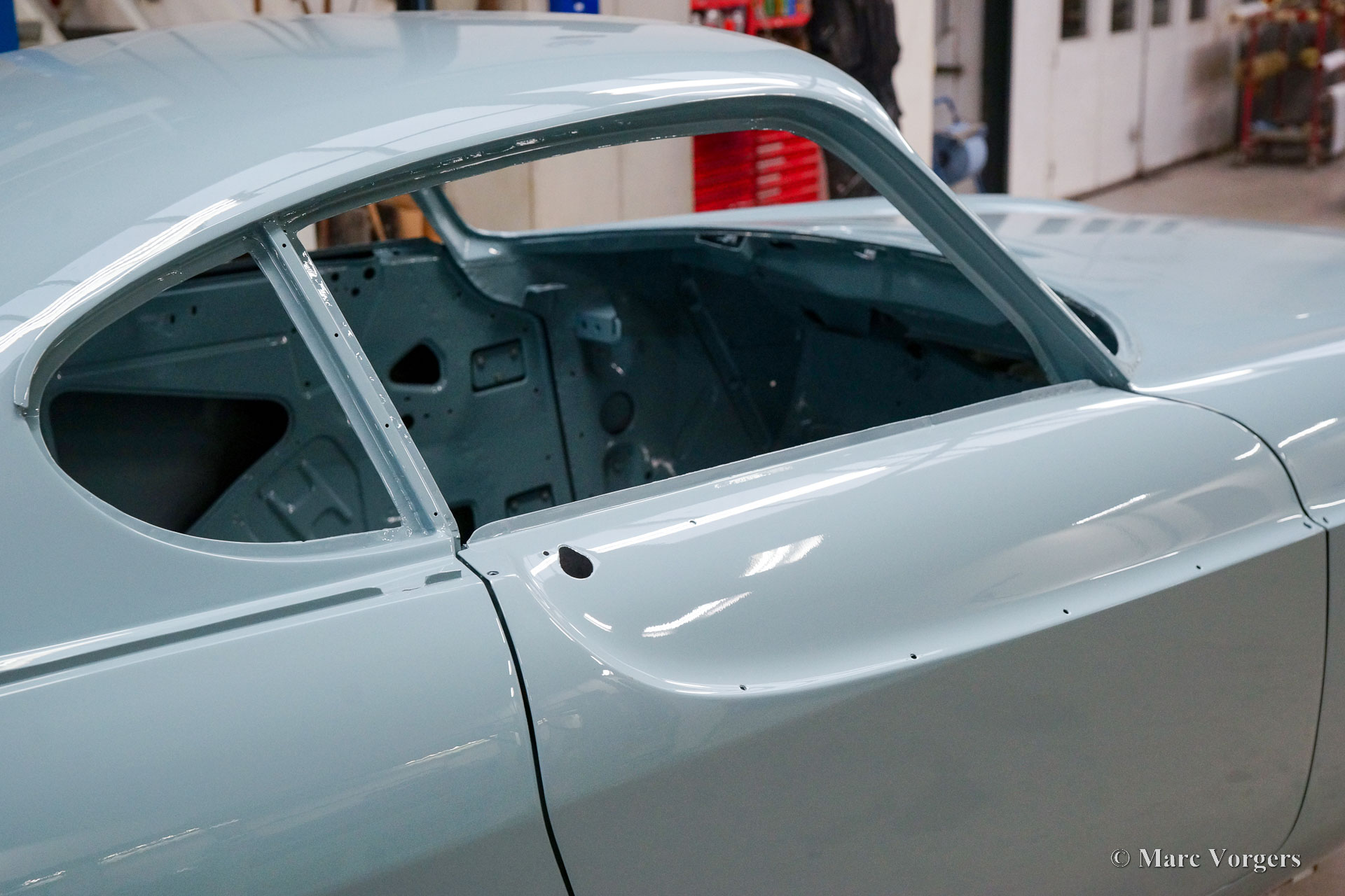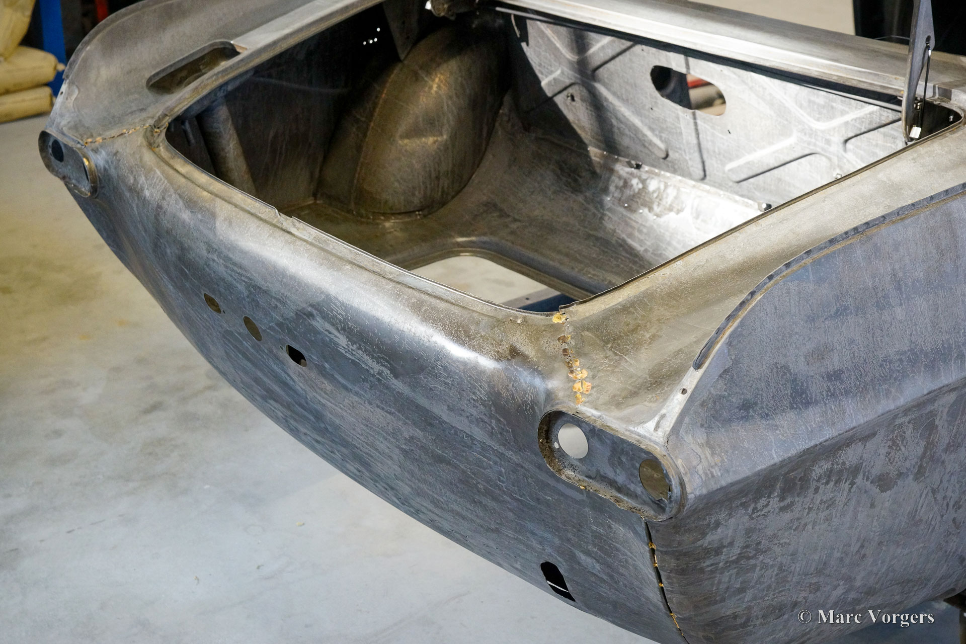 The body of this Volvo P1800 S was restored to brand new condition by Classic Job. The car was delivered stripped, and all glue residues and underbody protection have been removed. The bodywork was then completely stripped of paint in a paint stripping bath. The body proved to be in a beautiful and rust-free condition. Some sheet metal work was carried out. Both rear fenders showed poorly repaired minor collision damage which needed to be repaired. The rear panel between the rear lamps was replaced because of an earlier bad repair. After the sheet metal work was completed the bodywork was given a KTL coating in which the body was completely immersed in a special bath leaving a black coating on every metal surface inside and out and in every seam. After that the bodywork was smoothened, primed, and given a perfect new paint system. The Volvo P1800 S is being completed by the owner.