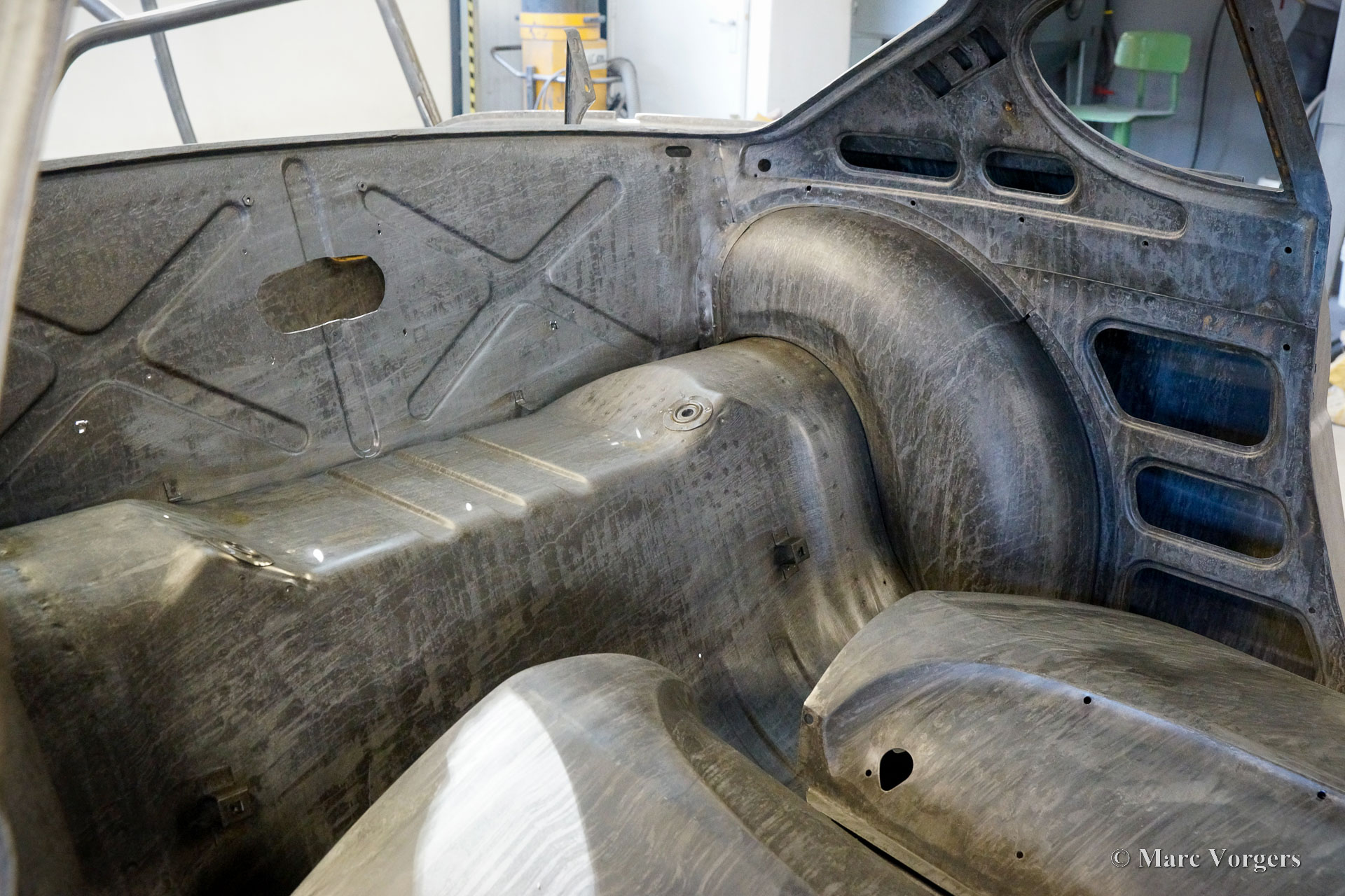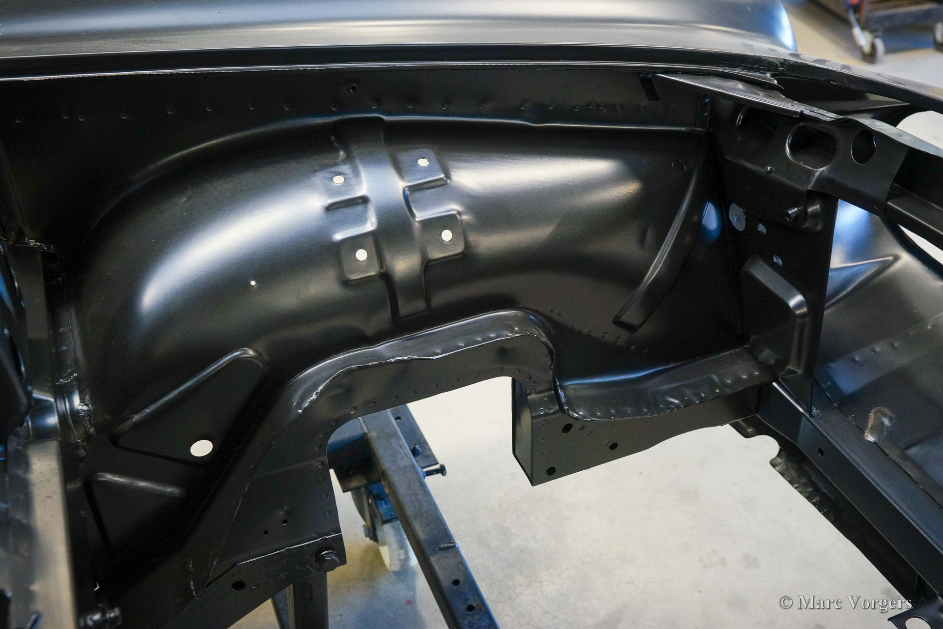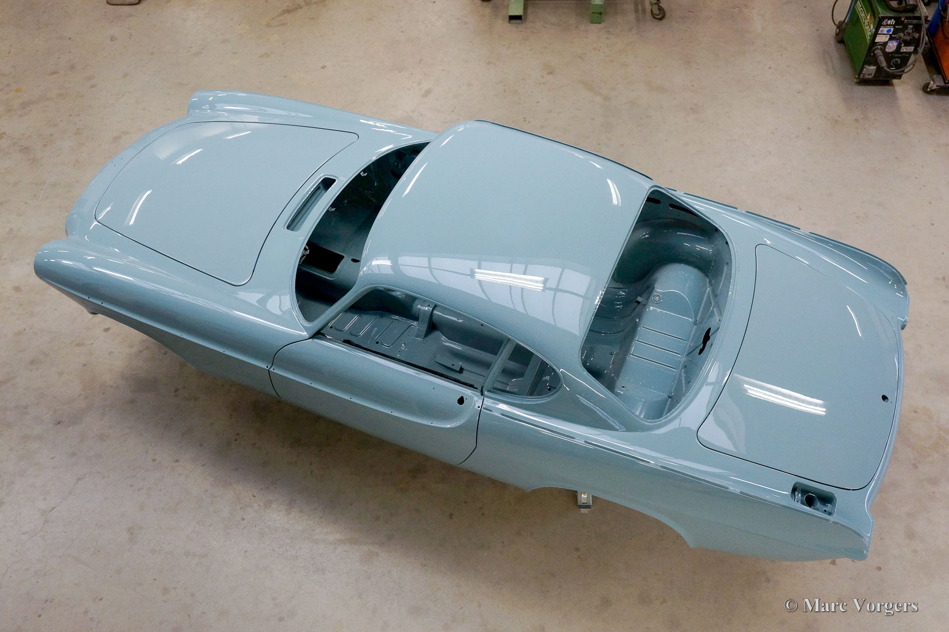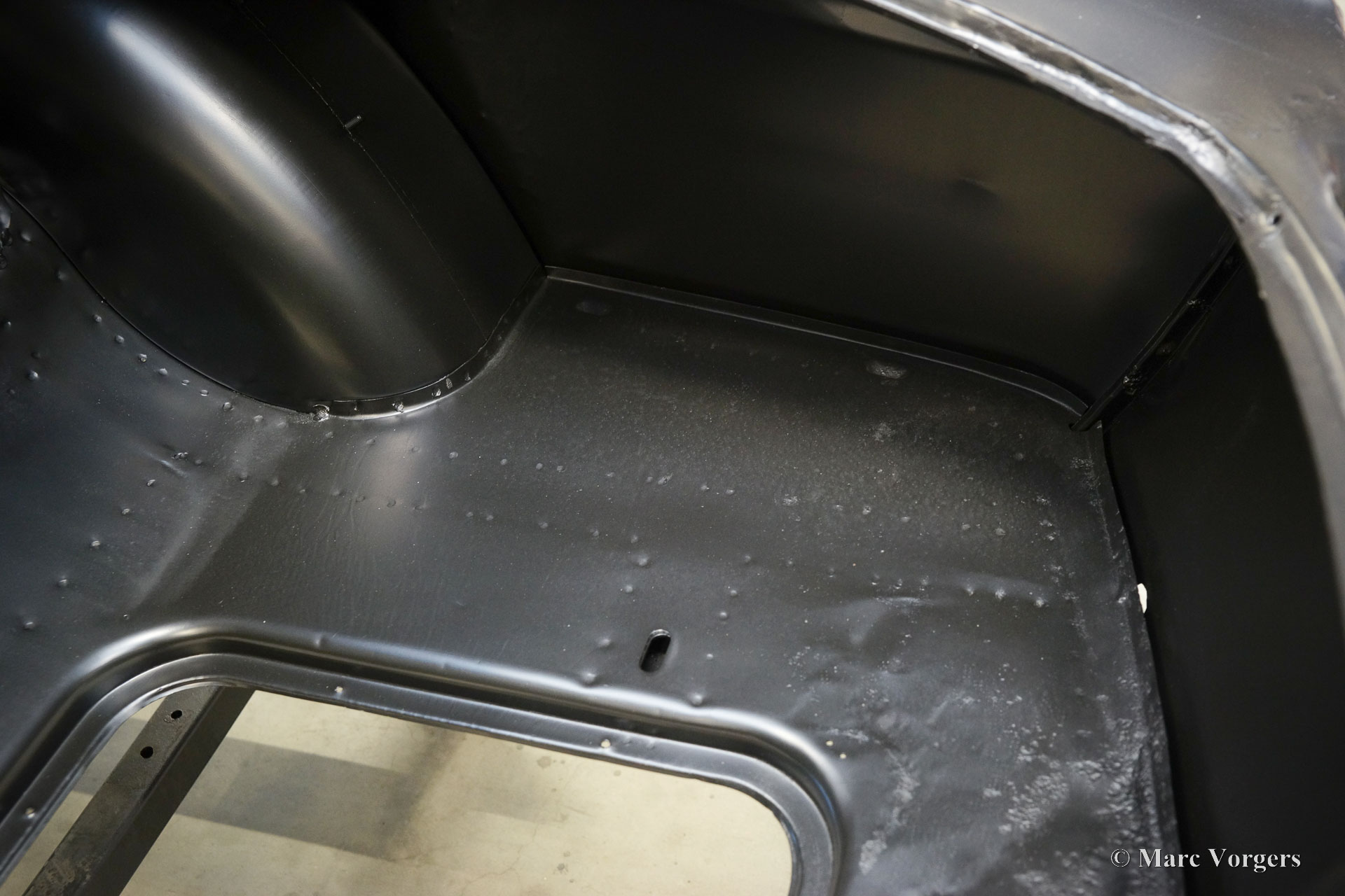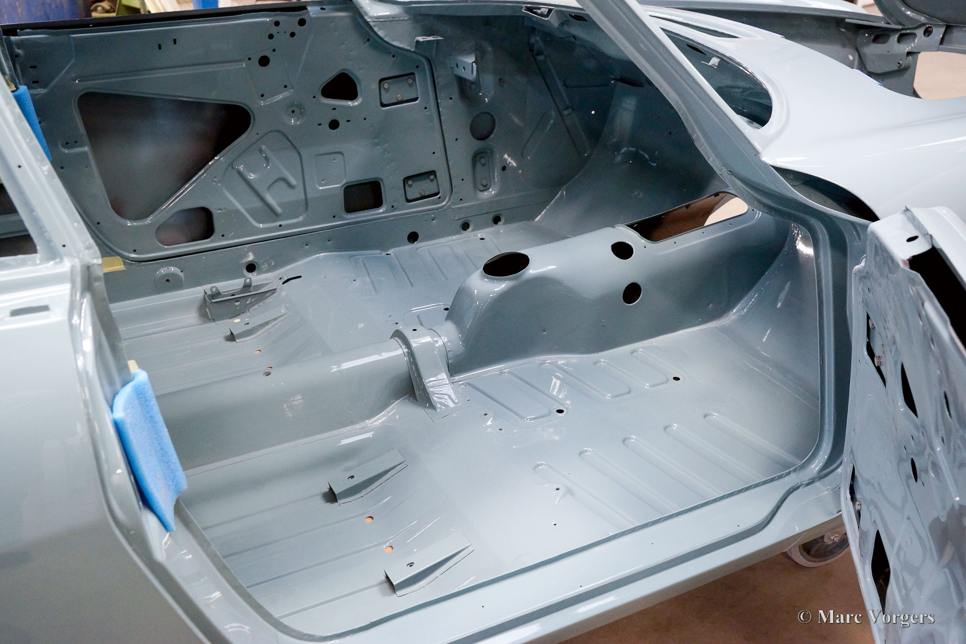 The body of this Volvo P1800 S was restored to brand new condition by Classic Job. The car was delivered stripped, and all glue residues and underbody protection have been removed. The bodywork was then completely stripped of paint in a paint stripping bath. The body proved to be in a beautiful and rust-free condition. Some sheet metal work was carried out. Both rear fenders showed poorly repaired minor collision damage which needed to be repaired. The rear panel between the rear lamps was replaced because of an earlier bad repair. After the sheet metal work was completed the bodywork was given a KTL coating in which the body was completely immersed in a special bath leaving a black coating on every metal surface inside and out and in every seam. After that the bodywork was smoothened, primed, and given a perfect new paint system. The Volvo P1800 S is being completed by the owner.
