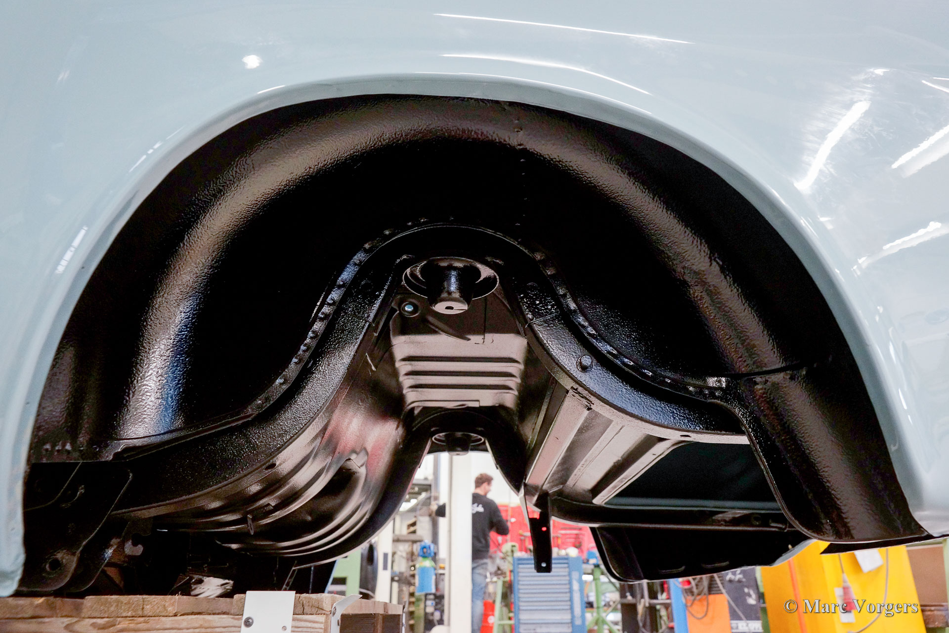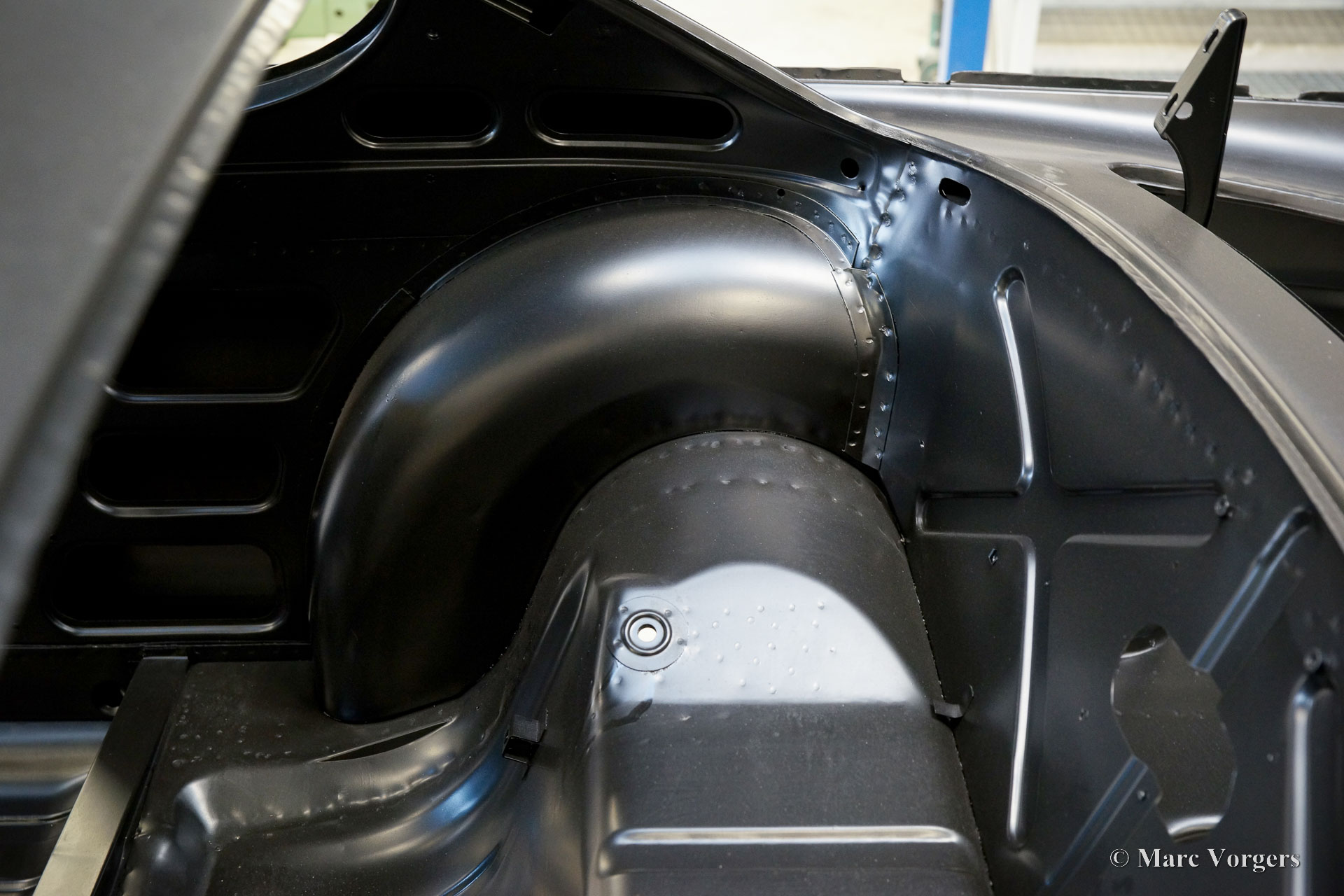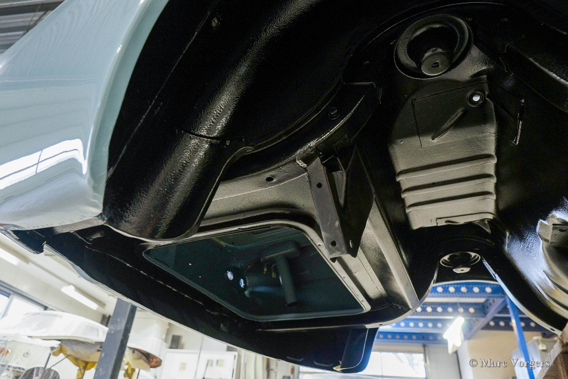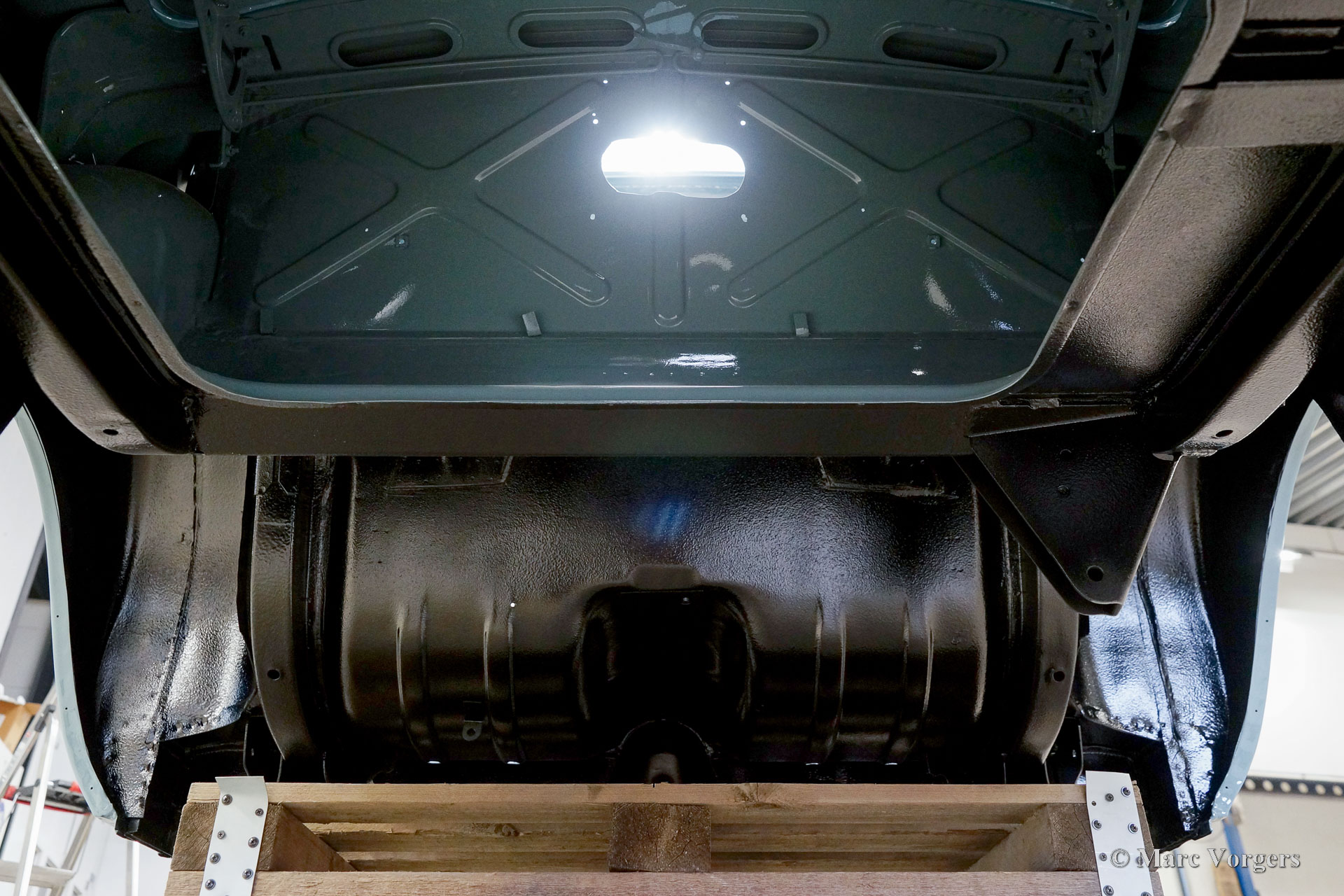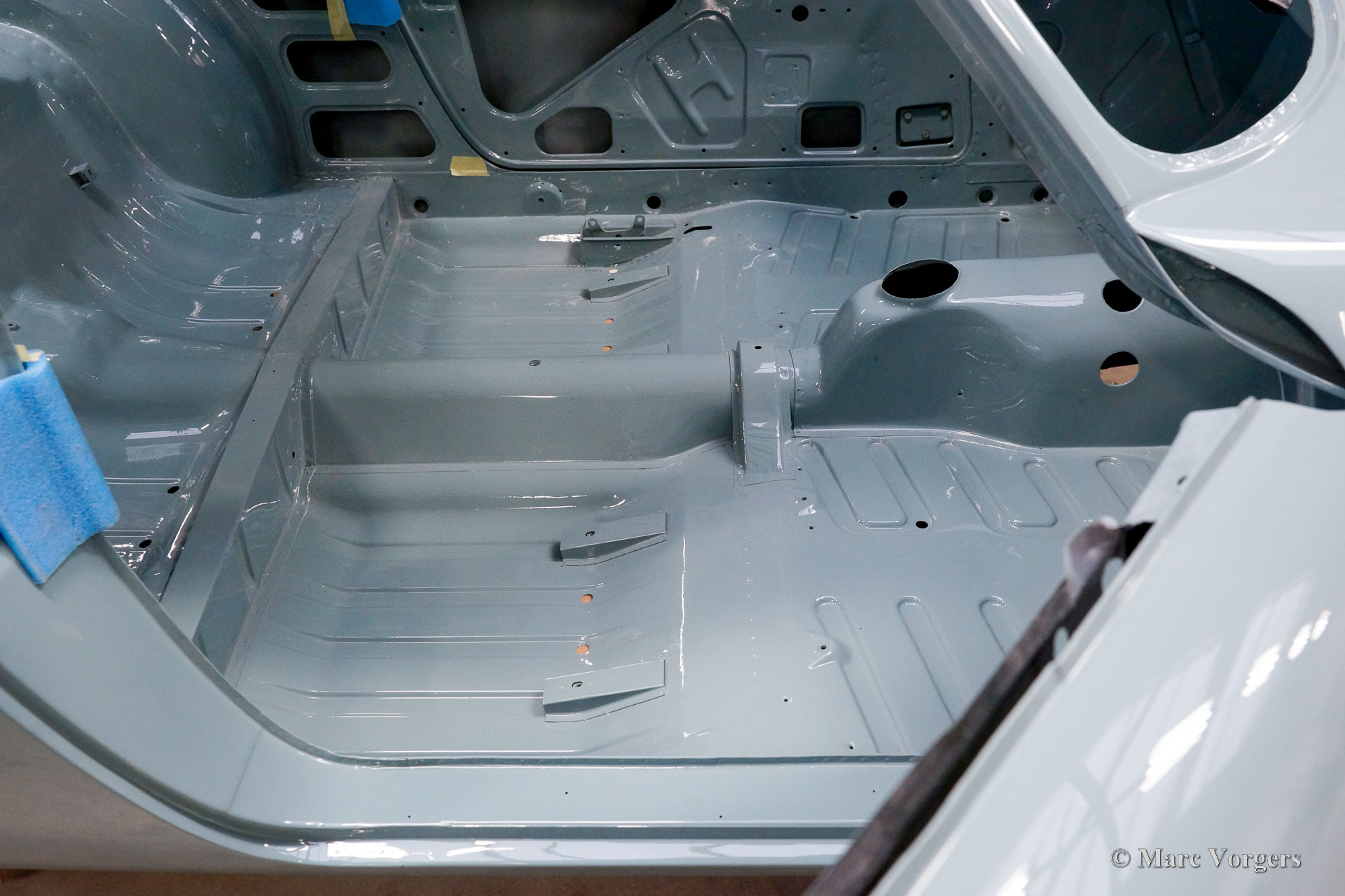 The body of this Volvo P1800 S was restored to brand new condition by Classic Job. The car was delivered stripped, and all glue residues and underbody protection have been removed. The bodywork was then completely stripped of paint in a paint stripping bath. The body proved to be in a beautiful and rust-free condition. Some sheet metal work was carried out. Both rear fenders showed poorly repaired minor collision damage which needed to be repaired. The rear panel between the rear lamps was replaced because of an earlier bad repair. After the sheet metal work was completed the bodywork was given a KTL coating in which the body was completely immersed in a special bath leaving a black coating on every metal surface inside and out and in every seam. After that the bodywork was smoothened, primed, and given a perfect new paint system. The Volvo P1800 S is being completed by the owner.