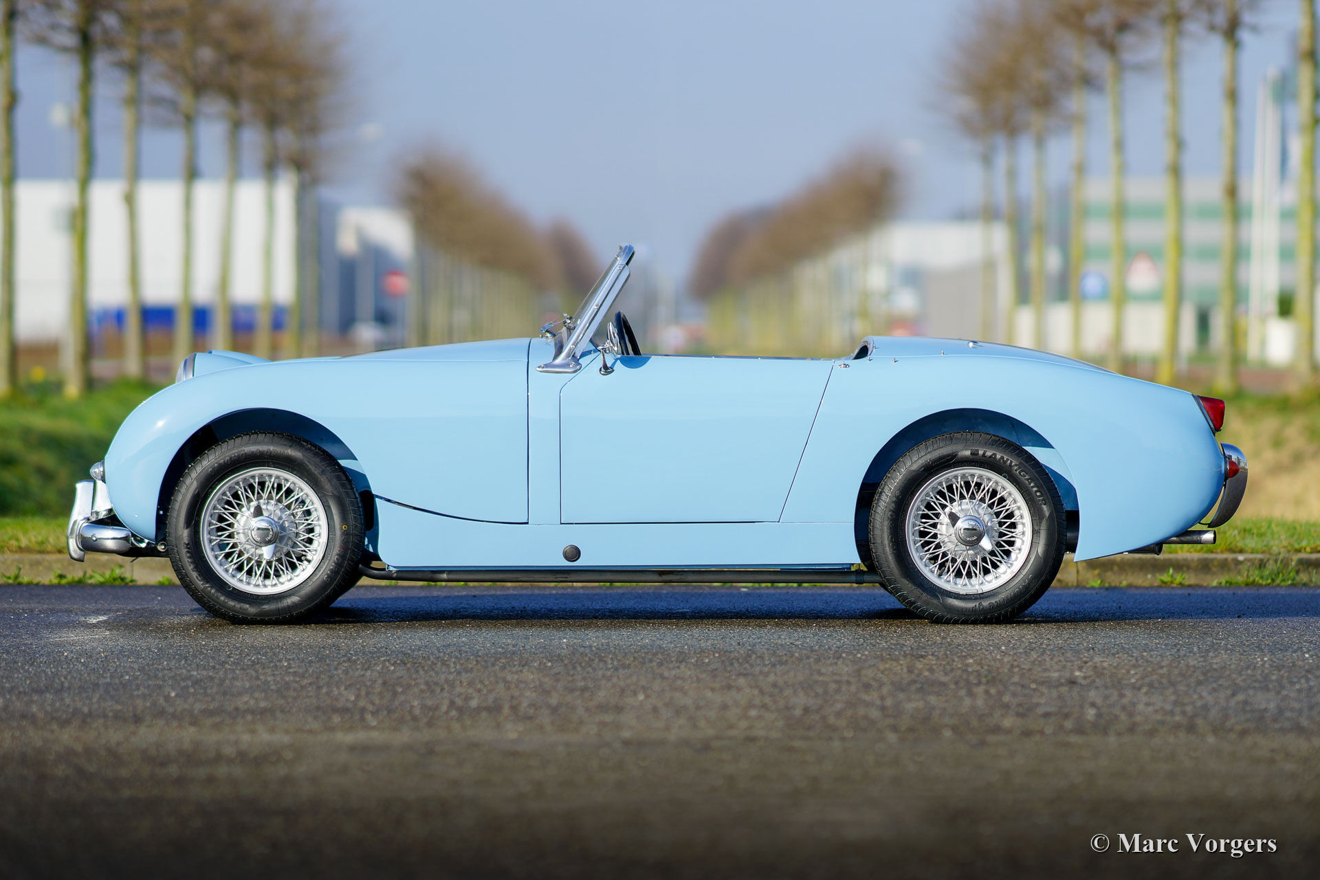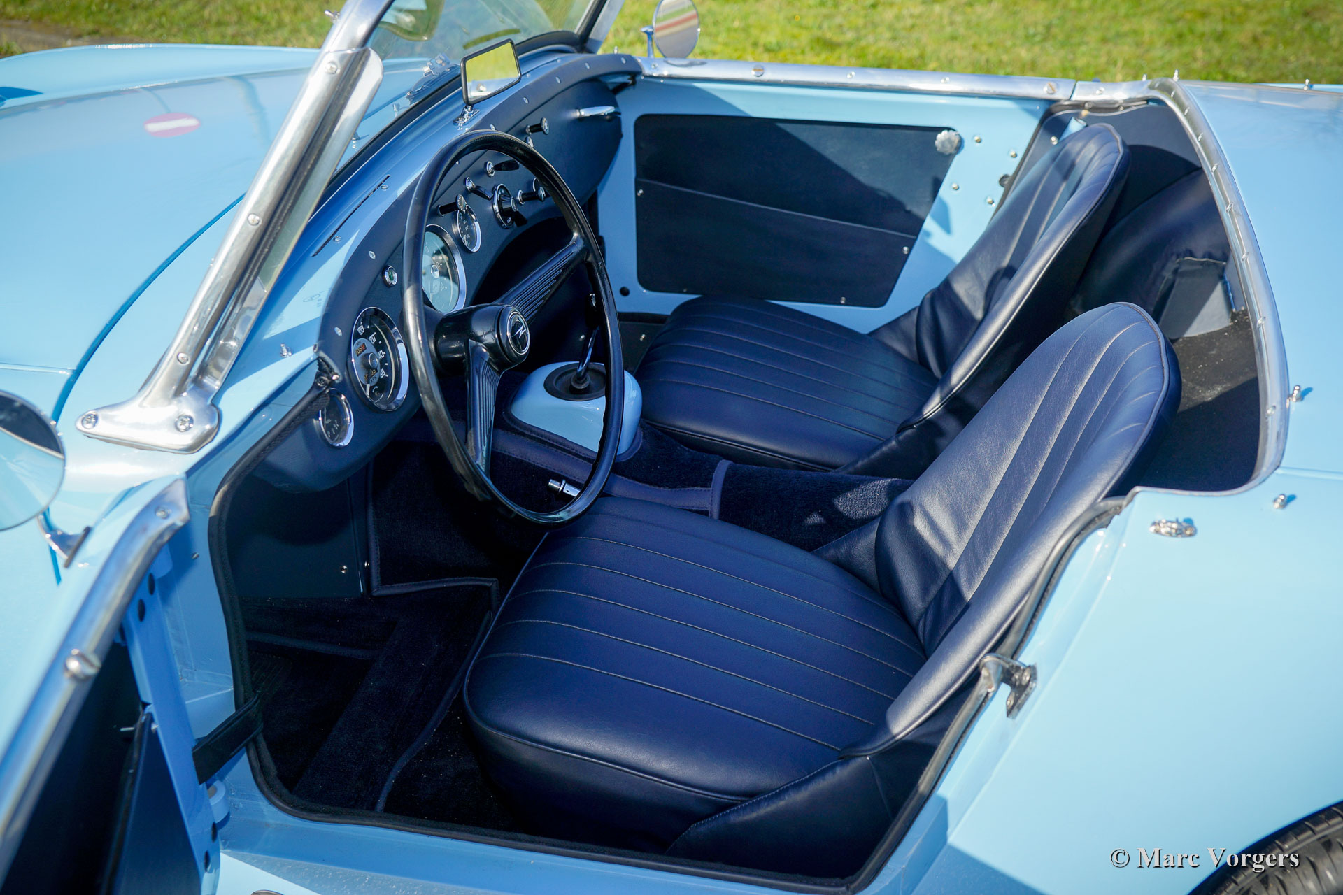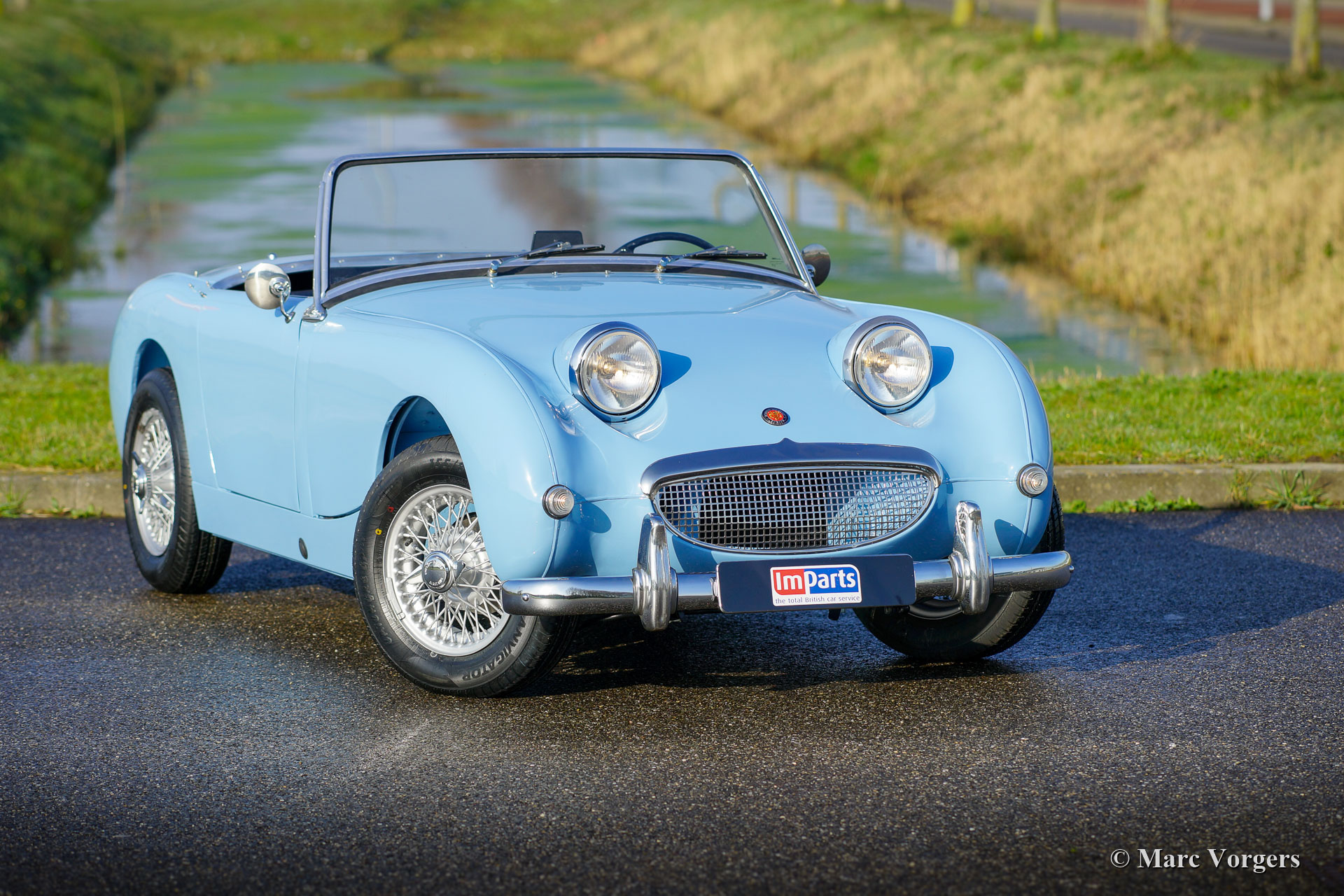 Austin Healey Sprite MK I ‘frog-eye’, year 1960. Colour Irish blue combined with a dark blue interior and dark blue carpet. Dark blue vinyl soft-top and aluminium side-screen frames. This gorgeous Healey Sprite was extensively restored to superb top condition (concours)! During the rebuild disc brakes were fitted at the front wheels. The Sprite MK I was nicknamed ‘frog-eye’ in the UK and ‘bug-eye’in the USA. This fantastic Austin Healey Sprite is still fitted with the original 948 cc (Austin A-series) four-cylinder engine and its 4-speed manually operated gearbox. This fine example features silver painted wire wheels and it shows all the original details like the rare original steering wheel! A very desirable Healey ‘frog-eye’ in superb restored condition!