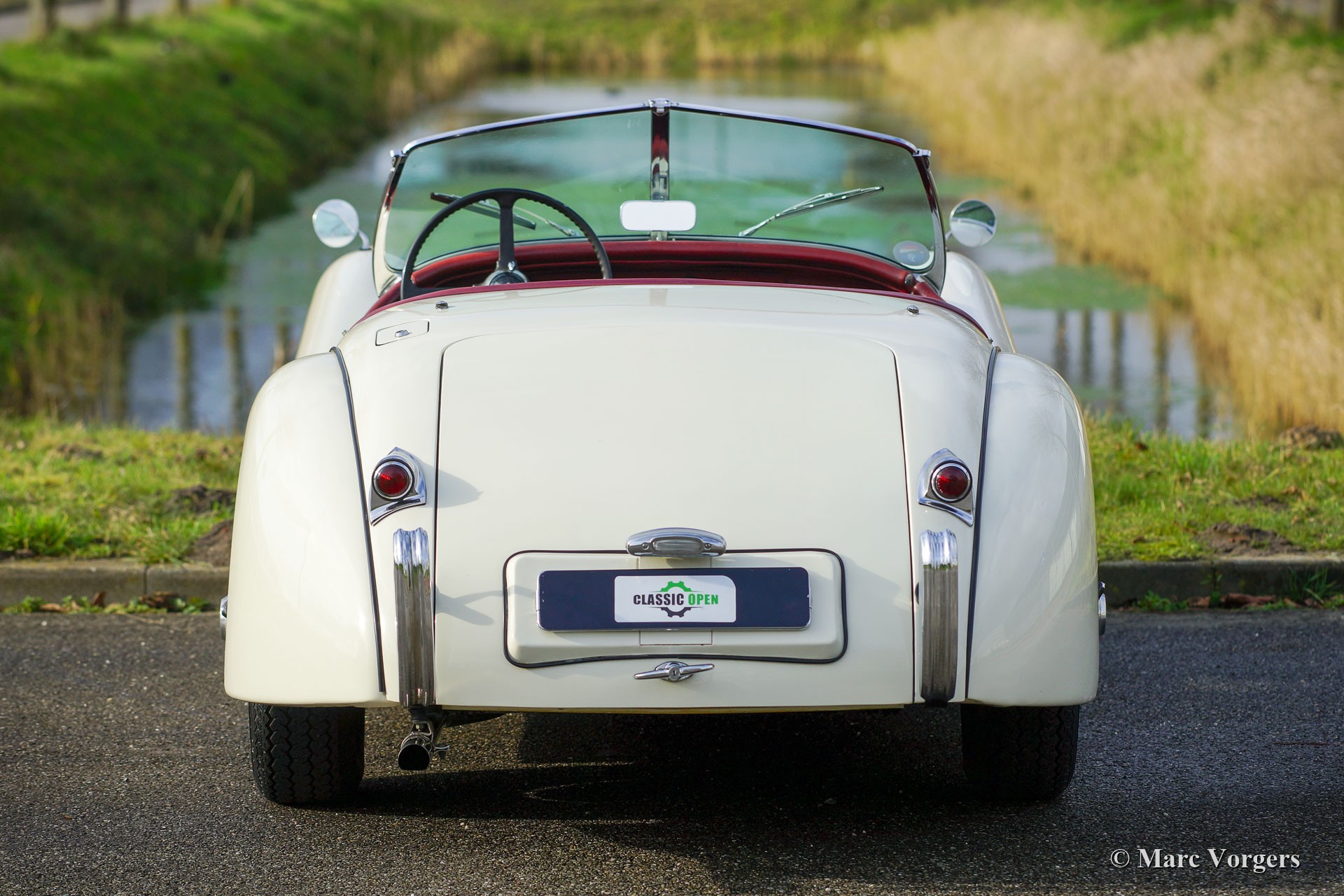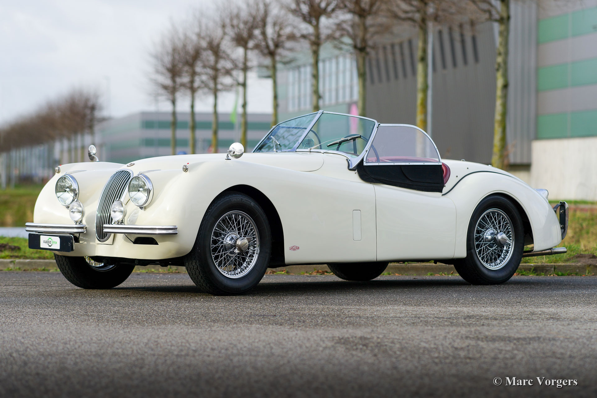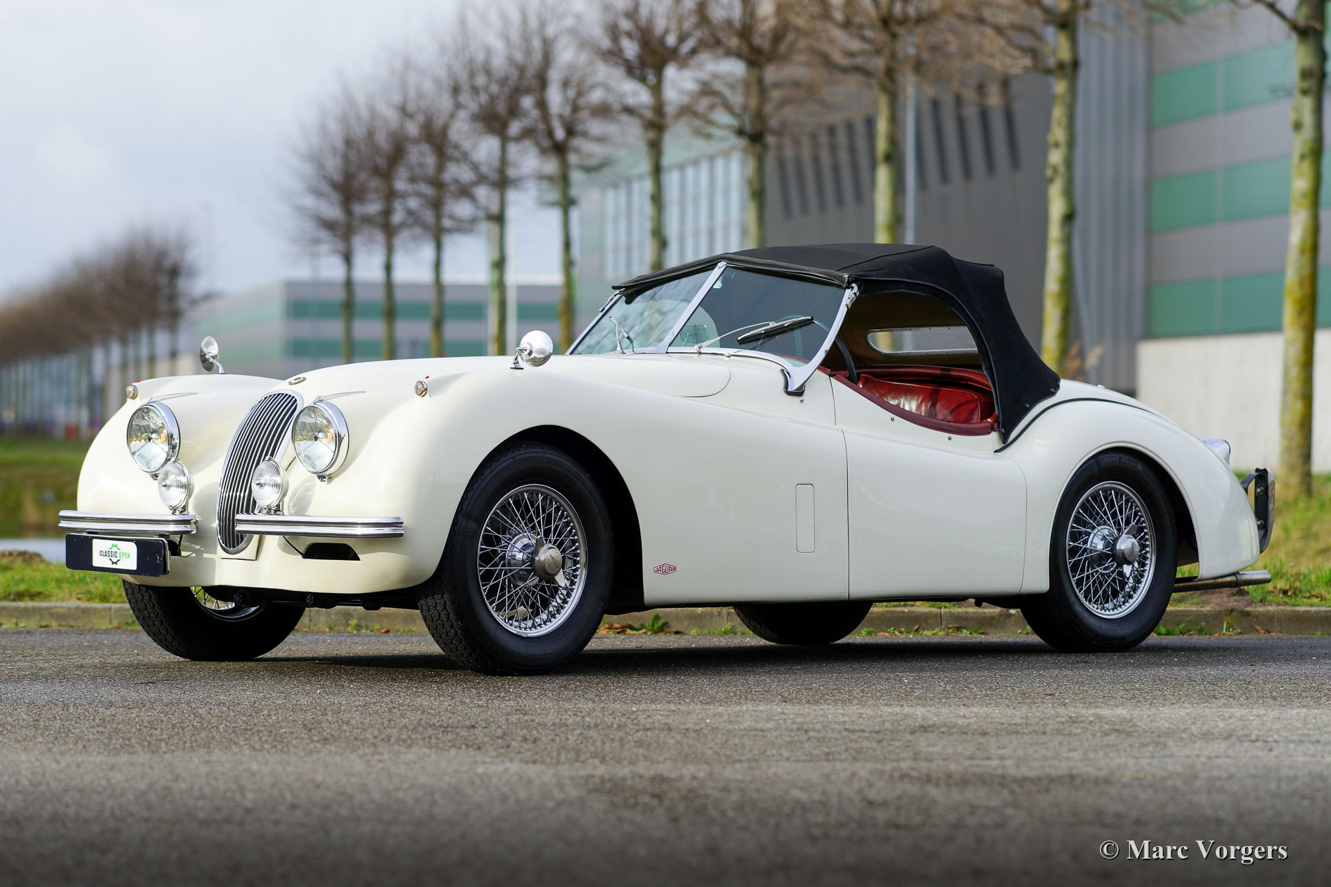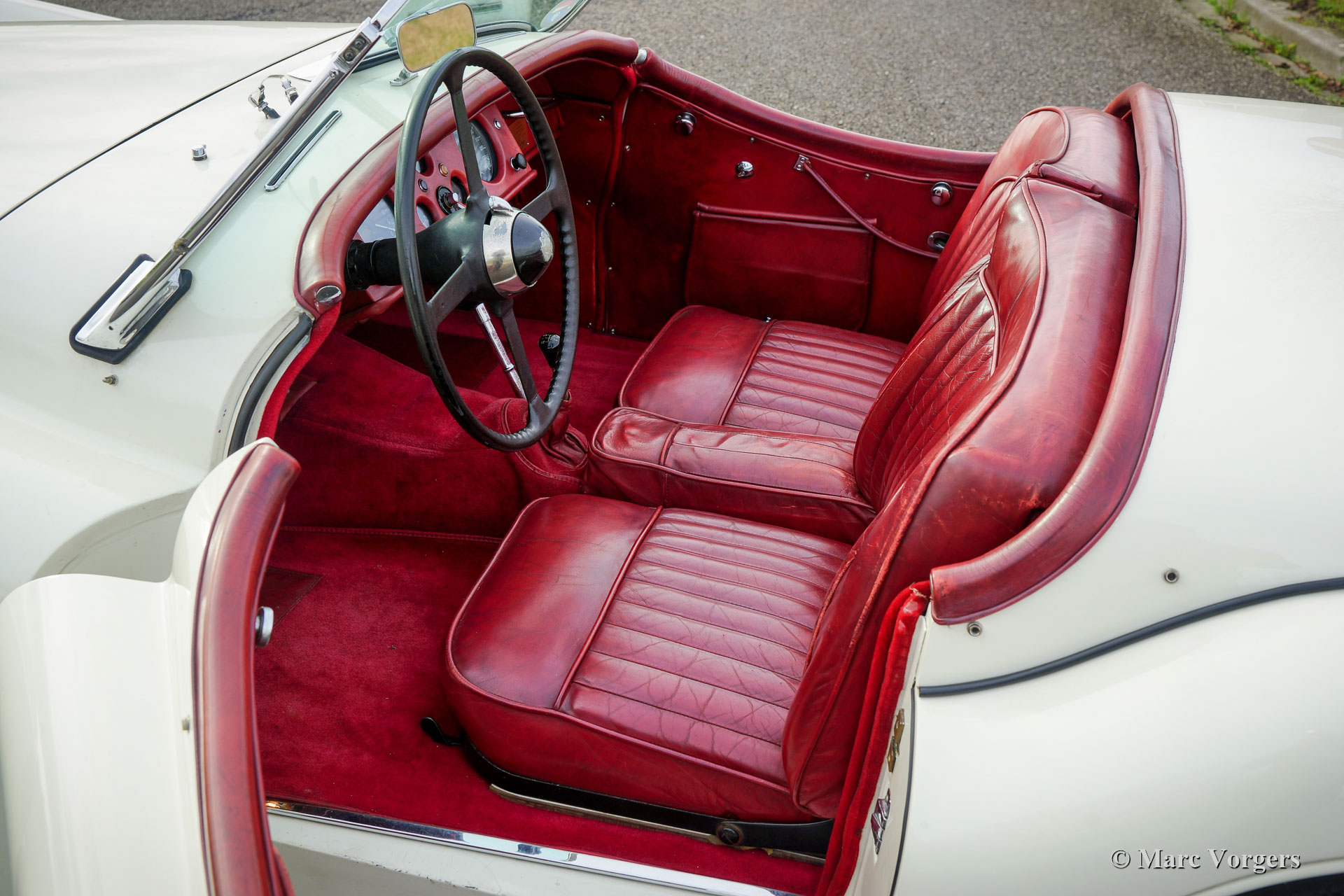 Jaguar XK 120 OTS, year 1953. Colour old English white combined with a red leather interior and red carpet. Black soft-top and side screens. This gorgeous Jaguar XK 120 Open Two Seater (OTS, named Roadster in the USA) was sold new in the USA. In 1996 the automobile was imported to the Netherlands. This very original Jaguar XK 120 is in a very good driver condition with a wonderful vintage patina. The original red leather interior is in a beautiful vintage original condition, this car features the gorgeous seats with the ‘sculpted’ backs. Over the years the car was well serviced and maintained, and important things were improved, renewed, and overhauled. In 2005 the wiring loom was renewed, in 2007 the gearbox was rebuilt, and in 2021 the engine was overhauled. This Jaguar XK 120 is fitted with the desirable Lucas P770 tripod head lamps, the original steering wheel, XK 150 disc brakes on the front wheels, an electric cooling fan, an aluminium petrol tank and a pair of Lucas SFT576 wide-beam lamps. This fantastic machine is cherished by the last owner since 2014 and the car drives delightfully! This is the perfect XK 120 OTS for the enthusiast looking for a splendid driver car with a fantastic vintage look and feel!