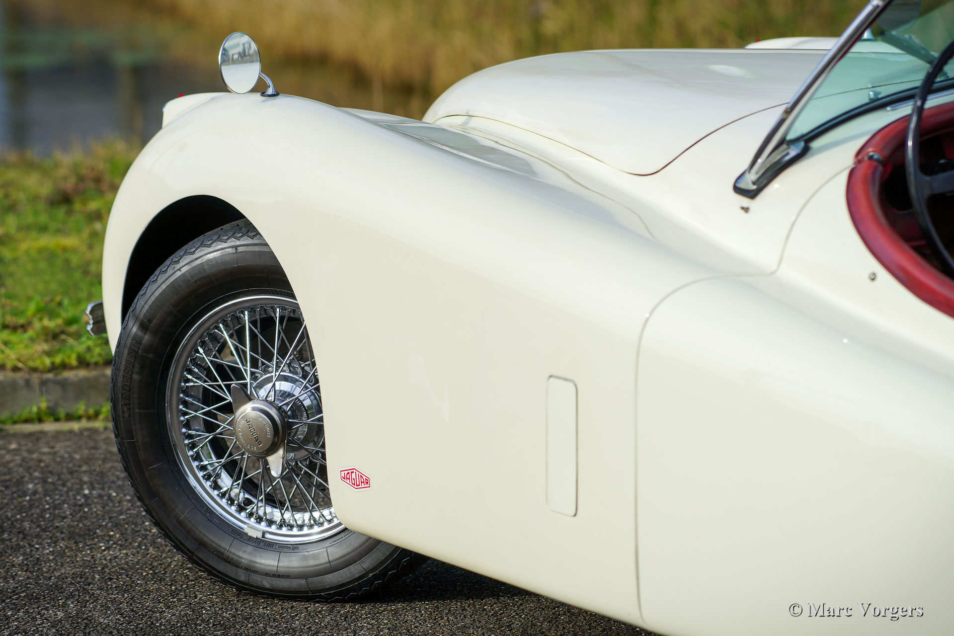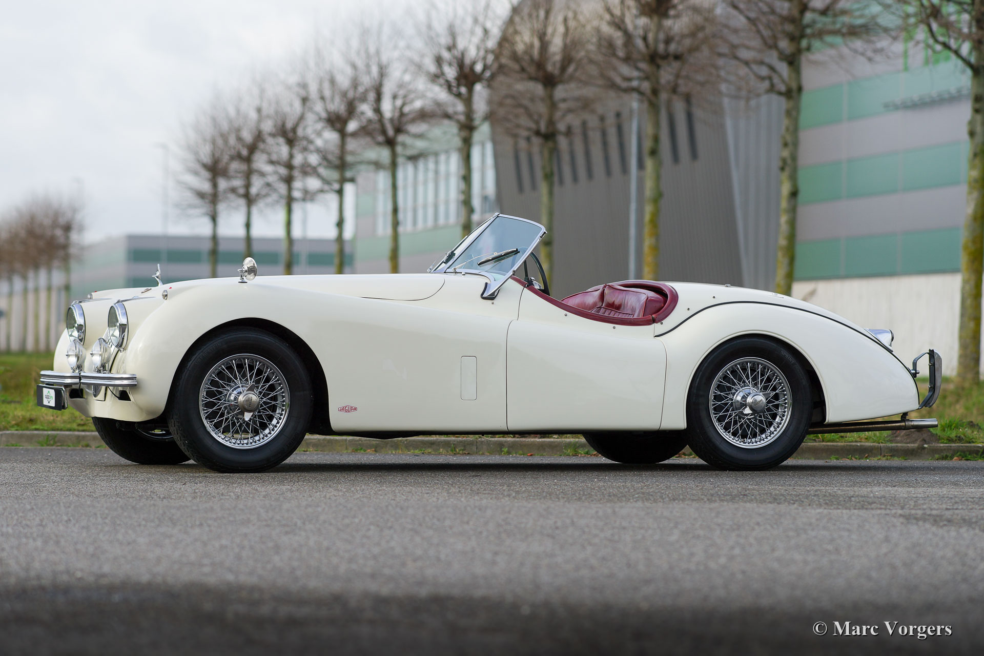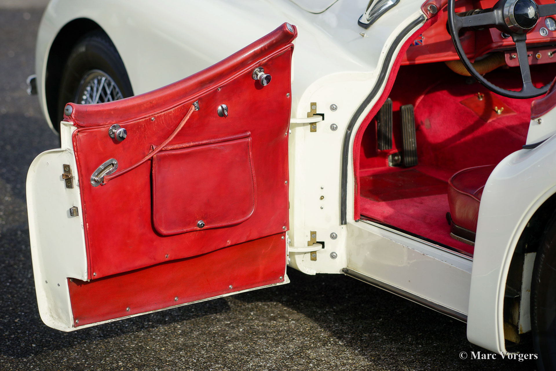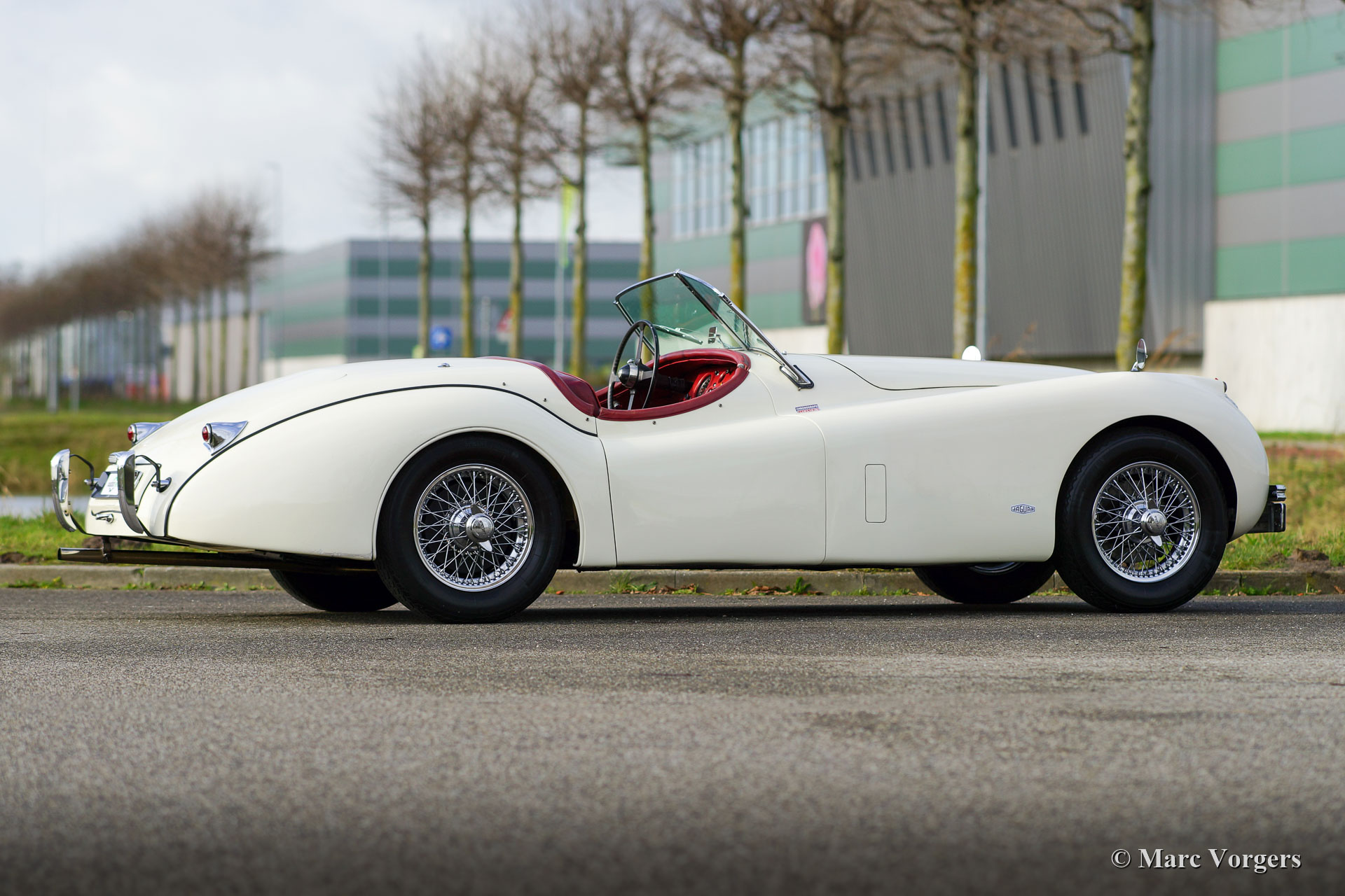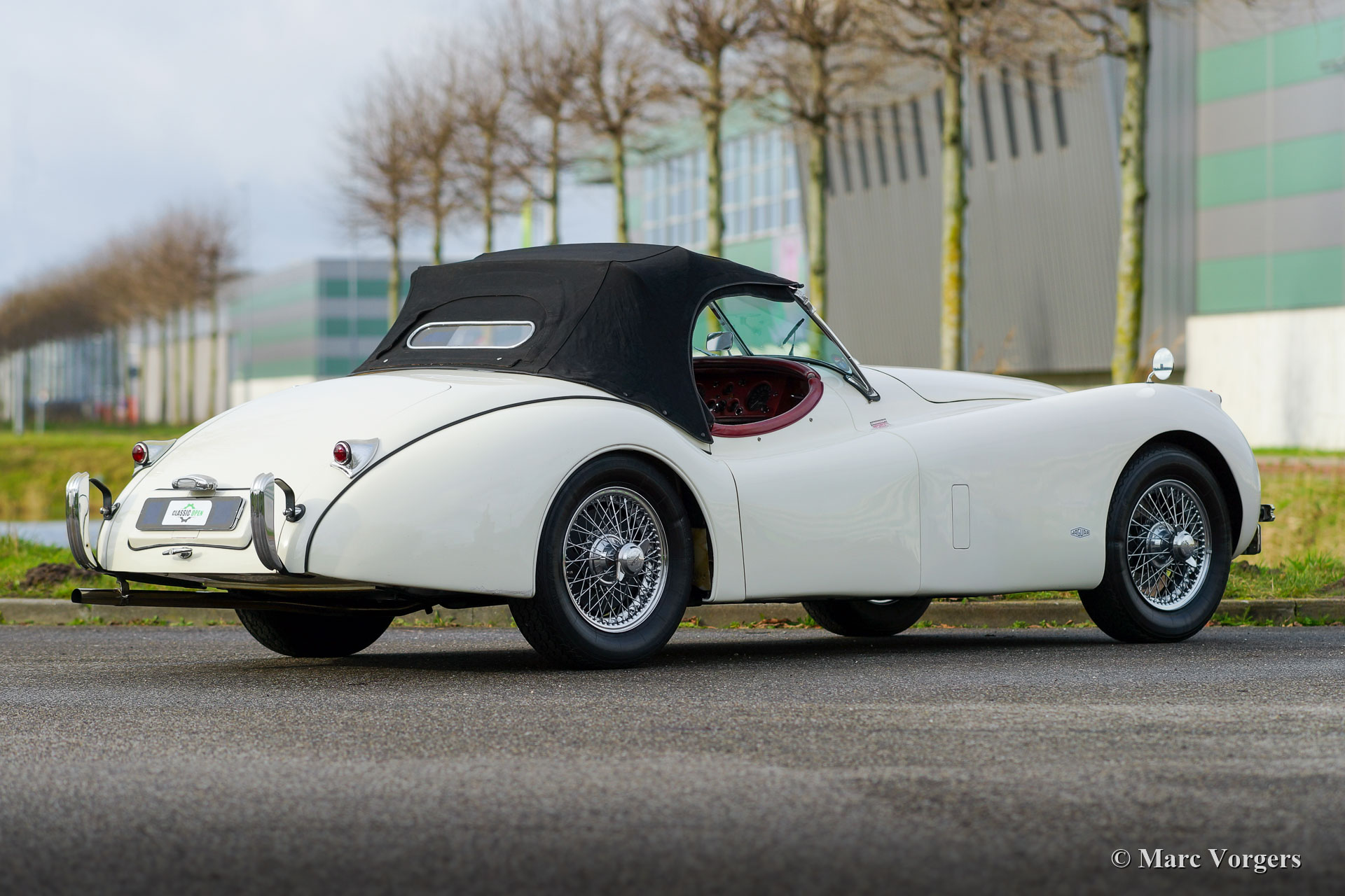 Jaguar XK 120 OTS, year 1953. Colour old English white combined with a red leather interior and red carpet. Black soft-top and side screens. This gorgeous Jaguar XK 120 Open Two Seater (OTS, named Roadster in the USA) was sold new in the USA. In 1996 the automobile was imported to the Netherlands. This very original Jaguar XK 120 is in a very good driver condition with a wonderful vintage patina. The original red leather interior is in a beautiful vintage original condition, this car features the gorgeous seats with the ‘sculpted’ backs. Over the years the car was well serviced and maintained, and important things were improved, renewed, and overhauled. In 2005 the wiring loom was renewed, in 2007 the gearbox was rebuilt, and in 2021 the engine was overhauled. This Jaguar XK 120 is fitted with the desirable Lucas P770 tripod head lamps, the original steering wheel, XK 150 disc brakes on the front wheels, an electric cooling fan, an aluminium petrol tank and a pair of Lucas SFT576 wide-beam lamps. This fantastic machine is cherished by the last owner since 2014 and the car drives delightfully! This is the perfect XK 120 OTS for the enthusiast looking for a splendid driver car with a fantastic vintage look and feel!