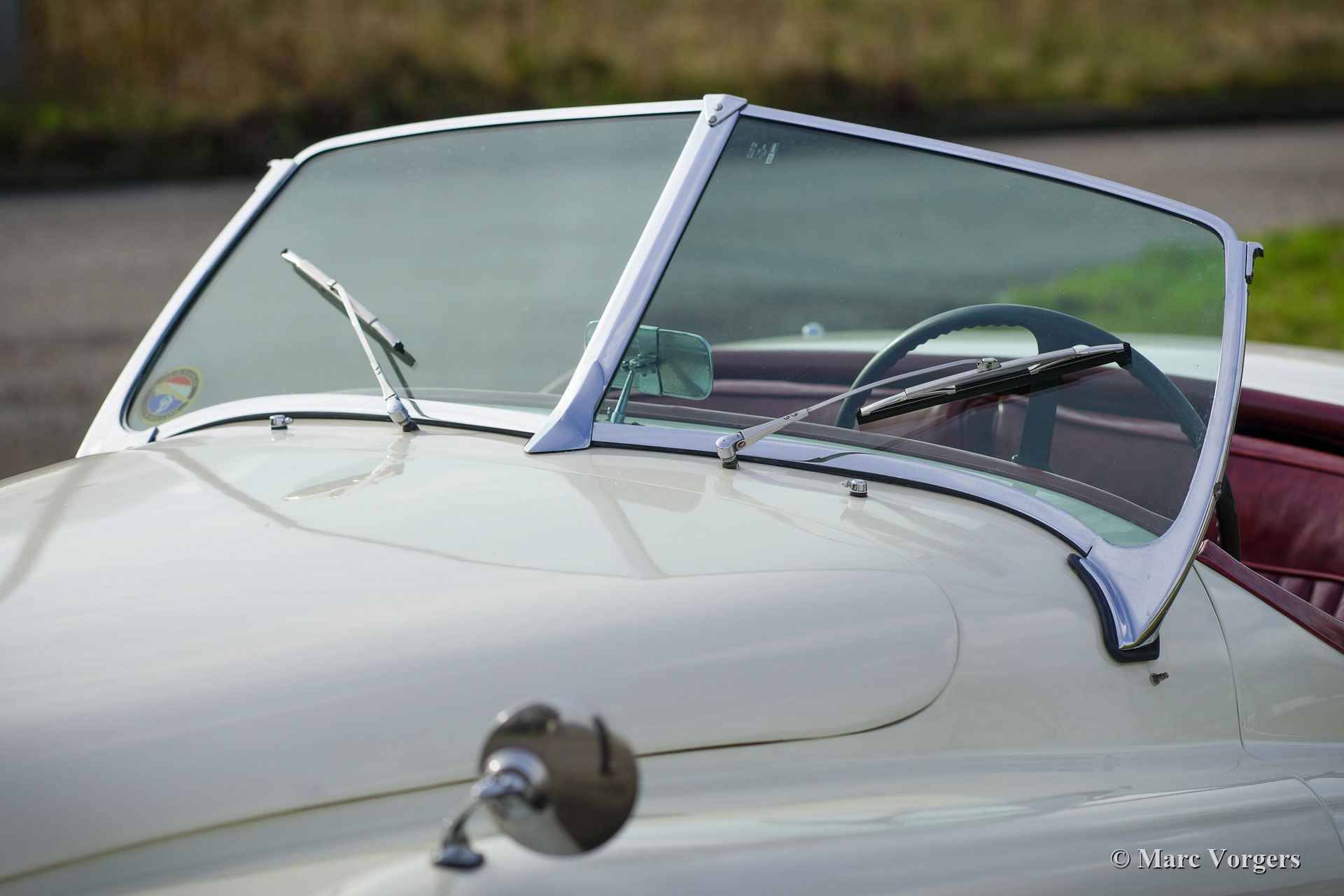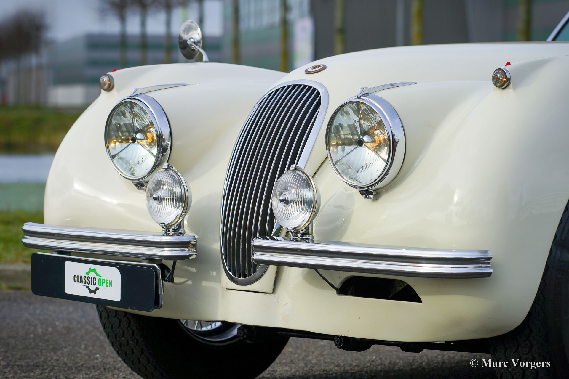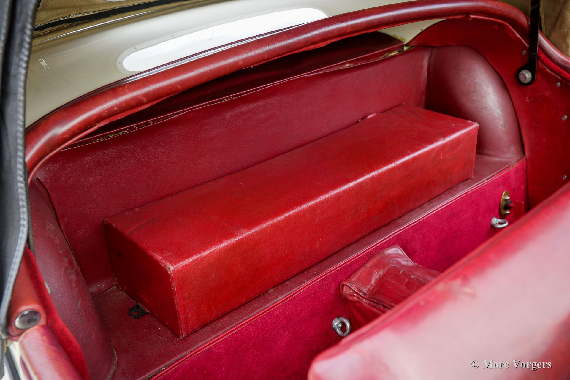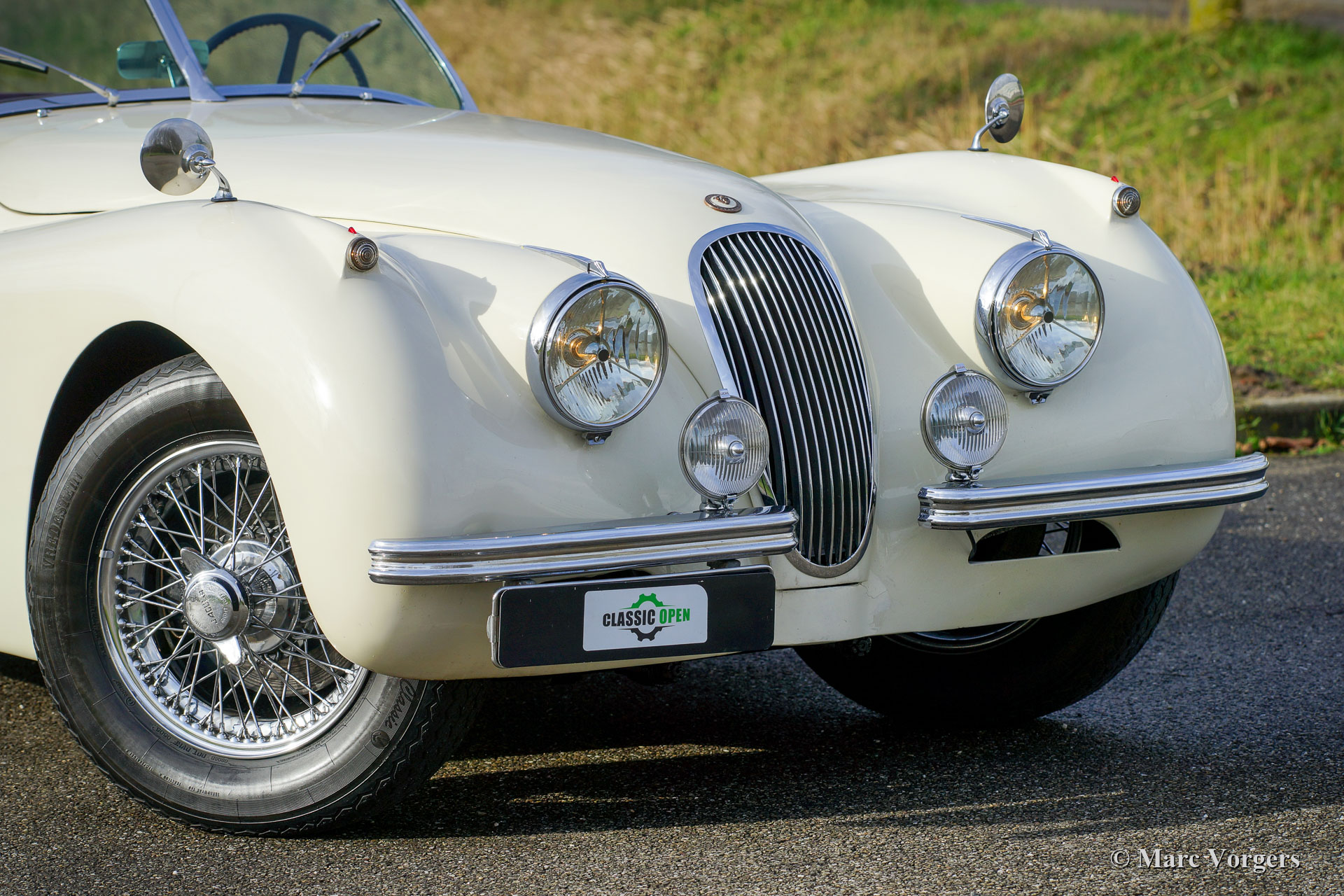 Jaguar XK 120 OTS, year 1953. Colour old English white combined with a red leather interior and red carpet. Black soft-top and side screens. This gorgeous Jaguar XK 120 Open Two Seater (OTS, named Roadster in the USA) was sold new in the USA. In 1996 the automobile was imported to the Netherlands. This very original Jaguar XK 120 is in a very good driver condition with a wonderful vintage patina. The original red leather interior is in a beautiful vintage original condition, this car features the gorgeous seats with the ‘sculpted’ backs. Over the years the car was well serviced and maintained, and important things were improved, renewed, and overhauled. In 2005 the wiring loom was renewed, in 2007 the gearbox was rebuilt, and in 2021 the engine was overhauled. This Jaguar XK 120 is fitted with the desirable Lucas P770 tripod head lamps, the original steering wheel, XK 150 disc brakes on the front wheels, an electric cooling fan, an aluminium petrol tank and a pair of Lucas SFT576 wide-beam lamps. This fantastic machine is cherished by the last owner since 2014 and the car drives delightfully! This is the perfect XK 120 OTS for the enthusiast looking for a splendid driver car with a fantastic vintage look and feel!