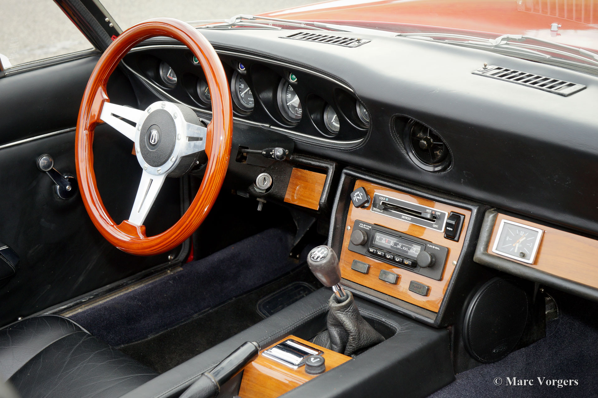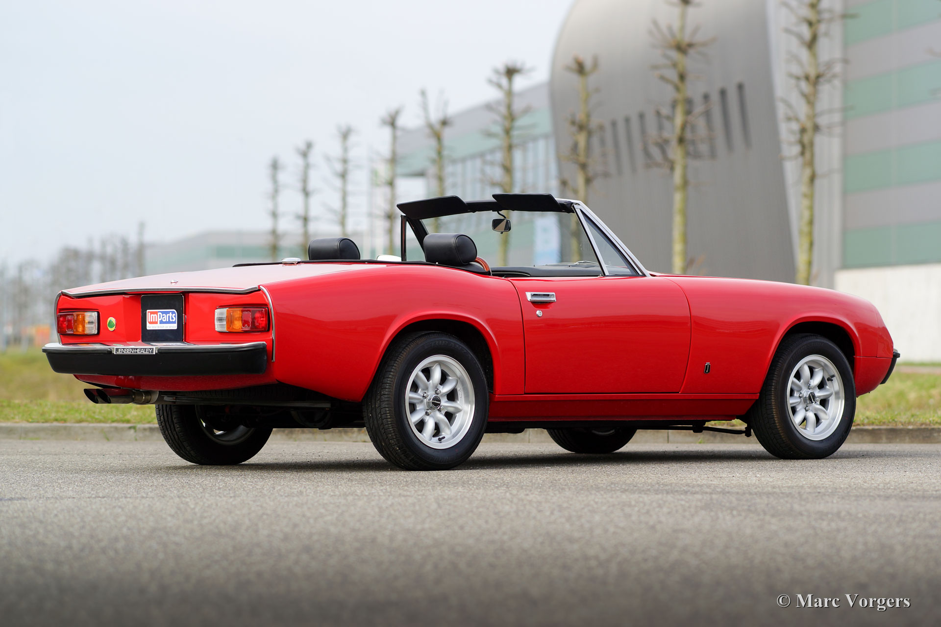 Jensen Healey, year 1973. Colour red with a black leather interior and a black vinyl soft-top. This wonderful Jensen-Healey was imported from the USA in the year 1988 and road-registered in the Netherlands in 1990. The car has known only one owner ever since. The car was extensively restored in several phases; this Jensen is in superb top-condition and the car drives impressively well. Also, the car was given some important upgrades: the 2.2 Litre Lotus engine was tuned and fitted with Lotus 107 camshafts, a long-life cam-belt with adjustable gears, forged (JE) pistons, a lightened fly-wheel, Dell’Orto 45 mm carburettors and electronic ignition. The engine delivers approximately 170 bhp. The gearbox is a Getrag Jensen-Healey Mk 2 unit with a modified final drive. Also, the brake-system was improved with larger (JHPS) aluminium 4-piston calipers and new drum brakes at the rear. The suspension was up-rated with Koni shock-dampers and a thicker (Jensen GT) stabilizer-bar. To complete this list of sports improvements the car was fitted with magnificent alloy Panasport racing wheels. Only about 10.000 Jensen-Healey cars were built from 1972 until 1976. This is a TOP specimen!