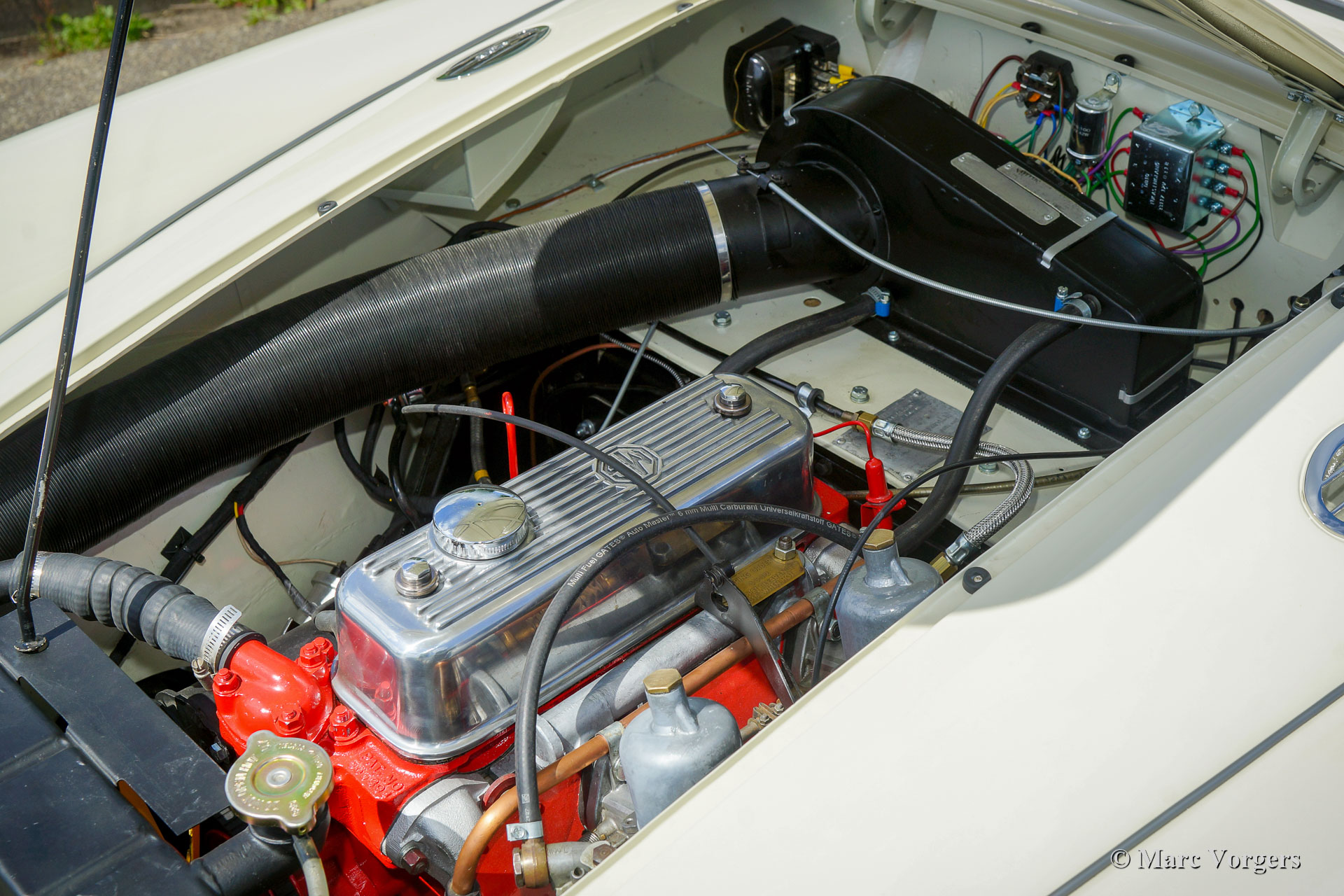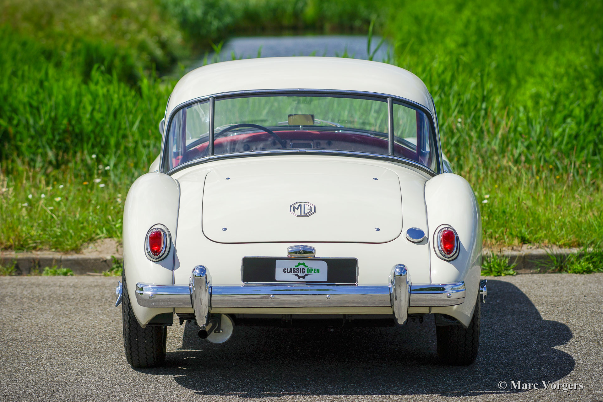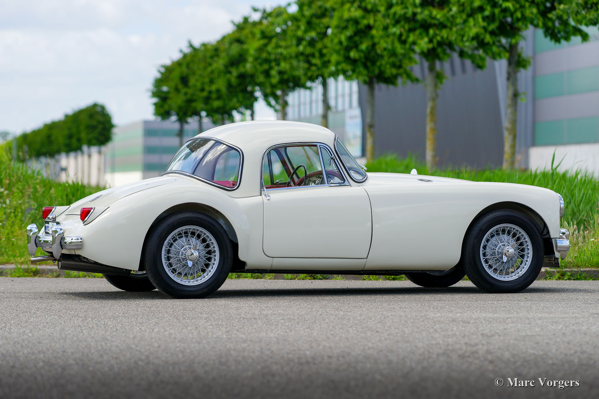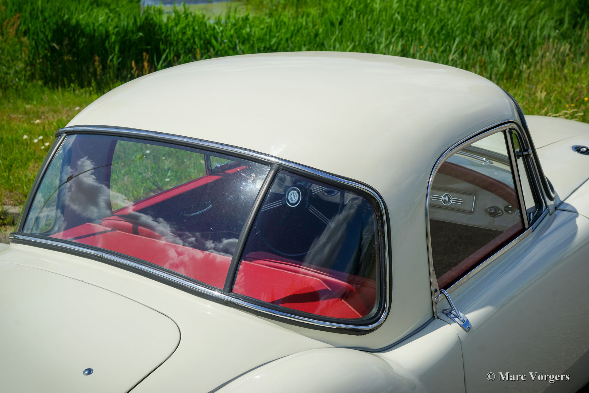 MG MGA 1500 coupe, year 1959. Colour Old English White combined with a red leather interior trimmed with black wool carpet. This extremely handsome MGA 1500 coupe was fully restored to perfection, the automobile is a better than new concours condition! The MGA 1500 coupe is quite a rare car compared to it roadster sister model which enjoyed a great popularity in the USA. Only 6200 MGA 1500 coupes were built and most of them found a proud owner in the UK and in the rest of Europe. This gorgeous MGA coupe shows stunning original details, you cannot stop looking at all its wonderful features and lines. The automobile is fitted with silver painted wire wheels, chrome ‘knock-on’ wheel nuts and an aluminium rocker cover. This is a rare and desirable MG MGA 1500 coupe in top condition!