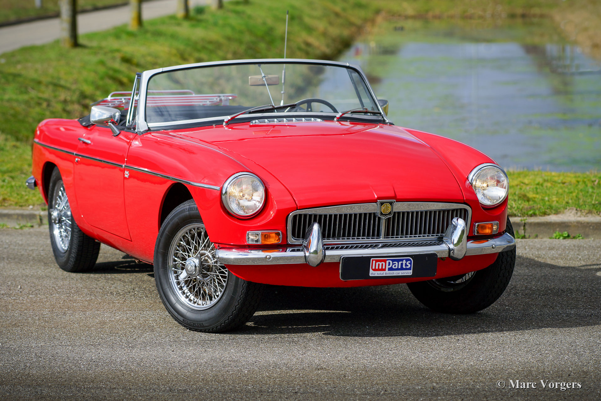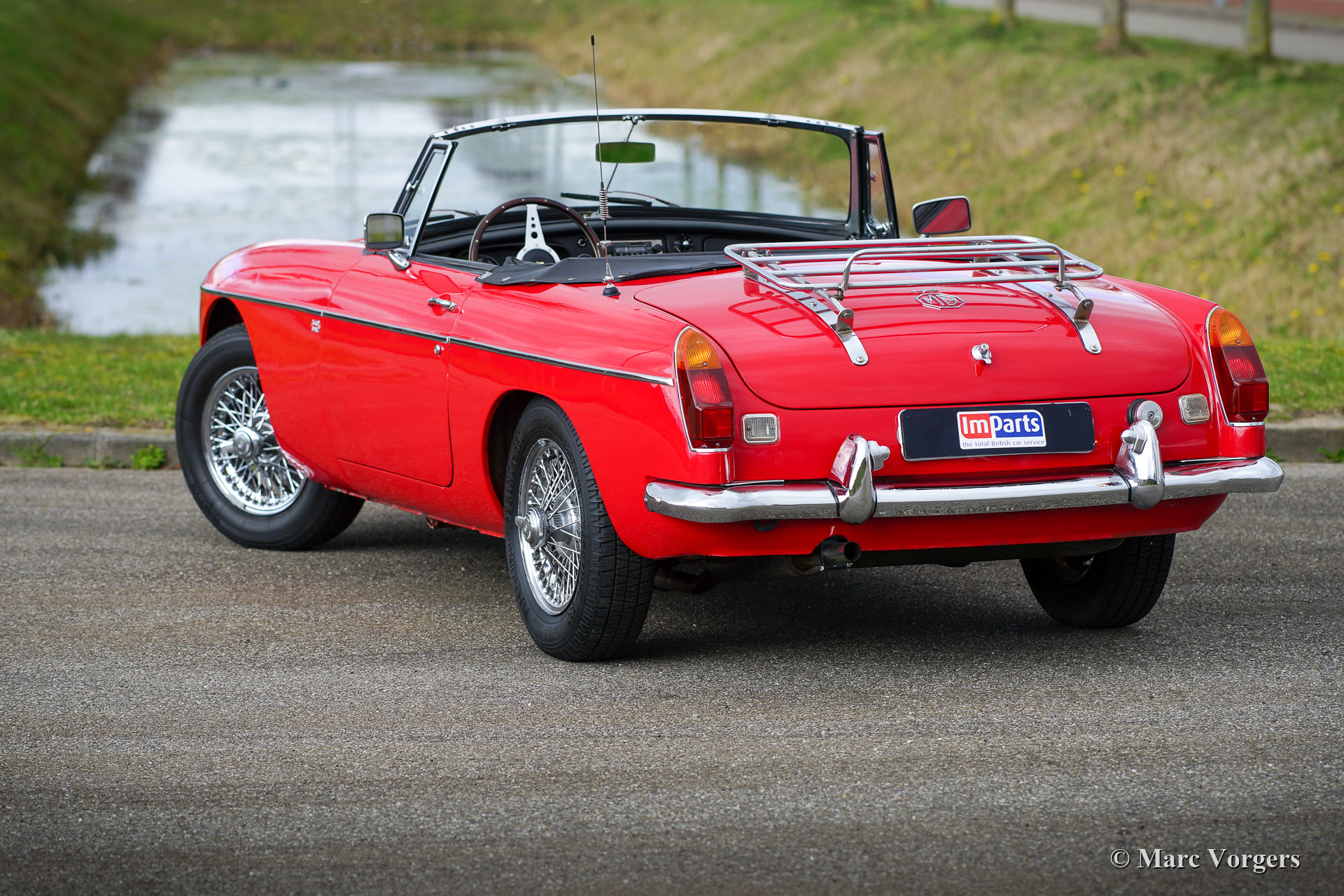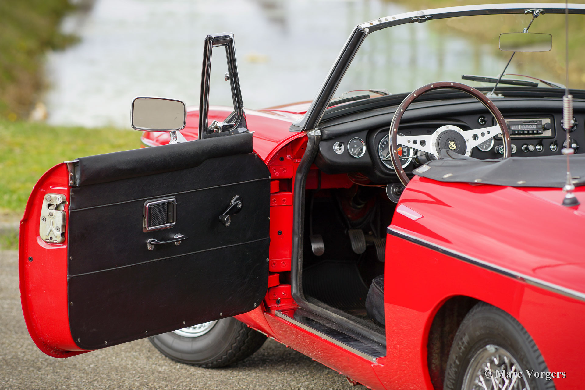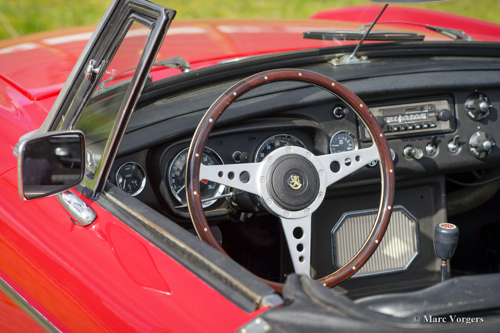 MG MGB roadster, year 1970. Colour red combined with a black leather interior and black carpet. This beautiful MGB roadster was sold new in the Netherlands. It is the sought-after model with the steel dashboard and an odometer with km/h scale. In the past the car was restored, and an overhauled 1800 cc engine was fitted. This MGB is in good condition and it was always serviced punctually. The car shows normal signs of previous use and it drives delightfully! The car features some desirable options like chrome wire wheels, overdrive, leather upholstery, a chrome baggage rack, a sports steering wheel with a wood rim and two door mounted rear view mirrors. Furthermore, the car is fitted with electronic ignition, an oil-cooler, and an electric cooling fan. This MGB roadster is ready for a fantastic summer!
