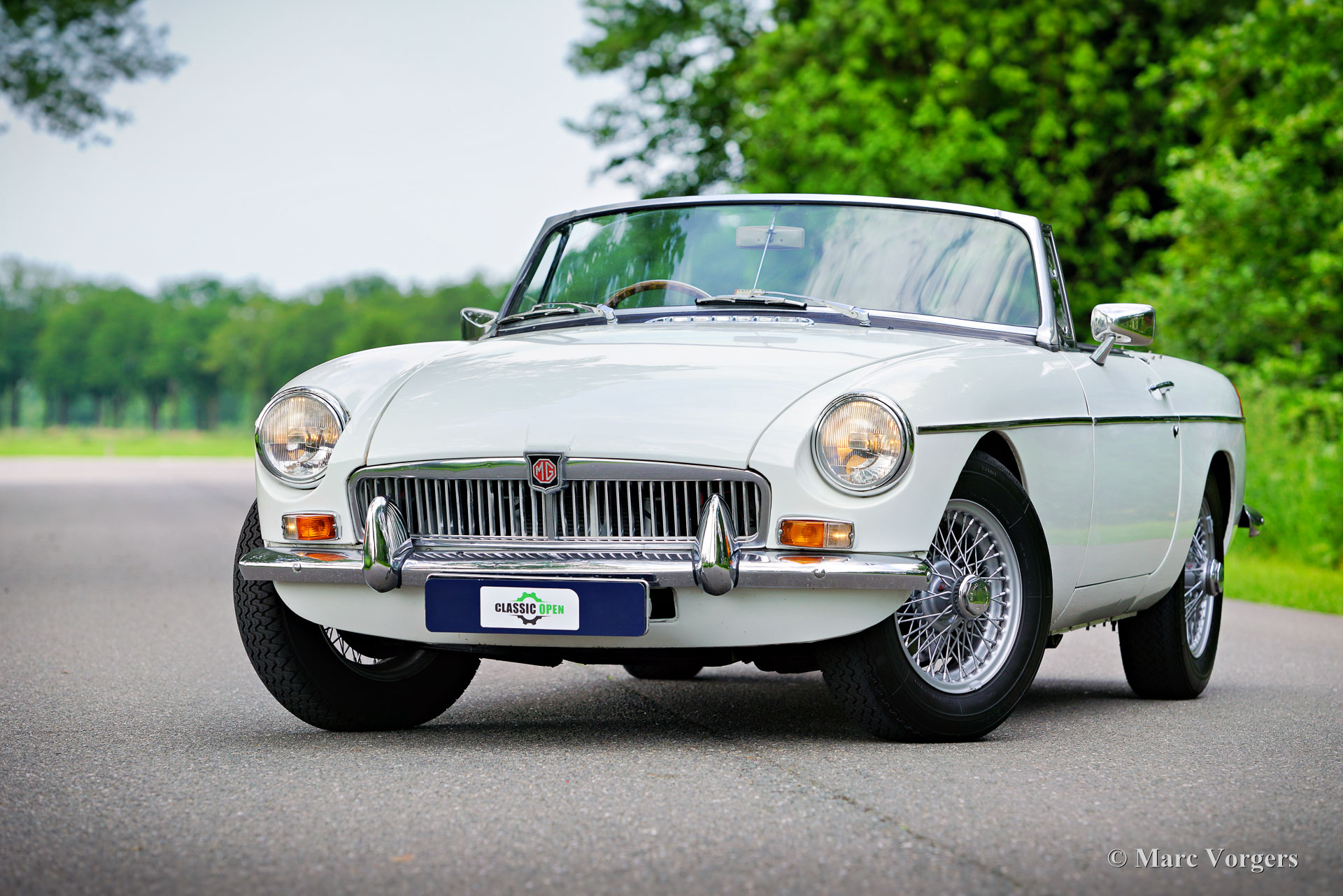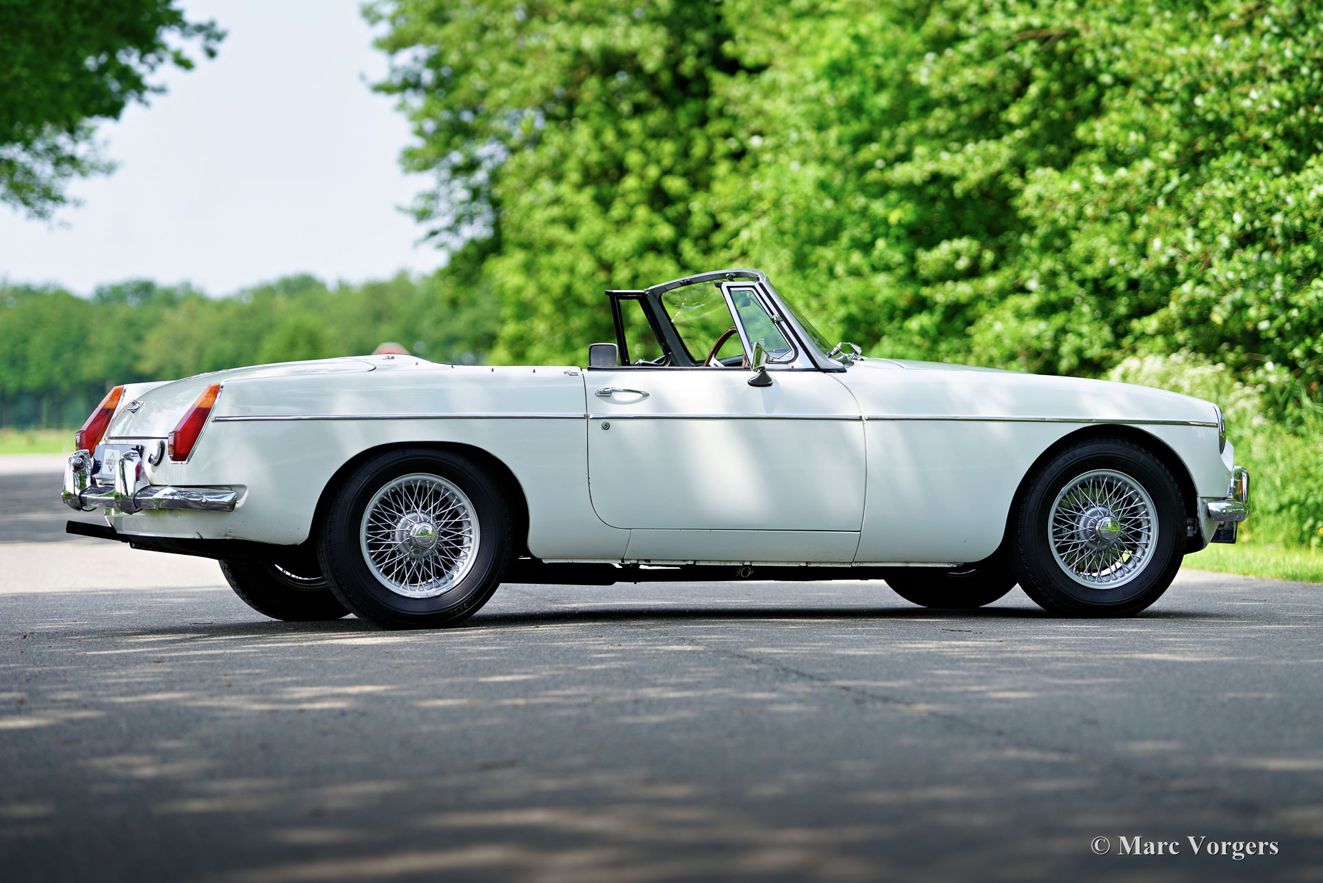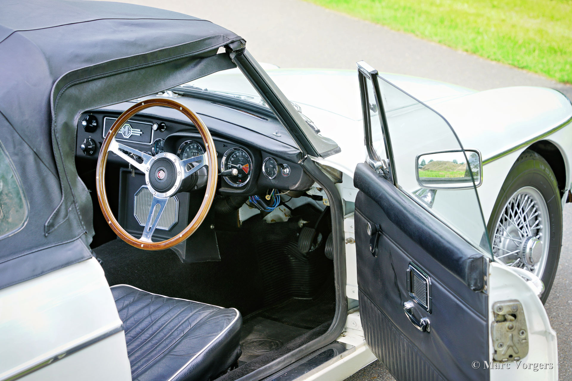 MG MGB roadster, year 1970. Colour white combined with a black leather interior, trimmed with white piping and black carpet. Black soft-top. This beautiful right-hand drive MGB roadster was sold new in the United Kingdom. The car is now in the Netherlands, and it was extensively restored a few years ago. This delightful MGB roadster is in a very good condition! This MGB features the desirable original black metal dashboard, overdrive, chrome wire wheels, and a sports steering wheel with a wood rim. If you wish we can convert this MGB to left hand drive in our workshop at additional costs.
