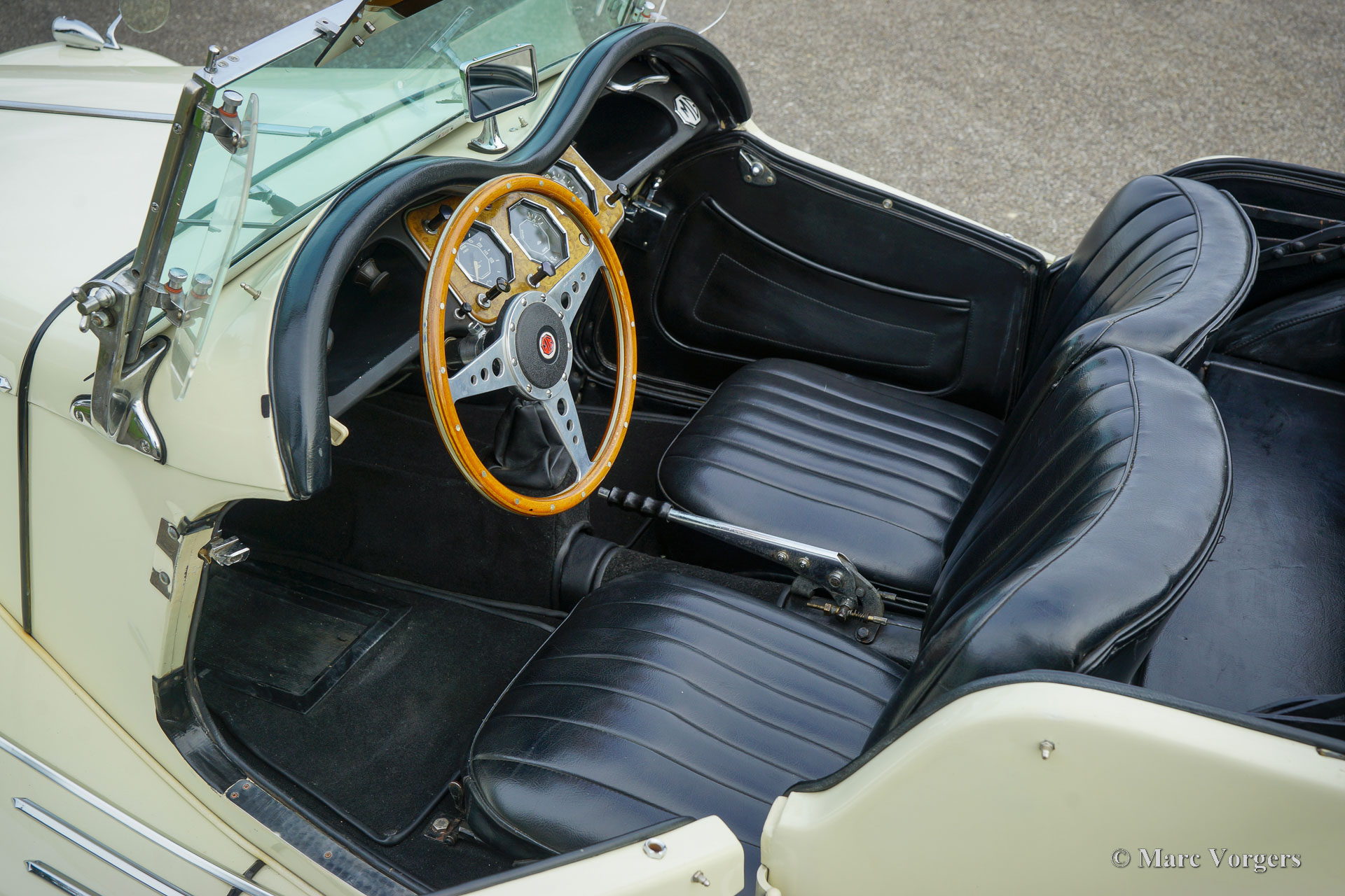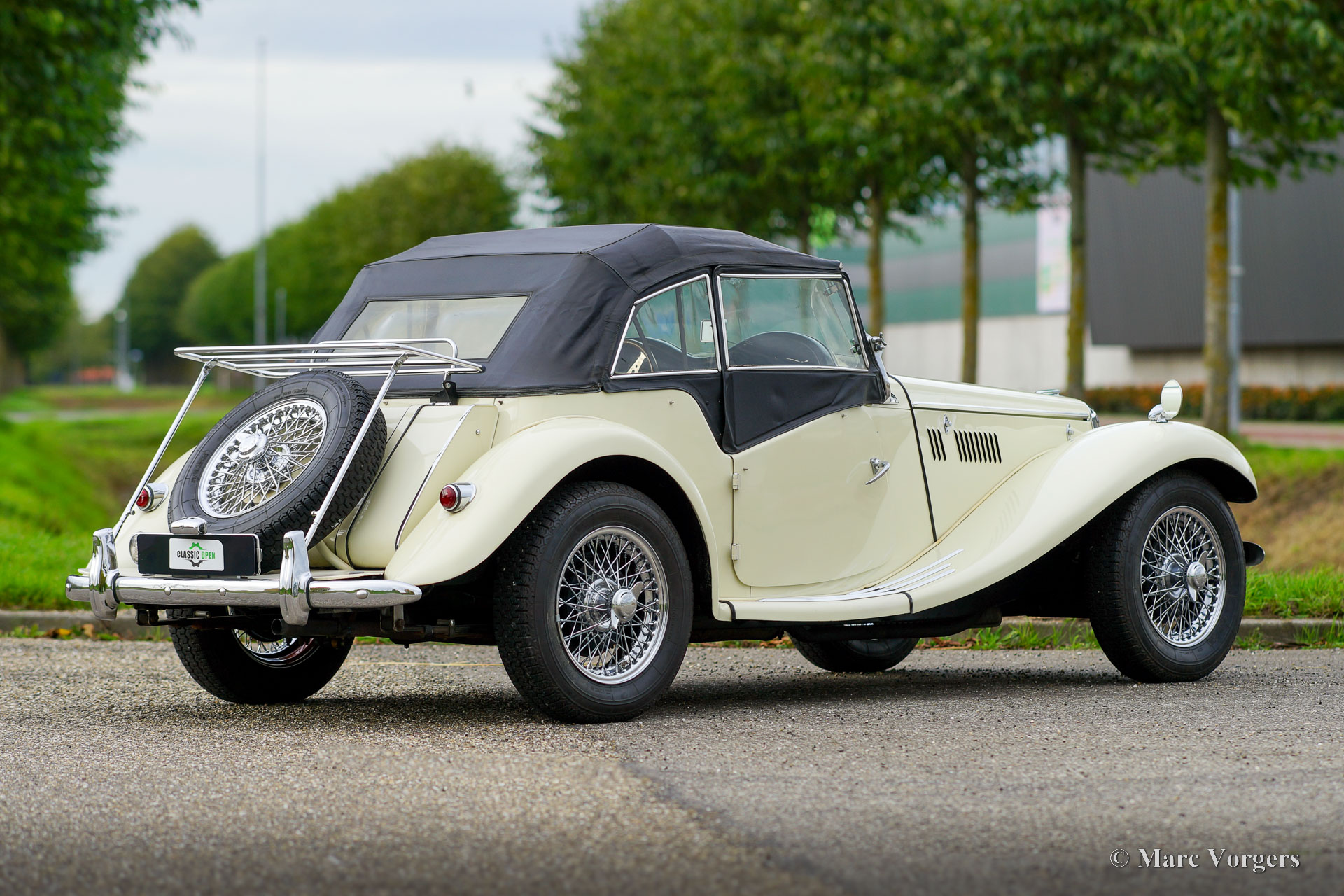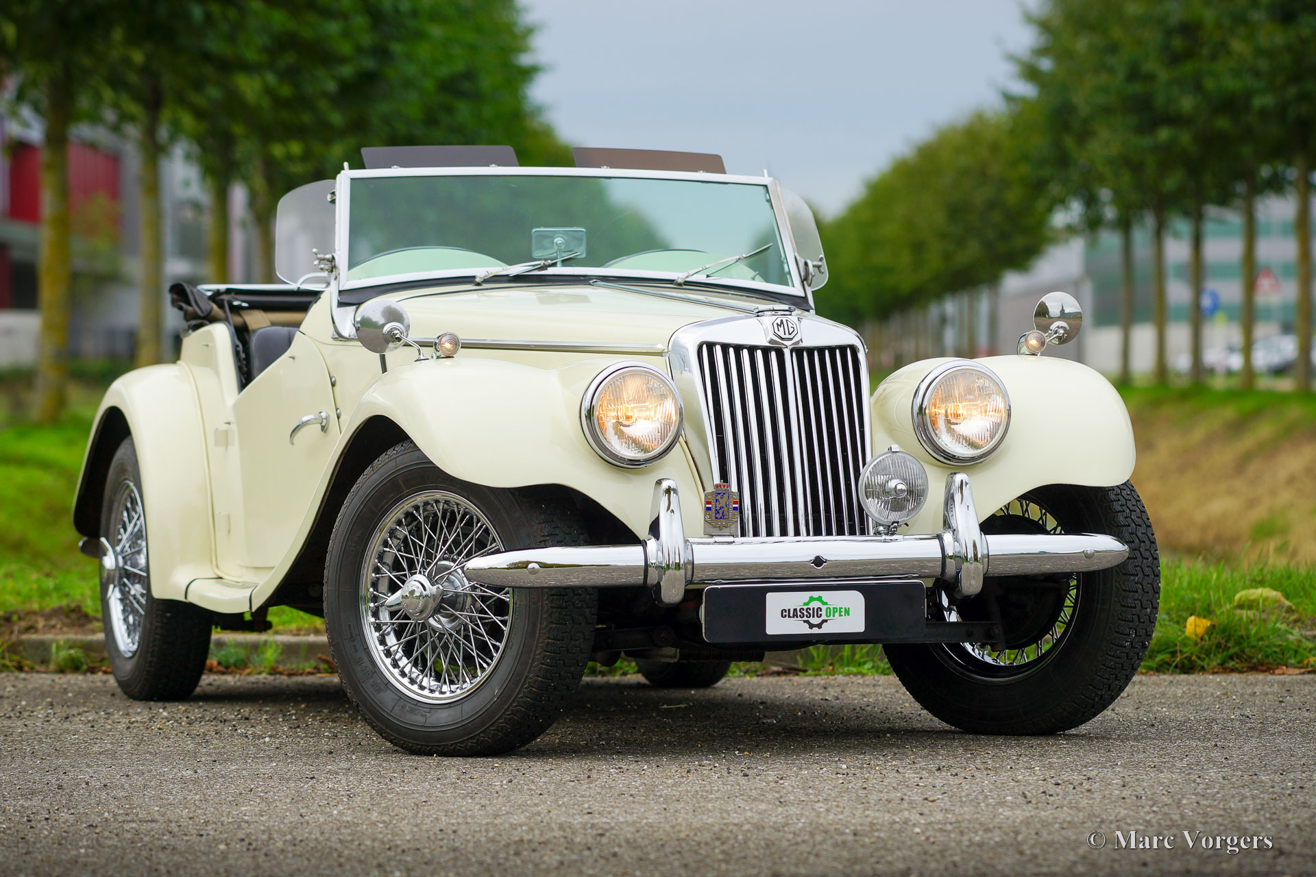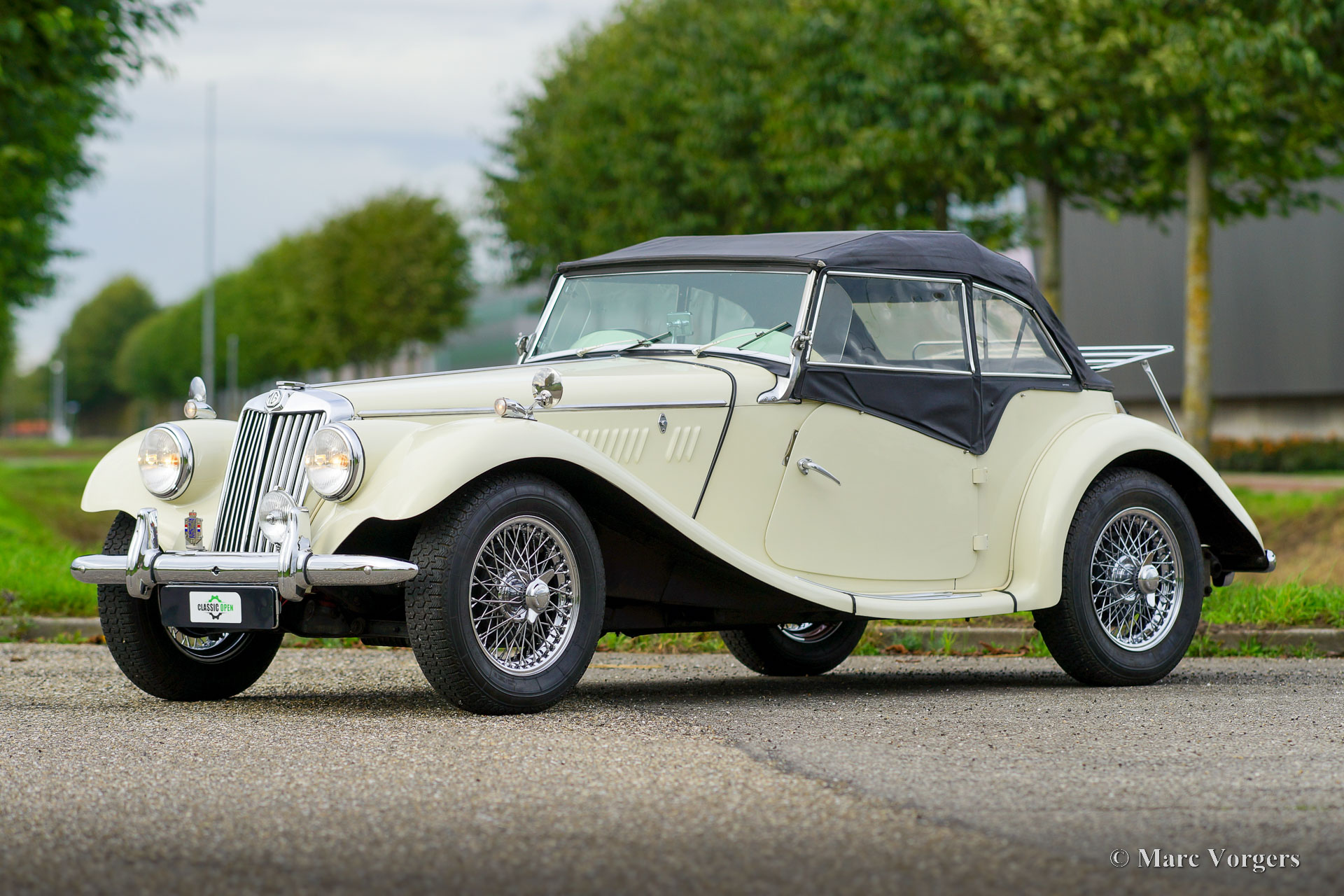 MG TF 1250, year 1954. Colour Old English White combined with a black leatherette interior and black carpet. This wonderful MG TF 1250 was sold new in the United States. The automobile was restored in the past, the car is in a very good condition, and it drives delightfully. The MG TF is the last incarnation of the legendary MG T series which started with the pre-war MG TA. The MG TF features a wider body with more fluently flared mudguards, a slanted radiator, integrated head lamps and a brand-new designed dashboard with octagonal shaped gauges in the centre. The MG TF is powered by the 1250 cc four-cylinder XPAG engine which transmits its power through a 5-speed manually operated gearbox which was added later. This stylish British sports car is fitted with a black vinyl soft top, side-screens with black frames and chrome trim, and a black tonneau cover. Furthermore, the car features chrome wire wheels, a chrome baggage rack, a chrome badge-bar, a Lucas fog lamp, a period reversing lamp and wind wings (deflectors) on the sides of the windscreen frame. This is a delightful 1950s British sports car, ready to be enjoyed by a new proud owner.