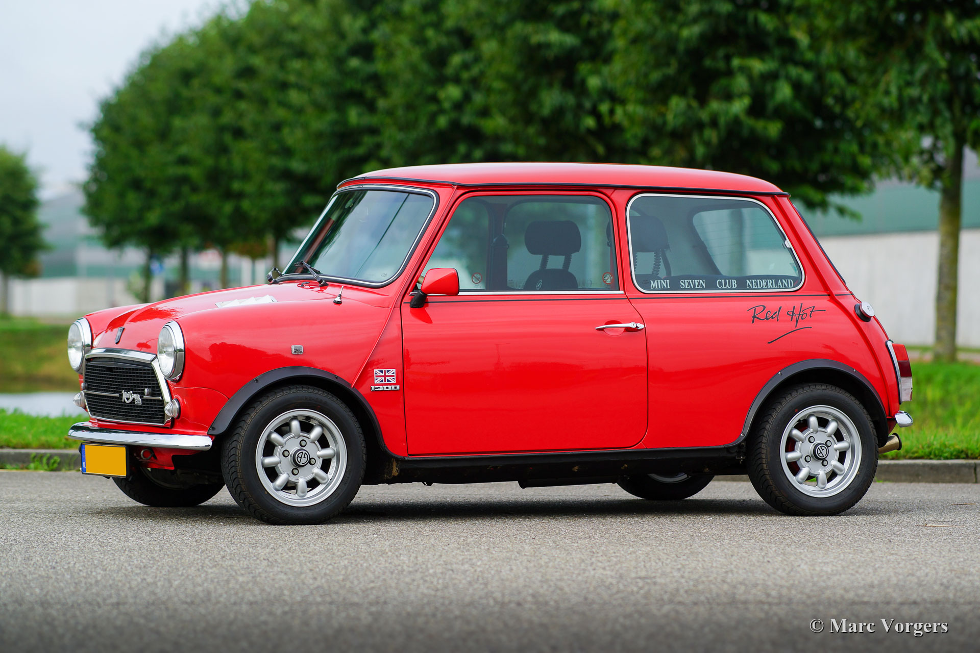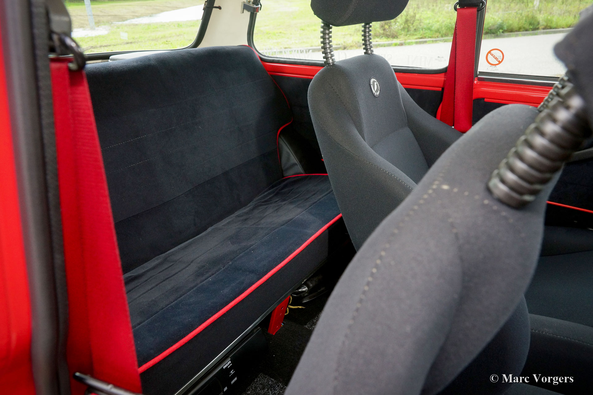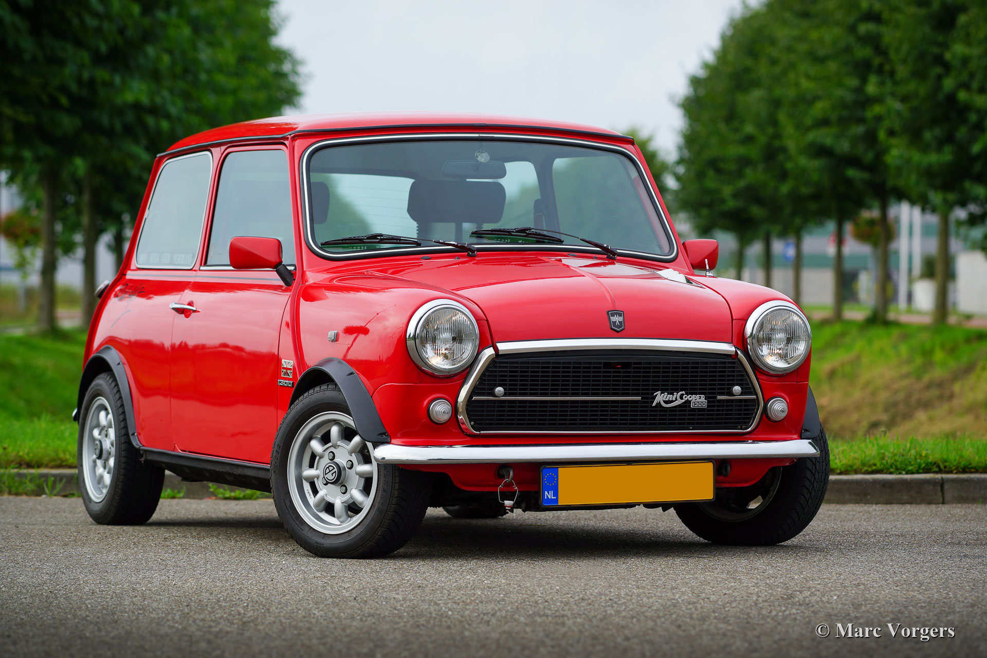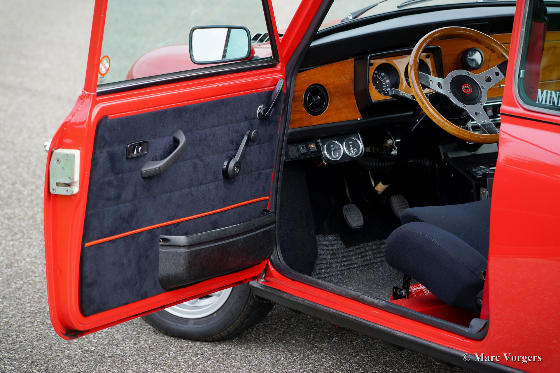 Mini ‘Cooper 1300’ classic, year 1988. Colour red combined with a black cloth interior. This fantastic Classic Mini was sold new as a Mini Red 1000. This beautiful Mini was upgraded with a 1275 cc Cooper engine derived from an Innocenti Mini Cooper – The grille with the Mini Cooper 1300 badge was also taken from the same donor car. The engine features two S.U. carburettors and a ‘fast road’ spec ‘286’ camshaft. The history of this Mini Cooper and the conversion are very well documented. The car is in excellent condition inside and out and the car drives perfectly! The Mini is very sporty, it handles, brakes and shifts superbly and… the soundtrack of the engine is fantastic! This magnificent Mini Cooper features a luxurious interior with special Corbeau bucket seats, a wood dashboard, a sports steering wheel with a wood rim, an engine revolution counter, a powerful HiFi sound system and wonderful 12 inch ‘GB’ alloy wheels. This is a fantastic example!