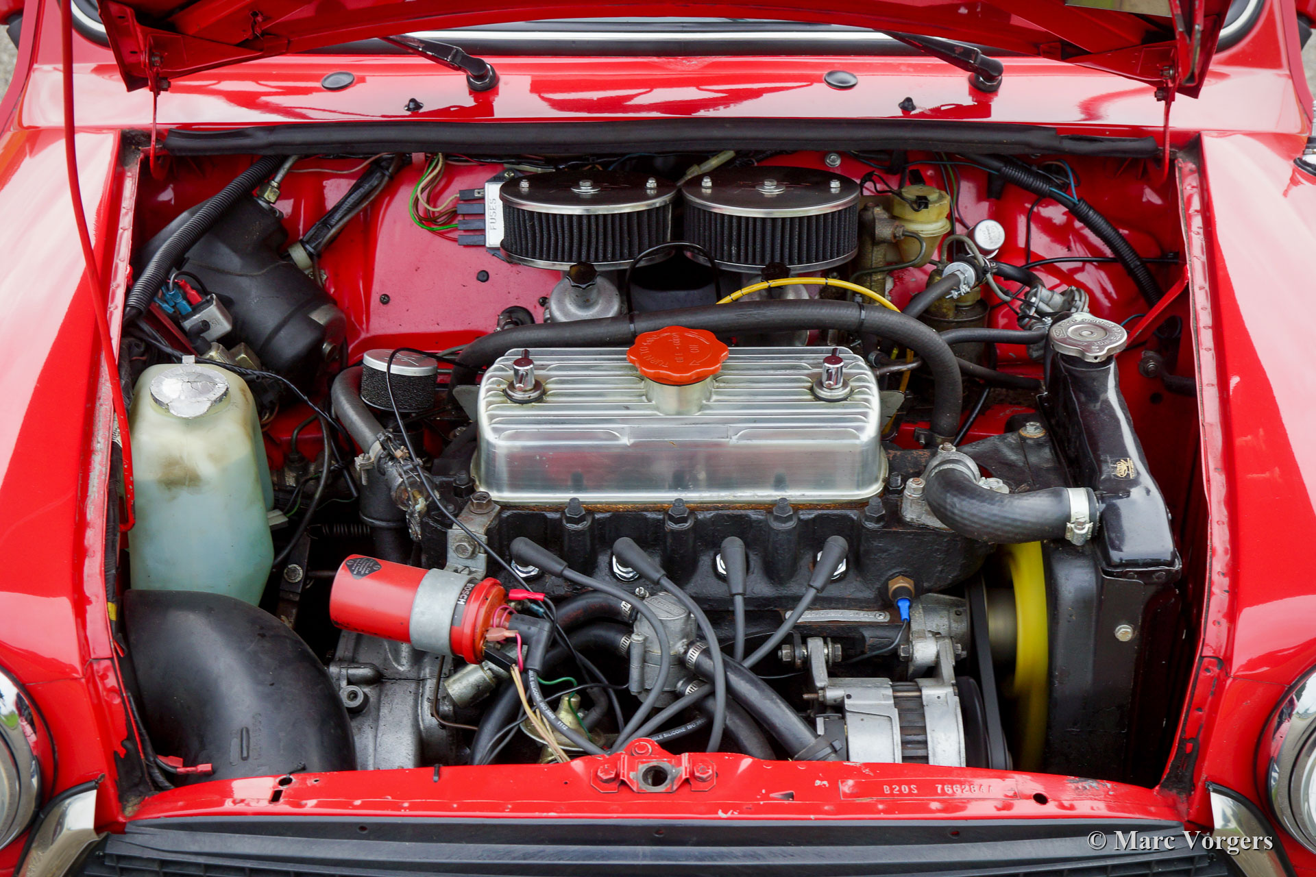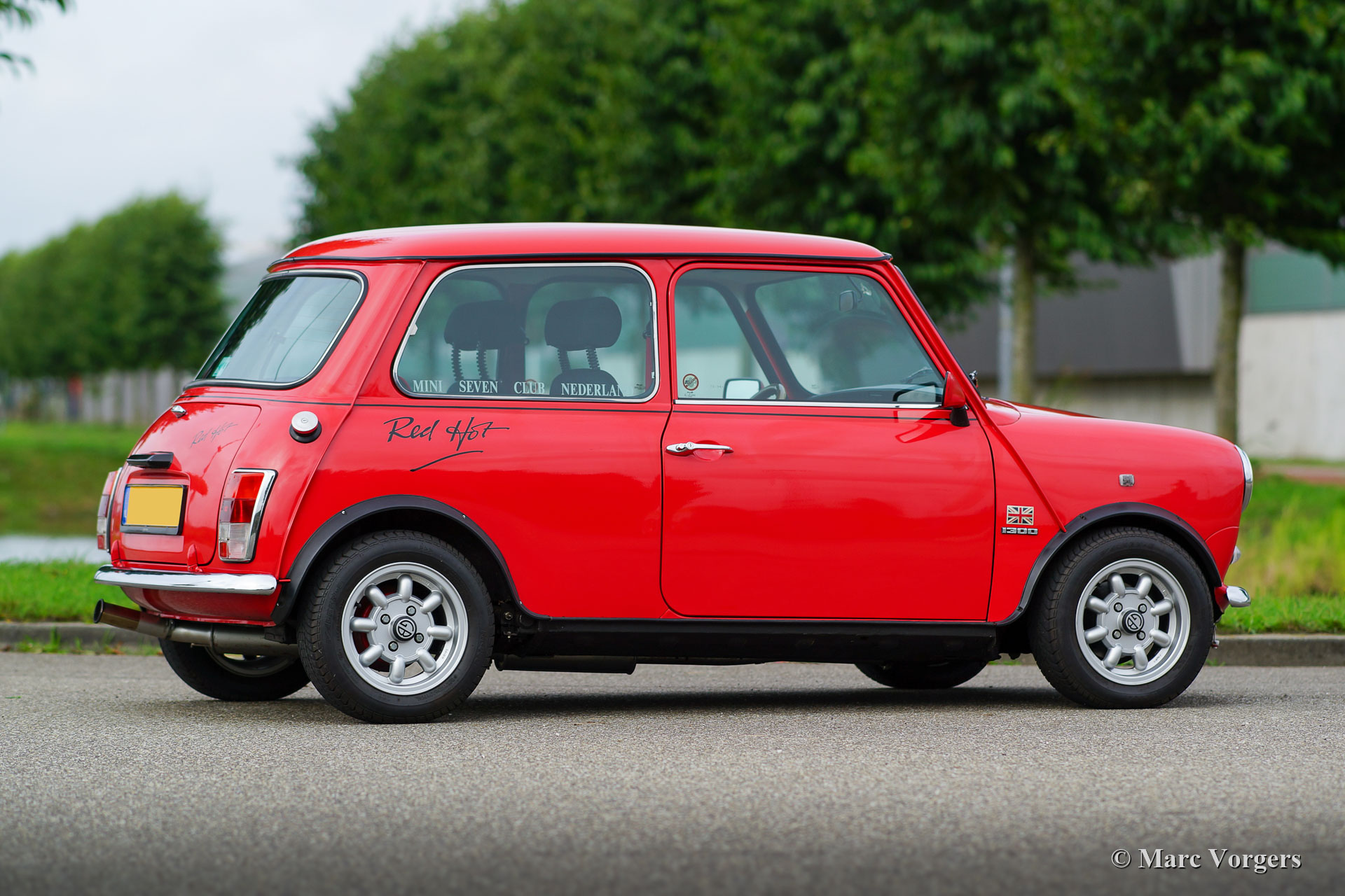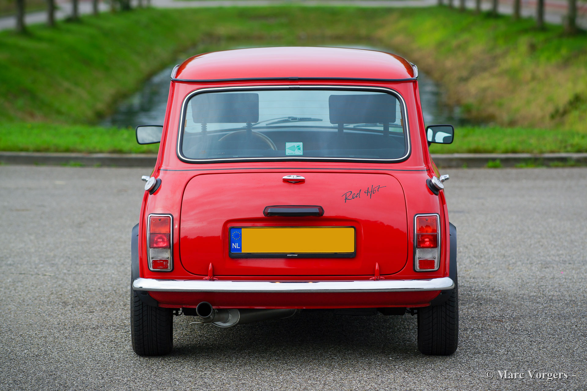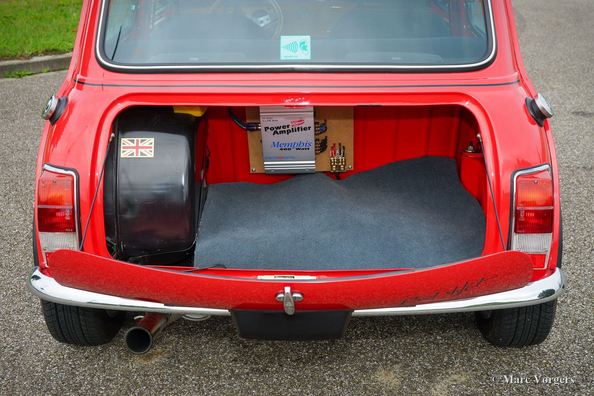 Mini ‘Cooper 1300’ classic, year 1988. Colour red combined with a black cloth interior. This fantastic Classic Mini was sold new as a Mini Red 1000. This beautiful Mini was upgraded with a 1275 cc Cooper engine derived from an Innocenti Mini Cooper – The grille with the Mini Cooper 1300 badge was also taken from the same donor car. The engine features two S.U. carburettors and a ‘fast road’ spec ‘286’ camshaft. The history of this Mini Cooper and the conversion are very well documented. The car is in excellent condition inside and out and the car drives perfectly! The Mini is very sporty, it handles, brakes and shifts superbly and… the soundtrack of the engine is fantastic! This magnificent Mini Cooper features a luxurious interior with special Corbeau bucket seats, a wood dashboard, a sports steering wheel with a wood rim, an engine revolution counter, a powerful HiFi sound system and wonderful 12 inch ‘GB’ alloy wheels. This is a fantastic example!