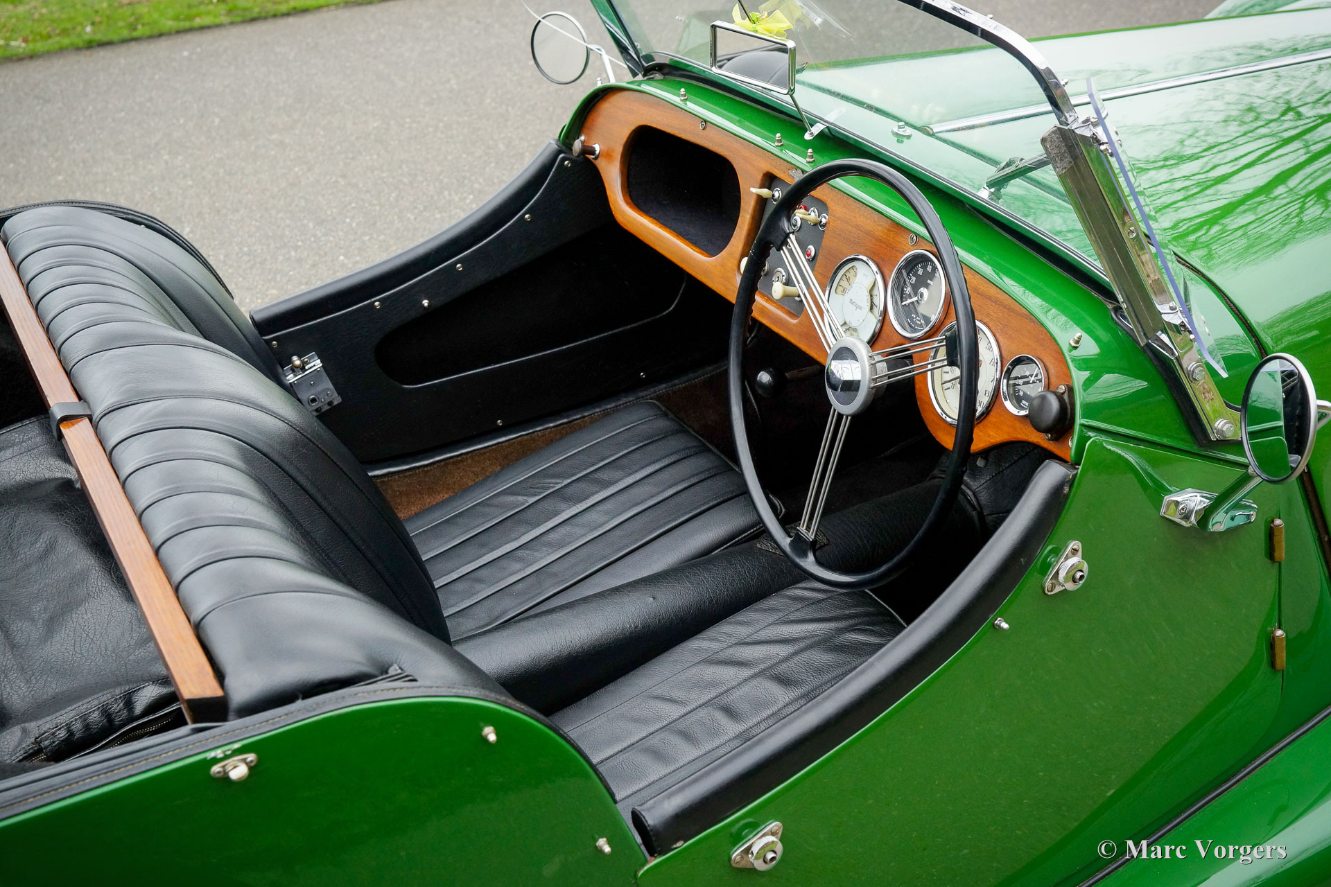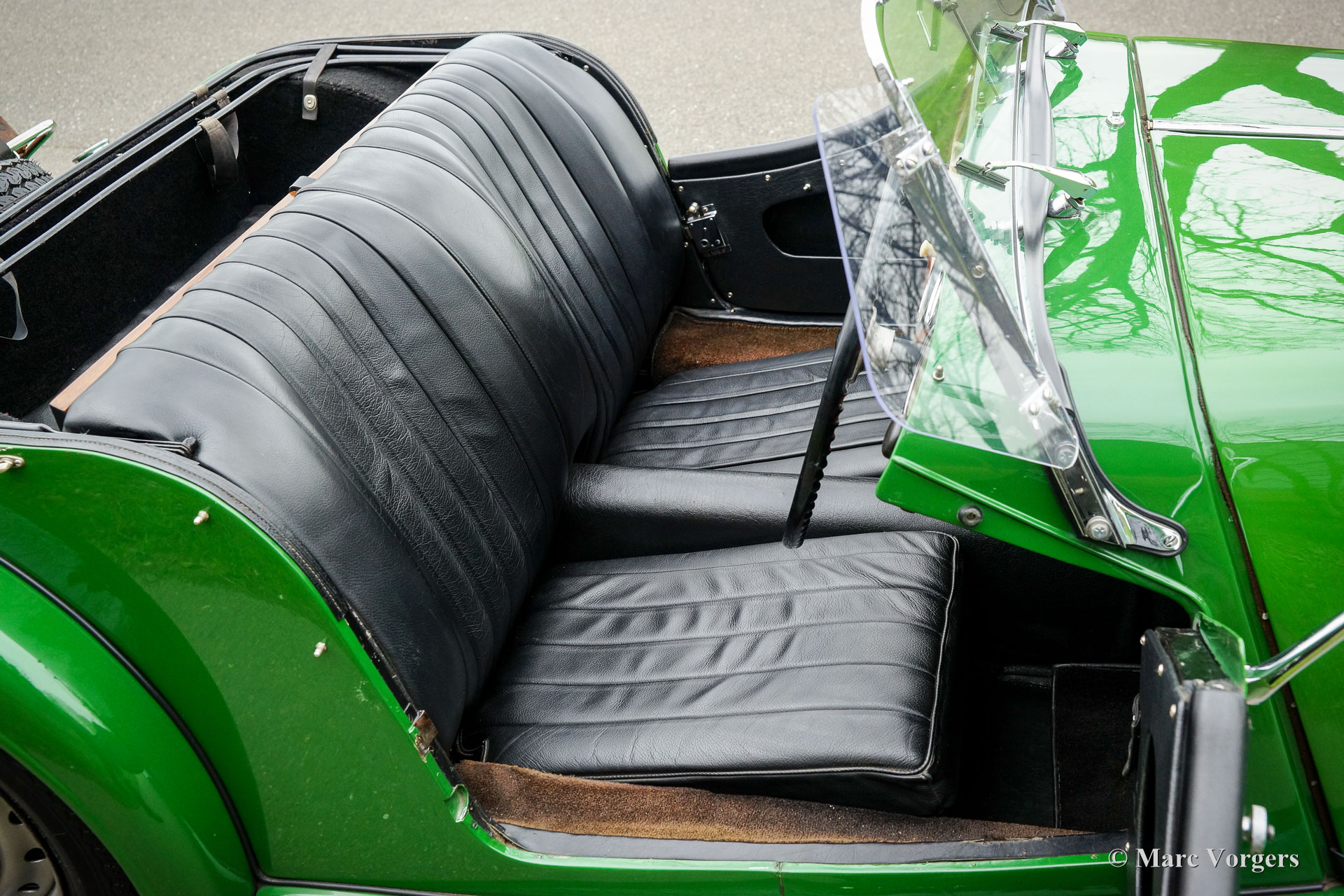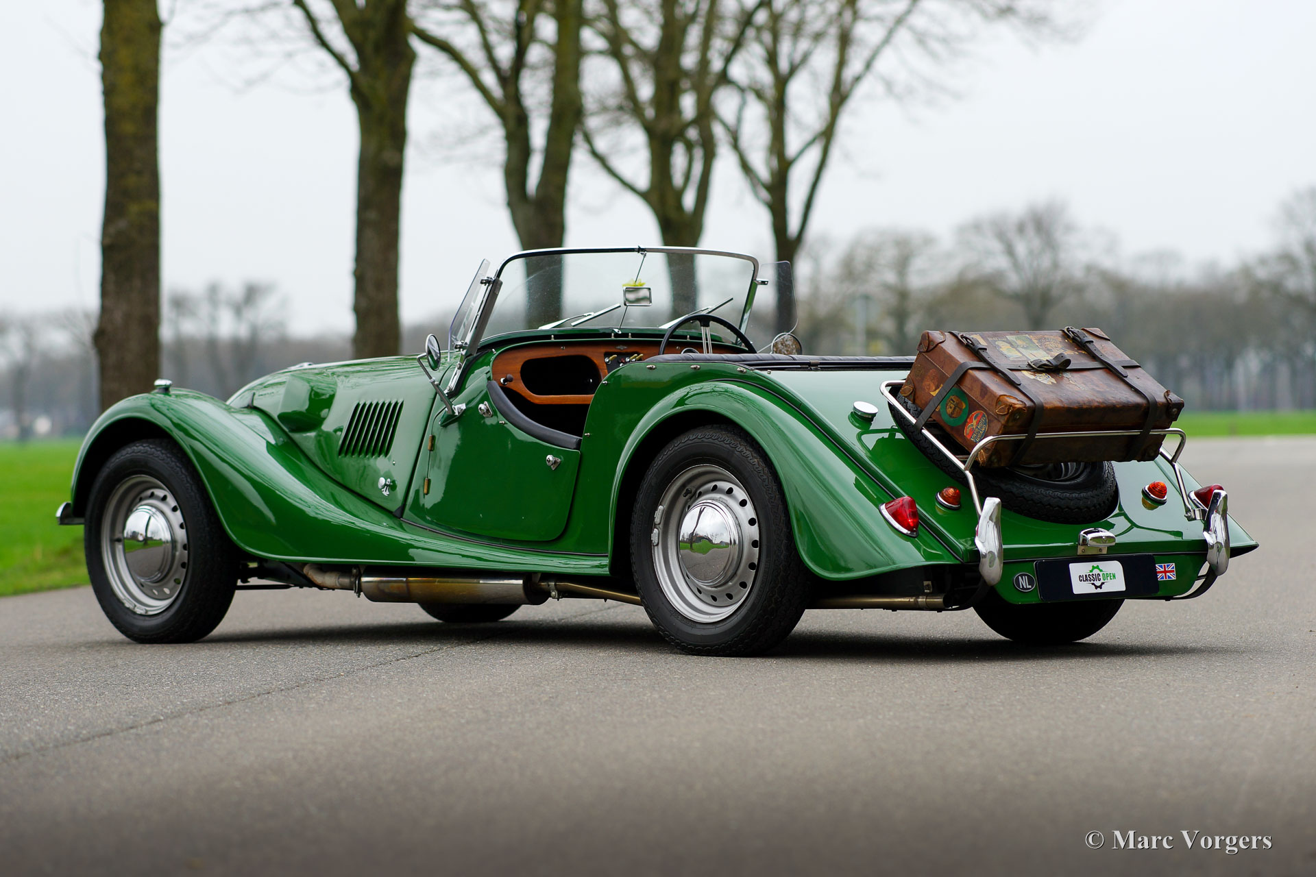 Morgan 4/4, year 1963. Colour green combined with a black leather interior, black carpet, black soft-top, and a black tonneau cover. This vintage Morgan features a wonderfully shaped bench which offers ample comfort in this pure British sports car. This gorgeous Morgan 4/4 (series IV) was sold new in the UK, then it was painted red. It is a rare model of which only 209 examples were built by hand. In 1975 the car was imported to the Netherlands and refurbished. Originally, the car was fitted with a 1340 cc Ford Consul four-cylinder engine, the engine was replaced by a 1500 cc engine of the type used in the Morgan 4/4 series V. This powerful and reliable engine is fitted with a twin choke Weber carburettor and delivers a healthy 84 bhp. Power is transmitted to the rear wheels via a four speed manually operated gearbox. In the years 2001-2004 the automobile was extensively and beautifully restored to top condition. The red car was painted in the current green colour. The restoration is fully documented with a photo report and invoices. The chassis was renewed, as was the wiring loom. A Stainless-Steel exhaust was fitted, an aluminium petrol tank, and electronic ignition. Also, a revolution counter was fitted in the dashboard. The car shows many beautiful original details like the rare 15-inch steel wheels with chrome hub caps! Furthermore, a wide-beam fog lamp is fitted at the front, and a luggage rack ant the rear. This RHD Morgan 4/4 looks a picture and it drives perfectly! A very desirable example!