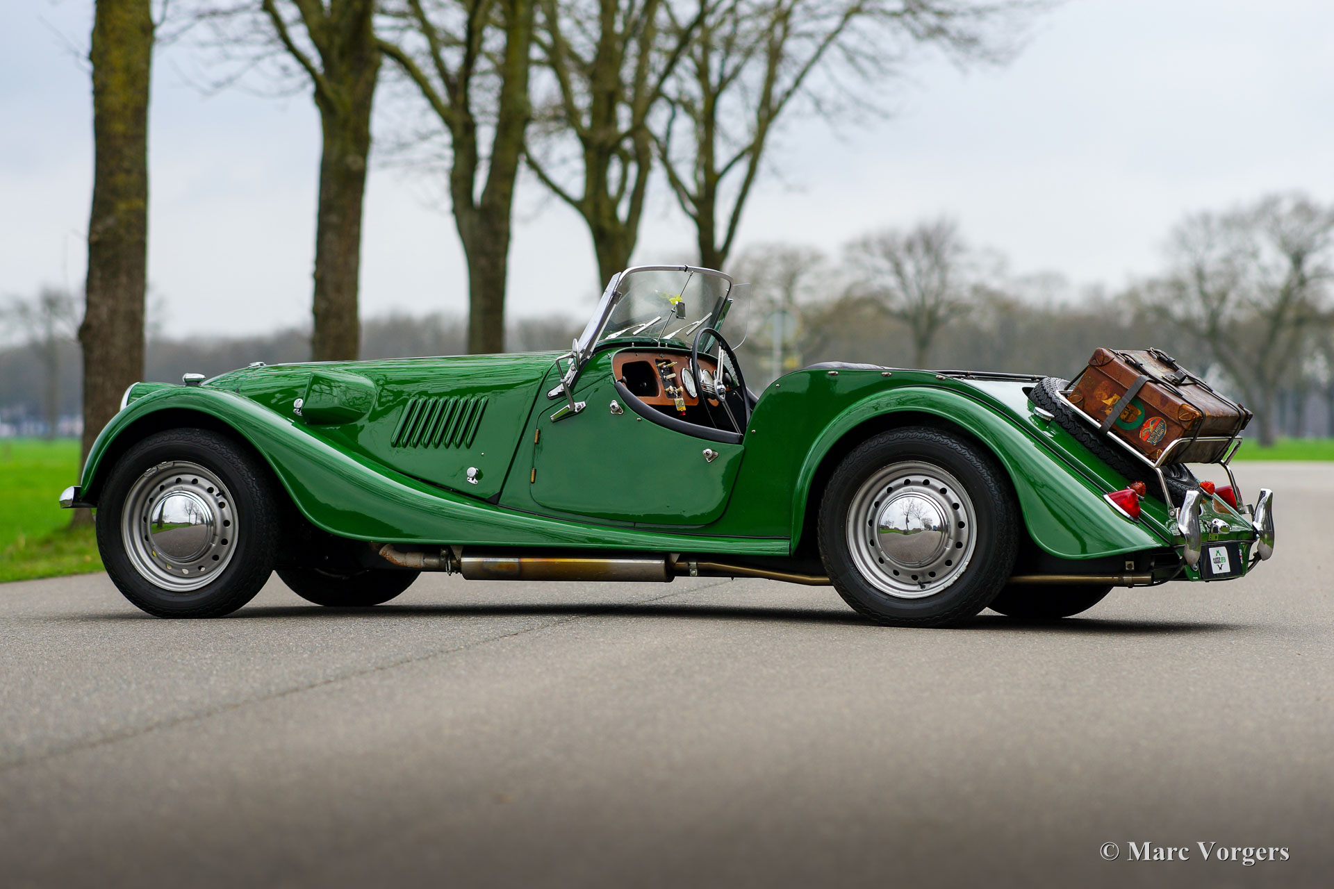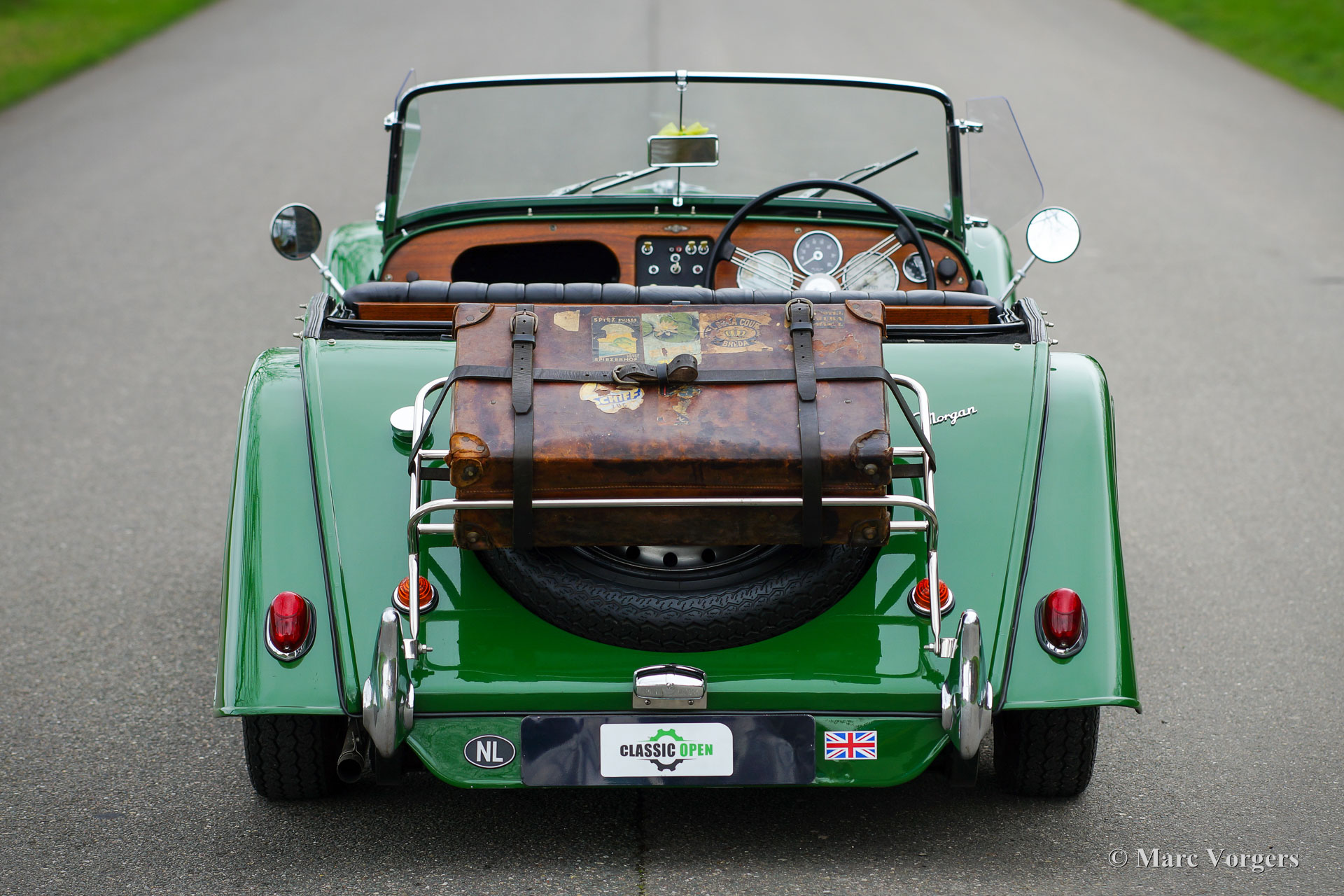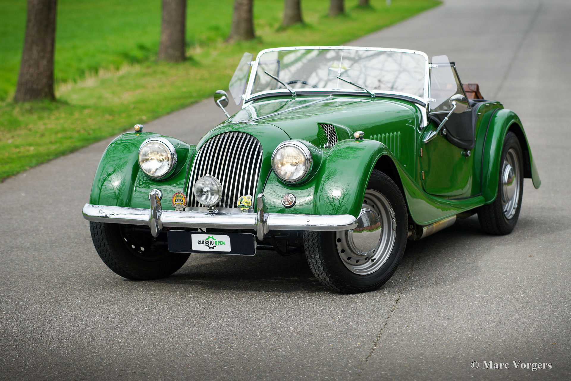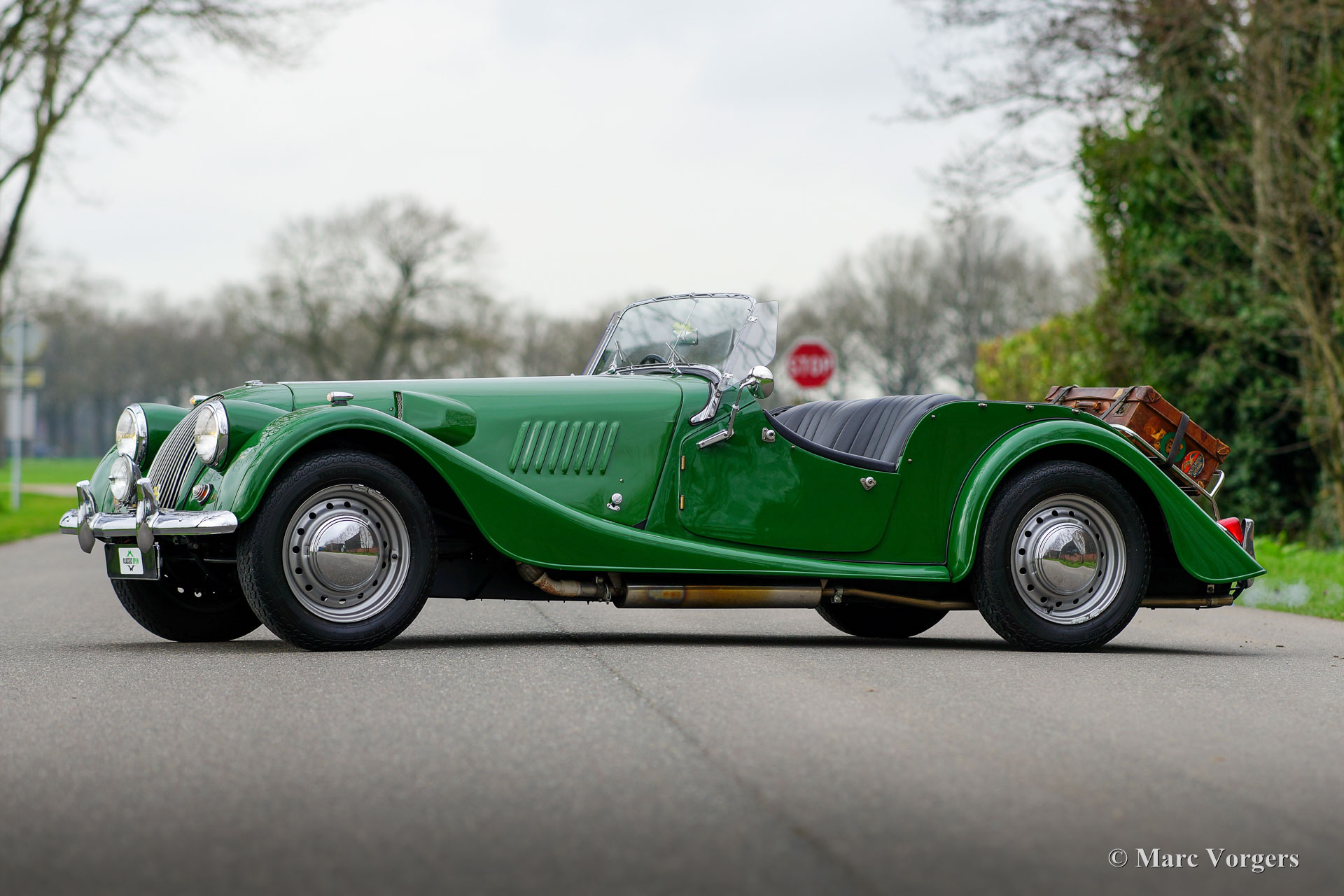 Morgan 4/4, year 1963. Colour green combined with a black leather interior, black carpet, black soft-top, and a black tonneau cover. This vintage Morgan features a wonderfully shaped bench which offers ample comfort in this pure British sports car. This gorgeous Morgan 4/4 (series IV) was sold new in the UK, then it was painted red. It is a rare model of which only 209 examples were built by hand. In 1975 the car was imported to the Netherlands and refurbished. Originally, the car was fitted with a 1340 cc Ford Consul four-cylinder engine, the engine was replaced by a 1500 cc engine of the type used in the Morgan 4/4 series V. This powerful and reliable engine is fitted with a twin choke Weber carburettor and delivers a healthy 84 bhp. Power is transmitted to the rear wheels via a four speed manually operated gearbox. In the years 2001-2004 the automobile was extensively and beautifully restored to top condition. The red car was painted in the current green colour. The restoration is fully documented with a photo report and invoices. The chassis was renewed, as was the wiring loom. A Stainless-Steel exhaust was fitted, an aluminium petrol tank, and electronic ignition. Also, a revolution counter was fitted in the dashboard. The car shows many beautiful original details like the rare 15-inch steel wheels with chrome hub caps! Furthermore, a wide-beam fog lamp is fitted at the front, and a luggage rack ant the rear. This RHD Morgan 4/4 looks a picture and it drives perfectly! A very desirable example!