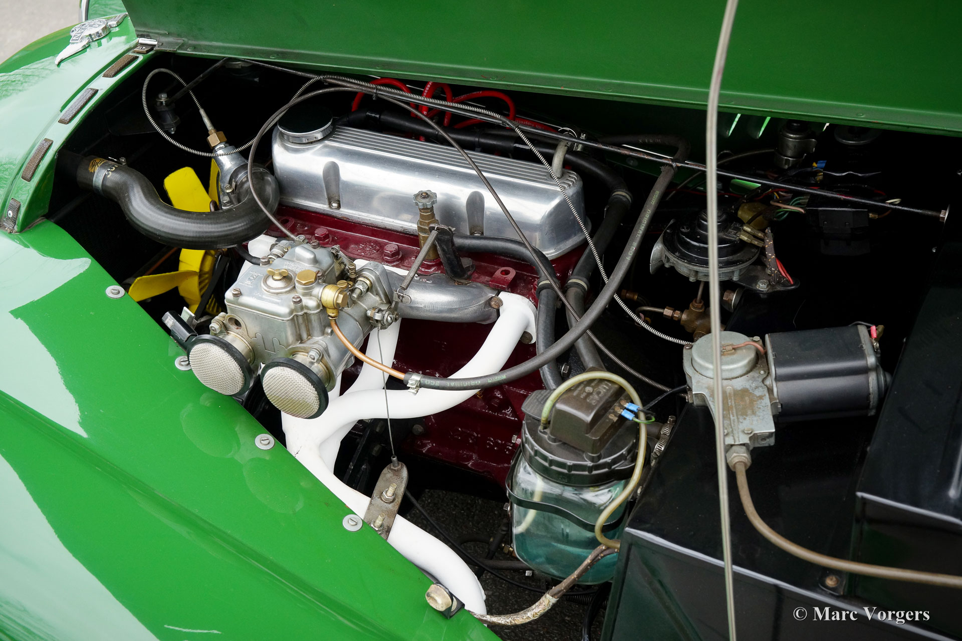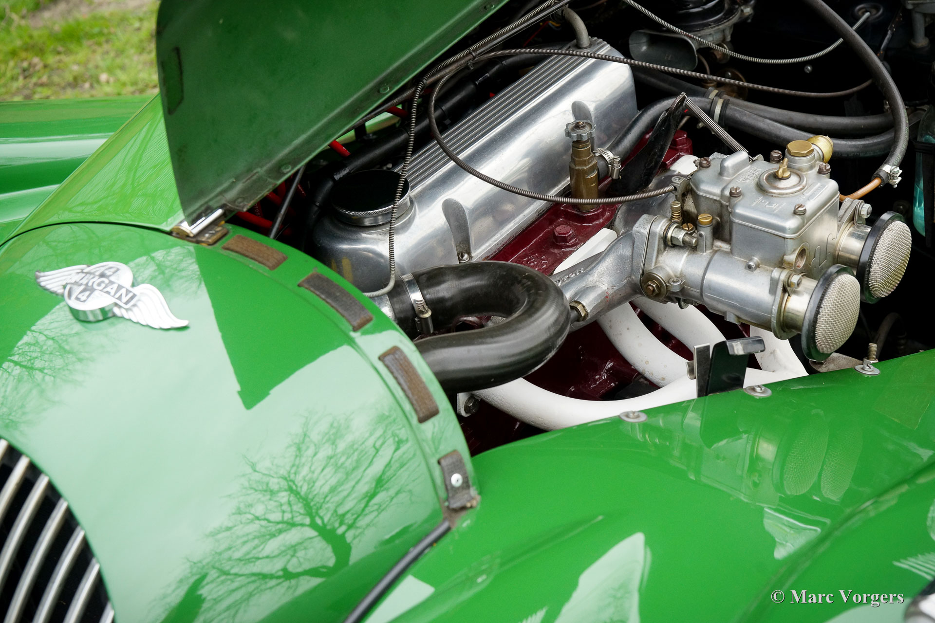 The Morgan 4/4 was built for over 50 years. The first model, introduced in the year 1936 was the 4/4 with flat radiator which was built until the year 1951. After a four year break (only the Morgan plus 4 was built those years) the Morgan 4/4 was going to be rebuild. The car did not change a lot (conservative as they are at the Morgan company), only the shape of the radiator changed from flat to cowled. Morgan never built their own engine, the early flat radiator cars were powered by Standard or Ford engines. The cowled radiator models were powered by Ford engines. The Ford engine used was known as the "Kent" engine and was also used in Fords Cortina model. Morgan 4/4 1600 cars were powered by the 1599 cc. Ford Kent engine which had a standard capacity of 98 bhp. giving the light car (two seater 660 kg./ four seater 785 kg.) sporty performance. The cars were fitted with a four speed manual gearbox. The modern Morgan 4/4 models are powered by a Ford Zetec 16V engine. These cars feature petrol injection and a five speed manual gearbox. The Morgan 4/4 is a very special car to drive because it has it's own strong character. It cannot be compared with any other roadster or convertible.