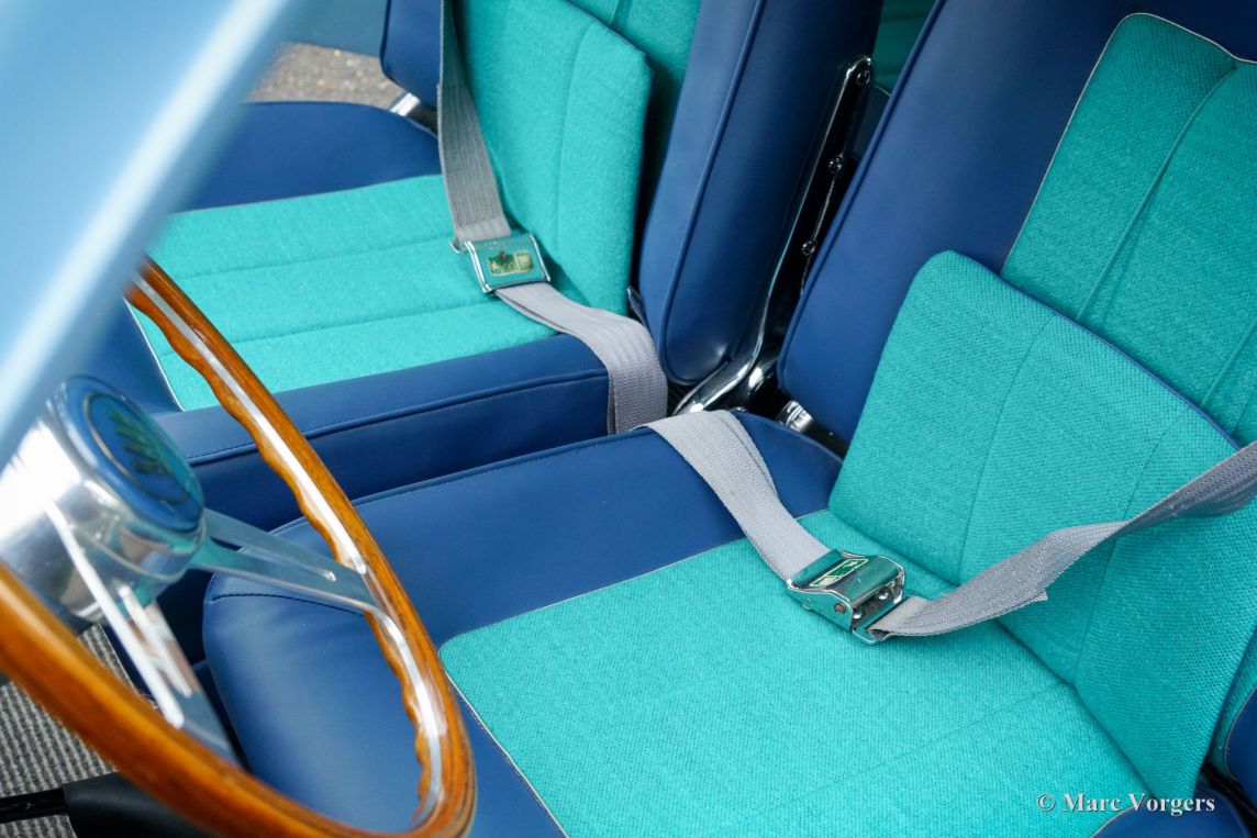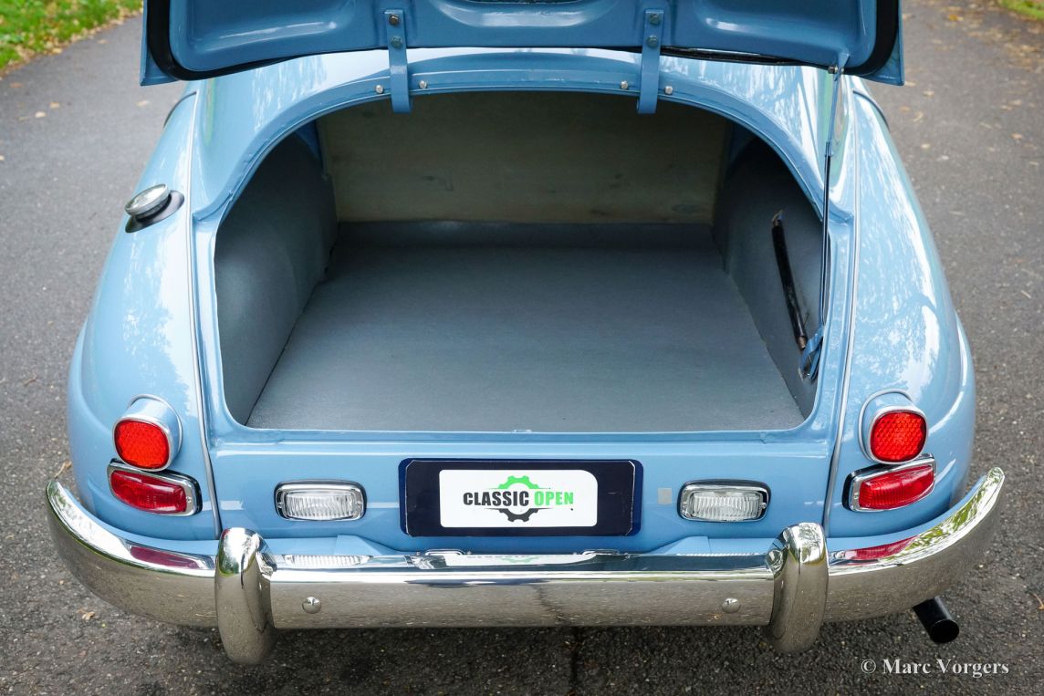Saab 93B Granturismo 750, year 1959. Bodywork finished in blue combined with a blue green vinyl/cloth interior trimmed with silver piping. This very special Saab Granturismo 750 comes from the rare second ‘B’ series of which only four cars are still known to exist! The Saab was sold new to the USA where it was registered in 1959. In the year 2018 the Saab was shipped to the Netherlands where the automobile was extensively and perfectly restored to original factory specifications. Costs nor effort were spared aiming for perfection. The bodywork was stripped to the naked metal and restored, the interior was newly upholstered using the correct materials, and the mechanical components were overhauled by professional specialists. This rare example is in a superb top condition, which will appeal to discerning collectors. The Saab 93 GT750, introduced at the 1958 New York Automobile Show, was an early attempt to combine sportiness and luxury, a novel concept at the time. Developed specifically for the American market, it was a modified version of the standard 93B. Its three cylinder two-stroke engine was upgraded from 38bhp to 50bhp, and a 57bhp Super version was also available for racing. These modifications, a significant power increase for its era, were done by hand in a special department after the cars left the production line. The GT750 featured a sports interior with a special dashboard, wooden steering wheel, and adjustable seats. It was the first car to be fitted with seatbelts as standard, specifically two-point lap belts. A limited initial run was shipped to the US in mid-1958. Despite initial success, sales declined, and production, originally planned for 500-600 units, was scaled back to an estimated 250-300 cars. In terms of rarity, this Saab ranks third in Saab history. Four Ursaab prototypes were built between 1946 and 1947, and six Saab 94 Sonnett I prototypes were built between 1956 and 1957. In third place is the Saab 93B Granturismo 750. This is a unique chance to add a true museum piece to your (Saab) collection!
