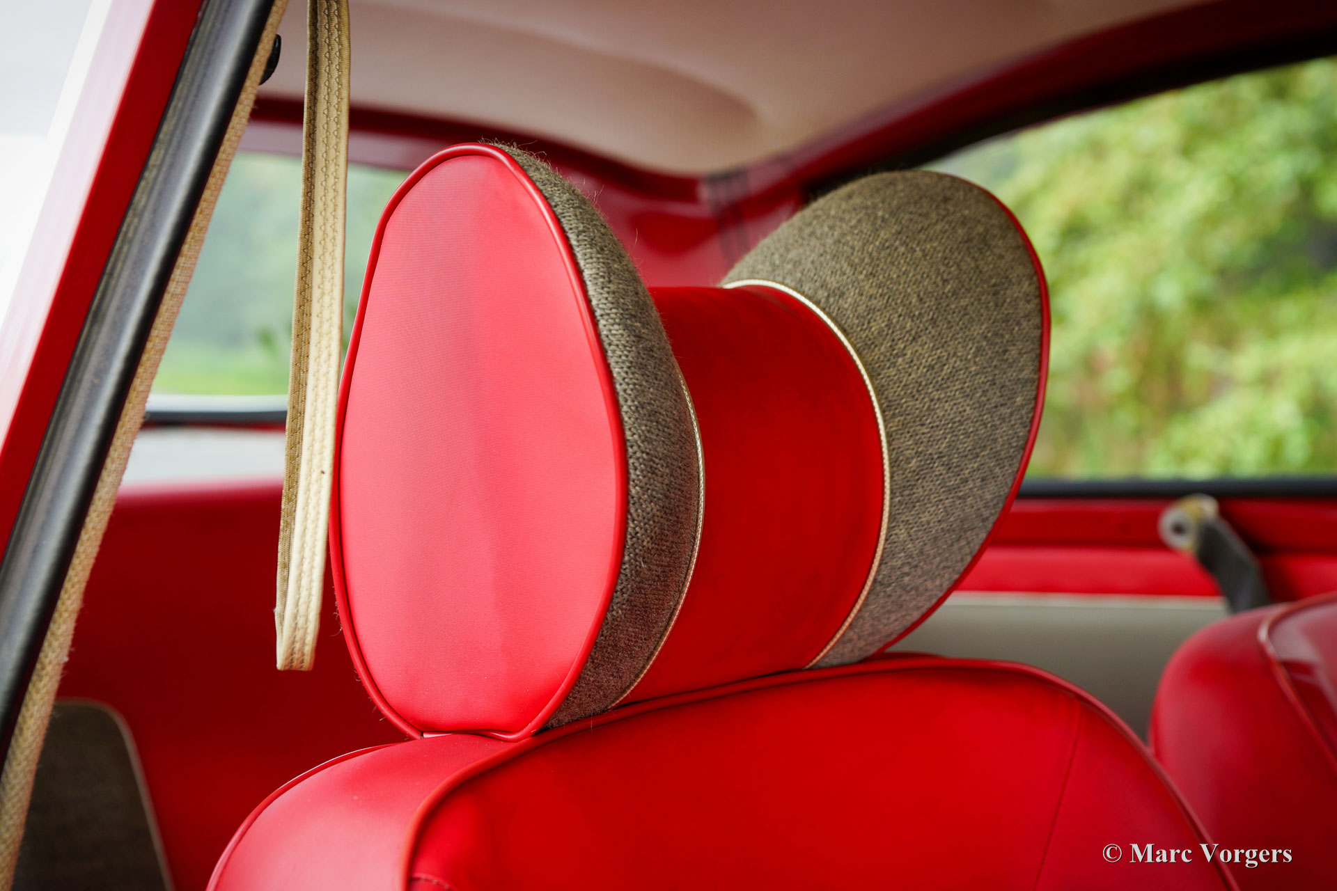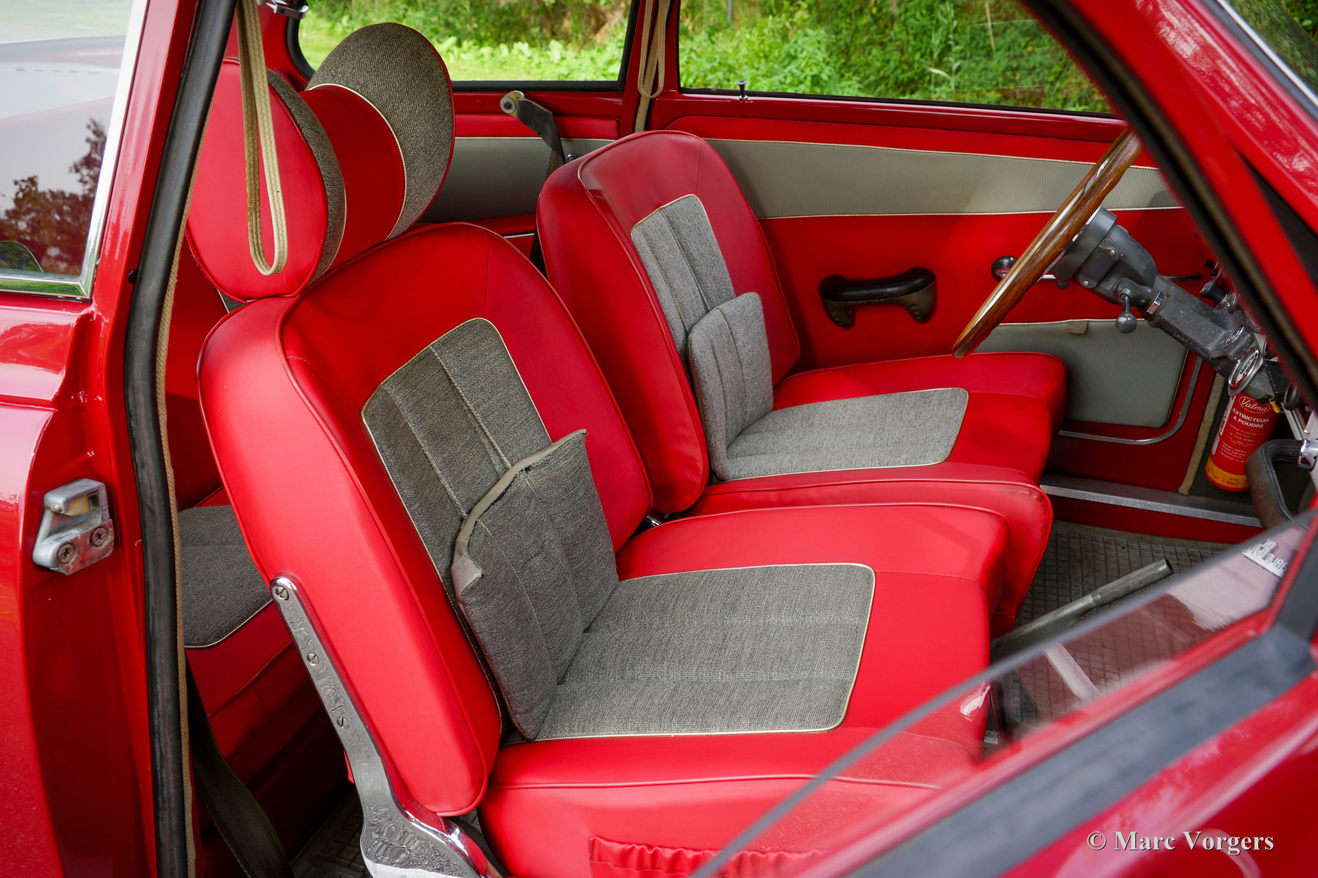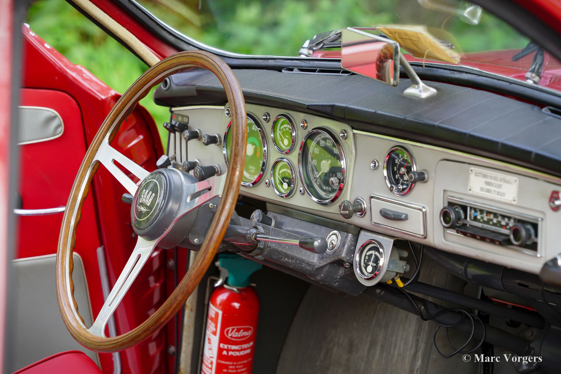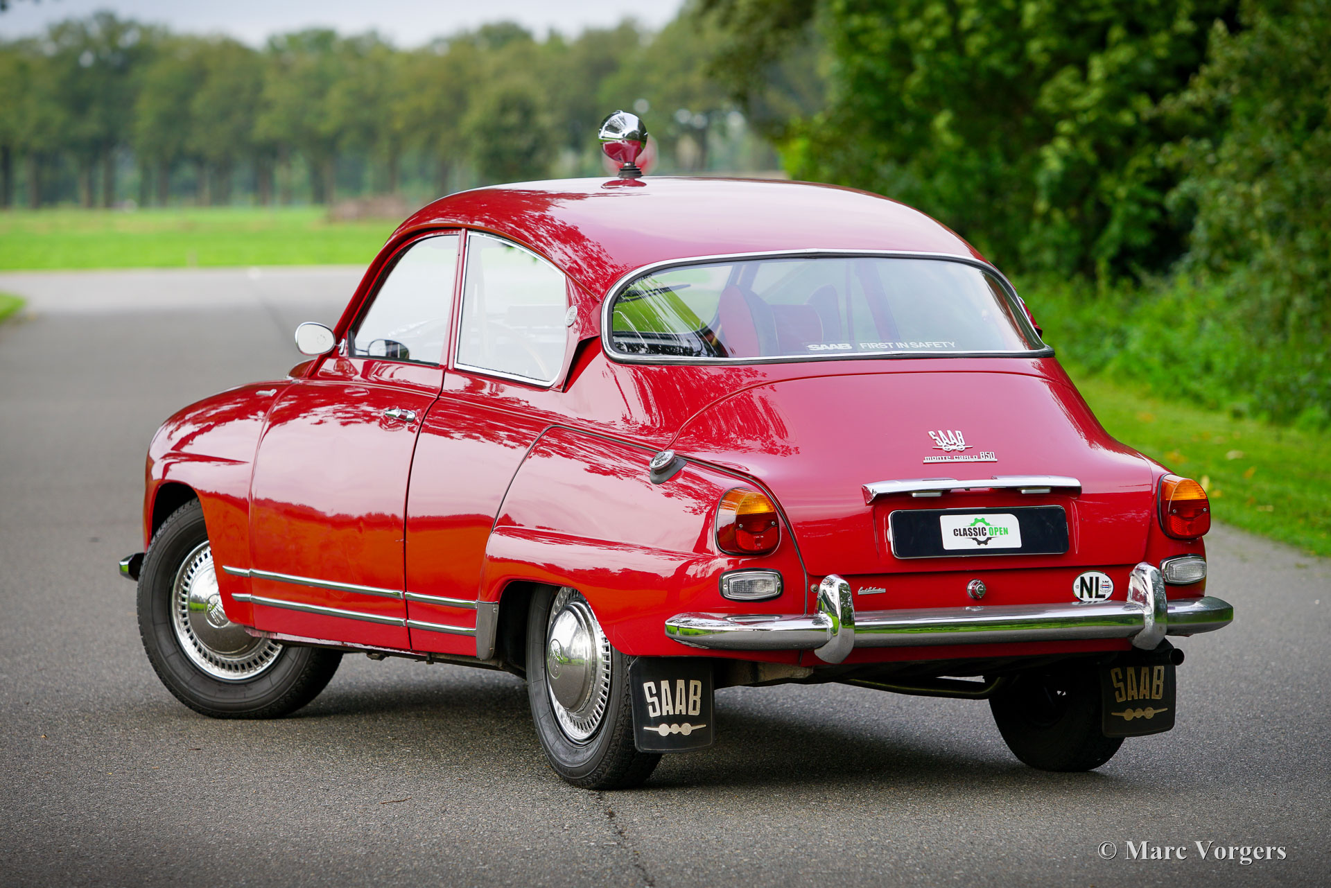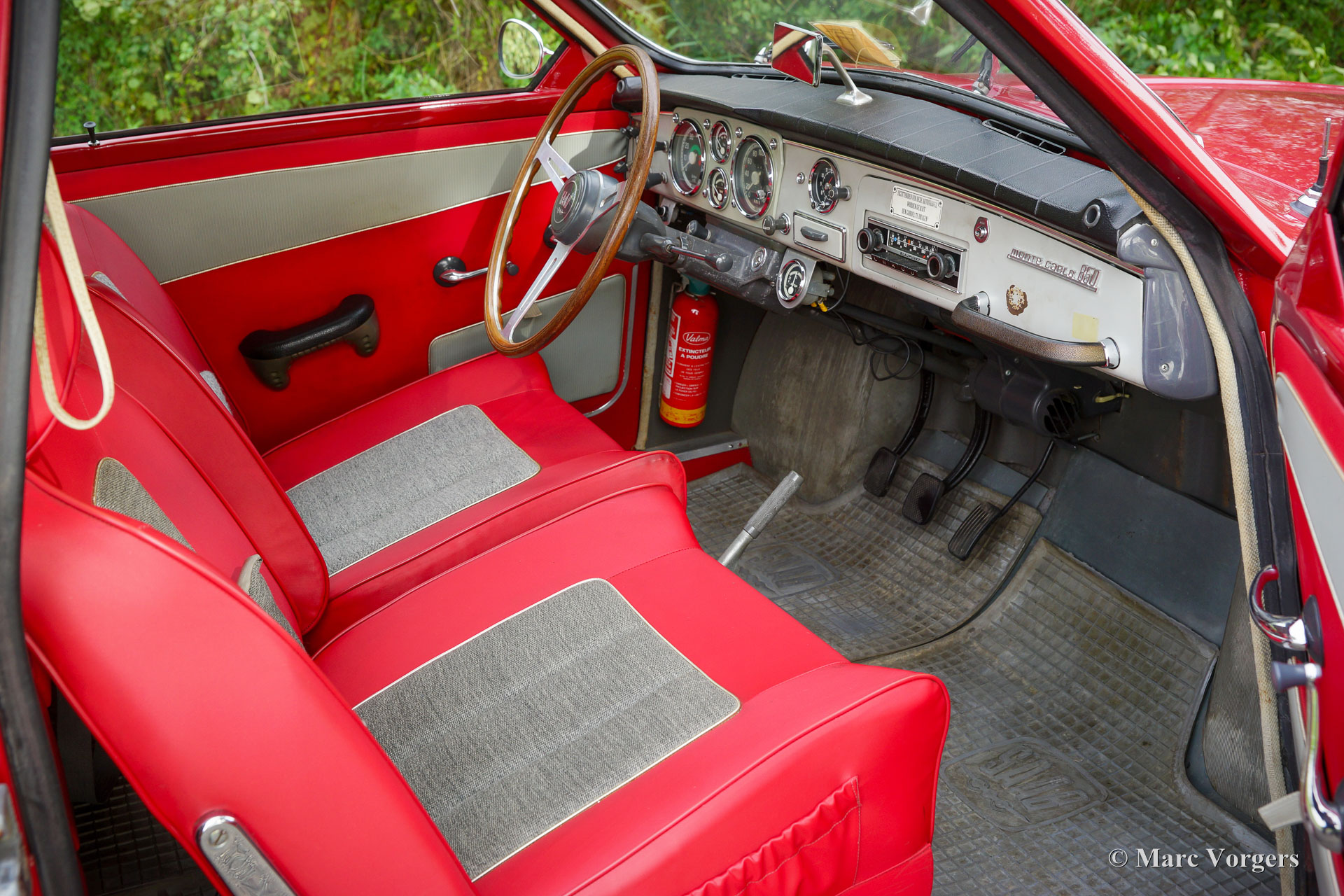 Saab 96 Monte Carlo 850 (Two Stroke), year 1965. Colour Toreador Red with the unique two tone red/ grey Monte Carlo interior. This fantastic and scarce Saab 96 Monte Carlo was sold new in the Netherlands. From new, the car has known only two owners! The car was with the first owner for 53 years until it was sold to the second owner in 2018. This bodywork of this Saab 96 was perfectly restored in the past and the three-cylinder two-stroke engine was overhauled. This desirable Saab 96 Monte Carlo 850 is in a very good condition! The Saab 96 Monte Carlo 850 was built to commemorate the victories of rally driver Erik Carlsson in the 1962 and 1963 Monte Carlo rallies. The Monte Carlo model features special options and details: The 850-cc engine is fitted with three carburettors, an automatic two stroke oil lube system, and the wheels are mounted to the hubs with five bolts instead of four on other Saab 96 models. Optically the Monte Carlo distinguishes itself by the ‘Monte Carlo’ badges, special seats and rear bench, the sporty dashboard with wood rimmed steering wheel, special door cards and double chrome strips on the sides. As extra this Saab features a rally roof search-lamp which can be directed from the inside. The driving experience of a two-stroke Saab 96 is unique, the sound of the engine, the free-wheel clutch, the comfortable ride, the superb roadholding, and the wonderful aerodynamic design. This is a rare Saab 96 Monte Carlo 850 in very good condition!