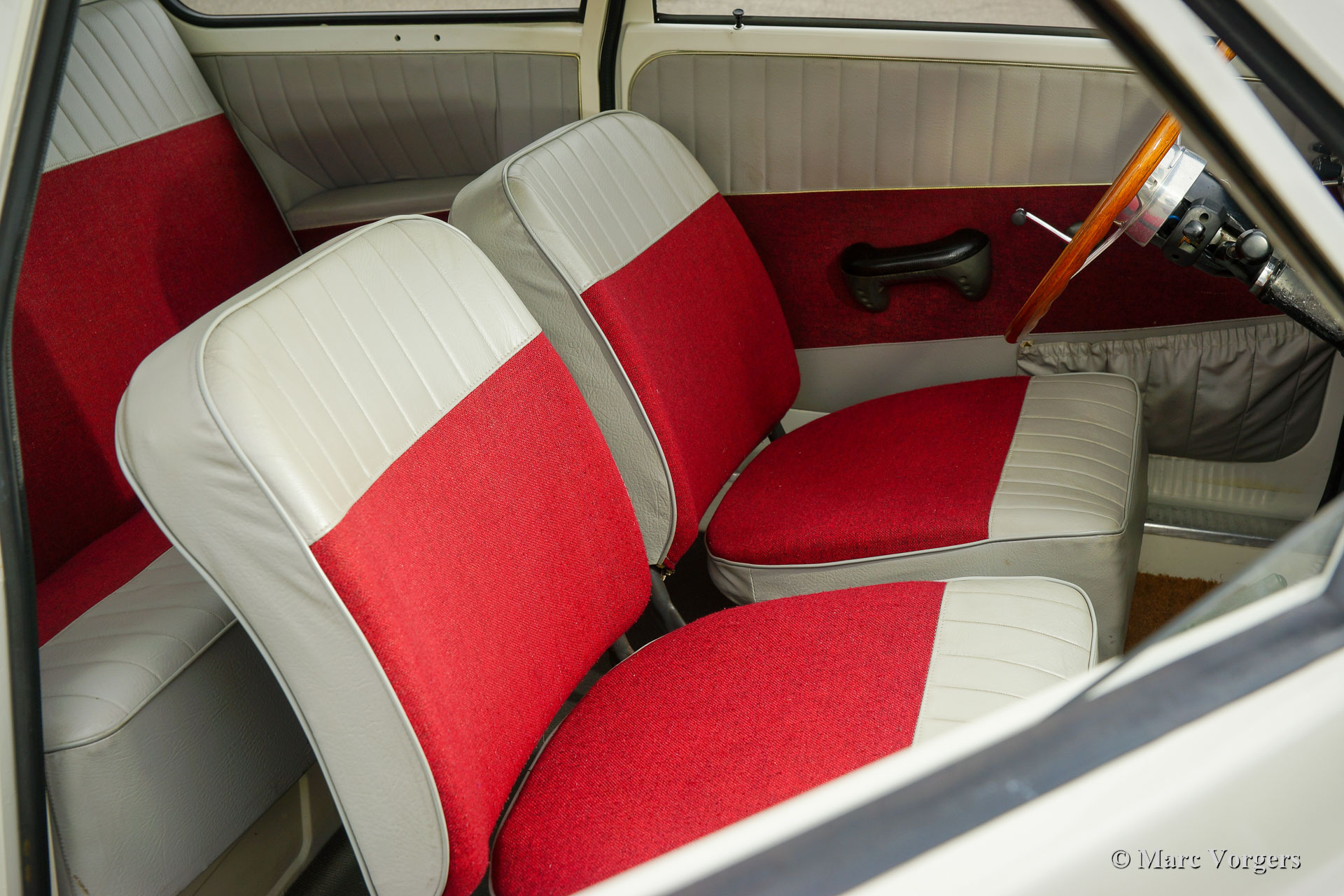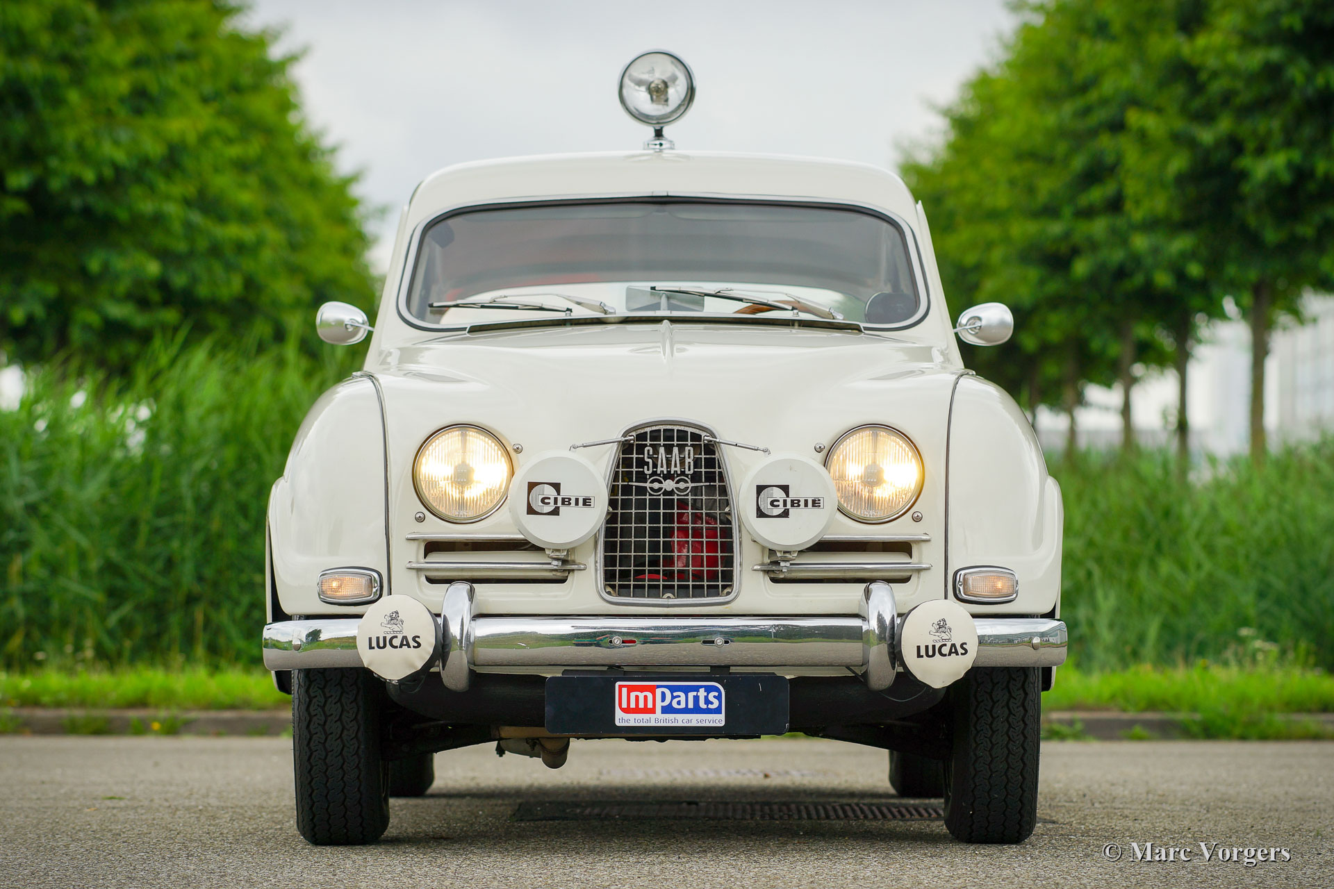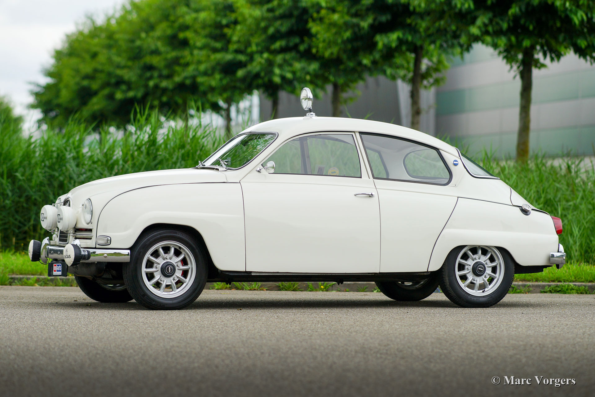 Saab 96 ‘two-stroke’, year 1964. Colour white combined with a red interior. This fantastic Saab 96 was extensively restored and overhauled. The engine was overhauled using the correct quality parts and it runs perfectly. The engine is the renowned 3-cylinder 850 cc two-stroke unit which is mated to a four speed manually operated gearbox. This fine Saab is fitted with wonderful ‘Minilite’ style alloy wheels, disc brakes at the front wheels, additional driving lamps at the front, a rally search light on the roof and a special sports exhaust! This Saab features the dashboard with the round gauges. This is a gorgeous and sporty Saab in excellent condition!