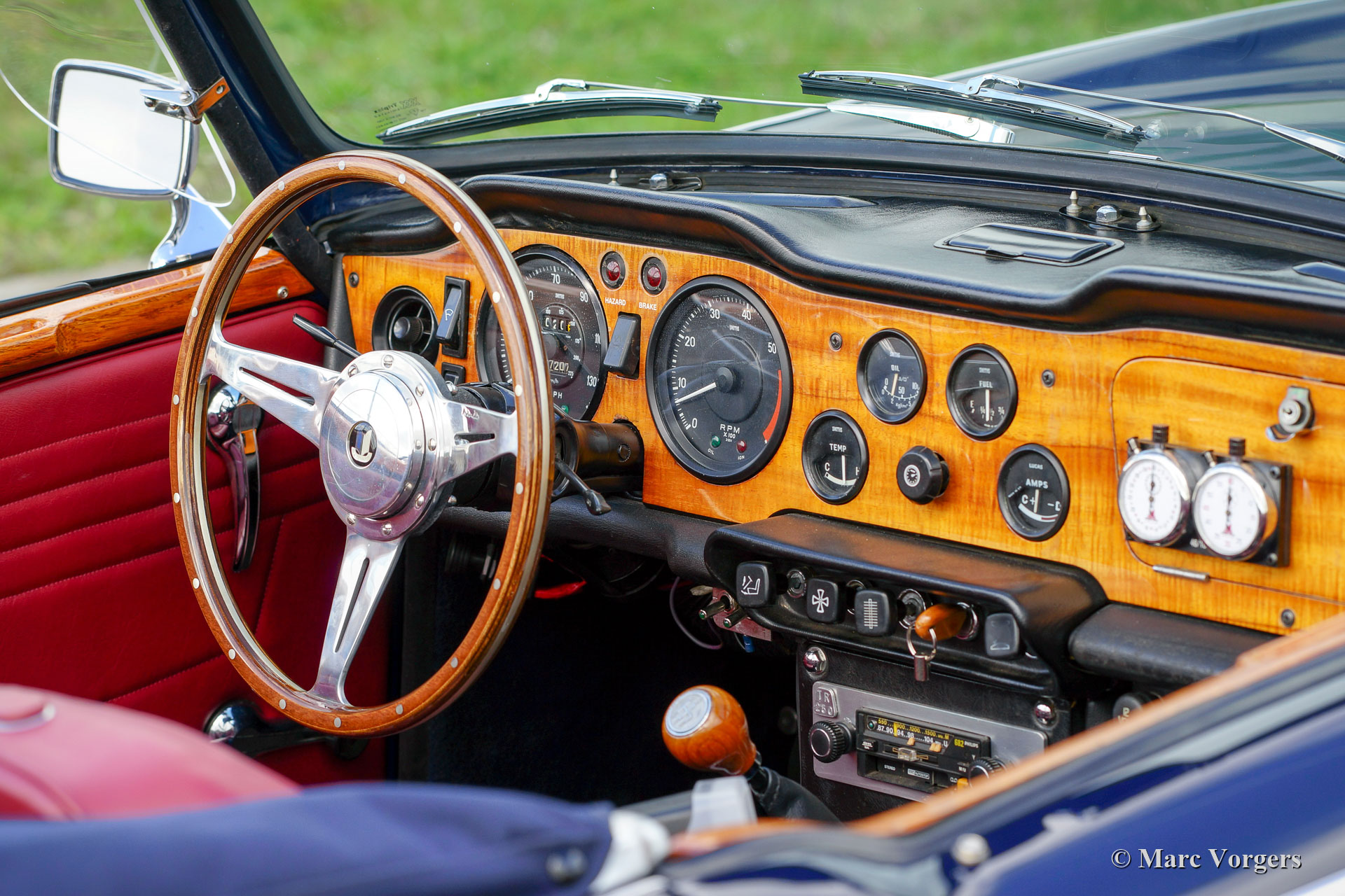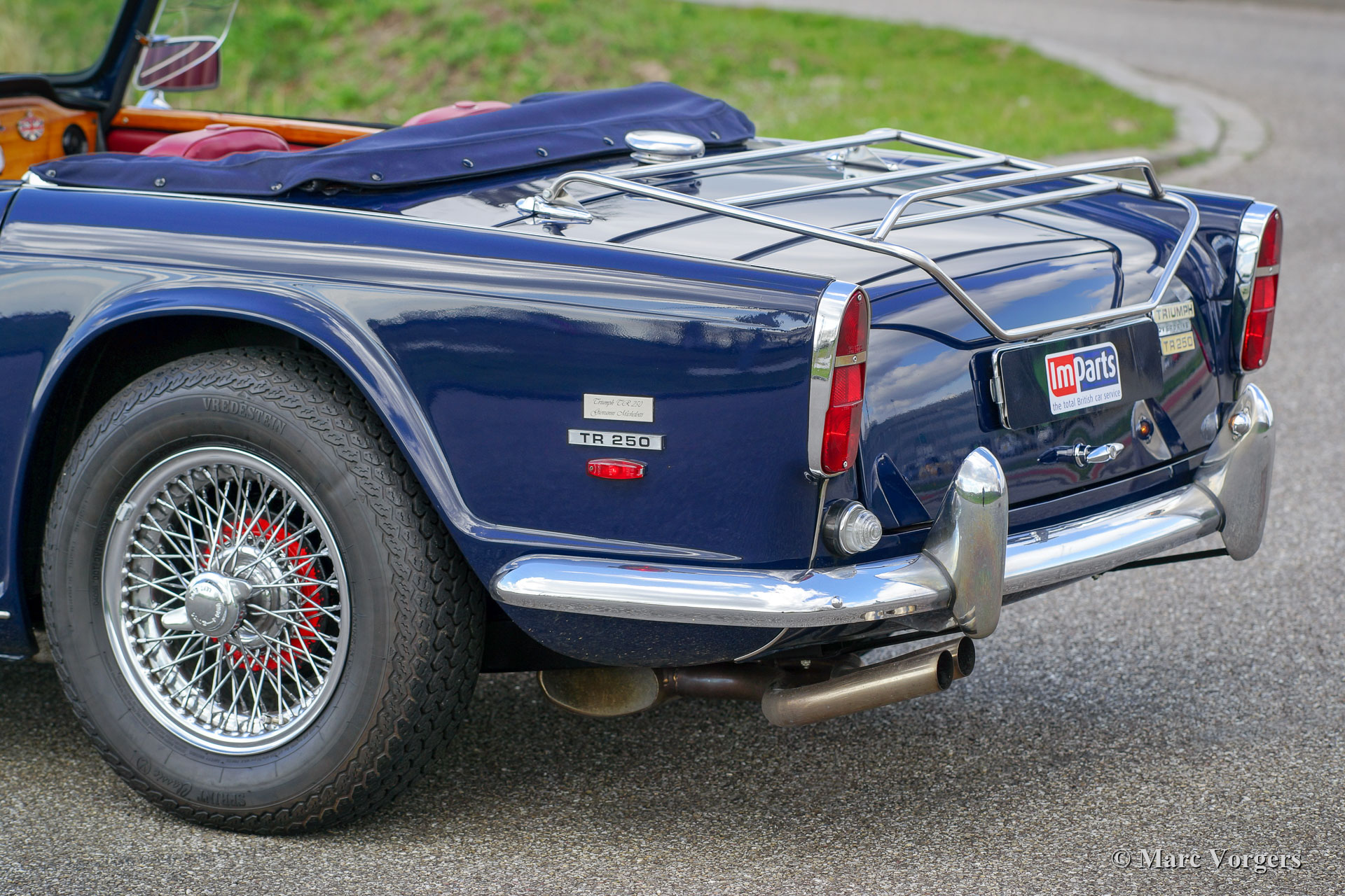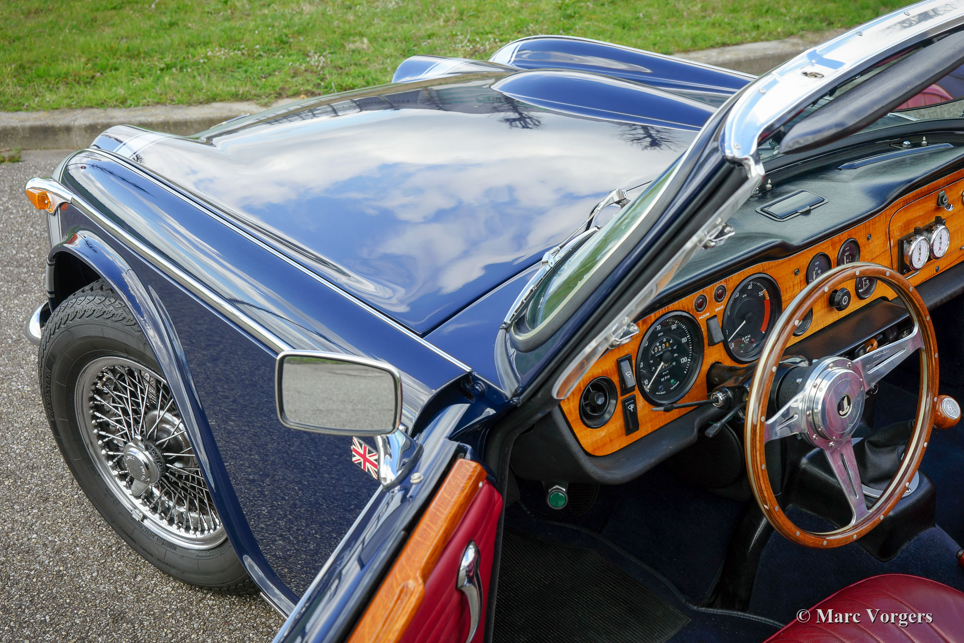 Triumph TR 250, year 1967. Colour Royal Blue combined with a Burgundy leather interior and dark blue carpet. Black mohair soft-top and a dark blue hood-cover. This fabulous and quite rare Triumph TR 250 was restored in the past. This TR 250 is in excellent to superb condition and the car drives perfectly! The engine was overhauled and modified to run on lead-free petrol. The car was fitted with new S.U. carburettors, K&N sports air-filtres and a more powerful brake servo. Furthermore, this gorgeous TR 250 features OVERDRIVE, 5,5J chrome wire wheels shod with 185-15 Vredestein tyres, a Stainless-Steel exhaust system, a chrome luggage rack, Lucas LR6 / FT6 chrome spot- and fog-lamps at the front, two chrome rear view mirrors and the characteristic TR250 silver-grey ‘go-faster’ striping on the bonnet. This is a highly desirable example in excellent condition!