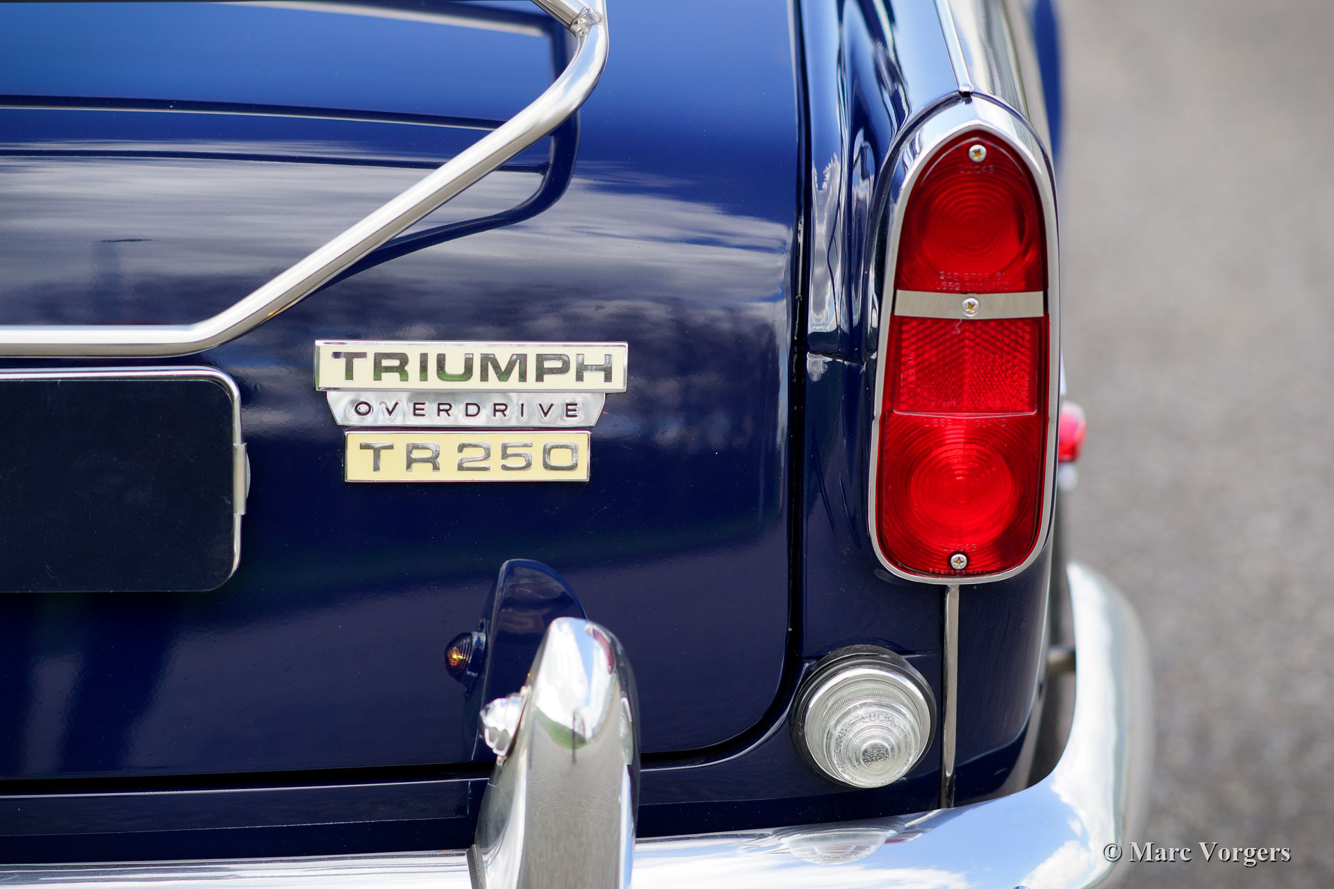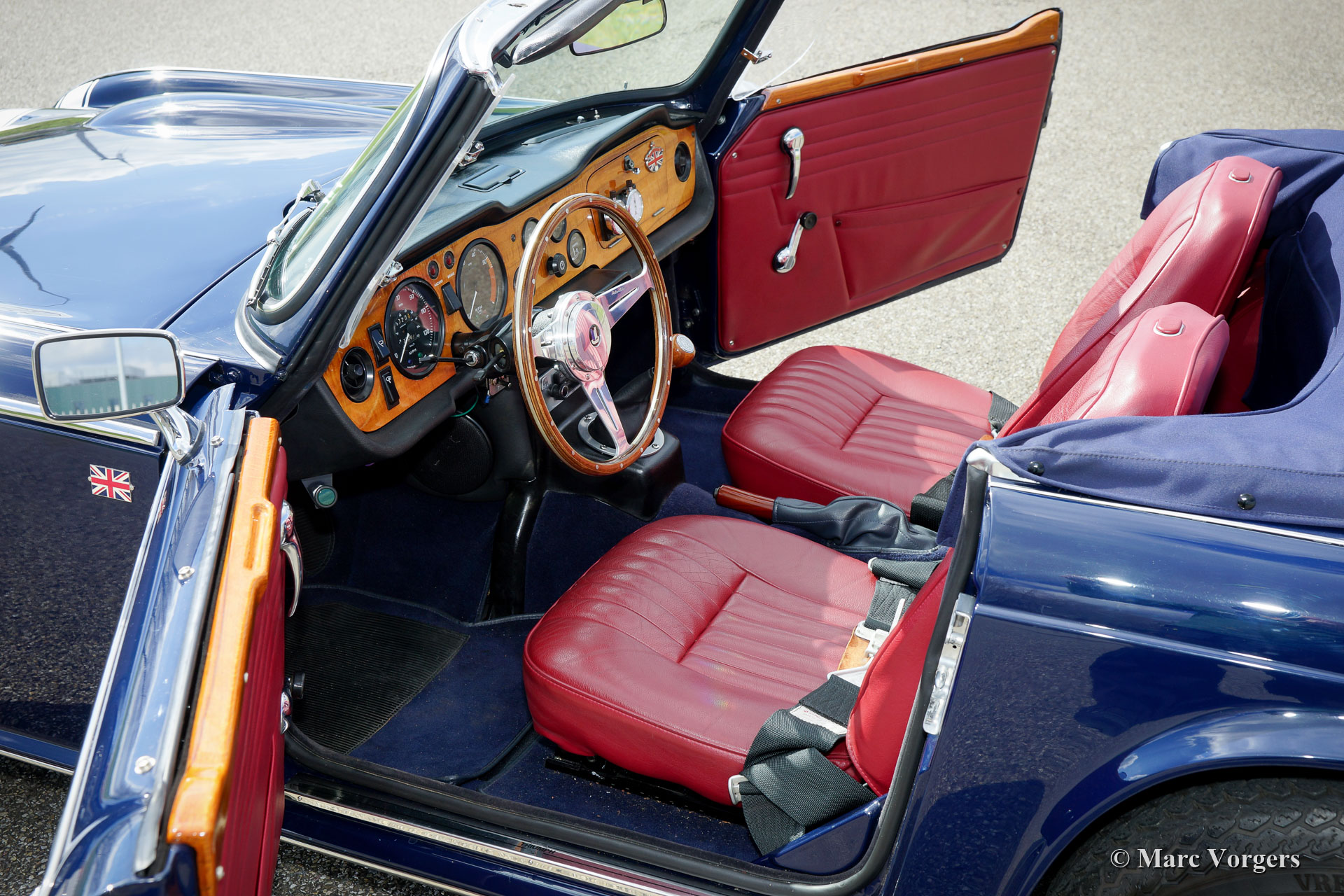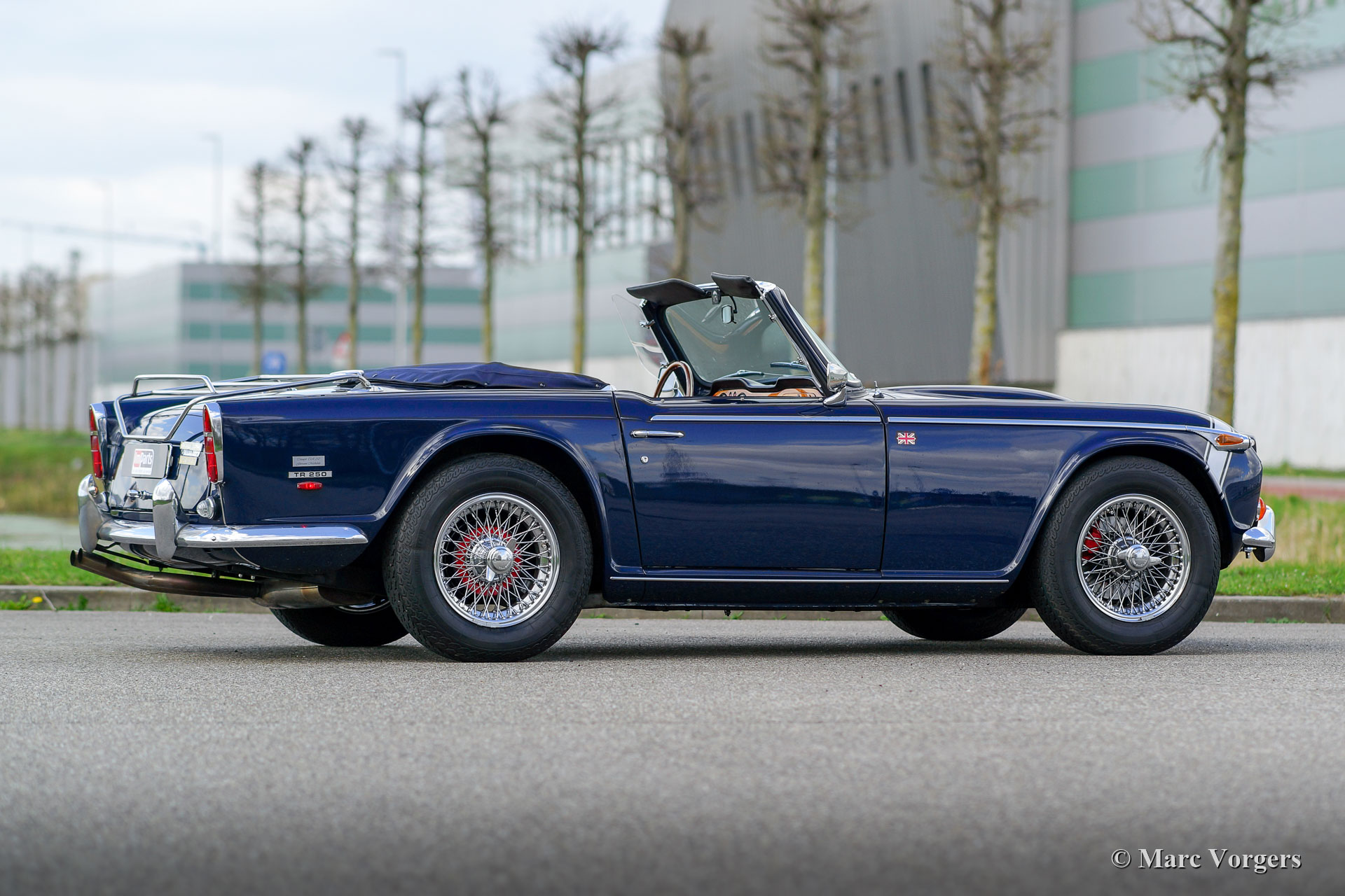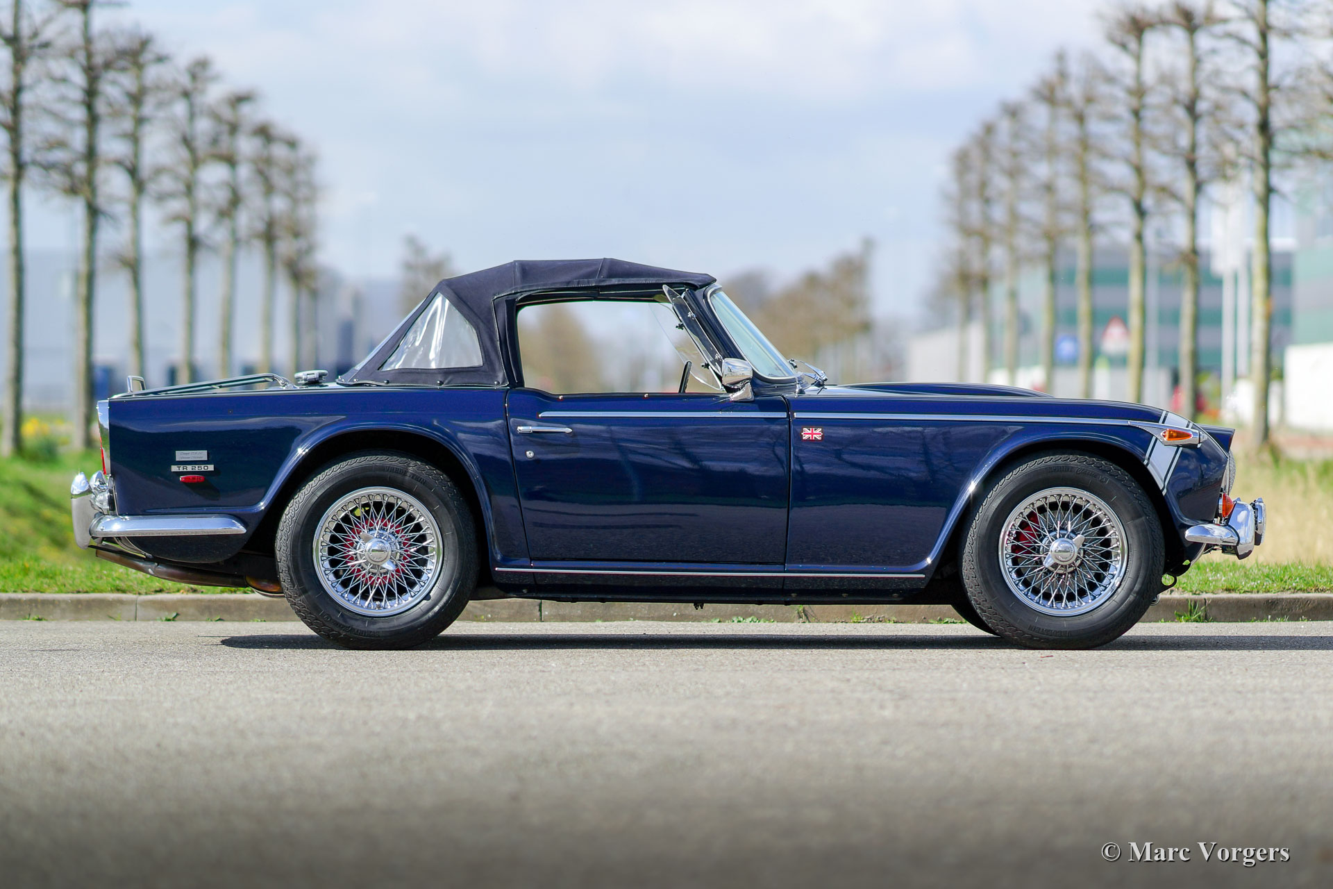 Triumph TR 250, year 1967. Colour Royal Blue combined with a Burgundy leather interior and dark blue carpet. Black mohair soft-top and a dark blue hood-cover. This fabulous and quite rare Triumph TR 250 was restored in the past. This TR 250 is in excellent to superb condition and the car drives perfectly! The engine was overhauled and modified to run on lead-free petrol. The car was fitted with new S.U. carburettors, K&N sports air-filtres and a more powerful brake servo. Furthermore, this gorgeous TR 250 features OVERDRIVE, 5,5J chrome wire wheels shod with 185-15 Vredestein tyres, a Stainless-Steel exhaust system, a chrome luggage rack, Lucas LR6 / FT6 chrome spot- and fog-lamps at the front, two chrome rear view mirrors and the characteristic TR250 silver-grey ‘go-faster’ striping on the bonnet. This is a highly desirable example in excellent condition!