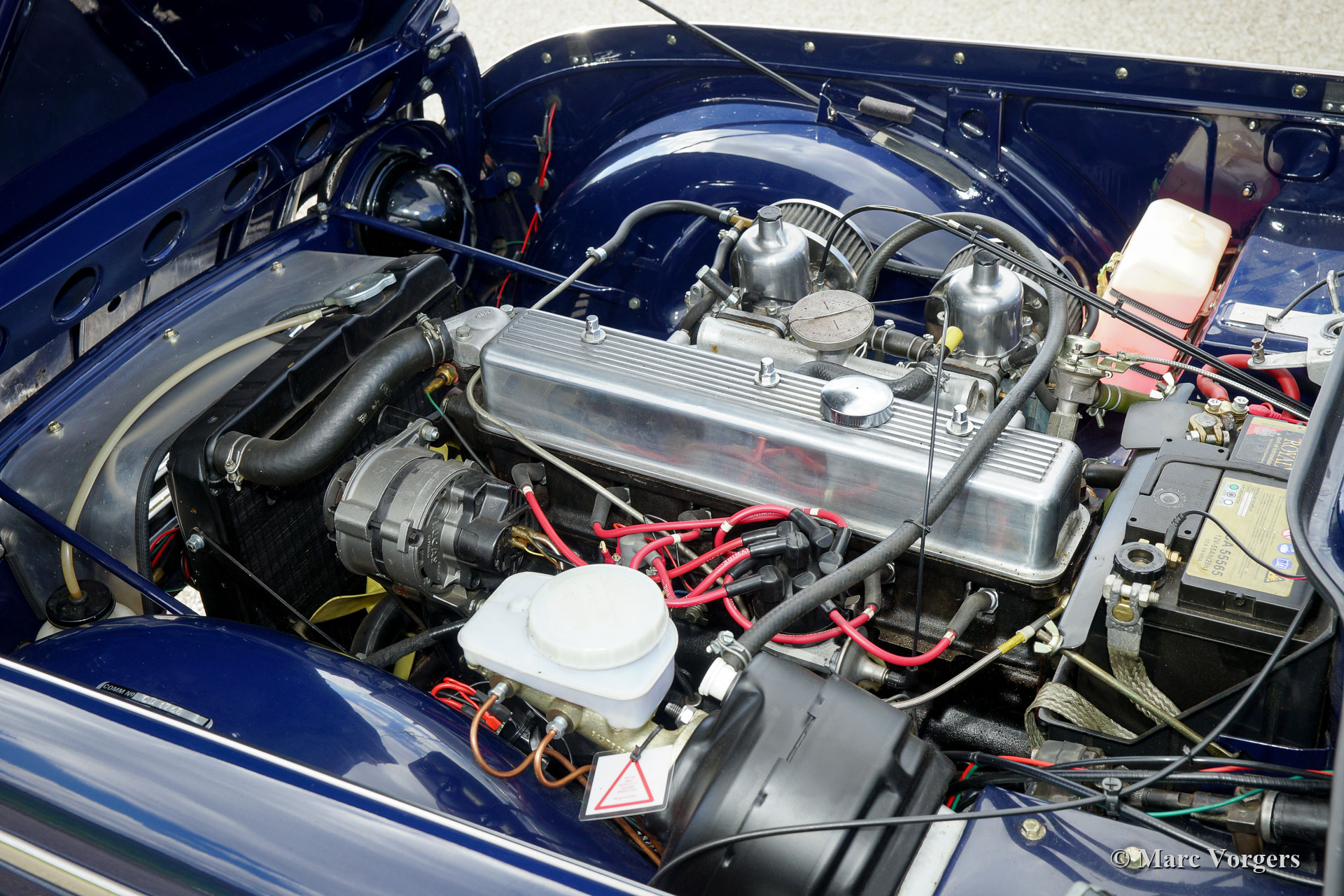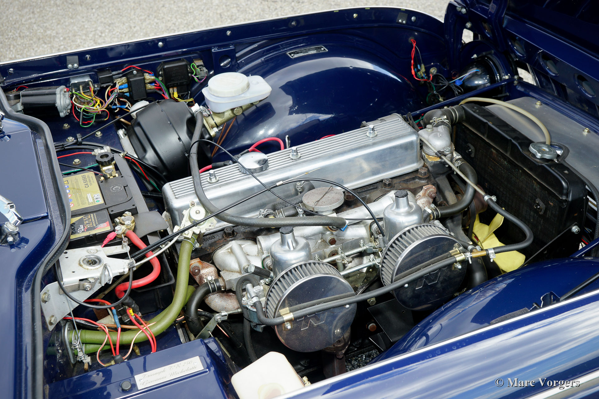 The six cylinder engine originally came from the Triumph 2000 saloon. For use in the TR 5/ TR 250 Triumph enlarged the cylinder capacity up to 2498 cc., fitted a more racy camshaft and petrol injection. Result was that they gained 60 bhp. (TR5) to the standard engine, enough for the engine to be used in a sports car like the TR 5/ TR 250.