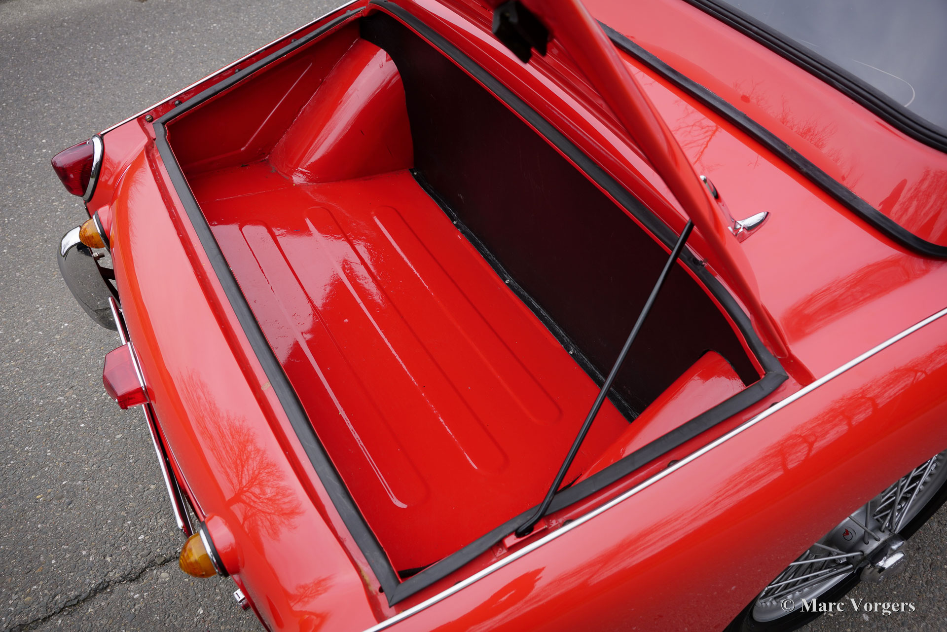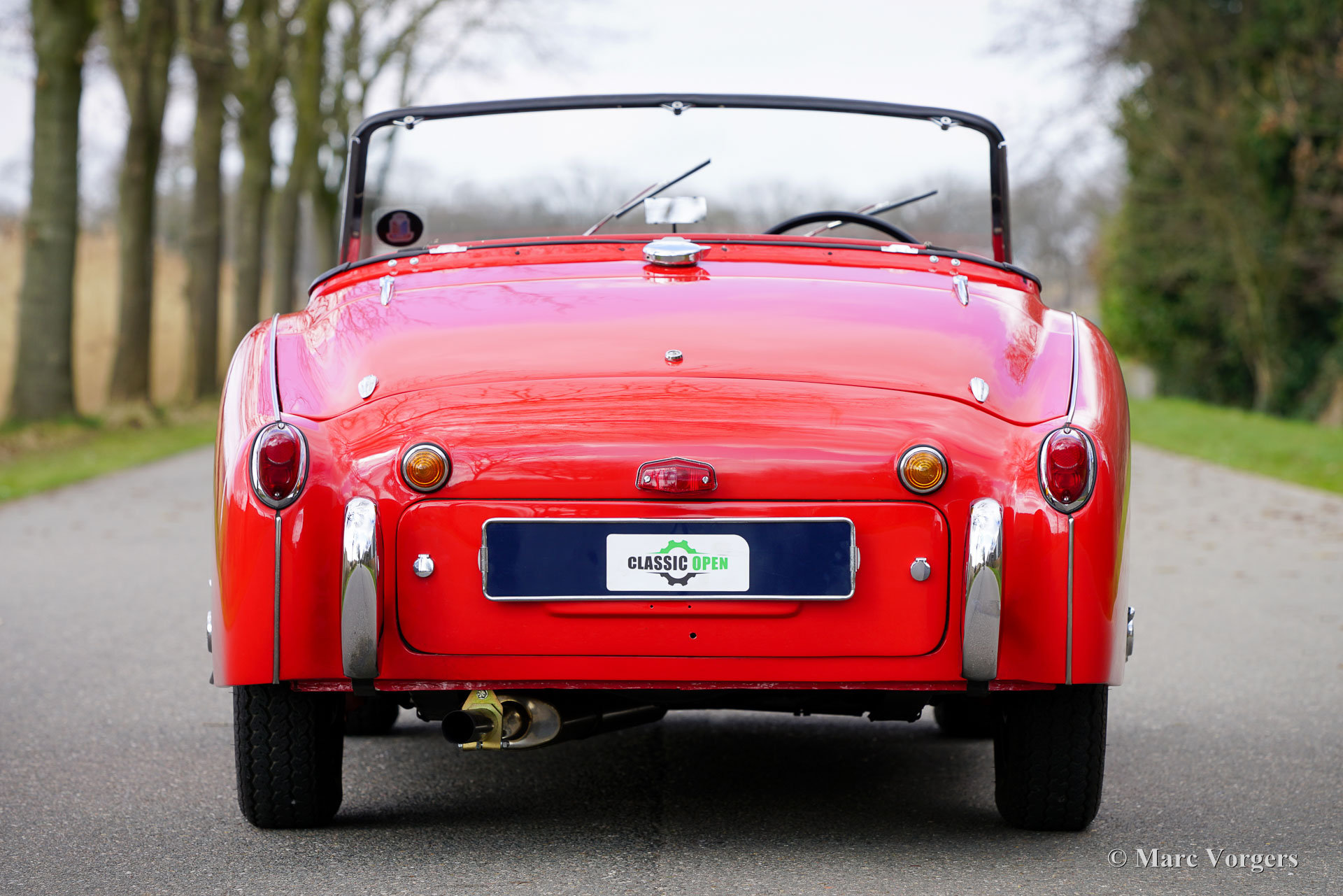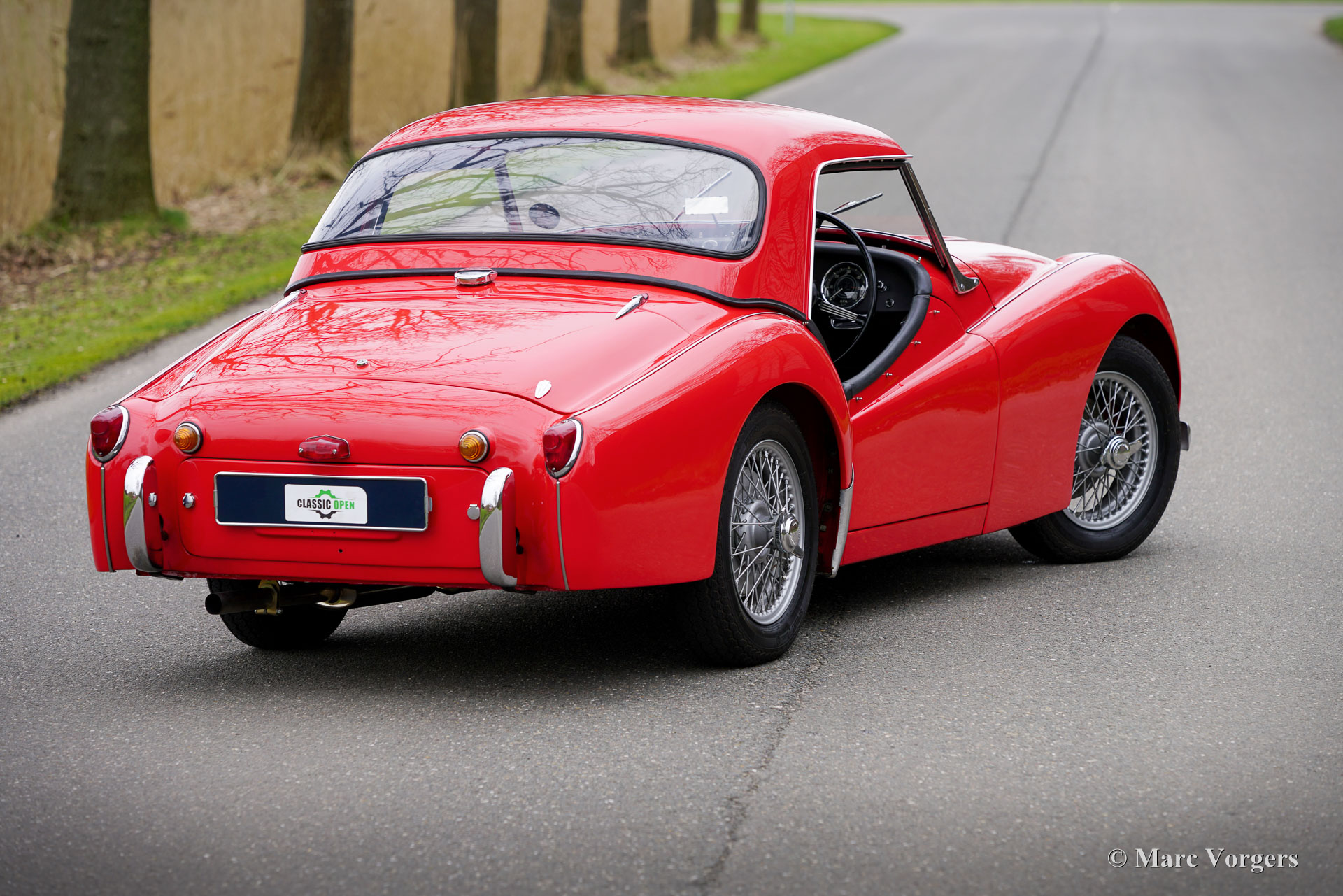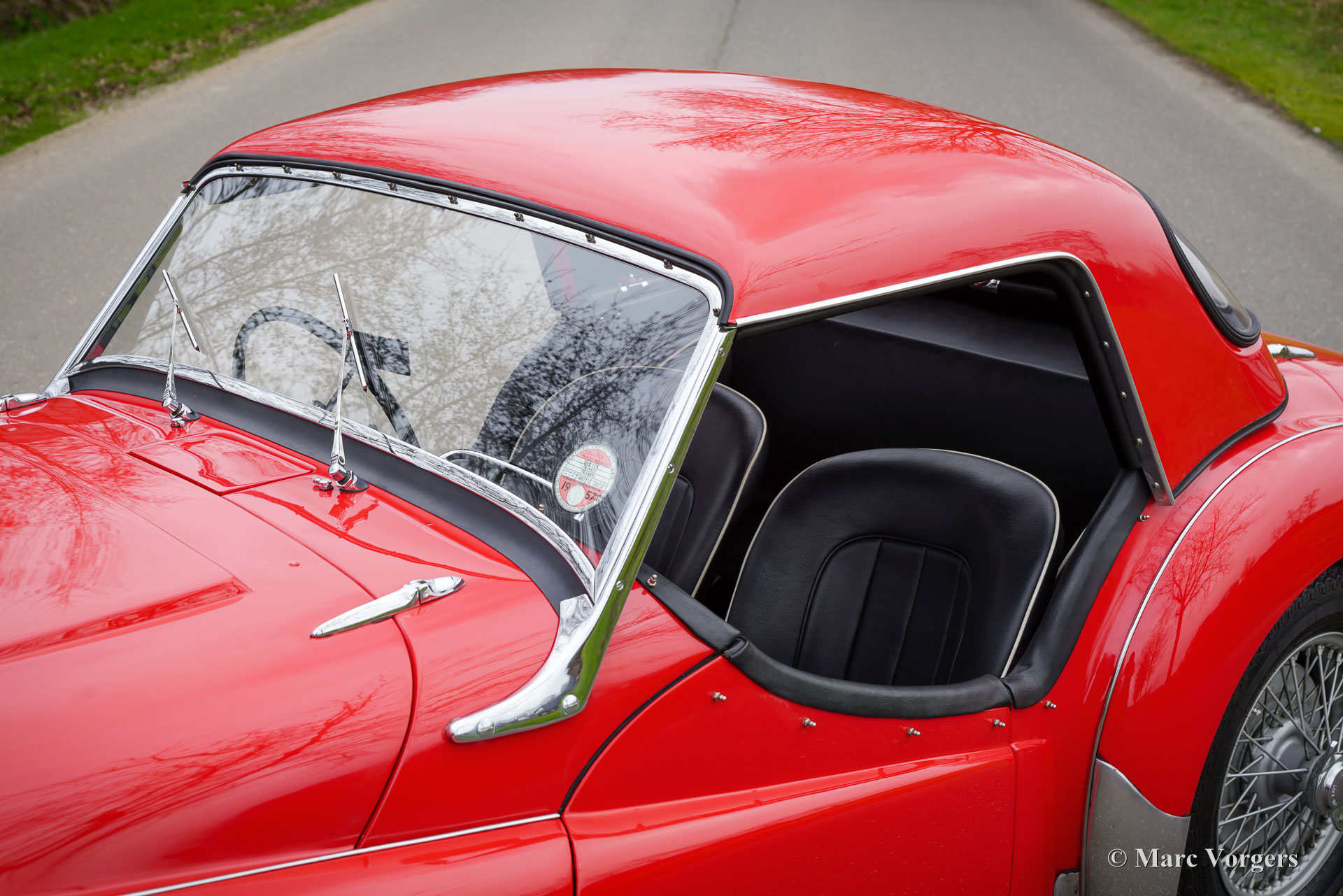 Triumph TR 3, year 1957. Colour red combined with a black leathercloth interior trimmed with white piping and black carpet. This wonderful TR 3 comes with an original hard top in body colour. A black vinyl soft top is also present. This stunning Triumph TR 3 was sold new in the UK where the car was extensively and perfectly ‘body-off’ restored in recent years. This right-hand drive TR 3 was imported to the Netherlands in November 2024, but not yet registered for road use. All the important UK and import papers are present, this sports car can be sold to and registered in any country. The wonderful professional restoration is fully documented. This TR 3 is one of the best you will find; this example is in a superb top condition (concours)! In 1956 the Triumph TR 3 was the first production car presented with disc brakes on the front wheels made by Girling. This wonderful TR 3 shows all the original details, and the car comes with a hard to find original hard top! A complete soft top comes with the car, ready to be exchanged for open top driving. The overhauled two-litre four-cylinder engine runs and sounds perfectly, and the four-speed gearbox shifts snappy and precise. The car is fitted with silver enamelled wire wheels. Furthermore, this TR 3 features period correct accessories like auxiliary Lucas wide beam cornering/fog lamps with black vinyl covers at the front, a badge bar, and a Butlers map reading light on the dashboard. Photos of the clean underside are available on request. The Triumph TR 3 is an important British sportscar which was very successful in international rally and racing competitions! Step in the footsteps of the heroes of the 1960s experiencing classic driving in its purest form!