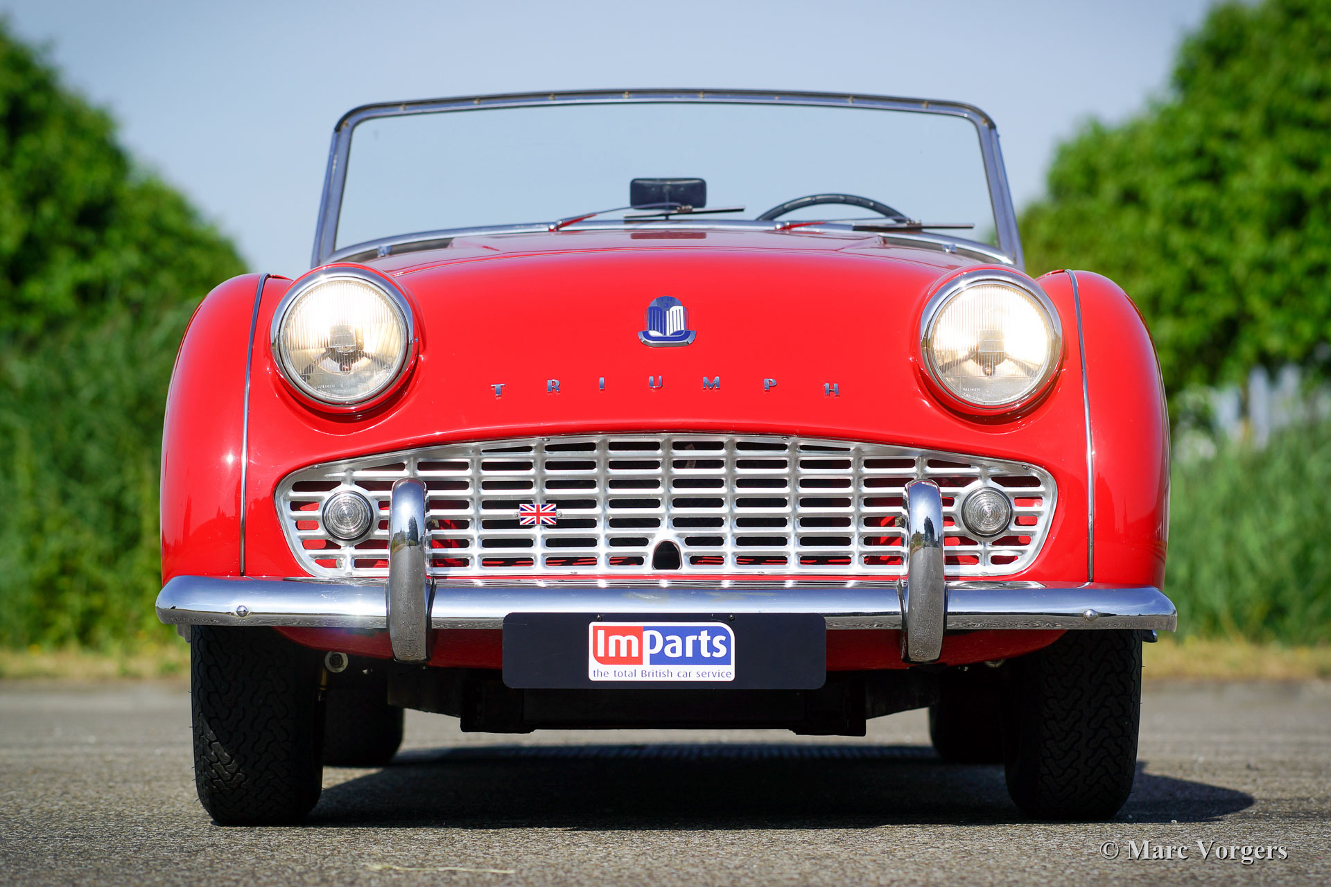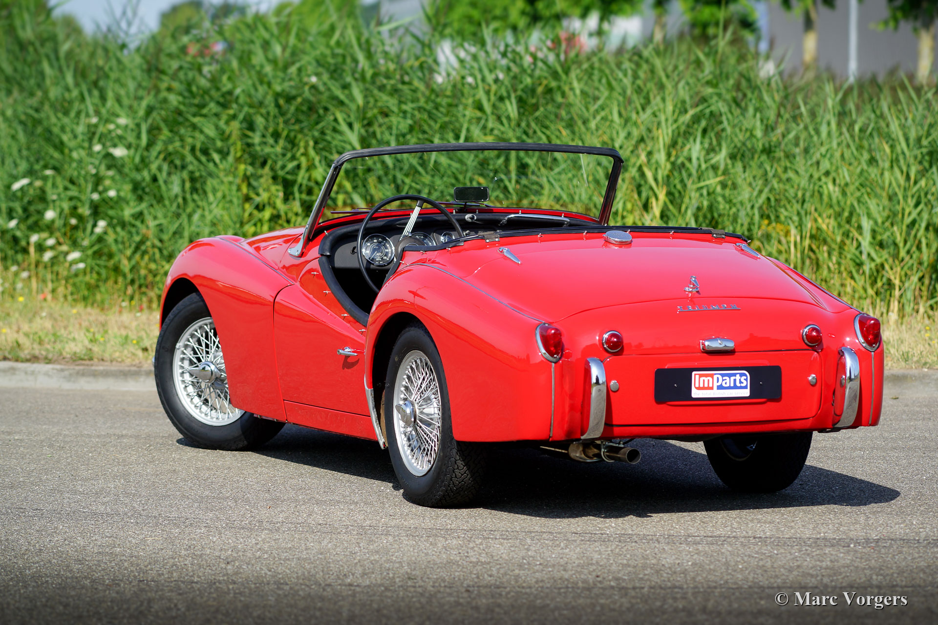 The Triumph TR 3 was uprated twice during the entire production period. In 1957 the car became a wider grille, door handles on the outside and slightly recessed headlamps and was named TR 3a then. In 1960-61 the cylinder capacity was enlarged to 2138 cc. giving a capacity of 104 bhp. and extra torque. Also the fully synchronized TR4 gearbox was incorporated. The car was then named TR 3b. The TR 3 is a pure two-person roadster, a classic generously giving you the fifties British sports car feeling, rough but honest. It comes with a simple soft-top for weather protection. Separate clip-on side screens can additionally be attached to the doors.