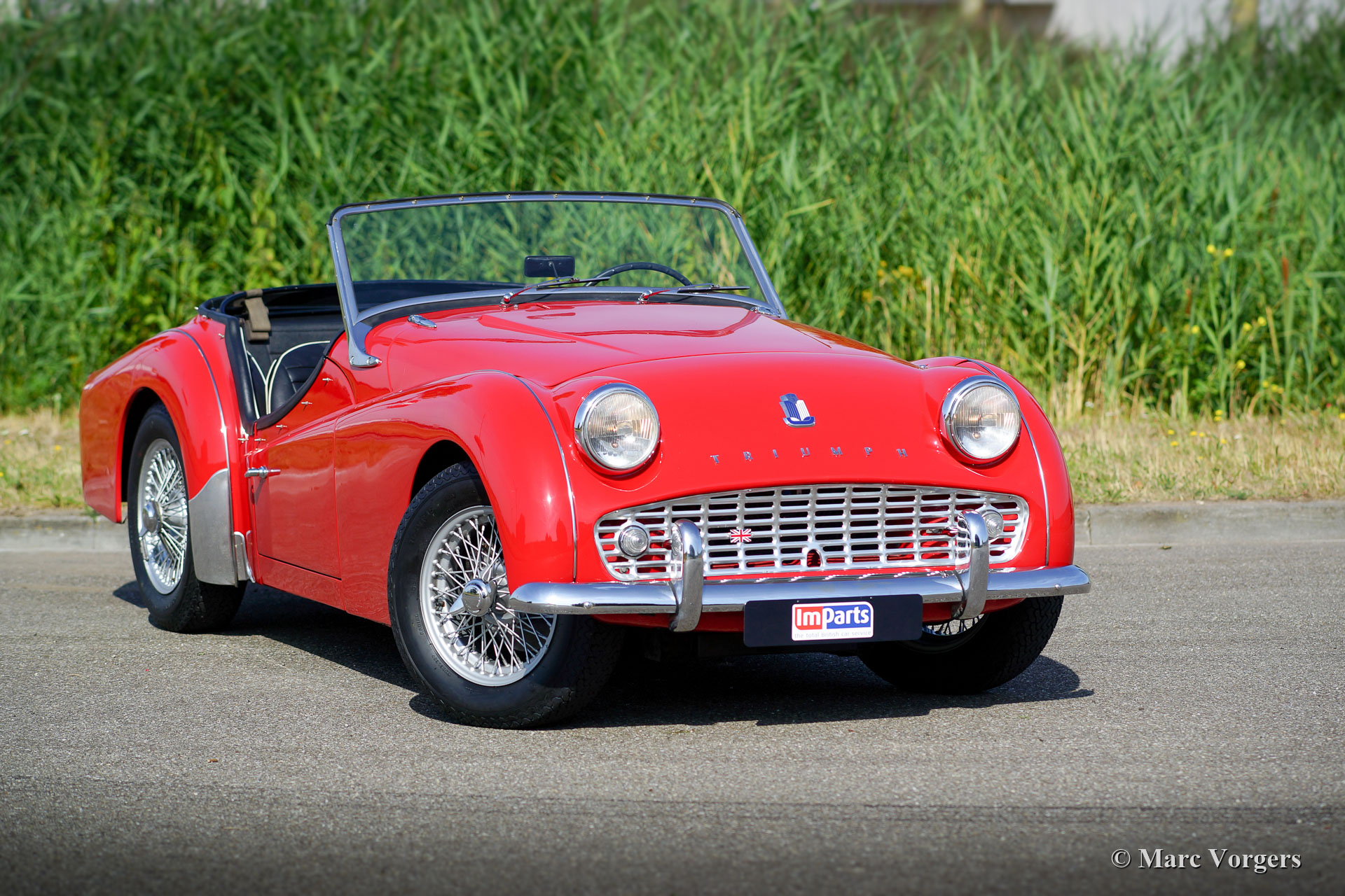 Triumph TR 3A, year 1959. Colour red with a black leatherette interior and black carpet. Black vinyl soft-top and side-screens. This gorgeous Triumph TR 3A is in excellent condition. The car has been serviced and maintained beautifully through the years. Recently a Stainless-Steel exhaust was fitted and the wire wheels were shod with new Blockley tyres. This TR 3A shows all the original details and it is fitted with an after-market wood shift knob and an electric cooling fan. This Triumph TR 3A is currently registered in Belgium. A desirable example!