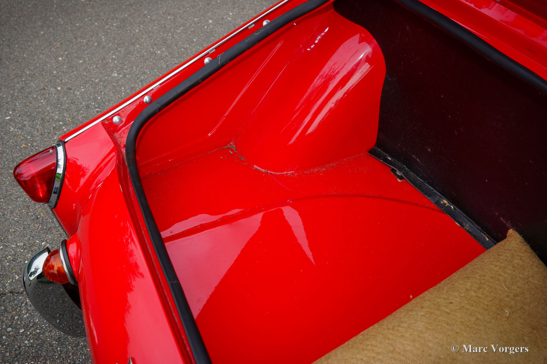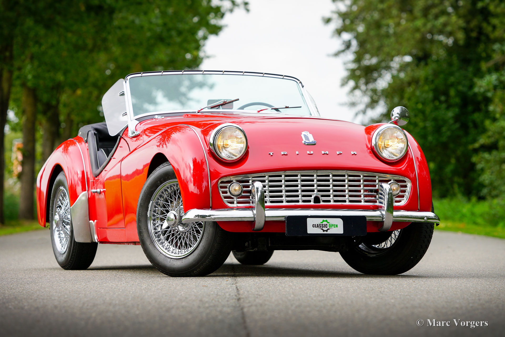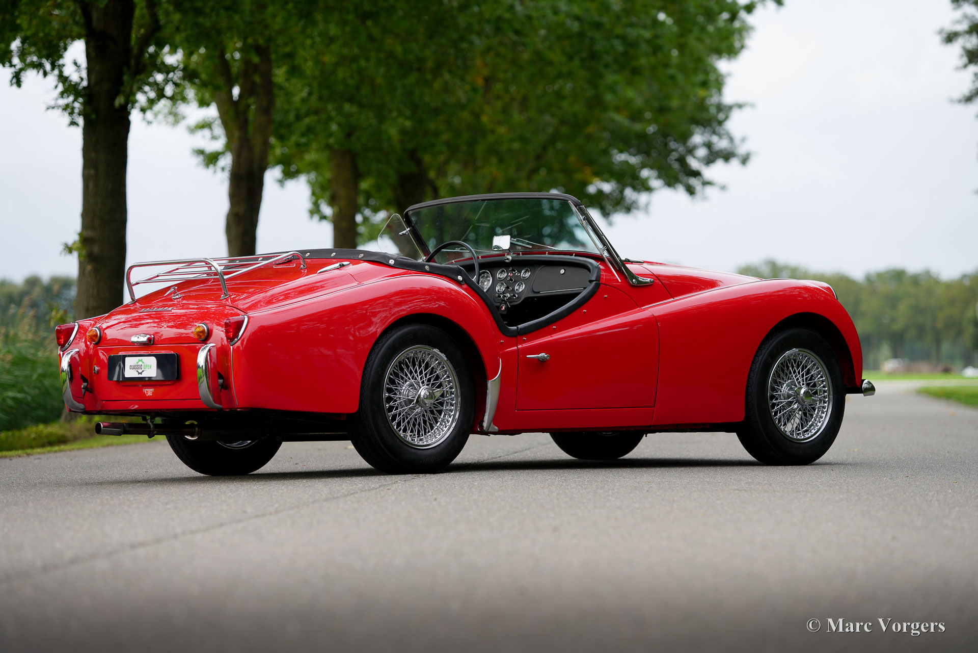 Triumph TR 3A, year 1960. Colour red combined with a black leather interior trimmed with white piping and black carpet. Black soft-top. This gorgeous Triumph TR 3A was sold new in the USA, and first registered on 30 June 1960. In 1998 the automobile was imported to the Netherlands and subsequently ‘body-off’ restored. Now, almost 25 years later this Triumph TR 3A is still in a very good to excellent condition. The bodywork, paint, and chrome are in excellent condition, the interior and the boot show minimal traces of previous use. The car was very well serviced and maintained and the car drives perfectly. The rugged 100 bhp four-cylinder engine is very powerful, and it gives the driver sporty classic driving experience. In the 1950s and early 1960s the Triumph TR series was very successful in the rally- and racing sport. The interiors of the Triumph TR 2 and TR 3 cars give the most ‘open’ feeling of any car in existence with their low door edges. This fine example is with the last owner since 2017, the car comes with a comprehensive history and service file. This Triumph TR 3A shows all the wonderful original details and is fitted with chrome wire wheels and a chrome baggage rack. A red TR 3A is a real ‘head turner’ which will gather a much attention on the road!