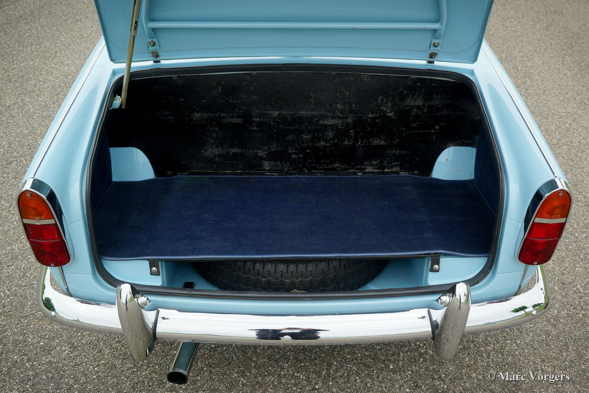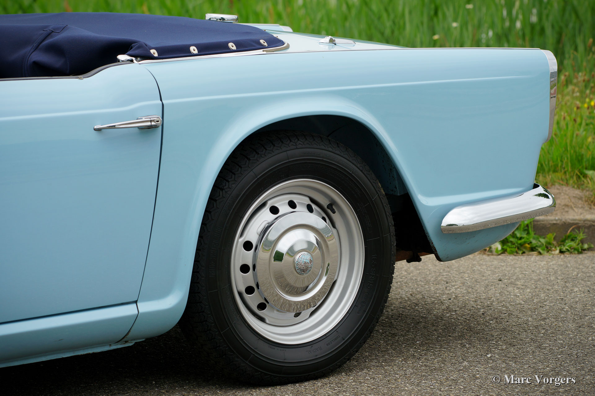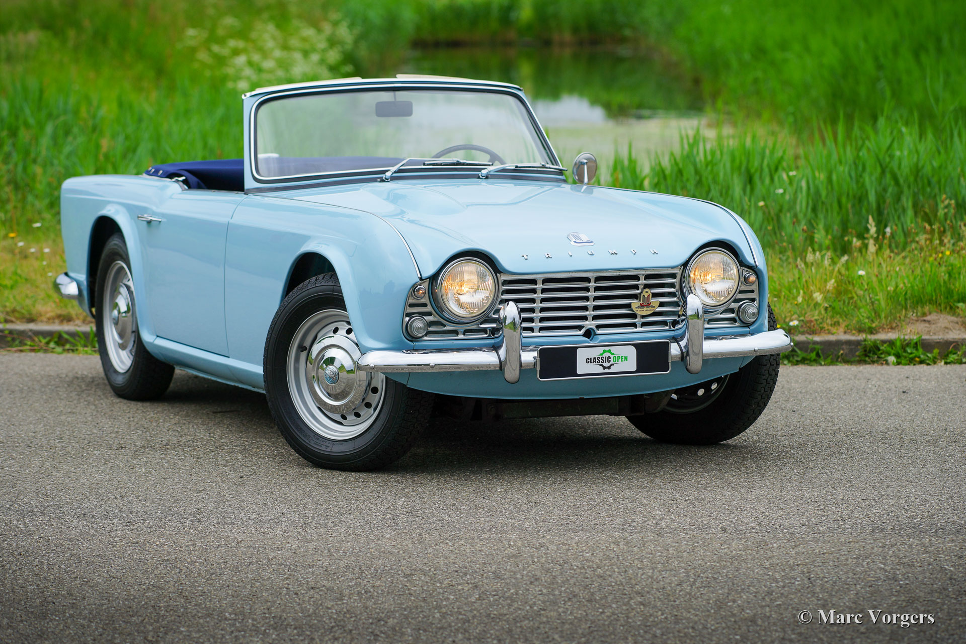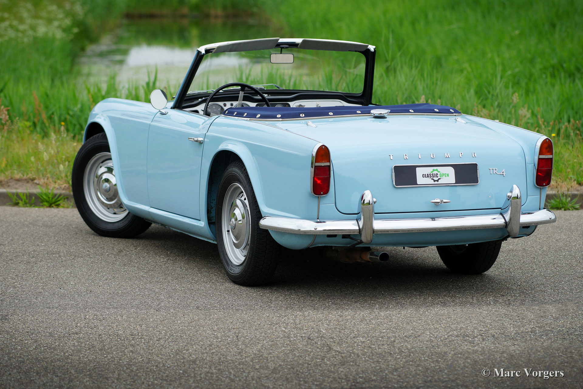 Triumph TR 4, year 1963. Colour Wedgwood Blue combined with a dark blue leather interior trimmed with white piping and blue carpet. Blue tonneau-cover and a black soft-top. This gorgeous Triumph TR 4 was extensively restored twenty years ago, the automobile is in a very good and wonderful condition! A photo report of the restoration is present. This TR 4 shows all the original details of the early models like the wonderful white metal dashboard, the steel disc wheels with chrome hubcaps and the original steering wheel. The exterior design was drawn by the Italian star designer Michelotti. The TR 4 combines the character of the true British sports car with a refined Italian style. The powerful four-cylinder engine delivers 100 bhp and it runs perfectly. The power is transmitted to the rear wheels via a four-speed gearbox which is fitted with an overdrive. This is a hard-to-find early TR 4 in a very good condition!