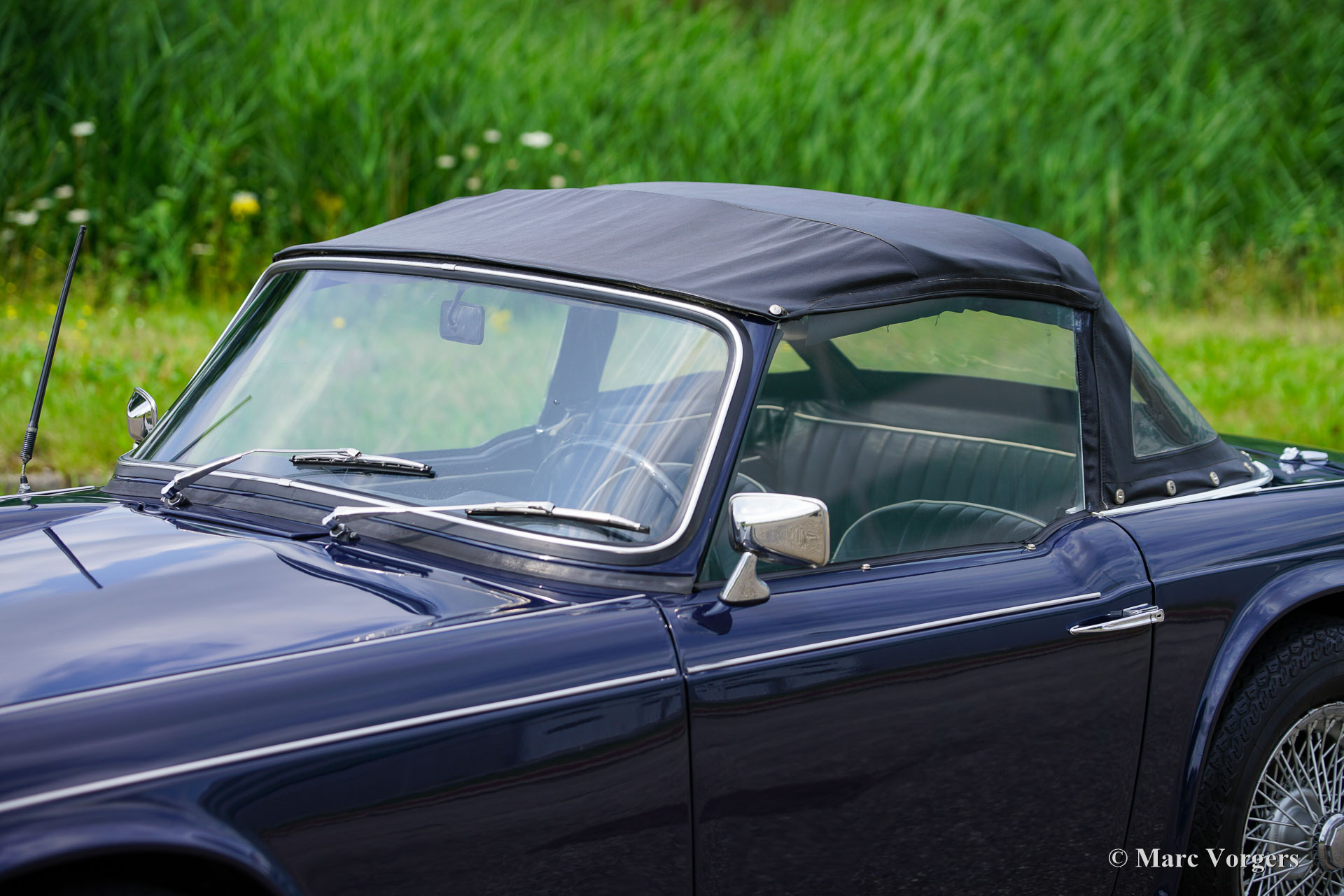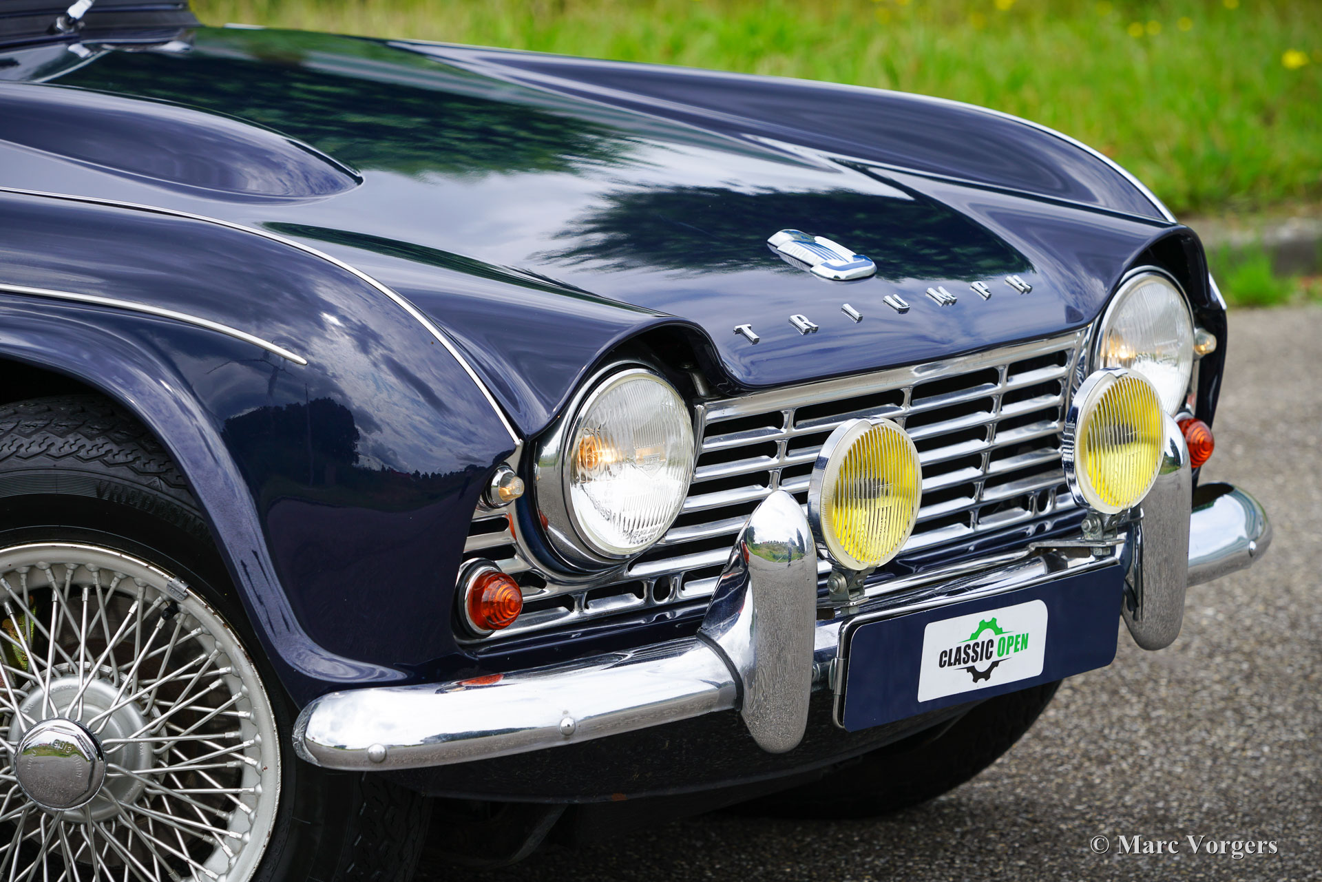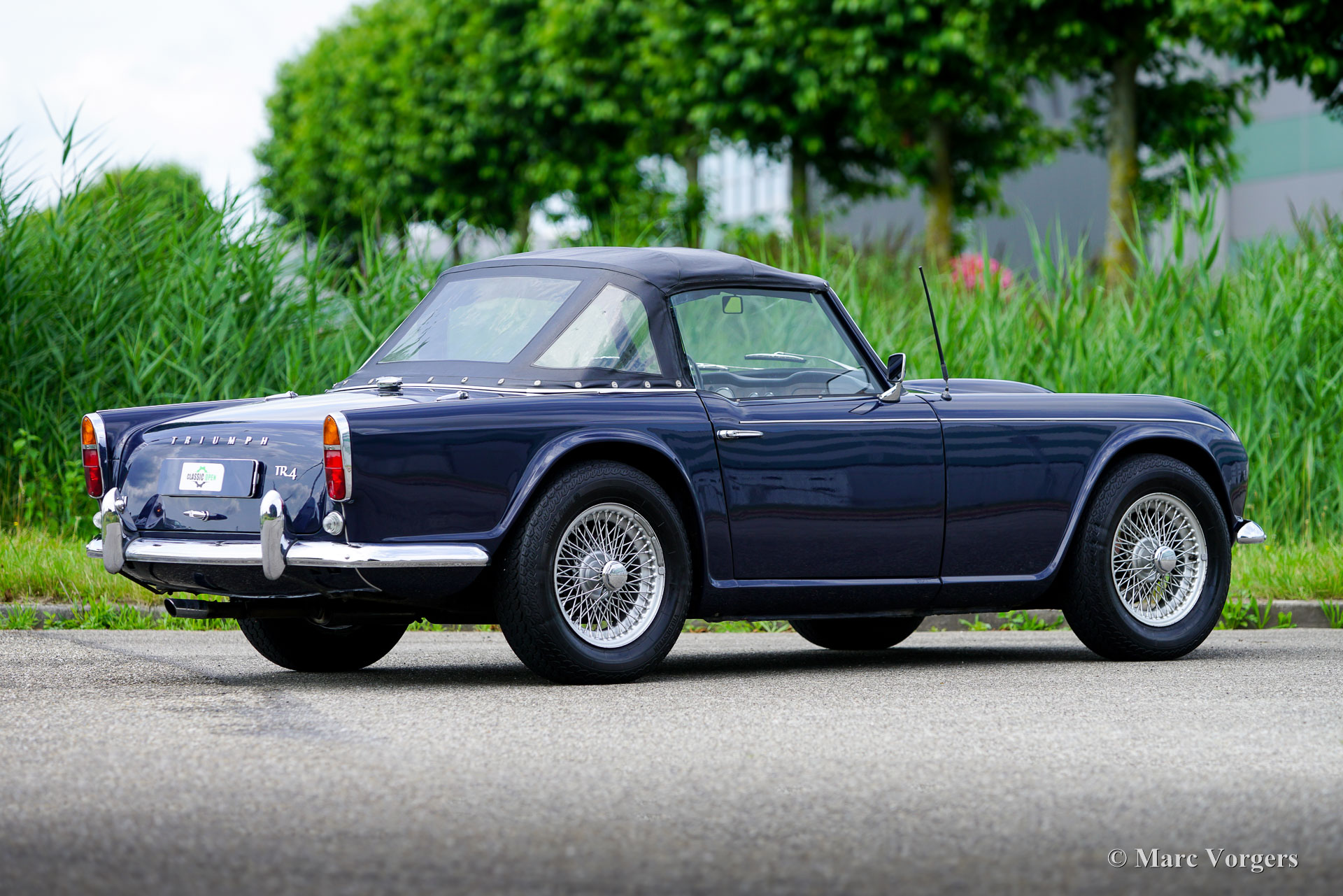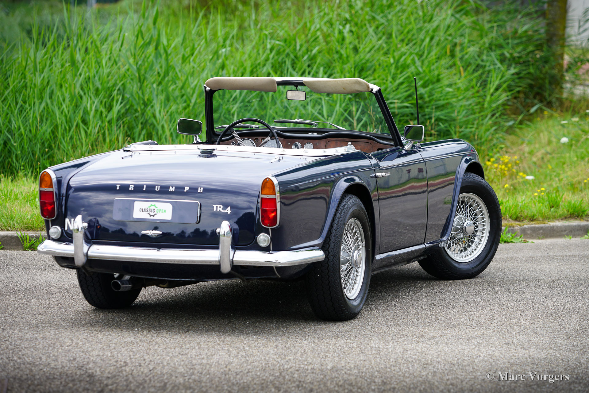 Triumph TR 4, year 1963. Colour dark blue combined with a black leather interior trimmed with white piping and black carpet. Black vinyl soft top. The wonderful Triumph TR 4 was designed by the Italian master designer Michelotti. The TR 4 is an example of 1960s style, and sporty driving fun. The TR 4 was as a sports car also very successful in racing and rally competitions. This example comes from a long time Dutch owner who has owned and cherished the car since 1979! Over these 45 years the car was part of many happy moments. The car is in a very good condition, and it was serviced well. The car shows light to normal signs of careful long-time use and absolutely no rust. The 2138 cc four-cylinder engine runs beautifully and the four speed gearbox with overdrive shifts as it should. This TR 4 shows wonderful original details and is finished in the popular colours dark blue with black. The wood dashboard with many gauges, and the original steering wheel give a sporty classic feel. This wonderful TR 4 features silver wire wheels shod with Vredestein Sprint Classic tyres, Hella fog/cornering lamps at the front, and an air-horn. This is a wonderful Triumph TR 4 showing all the original details in very good condition!