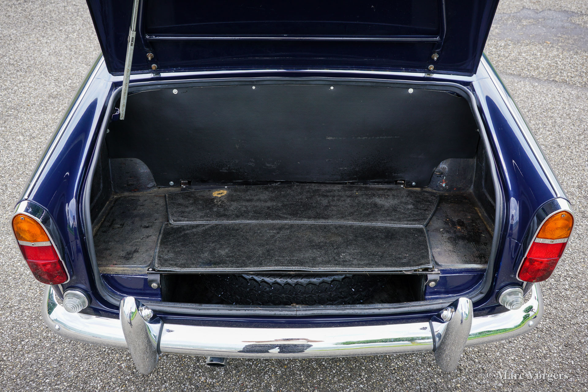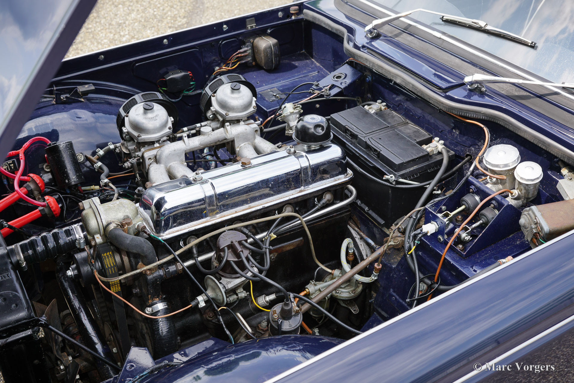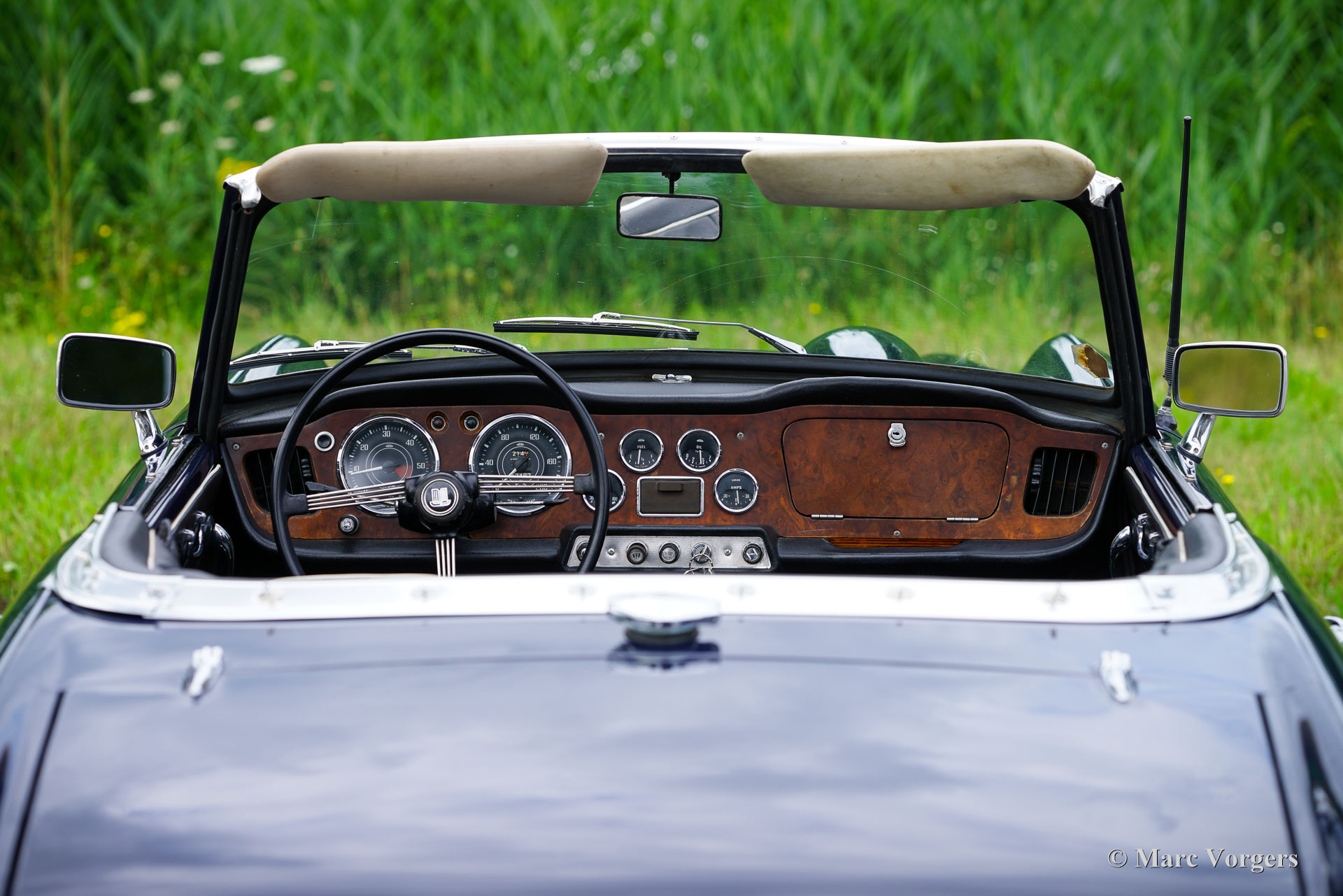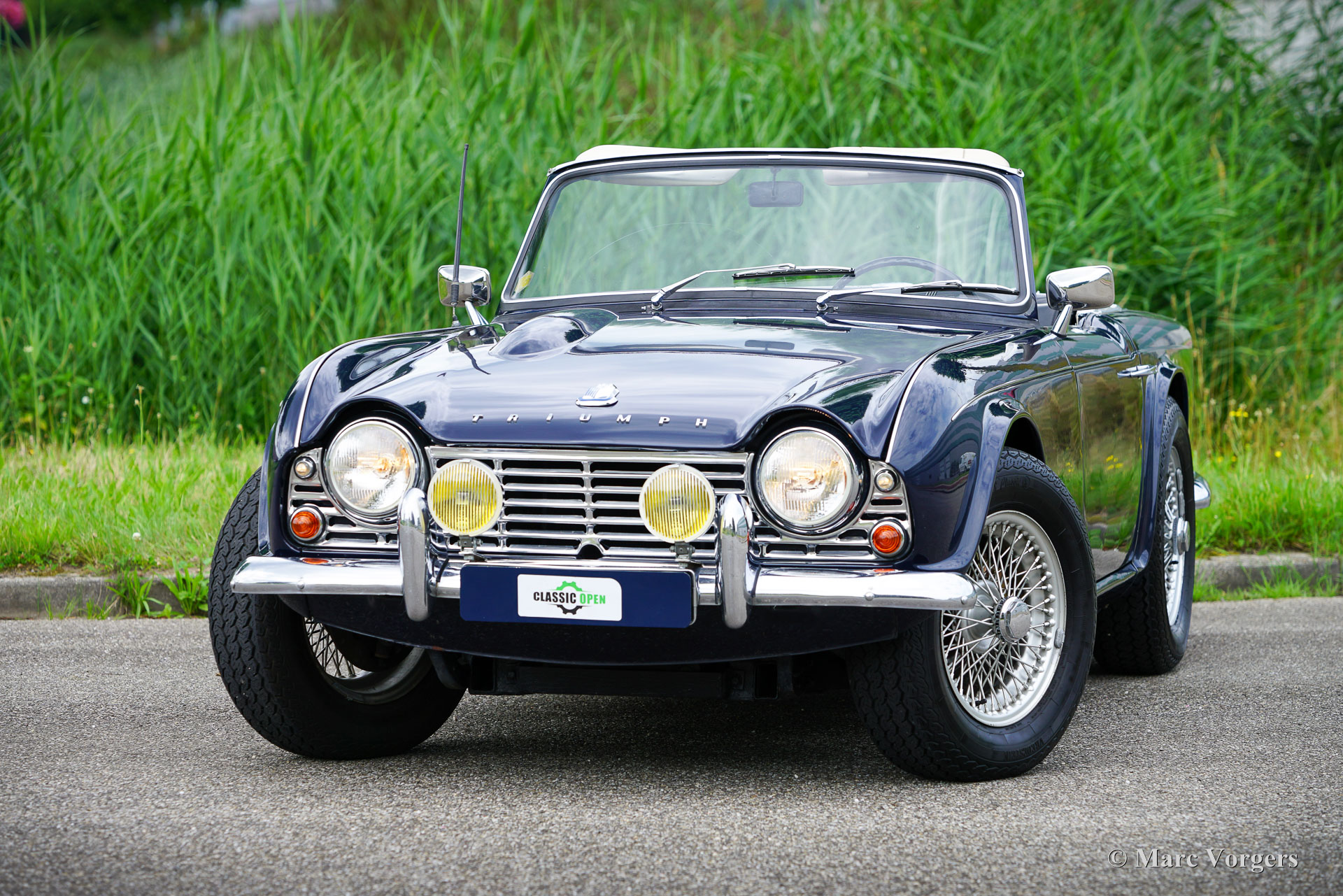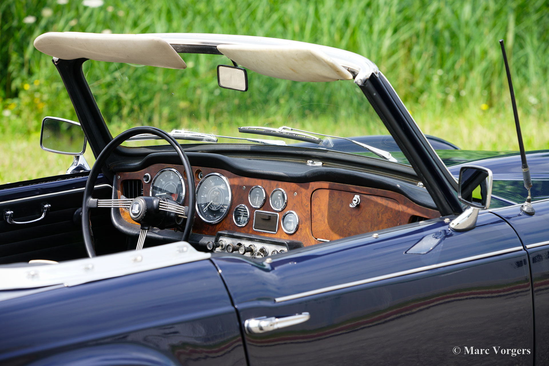 Triumph TR 4, year 1963. Colour dark blue combined with a black leather interior trimmed with white piping and black carpet. Black vinyl soft top. The wonderful Triumph TR 4 was designed by the Italian master designer Michelotti. The TR 4 is an example of 1960s style, and sporty driving fun. The TR 4 was as a sports car also very successful in racing and rally competitions. This example comes from a long time Dutch owner who has owned and cherished the car since 1979! Over these 45 years the car was part of many happy moments. The car is in a very good condition, and it was serviced well. The car shows light to normal signs of careful long-time use and absolutely no rust. The 2138 cc four-cylinder engine runs beautifully and the four speed gearbox with overdrive shifts as it should. This TR 4 shows wonderful original details and is finished in the popular colours dark blue with black. The wood dashboard with many gauges, and the original steering wheel give a sporty classic feel. This wonderful TR 4 features silver wire wheels shod with Vredestein Sprint Classic tyres, Hella fog/cornering lamps at the front, and an air-horn. This is a wonderful Triumph TR 4 showing all the original details in very good condition!