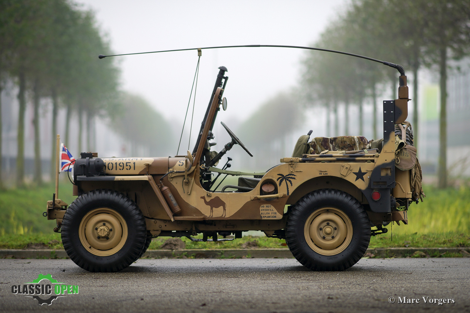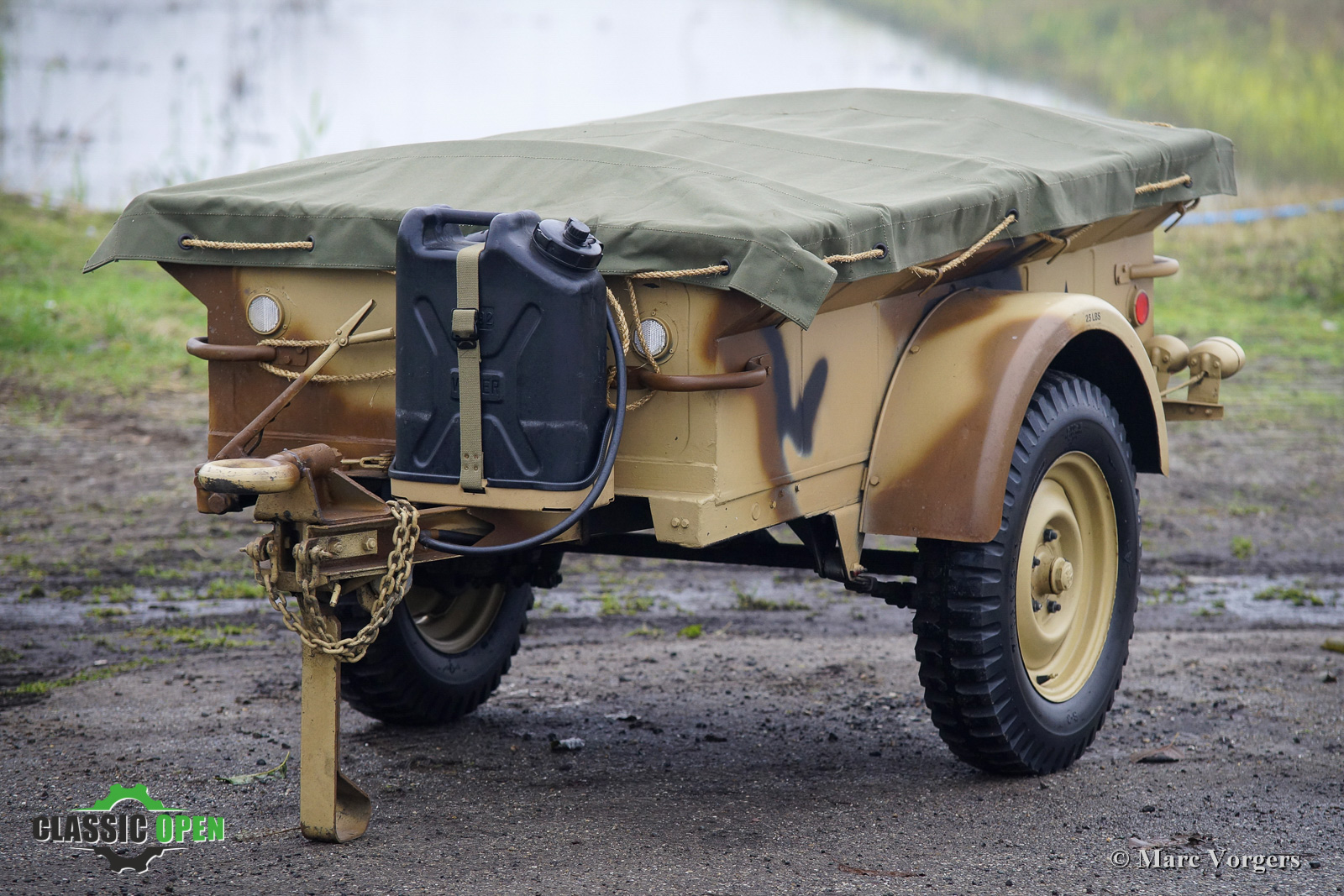 Willys M38 Jeep, year 1951. The car comes with a Polynorm trailer. The car and trailer are finished in beige, brown, black, and green camouflage colours, the interior is matte green. This iconic Jeep model M38 ¼ ton 4x4 Truck is the type which was built for the wars in Korea and Vietnam. The Jeep was imported from the USA in 1992. The car was cherished, and regularly driven, by its last Dutch owner since 2007. This Jeep was very well kept and maintained; an extensive service history file is present. The car drives delightfully, and all the controls operate perfectly. The Jeep comes with many accessories: A deep-water kit, a field radio with long antenna, warn overdrive, a night lamp, a Detroit Arsenal heater with extra windshield demister, and a fold flat windscreen. Included is a Polynorm trailer from the same period, fitted with new tyres and good lighting. This original Willys Jeep M38 is fitted with a 60 bhp Jeep engine. The gearbox is a 3-speed unit with high and low gearing. The electrical system is 24 Volts. This is a very desirable original Willys Jeep in perfectly serviced condition, a great find for the enthusiast!