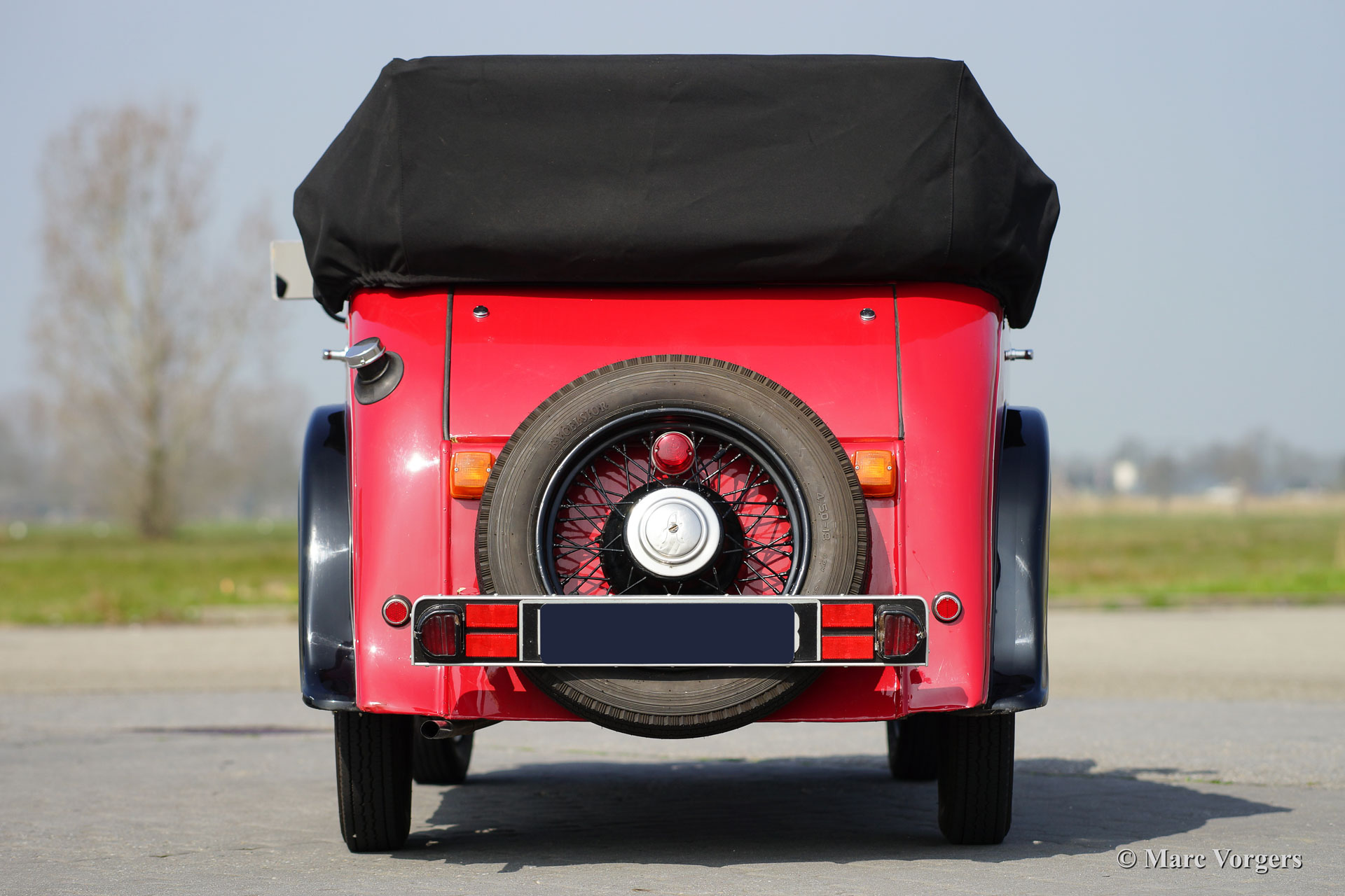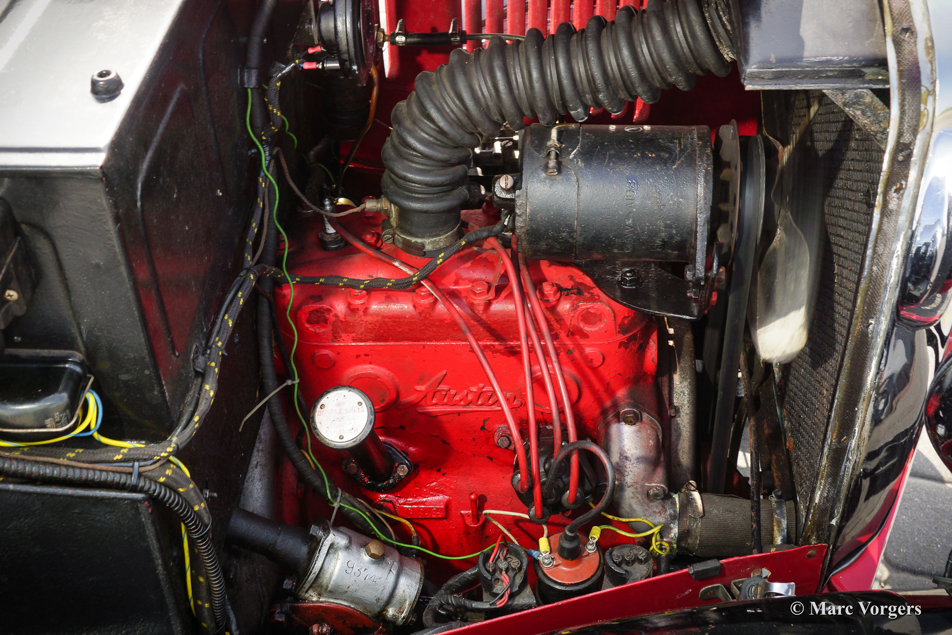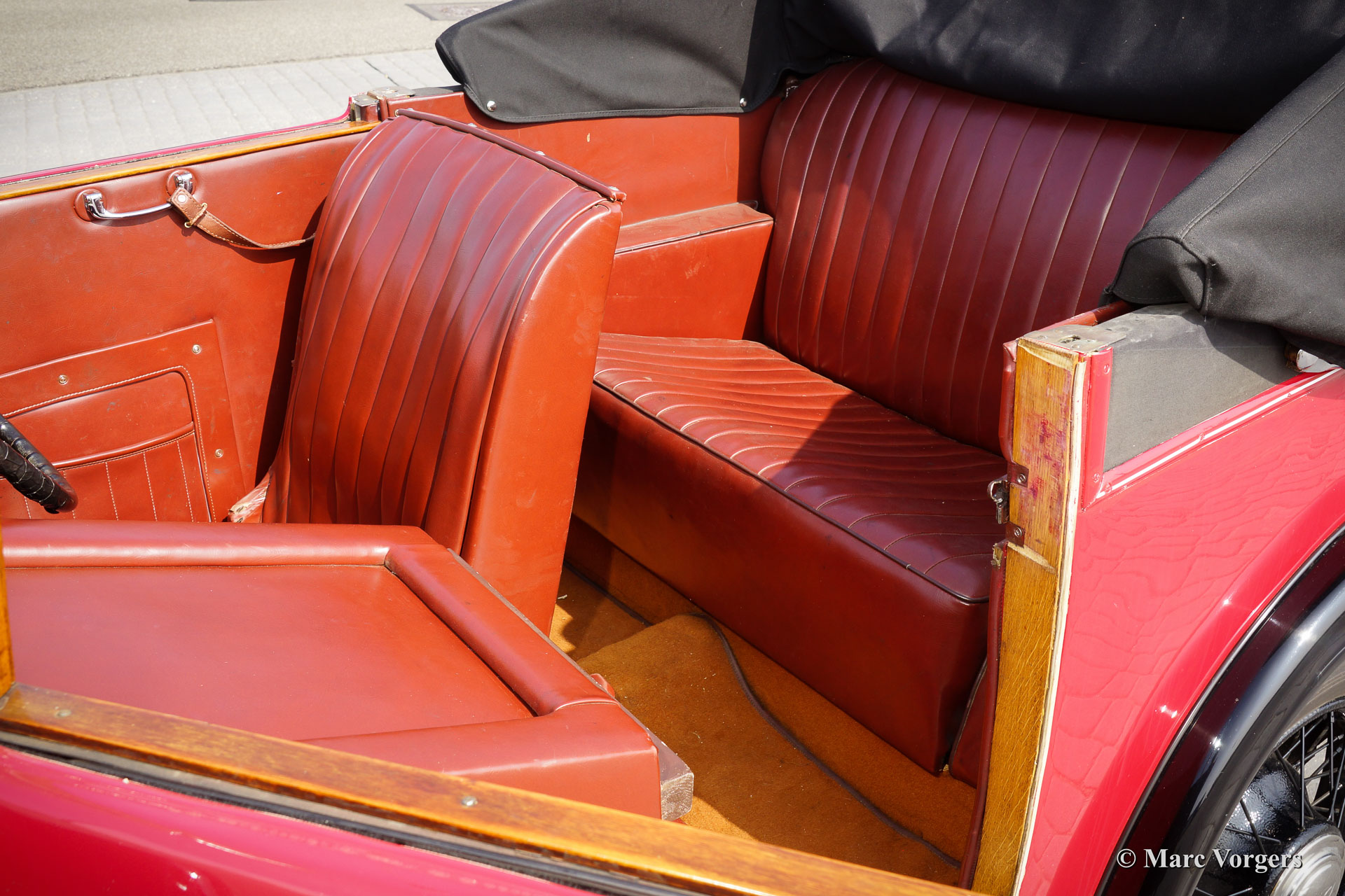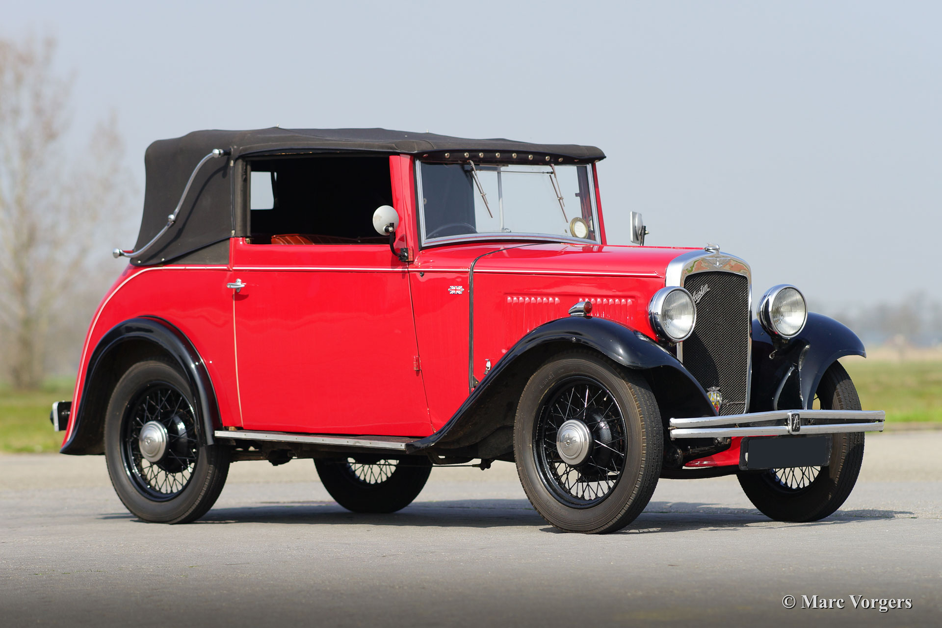 Austin 10/4 Flewitt Drophead Coupe, year 1933. Colour two-tone, red with black wings. Brown leather interior and brown carpet. Black hood and hood cover. This Austin 10/4 features a Drophead coupe body by Flewitt of Birmingham, England. Two of these cars are known to exist, a very rare model. The car is in good condition, recently the brakes, the wiring and the tires were renewed. The wheels were fitted with new spokes. The last owner has collected a lot of documentation about the car and he has had the Austin improved on several details.