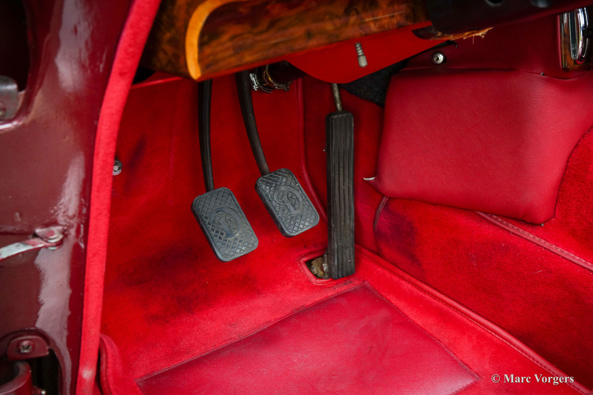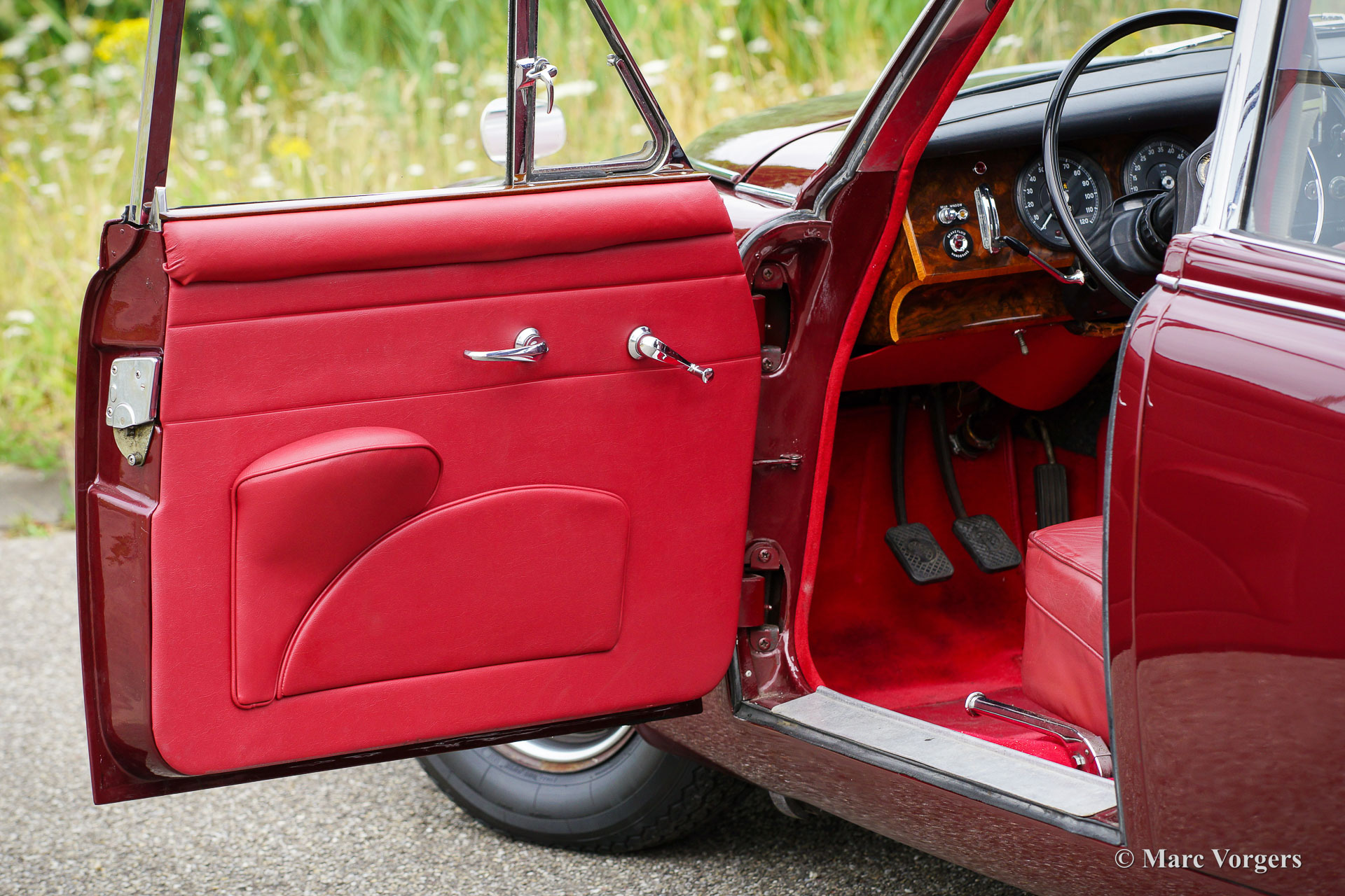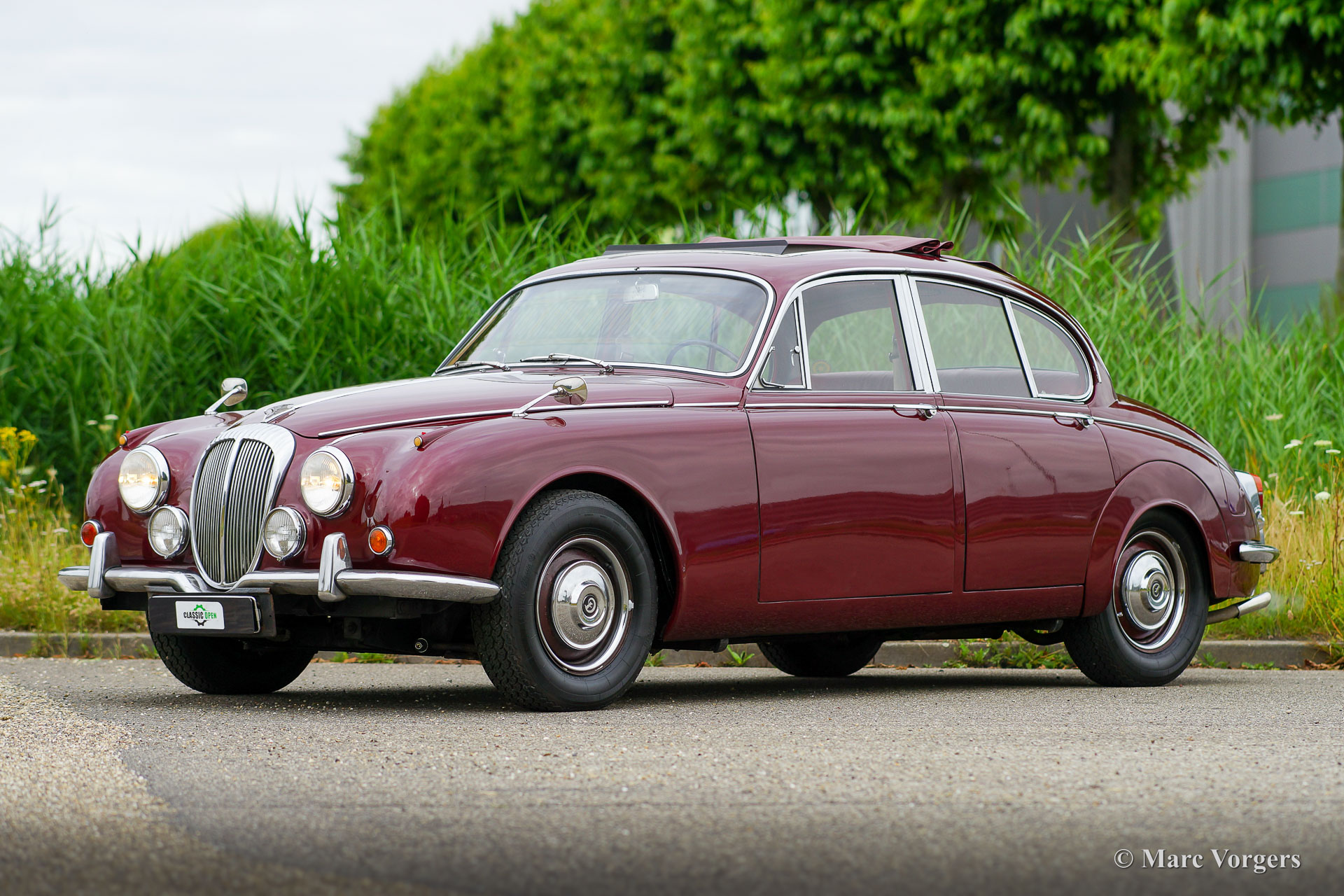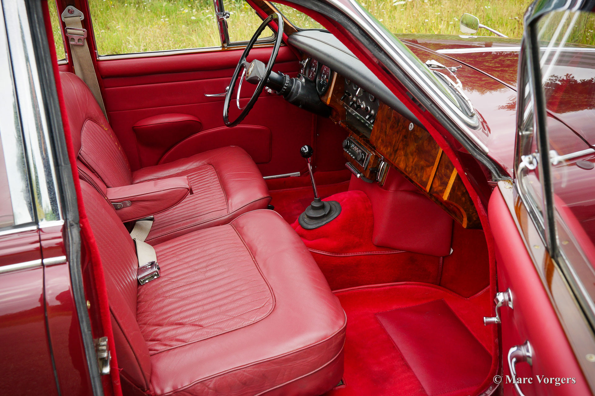 Daimler 250 V8, year 1967. Colour Maroon red metallic combined with a Burgundy red leather interior and red carpet. This beautiful Daimler 250 V8 is a very special example. The car is not only a left-hand drive (LHD) model, but the car also features a manually operated gearbox and a fantastic sunroof! We know this car for many years as we have serviced the car for the previous owner. The current owner purchased the Daimler in 2019. He then started improving the Daimler to a higher level of quality. The bodywork was improved, and the car was converted to left hand drive. The RHD dashboard was exchanged, and other wood interior parts were restored. The headlining was renewed. The S.U. Carburettors were overhauled, and hydraulic power-steering was fitted. The car is in a very good condition with some signs of use and age to the interior leather and the exterior chrome parts. Mechanically the automobile is fully up to date. The V8 engine runs beautifully, the gearbox shifts very well, and the exhaust note is fantastic. The car comes with documents, a Daimler Heritage certificate, and the car is fitted with a vintage Blaupunkt radio. Daimler is the Jaguar luxury sister brand, the Daimler 250 V8 is a more luxurious (and much rarer) version of the Jaguar Mk II. This very good left hand drive example with manual gearbox will bring a lot of joy for the new owner!
