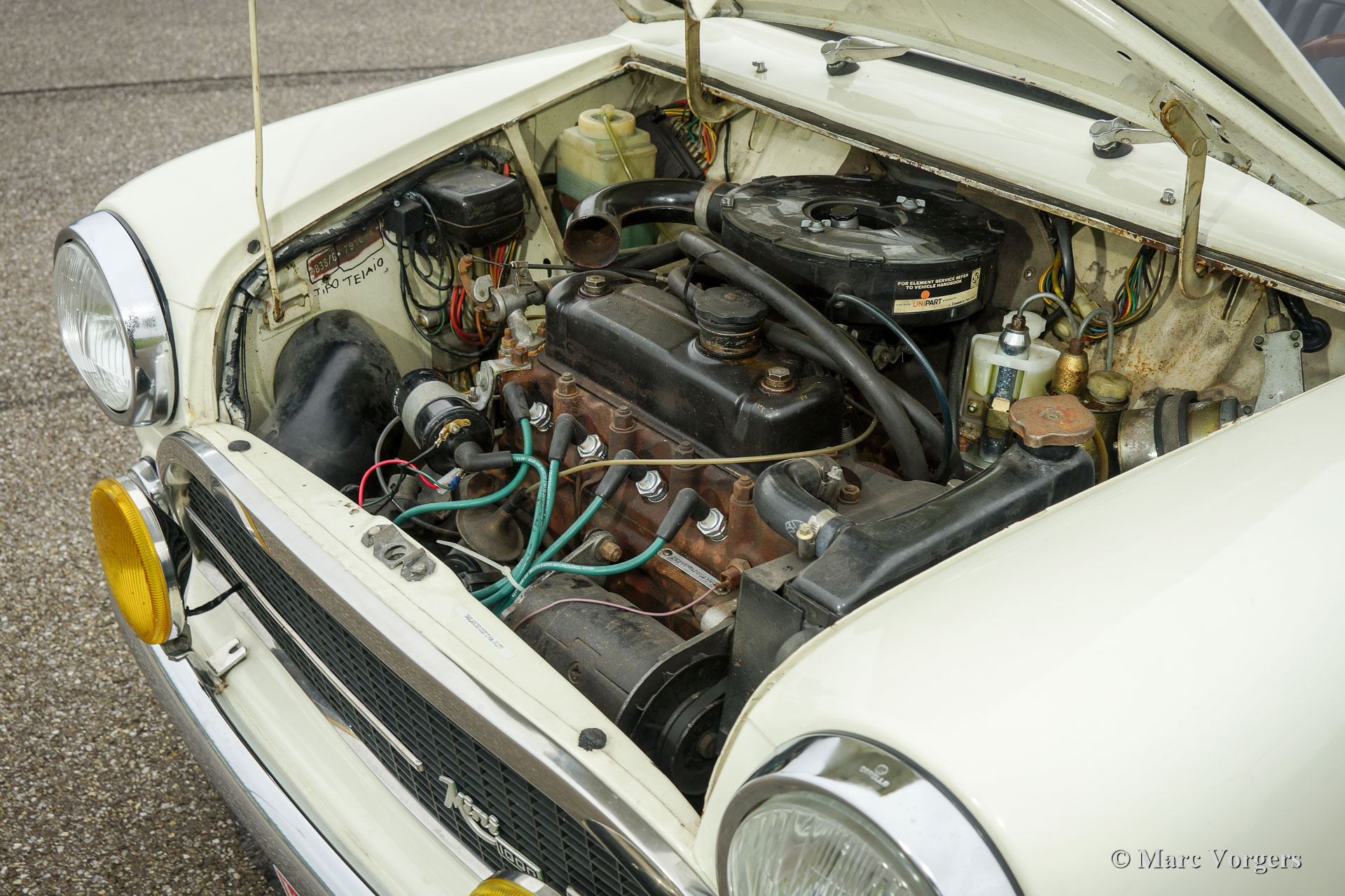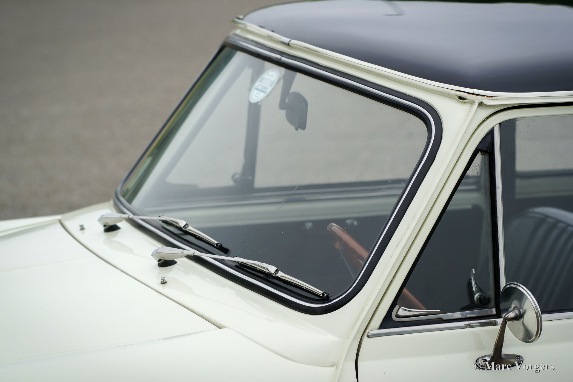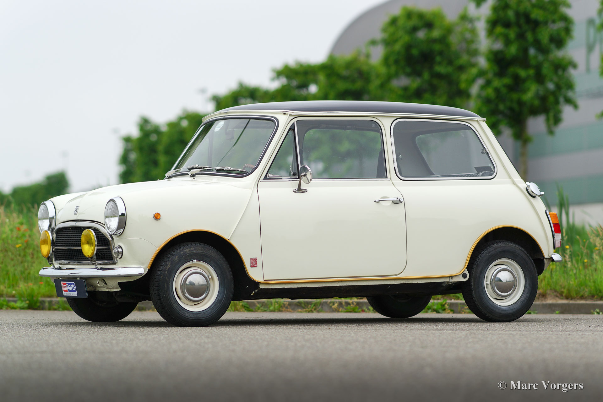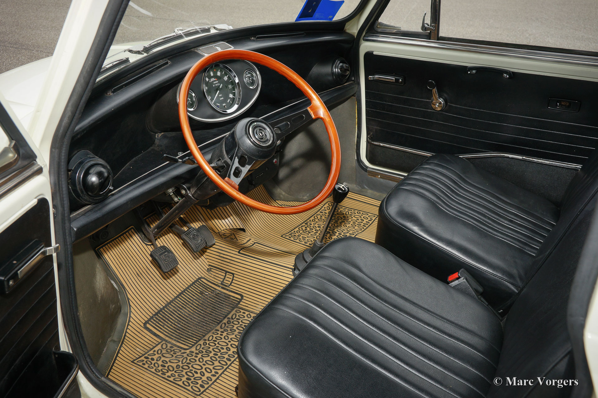Innocenti MINI 1000 'Export', year 1973. Colour crème white with a black leatherette interior. This rare Mini of the B38/6 type was imported from Italy where these cars were built from 1968 until 1975. The car is in good to very good original condition and before delivery four new tyres will be fitted. In 1968 the Innocenti Mini’s were exactly copies of their British counterparts. Over time Innocenti carried out several detail changes to the interior and the exterior making the car a bit more luxurious. This 1973 Innocenti features different head lamps (Carello) and chrome bezels, a different grille, ventilation quarter lights in the doors, a reverse driving lamp, the hood is being unlocked from the interior, a different boot-lid, a 1000 cc engine with 10% more power, more luxurious door panels, Veglia-Borletti dashboard gauges, different badges on the exterior etcetera. This Innocenti as a unique Mini and the car drives delightfully!