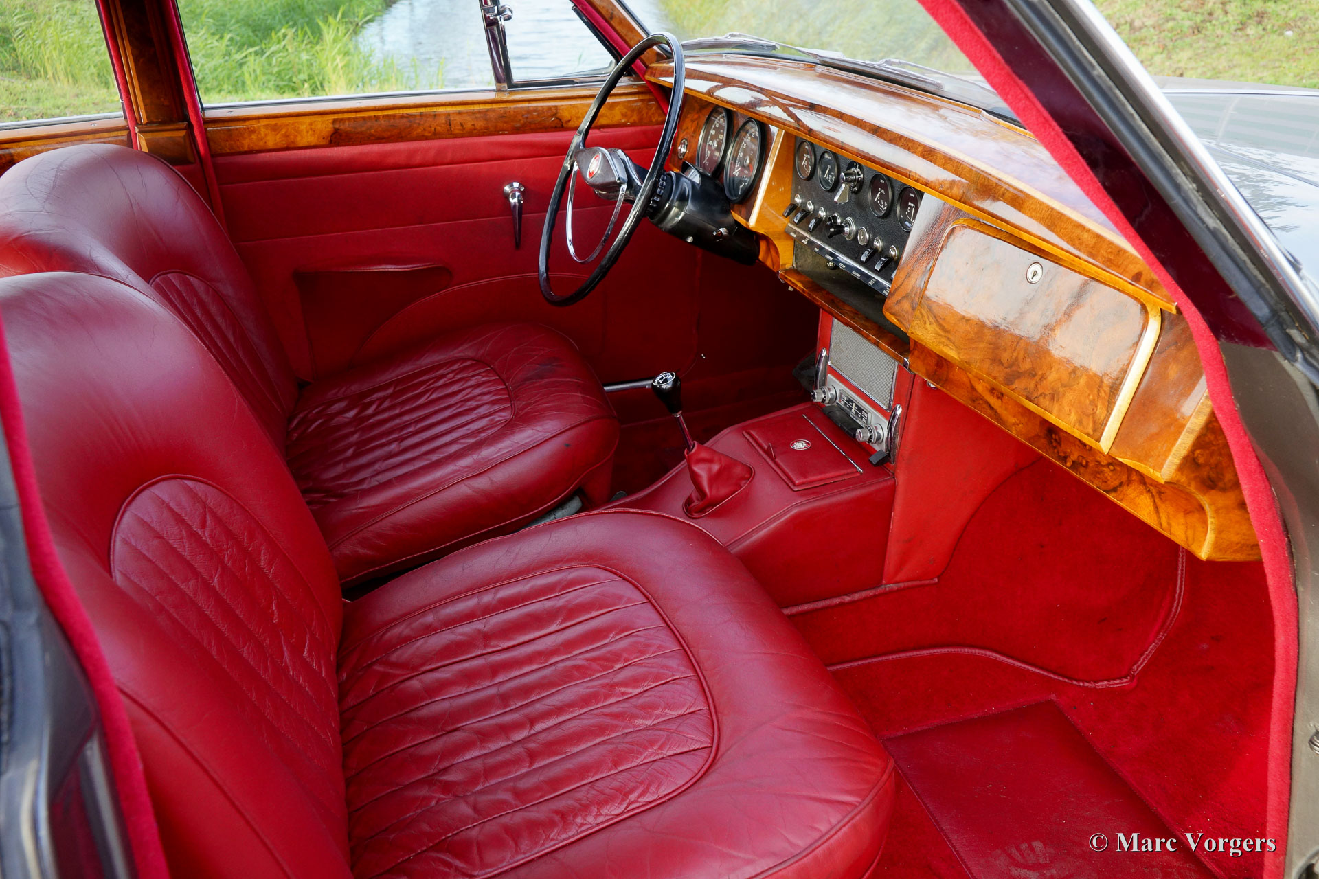 Jaguar Mk II 3.4 Litre, year 1963. Colour dark grey metallic (Gun Metal Grey) with a red leather interior and red carpet. This beautiful Jaguar comes with a remarkable and extensively documented history. The car was ordered by a Dutchman via the Jaguar representative in Teheran (Iran) in 1963. The new owner had a trip planned with the car. For this purpose, the factory had the car shipped to Greece… In the year 1984 the Jaguar was registered in the Netherlands. All the original booklets come with the car and a log-book in which a lot of history has been recorded. This Jaguar Mk II is in very good condition and the car drives beautifully. This Mk II is a sought-after model fitted with a manually operated gearbox and overdrive!