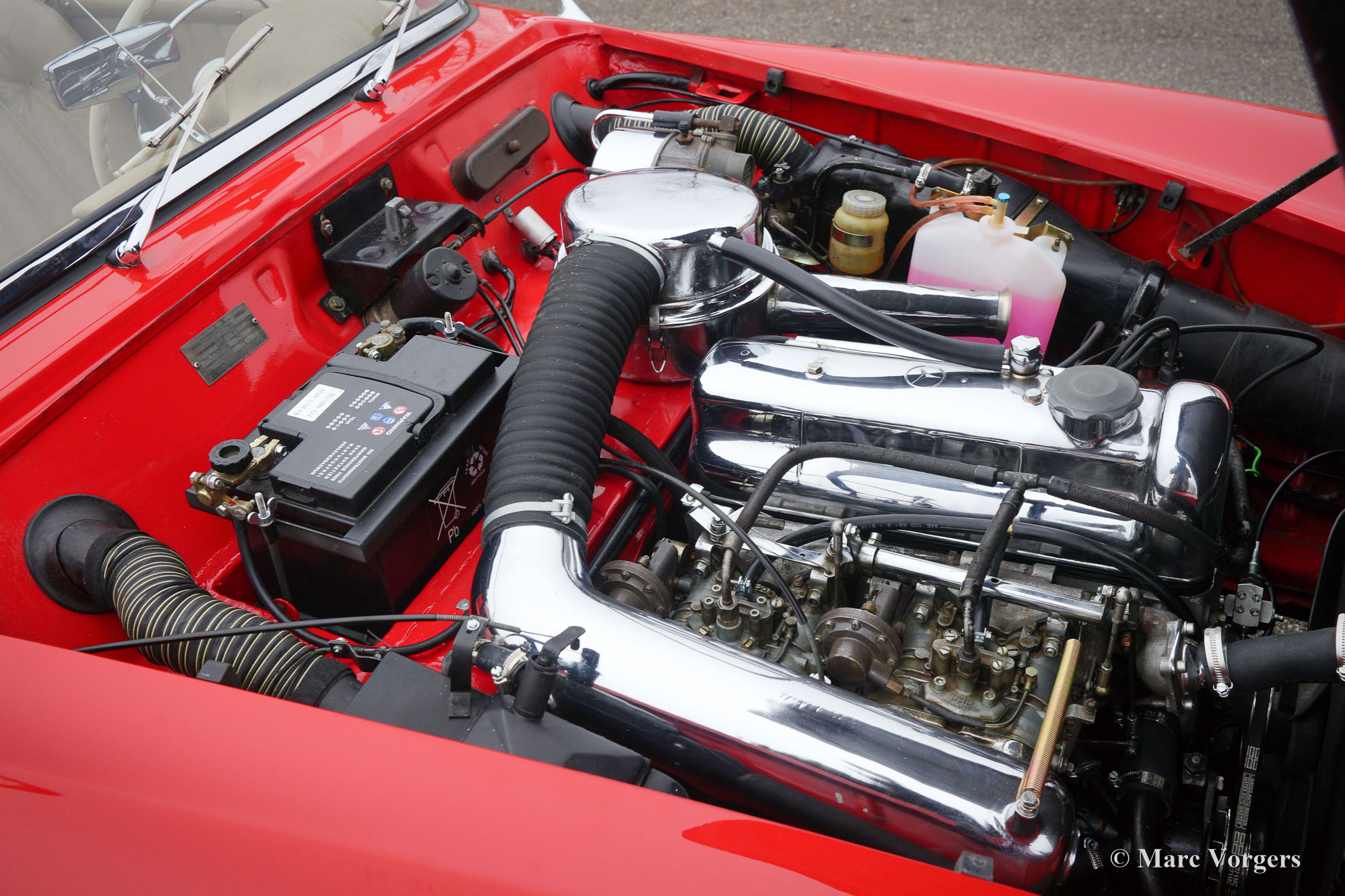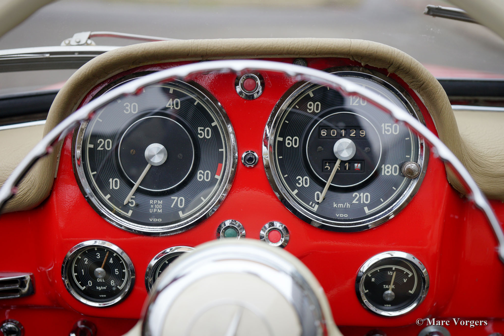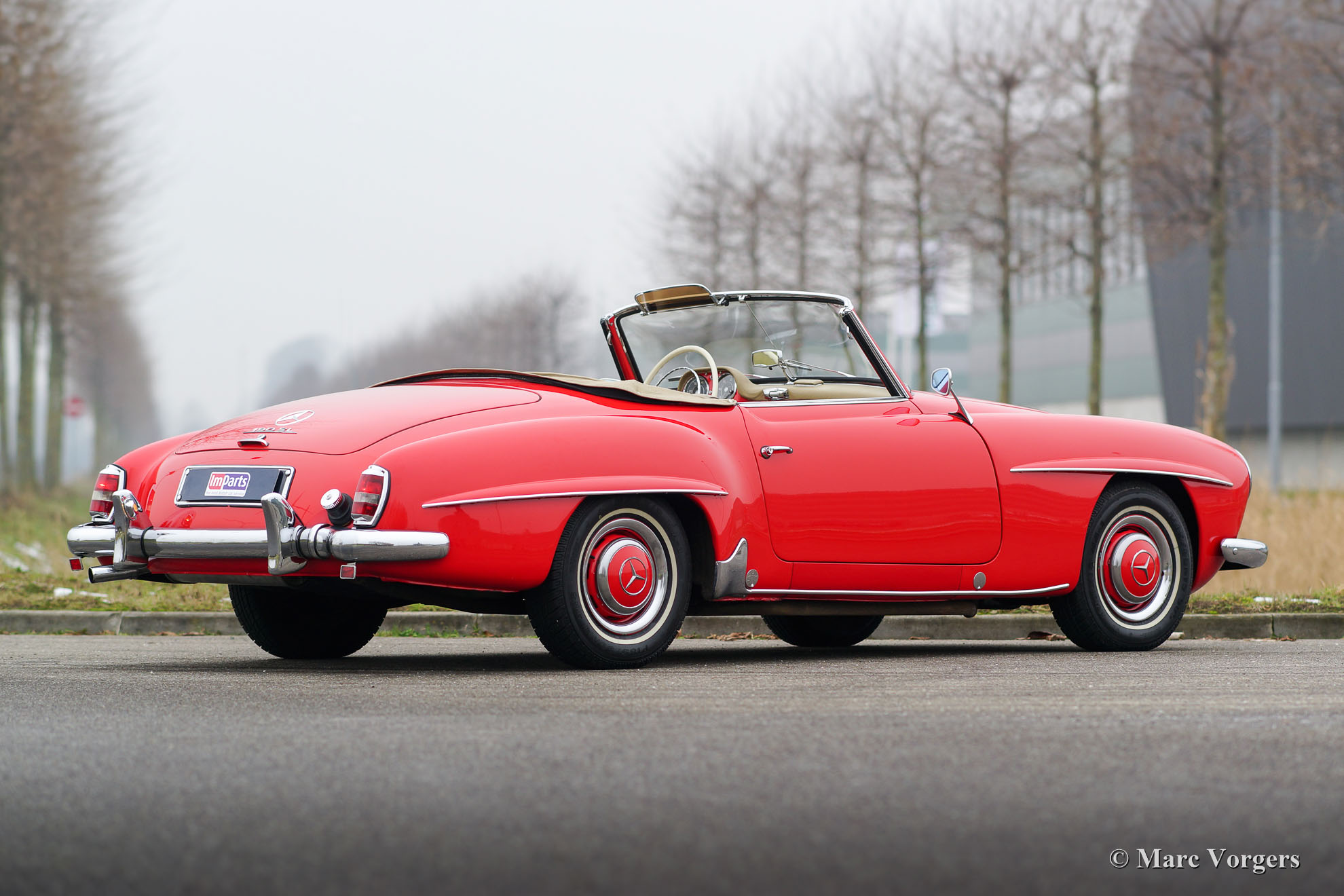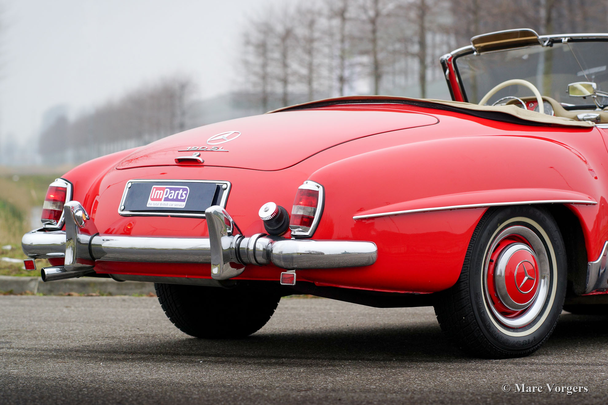 Mercedes-Benz 190 SL (W121), year 1962. Colour red with a beige leather interior and beige carpet. Black hood and a beige hood cover. This beautiful Mercedes 190 SL was sold new in the Netherlands. The car has been well maintained over the years, this 190 SL is in very good condition. The interior is fully original and it shows some signs of use and age. The bodywork was given beautiful new paint and the chrome bright-work is excellent. The engine has been thoroughly cleaned and a new head gasket was fitted. This is a beautiful and perfectly driving 190 SL in very good condition!