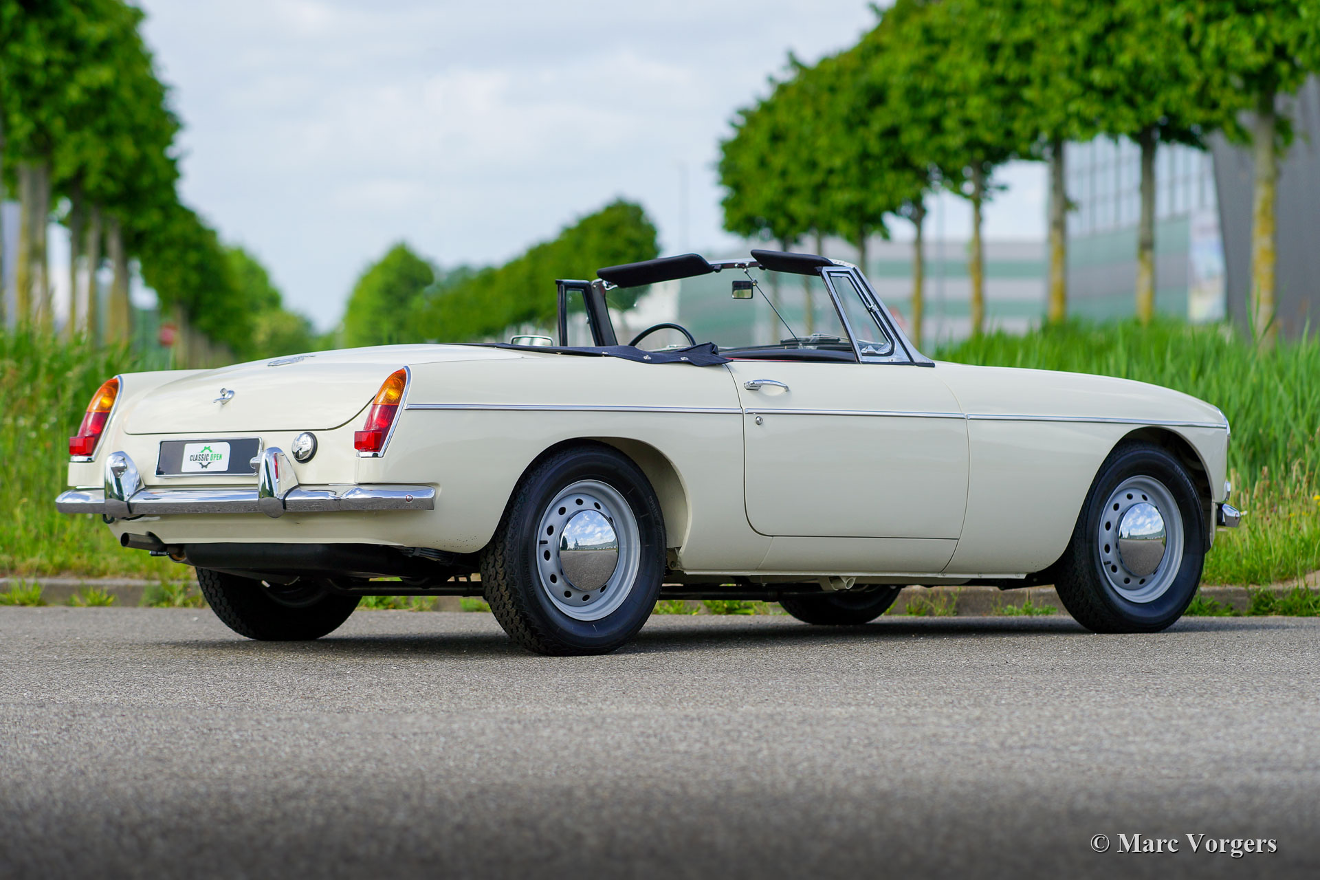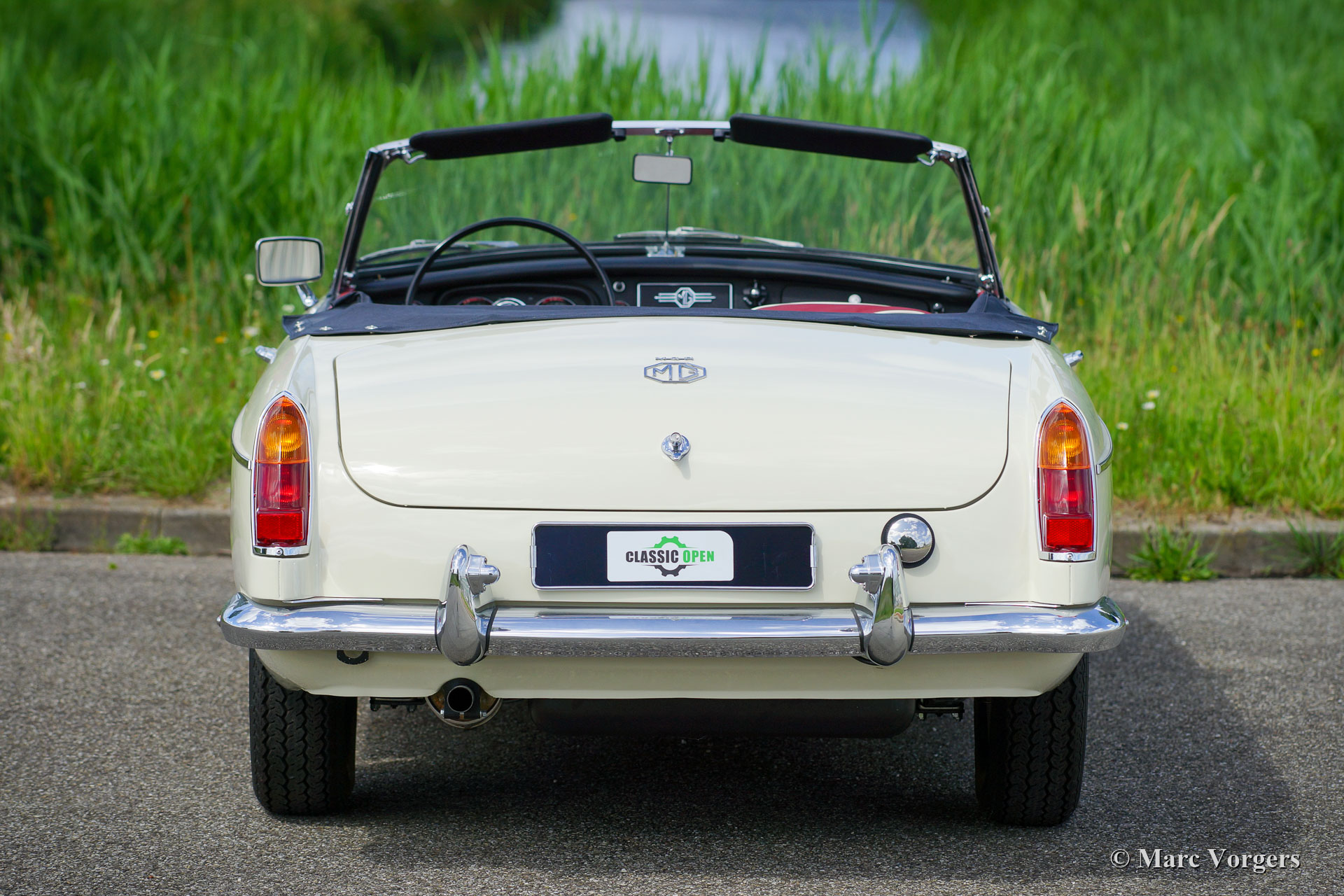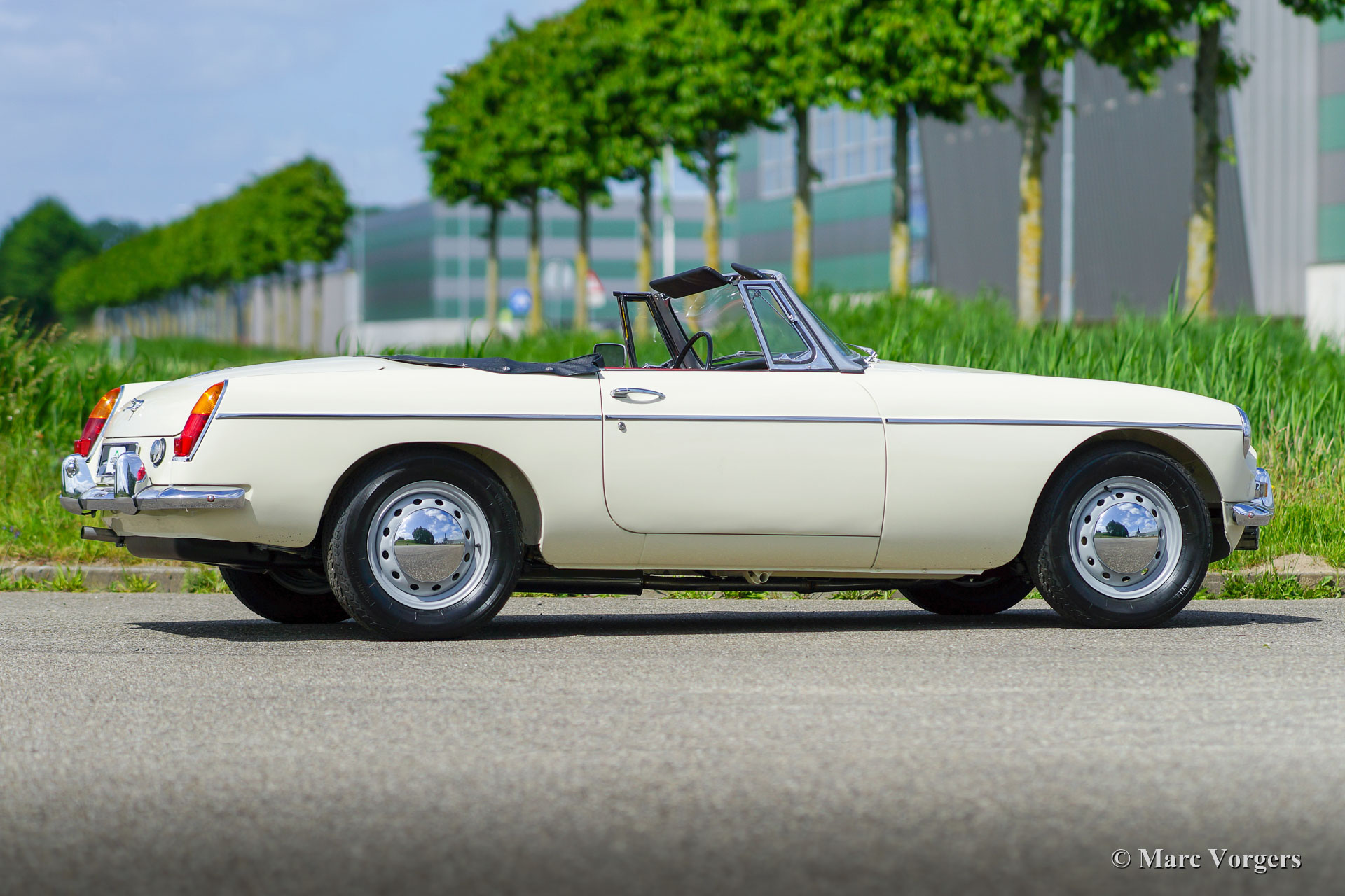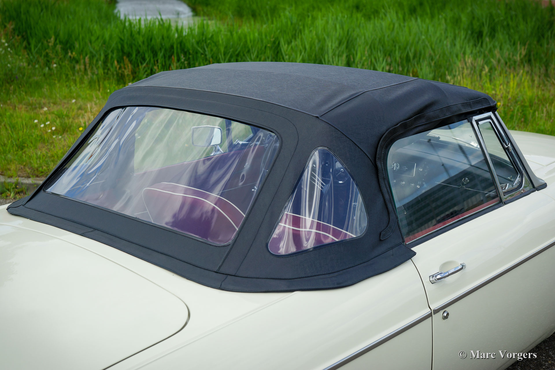 MG MGB roadster, year 1966. Colour Old English white combined with a red leather interior trimmed with white piping and black carpet. Black soft-top and hood-cover. This magnificent MG MGB was extensively restored to perfection! The car is in concours condition, and it drives delightfully. Since completion of the restoration the car has driven only 500 kilometres. This fine MGB shows all the original details like the wonderful metal dashboard with finished with black wrinkle paint, the original steering wheel and the the steel disc wheels fitted with chrome hub caps. The car is fitted with overdrive and disc brakes on the front wheels. A top example for the discerning enthusiast.