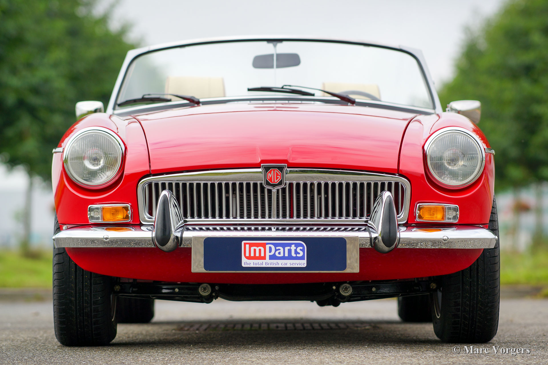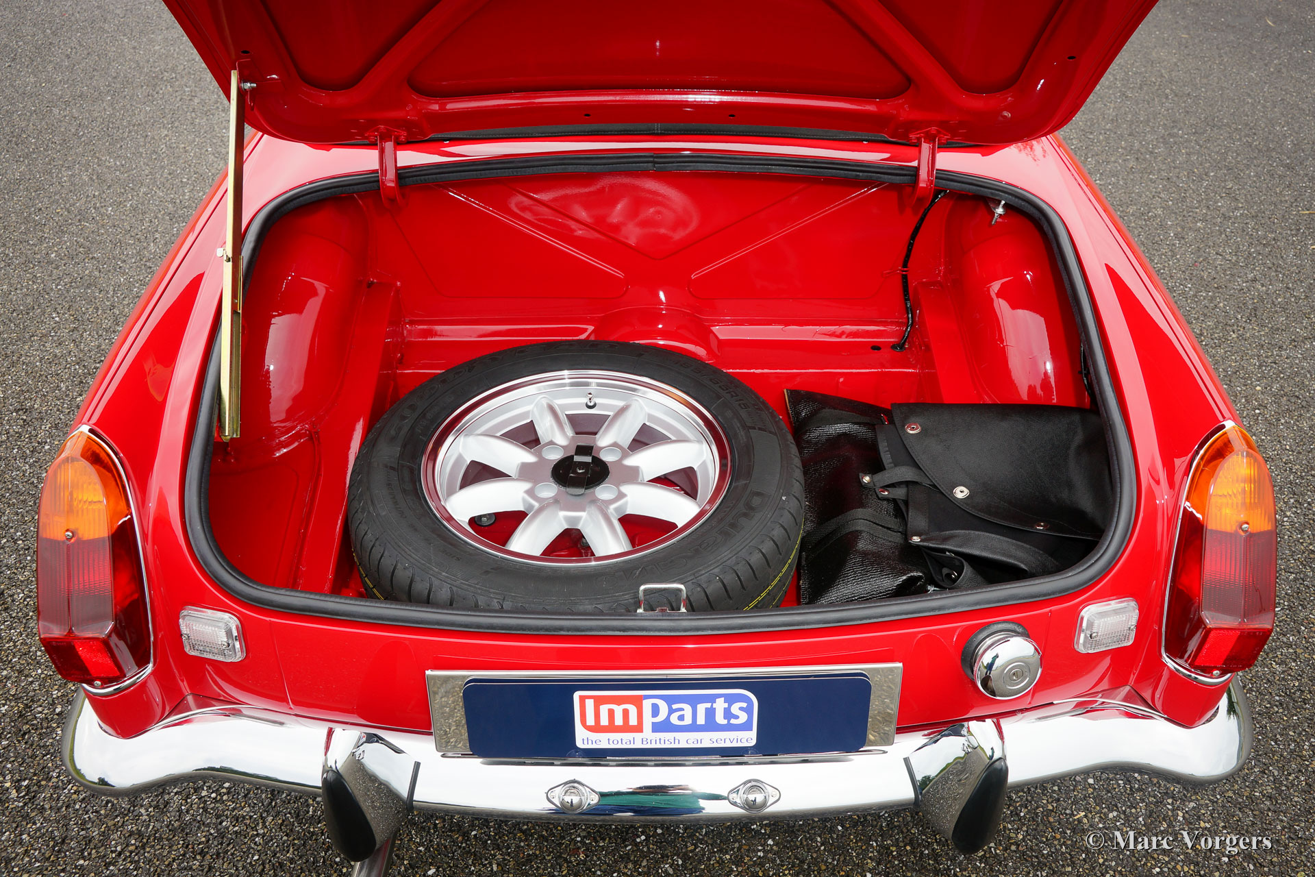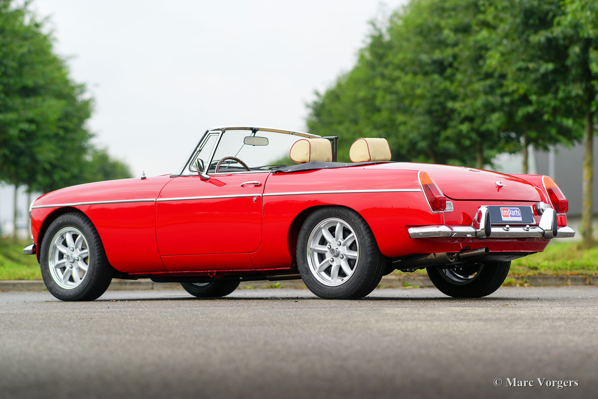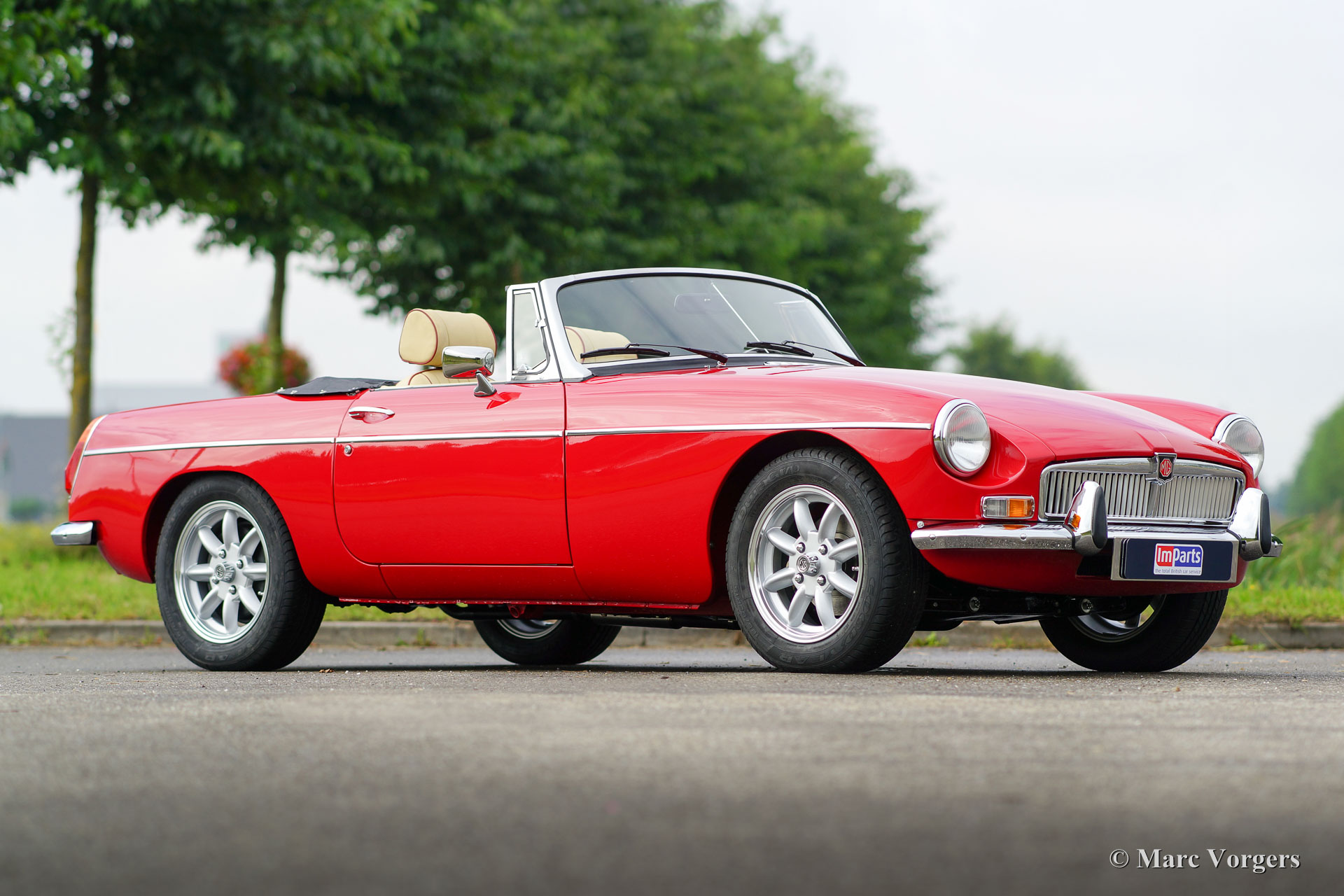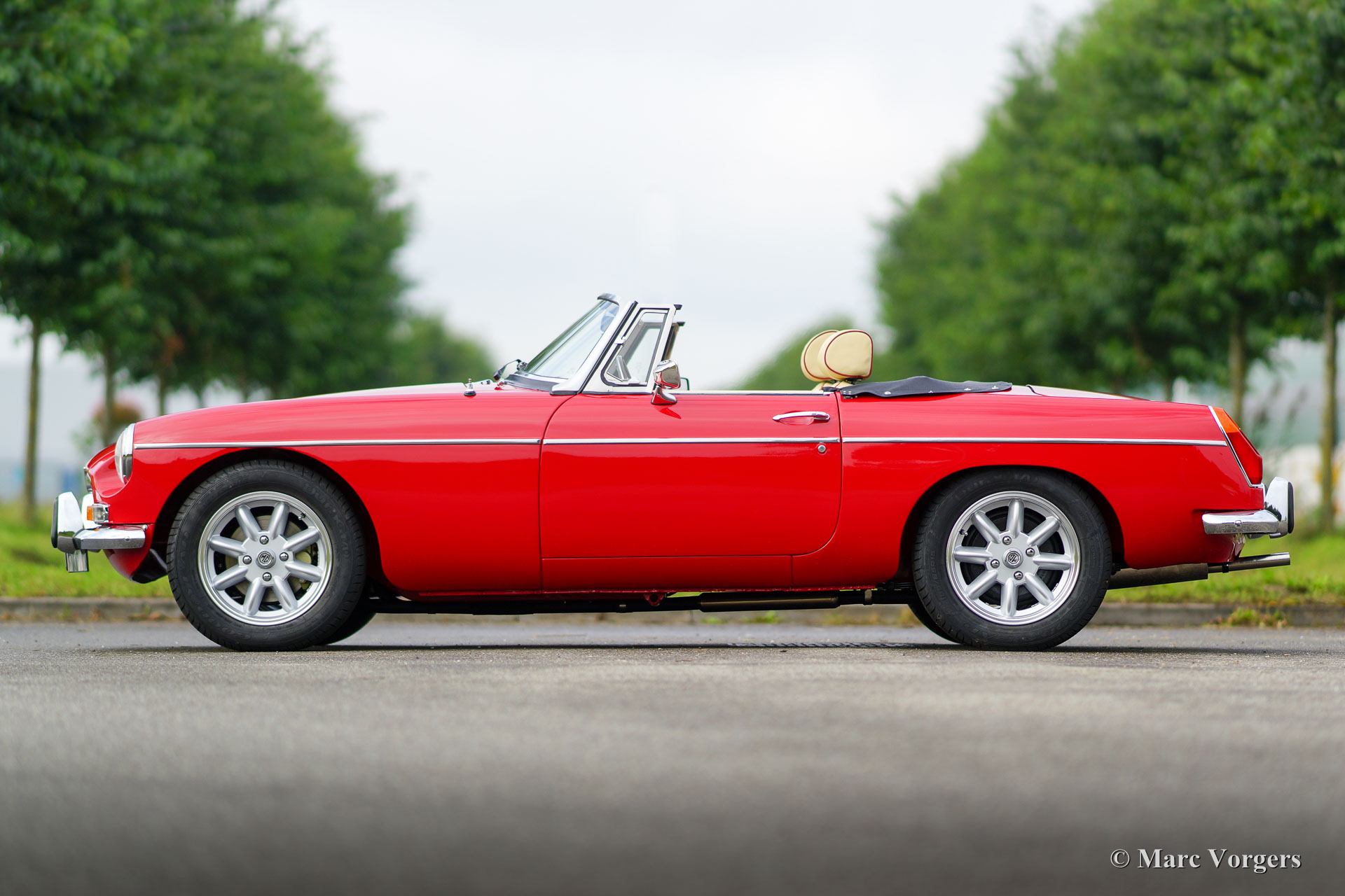 MG MGB roadster, year 1974. Colour ‘flame red’ with a beige leather interior trimmed with dark red piping. Black mohair soft-top. This 1974 MGB was road registered in the Netherlands in the year 1975. Recently the car was brand new built-up! A brand new ‘British Motor Heritage’ body shell was used and everything was renewed and / or overhauled. The car is in brand new TOP condition and the MG has driven only 2000 km since the las bolt was tightened. An extensive photo reportage of the build is present. This MGB roadster comes complete with overdrive, Minilite style alloy wheels, power brakes, leather upholstery, steering wheel with wood rim and a ‘classic style’ radio with CD player. This MGB roadster drives perfectly and better than new!