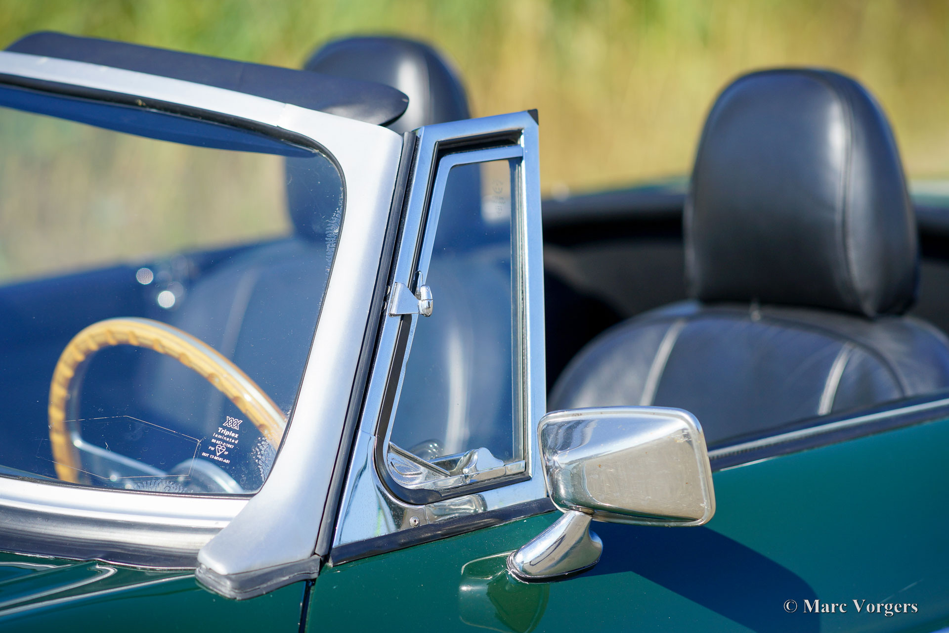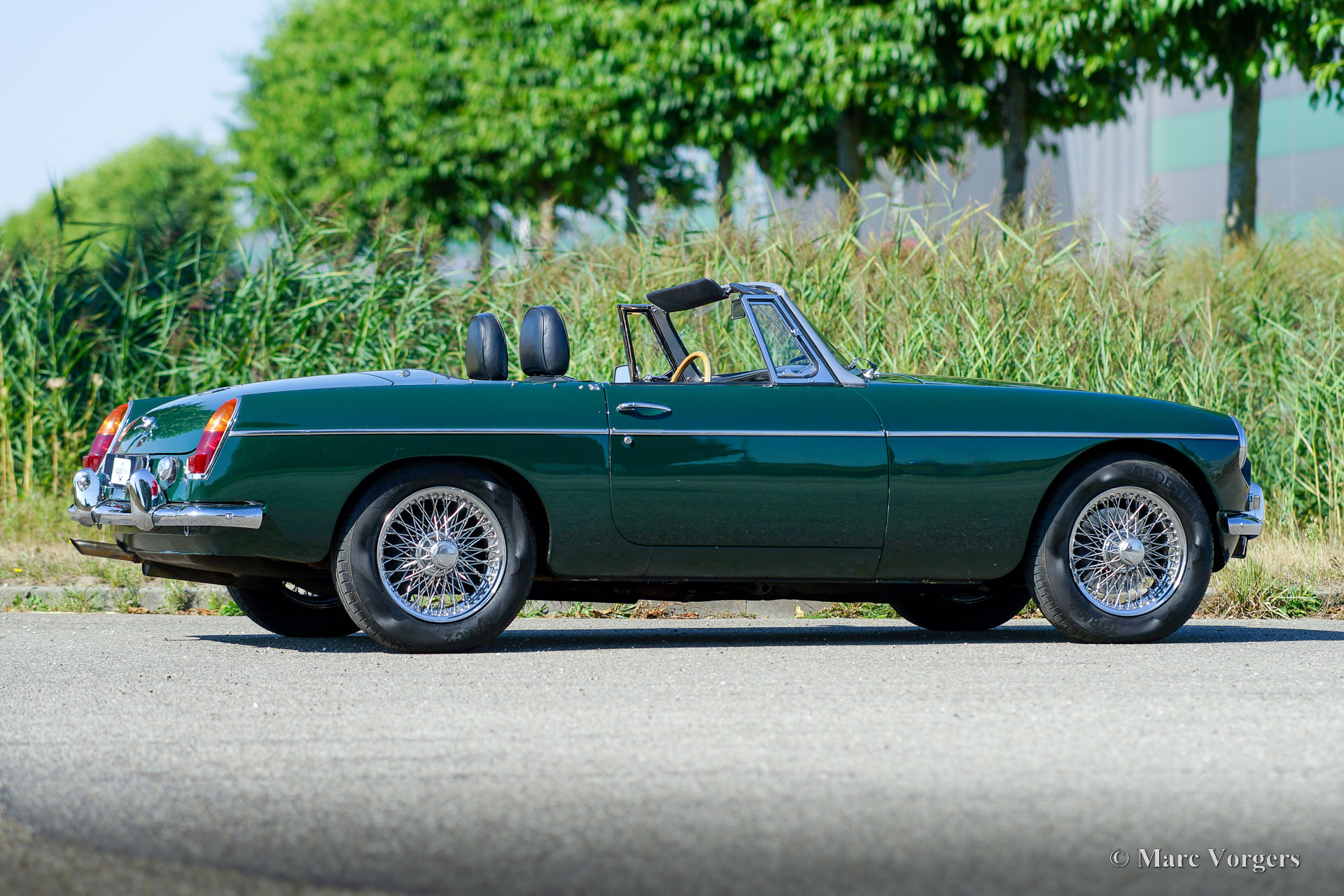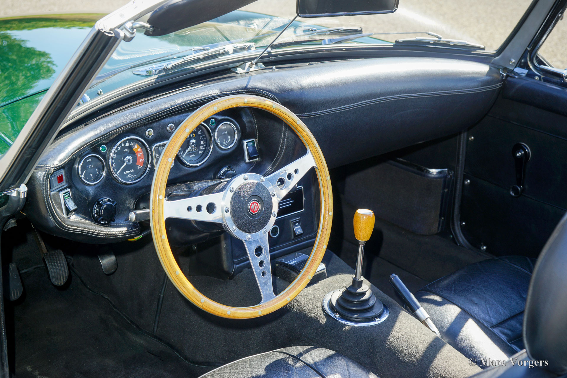 MG MGC roadster, year 1969. Colour British Racing Green combined with a black interior. Black leather seats with head rests and black carpet. Beige ‘pack away’ soft-top (which is stored in the boot). This fantastic MGC roadster is in a very good condition and the car drives delightfully. The car was serviced and maintained very well; the last owner cherished the car since 2018. The MGC is the six-cylinder sister car of the MGB, the engine delivers a healthy 145 SAE bhp. The driving experience is a mix of the ‘Big Healey’ and the compact MGB, and the exhaust note is wonderful! Externally, the MGC looks exactly like the MGB at first glance, connoisseurs recognise it by the special bonnet which features ‘power bulges’ to house the large engine and its twin carburettors. This fine MGC is fitted with OVERDRIVE, chrome wire wheels, a MotoLita steering wheel with wood rim, a Stainless-Steel exhaust, power assisted brakes with twin servos. The MGC roadster is a fantastic touring convertible!