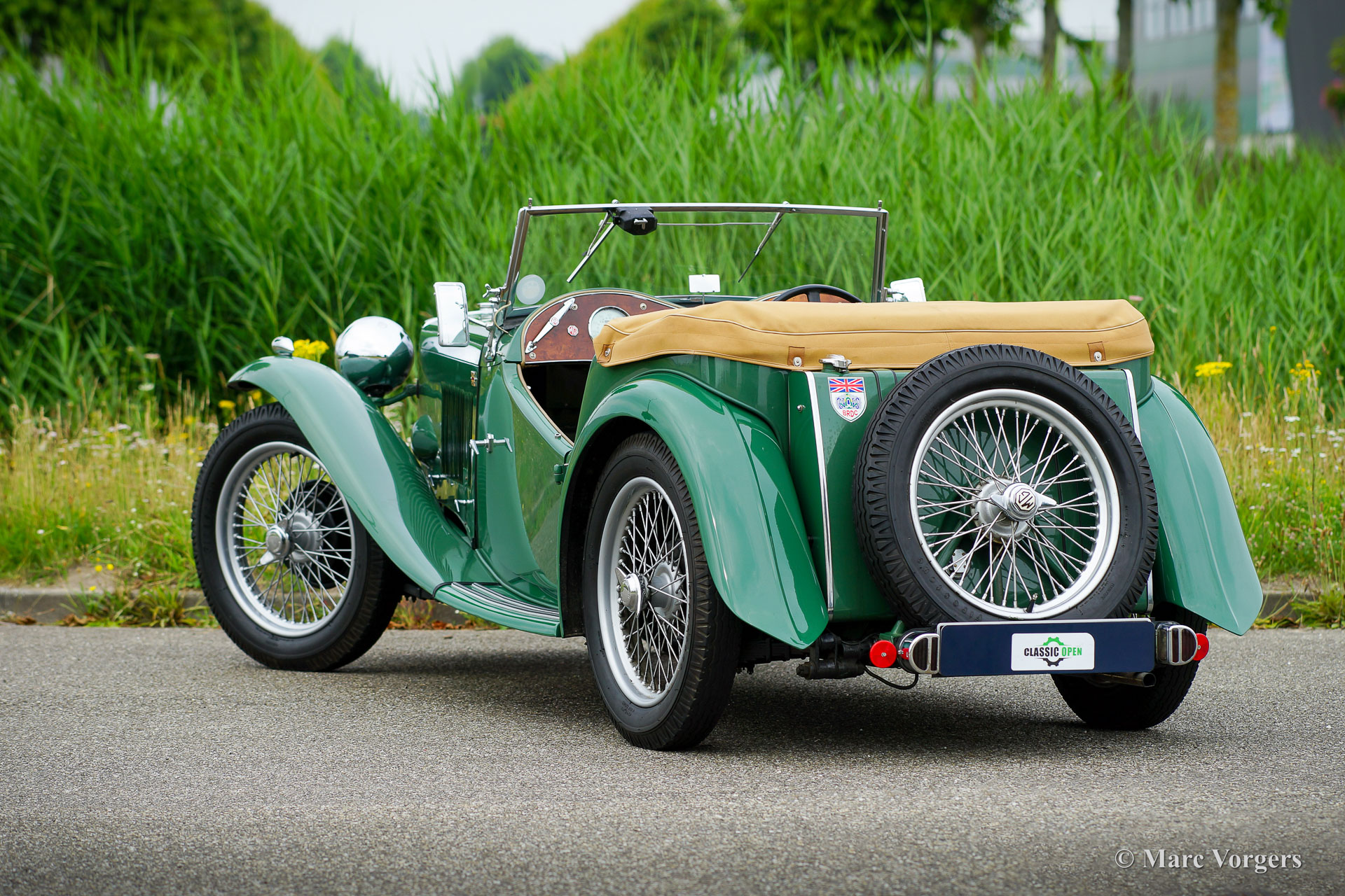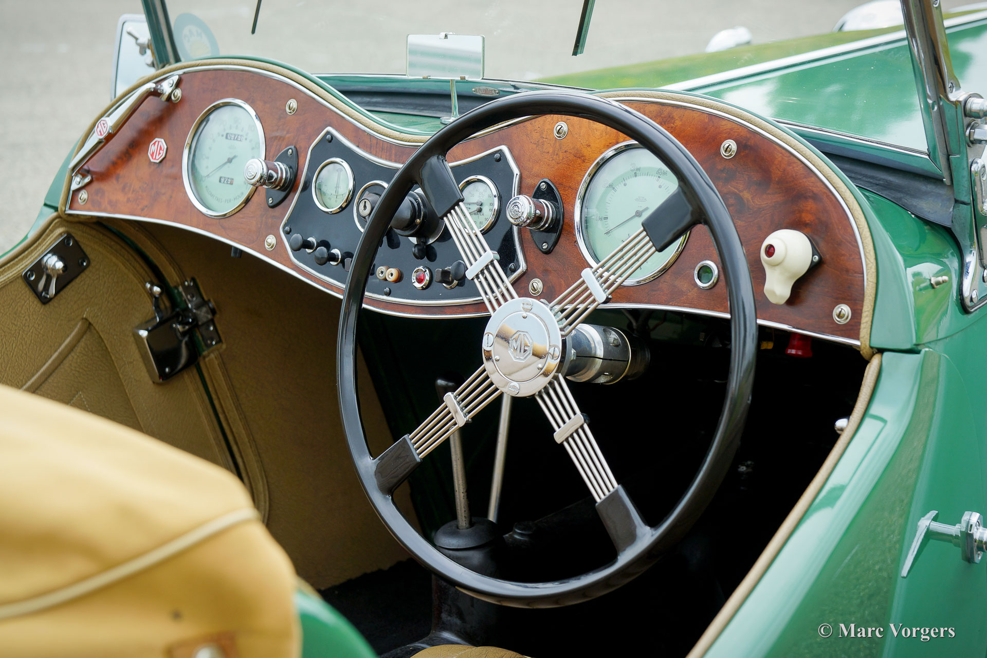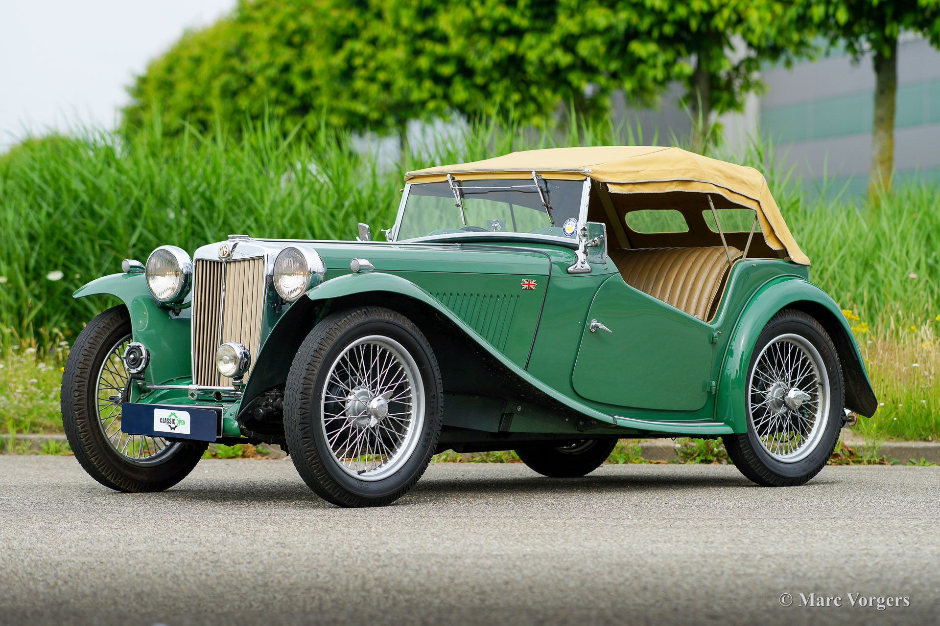 The MG TC was the first new post-war MG. The TC was introduced in 1945, and based on the pre-war TB, it was very similar. A major improvement to the TC was the larger interior, which was increased by 10 cm. The design was similar to the pre-war TB, with swept separate wings, large 19-inch wire wheels and a folding windshield. The MG TB/TC series were much admired by the American soldiers who were on the point of returning to America; this type of small sports car with its smooth handling, was not yet known in America. As a result, many TBs and TCs were shipped to America, and also the MG TC was in great demand at the other side of the pond. All TCs had right-hand steering, leaf springs all around and a 54 bhp four-cylinder engine. In 1950, the MG TC was succeeded by the MG TD.