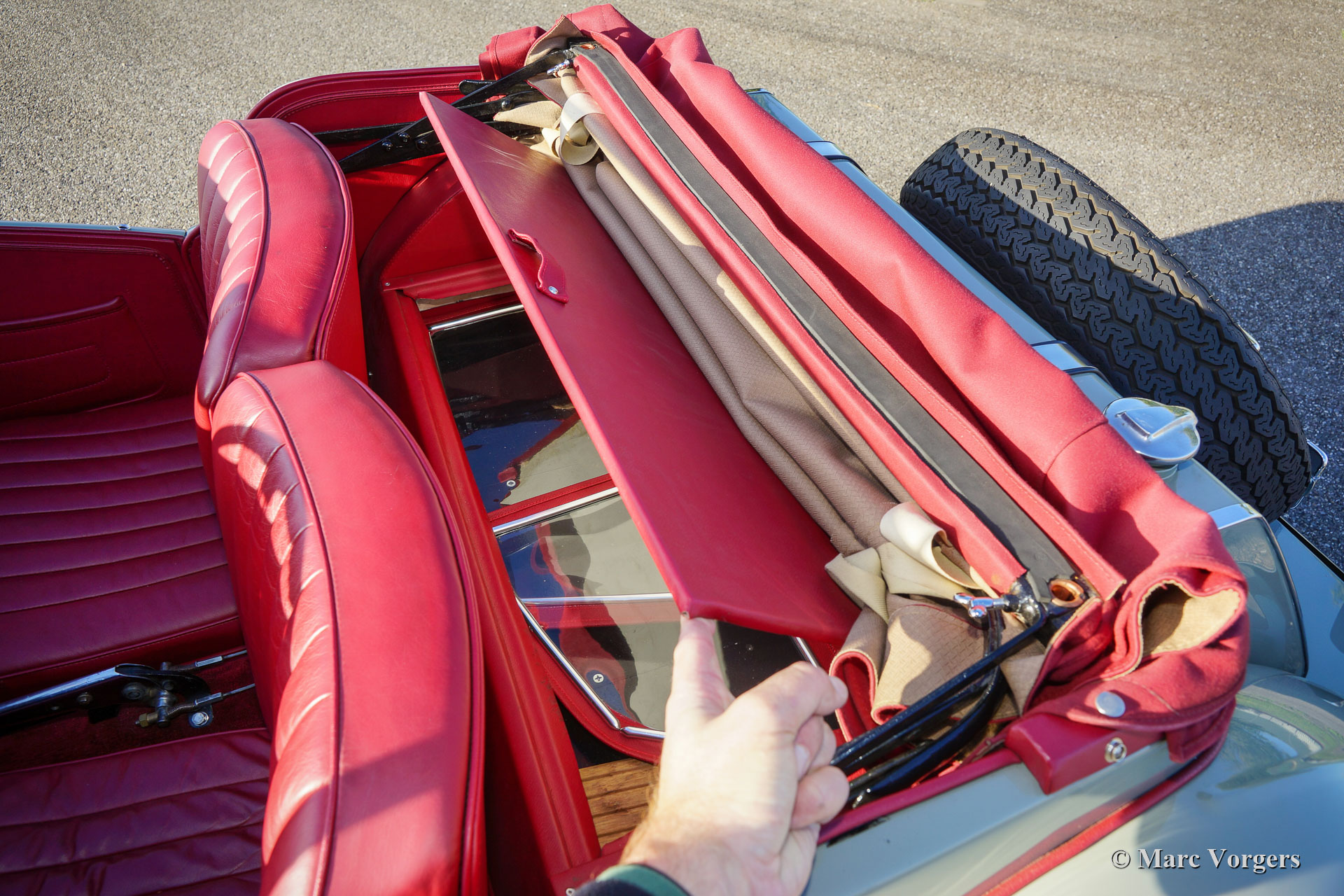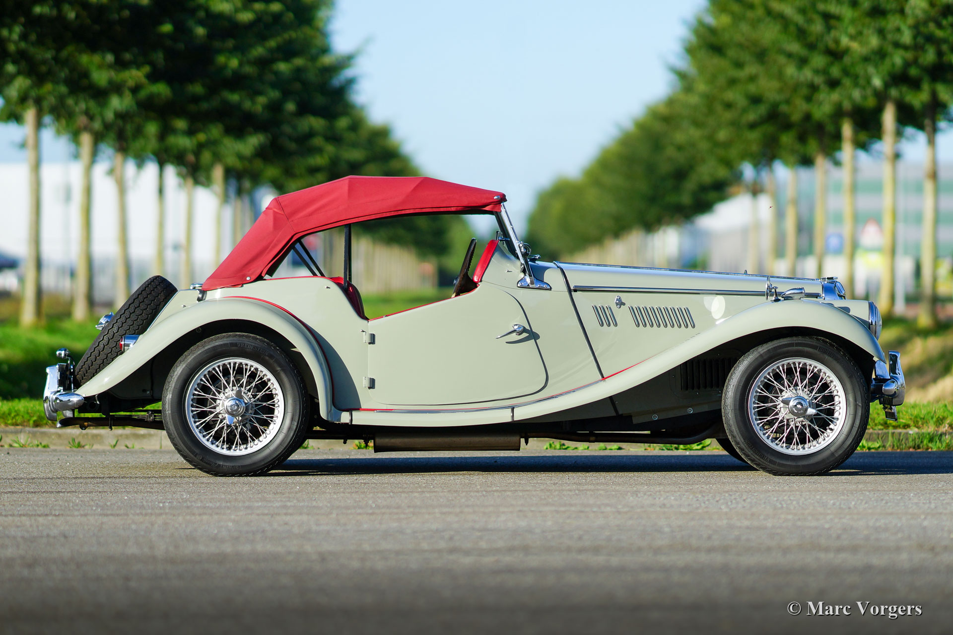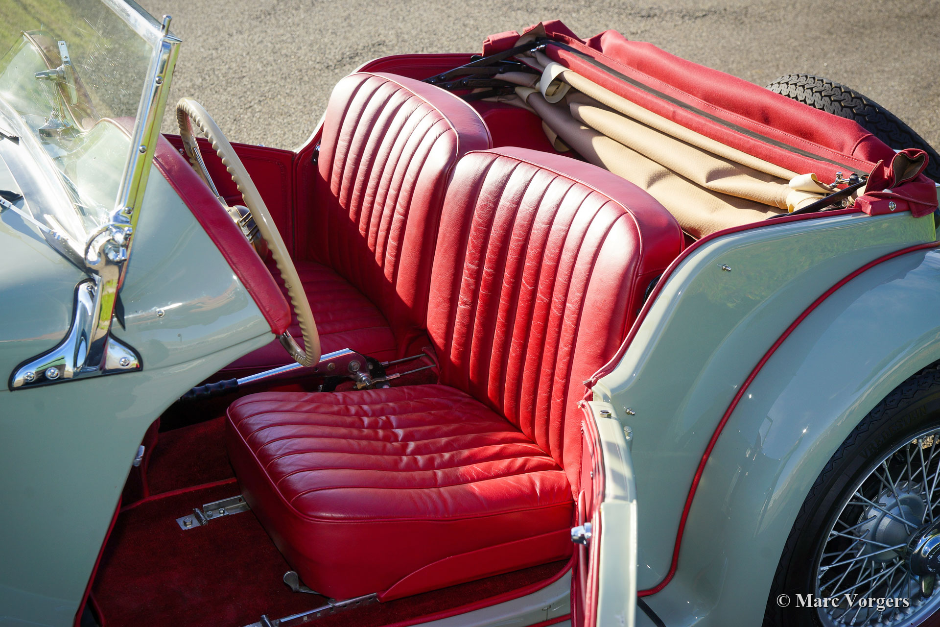 MG TF, year 1954. Colour Birch Grey combined with a red leather interior. Red mohair soft top and side screens. This very pretty MG TF was restored in the past, the car is in excellent to superb condition and the car drives delightfully. The MG TF is the last of the legendary MG ‘T’ series. This car shows all the original details. Very noteworthy are the fantastic octagonal dashboard gauges and the fantastic view over the bonnet and the front wings. The MG TF is a great car to explore ‘meandering’ country roads in your own pace. The open top driving experience is simply perfect! This MG TF is fitted with silver painted wire wheels. A wonderful example!