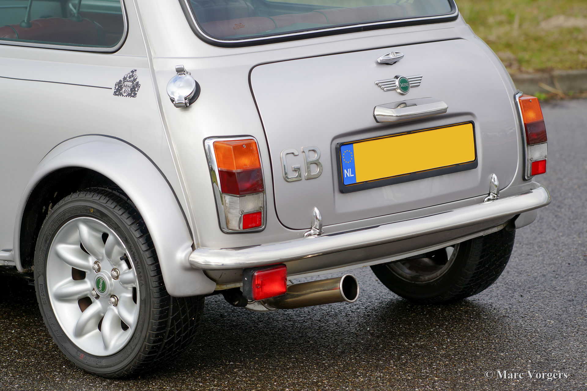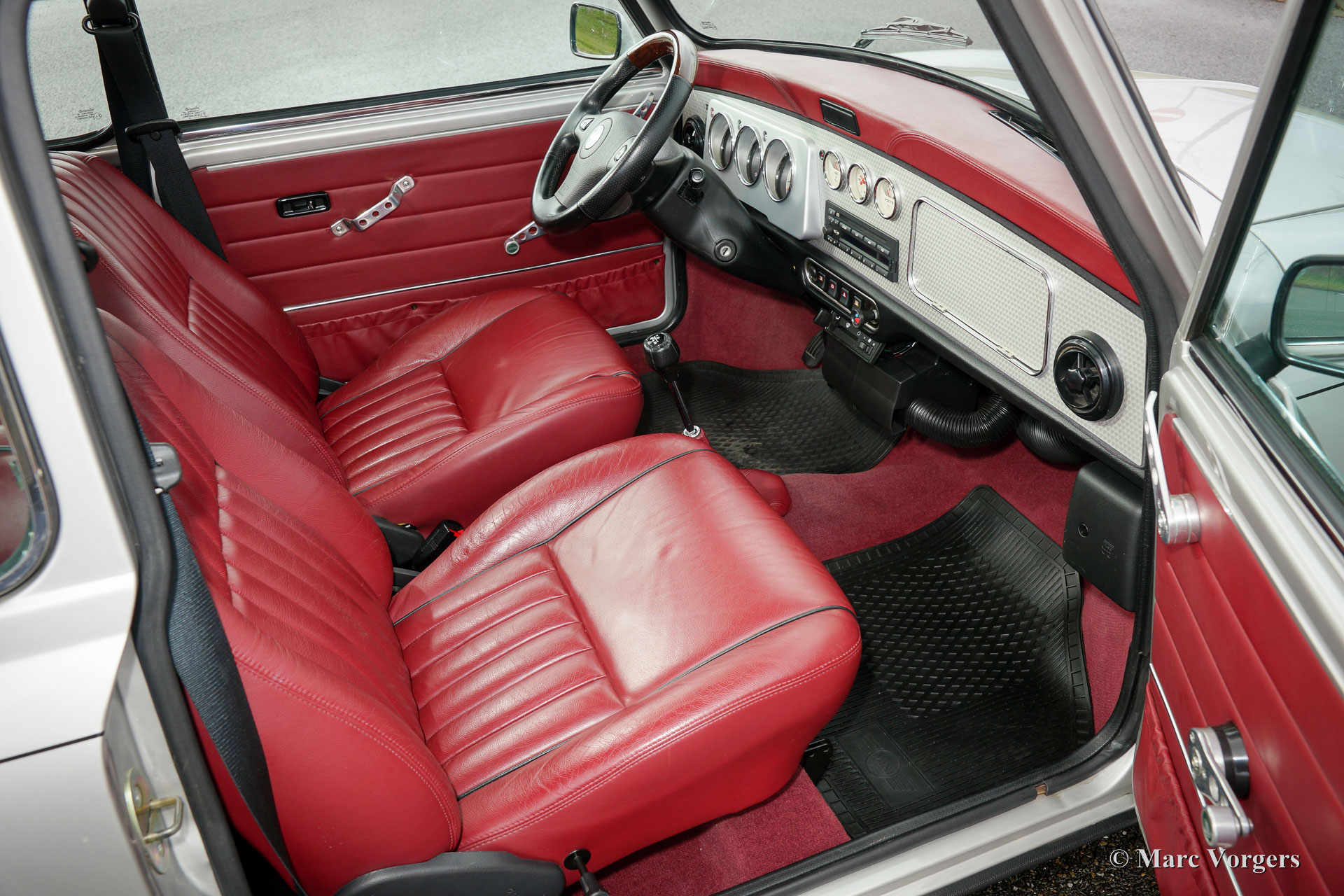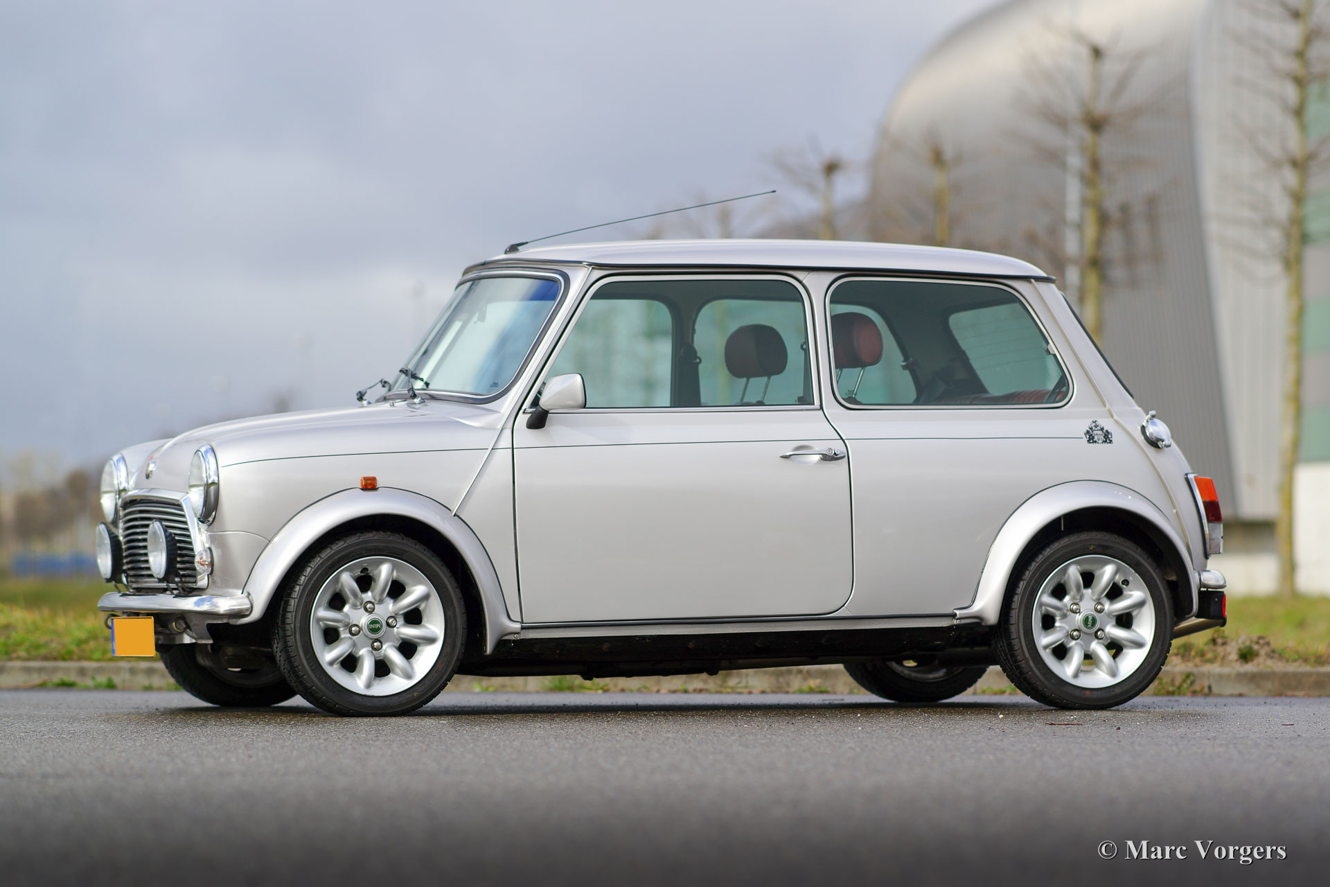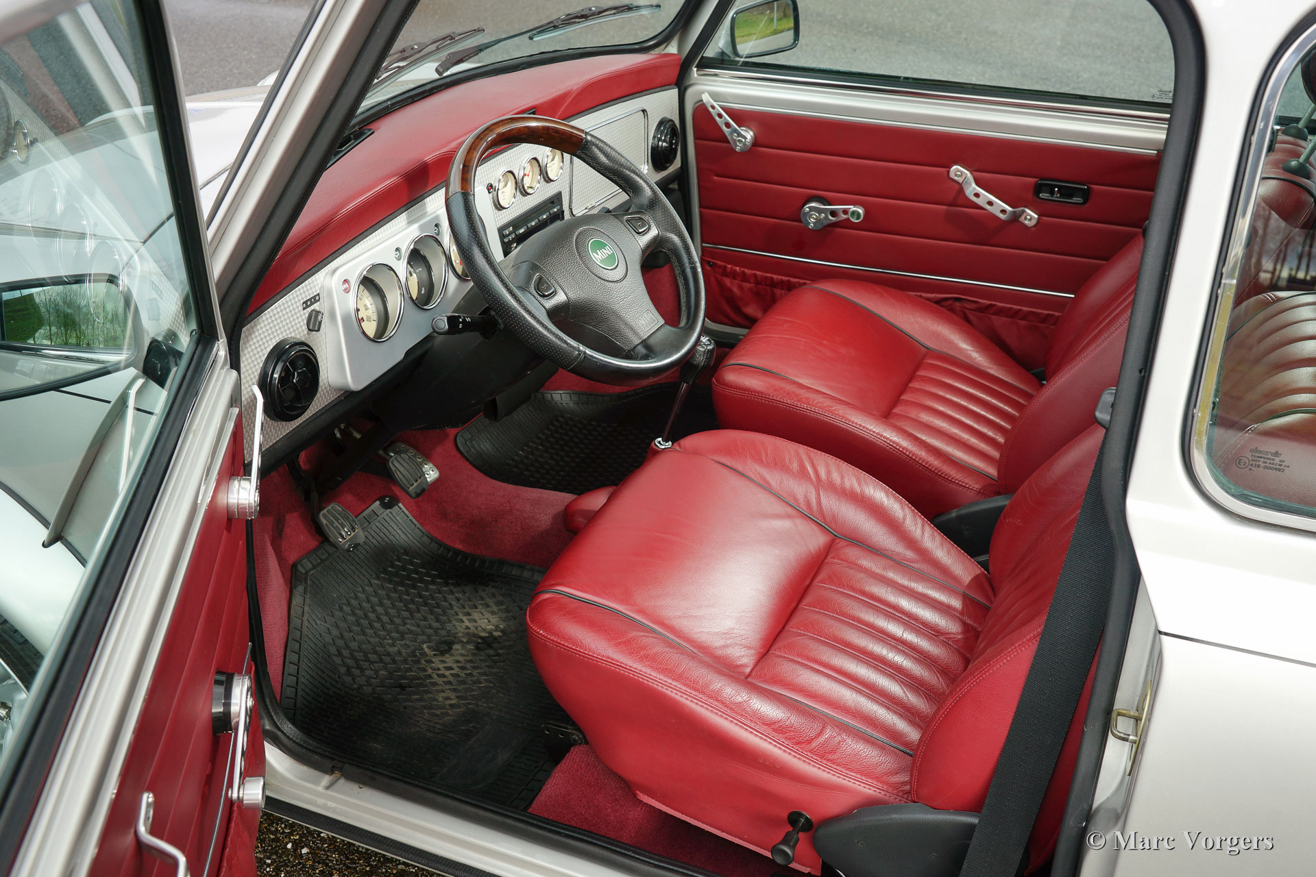 Rover Mini 40th Anniversary, year 2001. Colour Platinum silver metallic with a Burgundy red leather interior and red carpet. This fantastic Mini was imported from Germany to the Netherlands in the year 2003. The automobile is in superb original condition and the car drove only 35.000 km from new! This fine Mini 40th Anniversary shows very nice details like a polished aluminium dashboard, aluminium door handles and special ‘magnolia’ dashboard instruments with the 40th logo. The exterior features special flared wheel arches, wide light alloy wheels, special 40th badges and a ‘GB’ badge on the rear which is original for this model. This is a very rare Mini, only 800 examples have been built in seven colours. The car was given new tyres all round a few months ago. The car comes with a Dutch instruction manual.