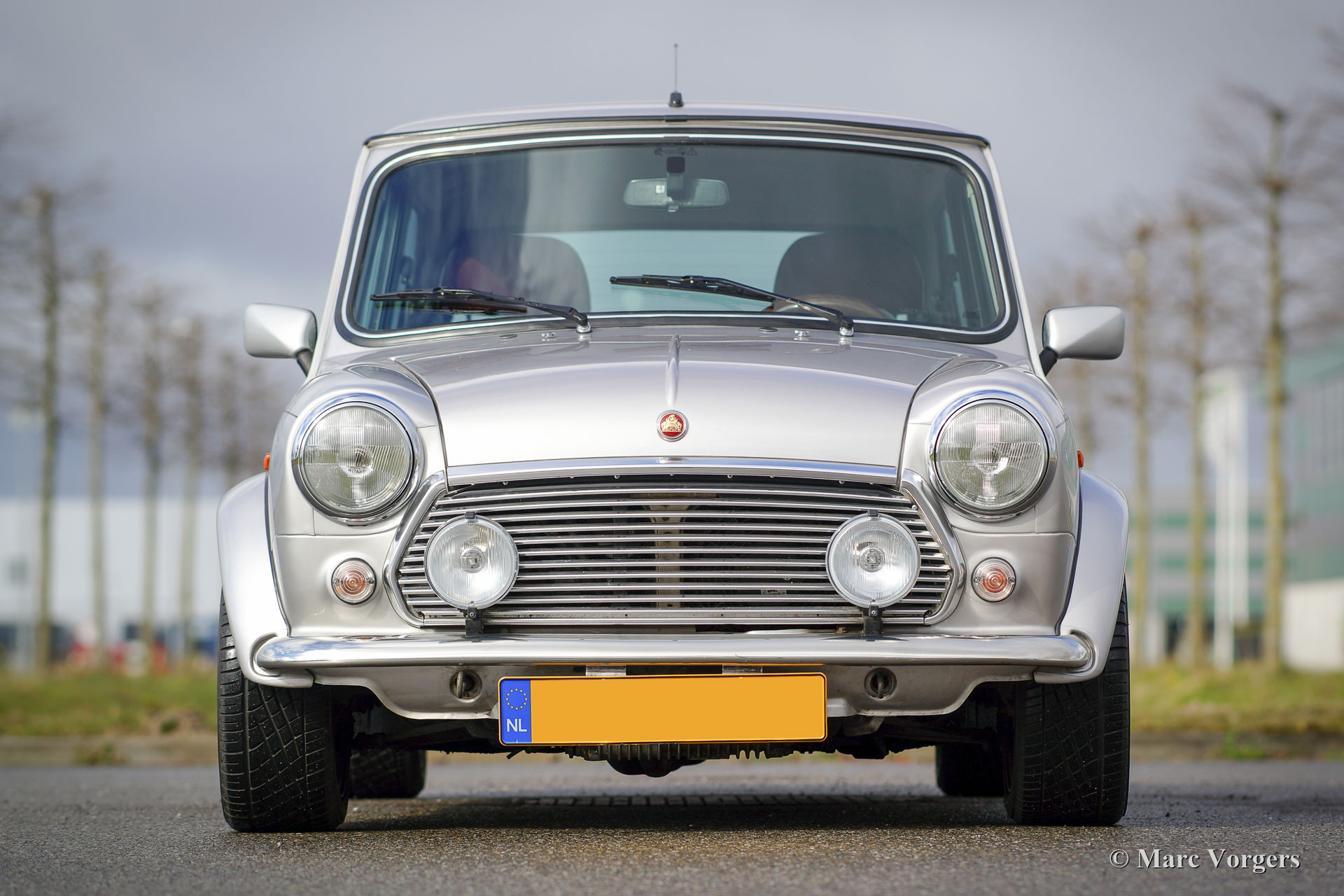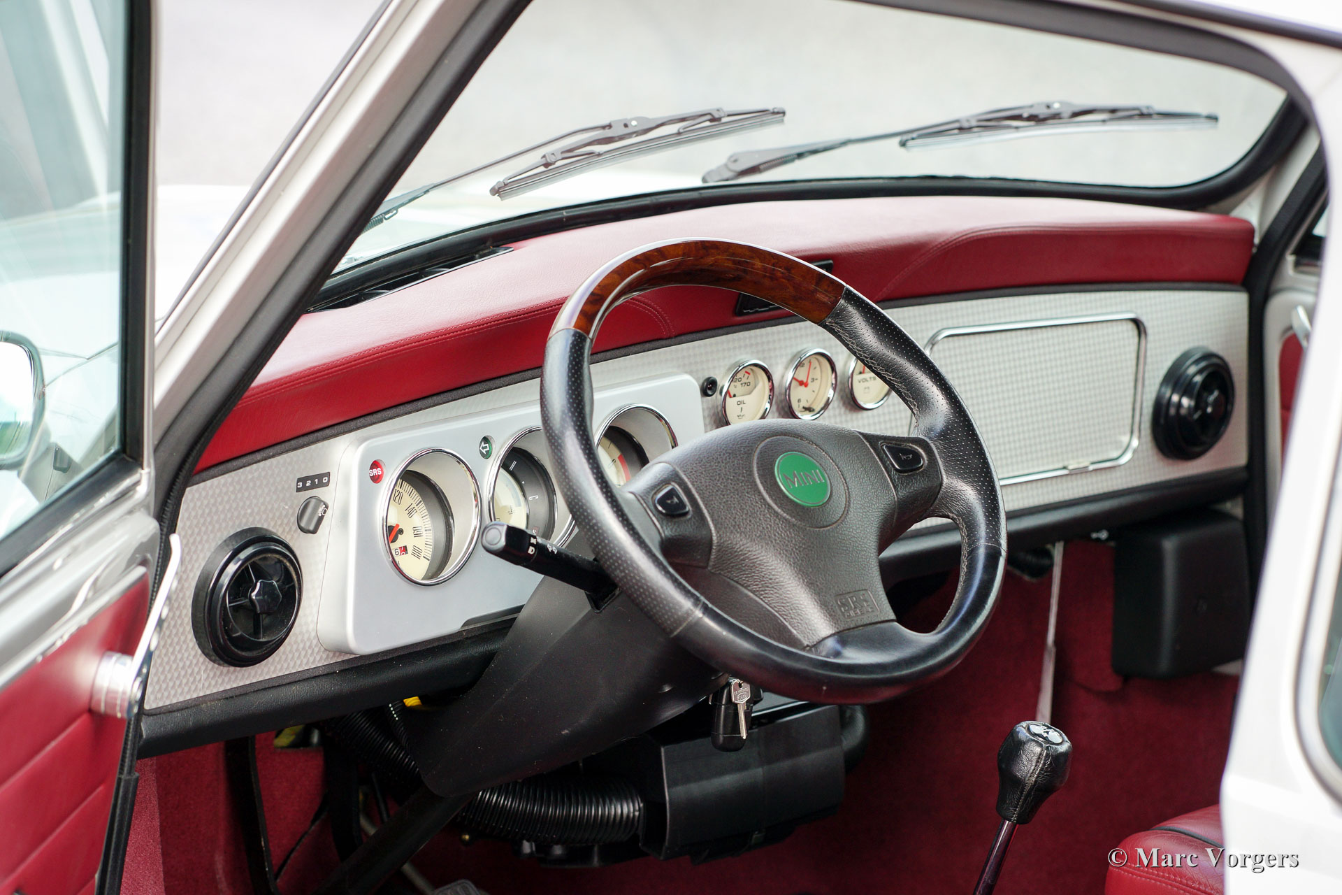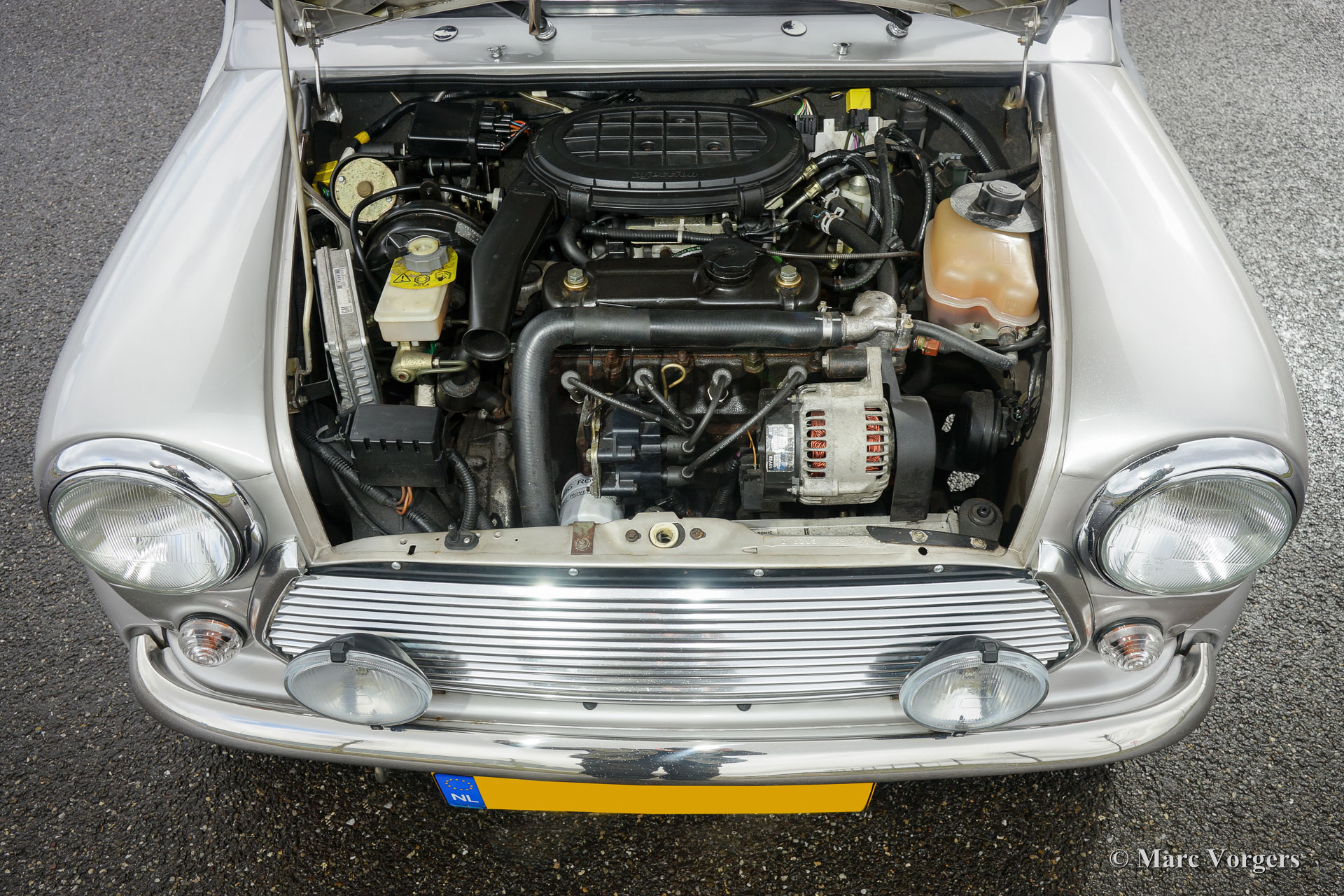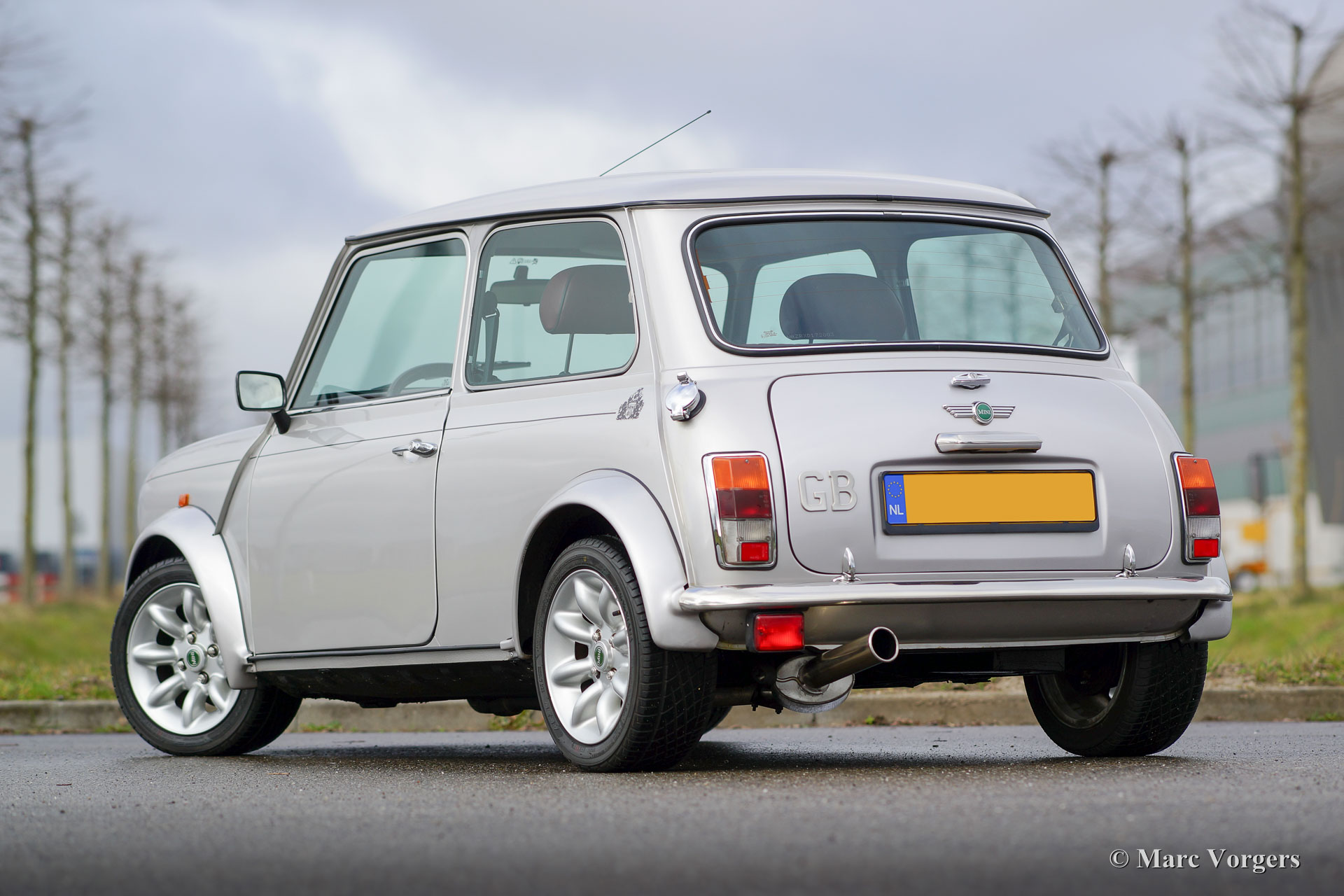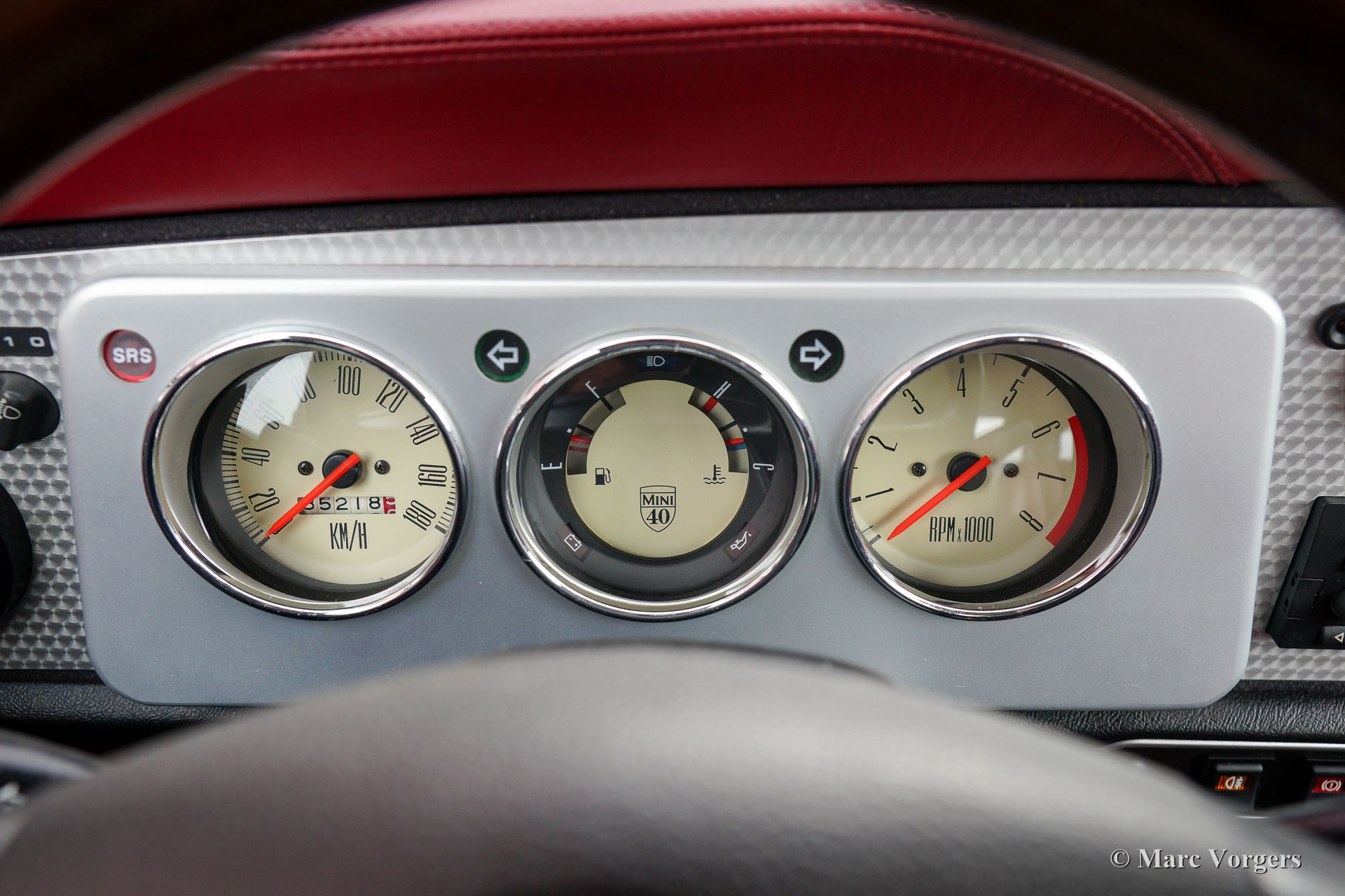 Rover Mini 40th Anniversary, year 2001. Colour Platinum silver metallic with a Burgundy red leather interior and red carpet. This fantastic Mini was imported from Germany to the Netherlands in the year 2003. The automobile is in superb original condition and the car drove only 35.000 km from new! This fine Mini 40th Anniversary shows very nice details like a polished aluminium dashboard, aluminium door handles and special ‘magnolia’ dashboard instruments with the 40th logo. The exterior features special flared wheel arches, wide light alloy wheels, special 40th badges and a ‘GB’ badge on the rear which is original for this model. This is a very rare Mini, only 800 examples have been built in seven colours. The car was given new tyres all round a few months ago. The car comes with a Dutch instruction manual.