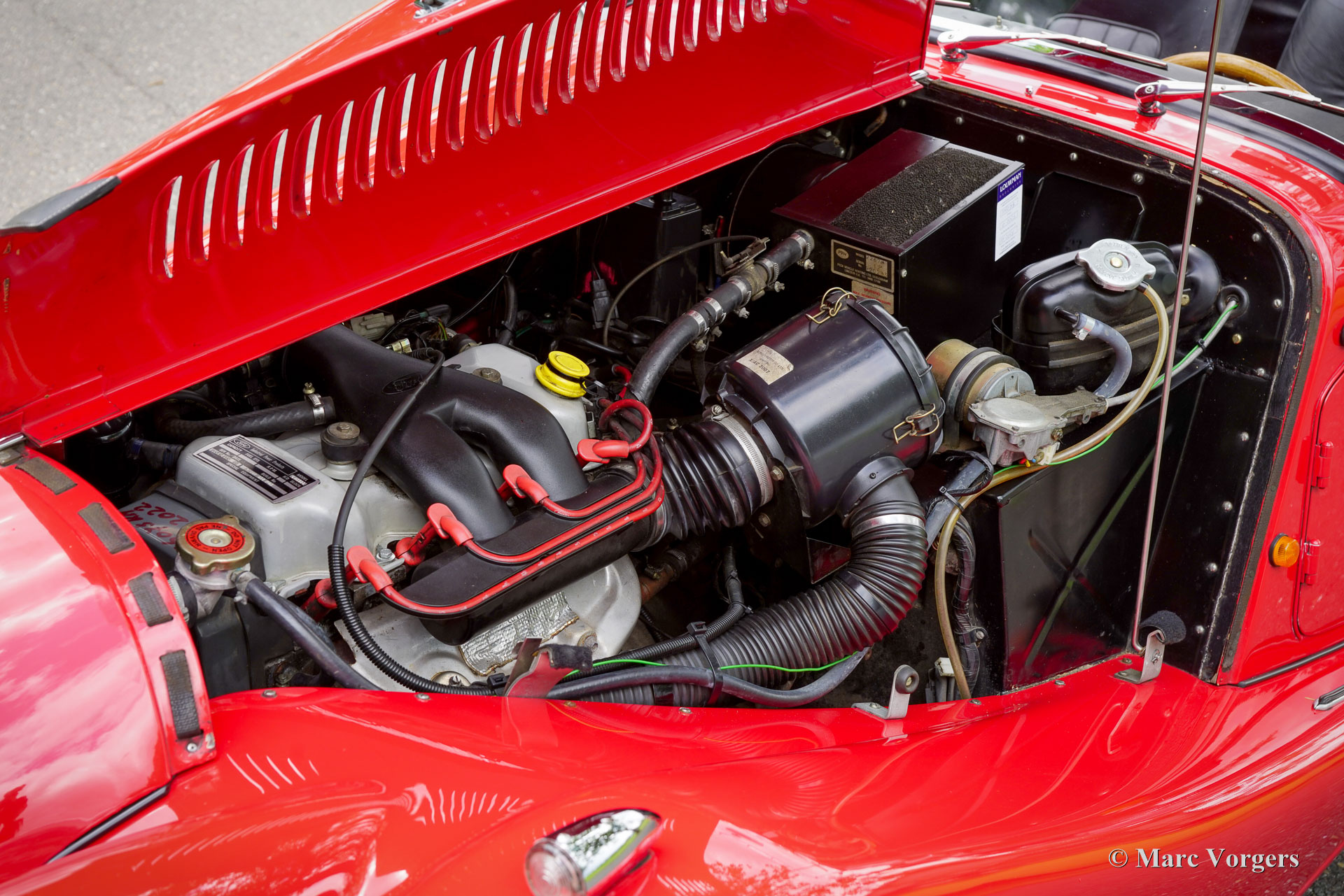 The Morgan 4/4 was built for over 50 years. The first model, introduced in the year 1936 was the 4/4 with flat radiator which was built until the year 1951. After a four year break (only the Morgan plus 4 was built those years) the Morgan 4/4 was going to be rebuild. The car did not change a lot (conservative as they are at the Morgan company), only the shape of the radiator changed from flat to cowled. Morgan never built their own engine, the early flat radiator cars were powered by Standard or Ford engines. The cowled radiator models were powered by Ford engines. The Ford engine used was known as the "Kent" engine and was also used in Fords Cortina model. Morgan 4/4 1600 cars were powered by the 1599 cc. Ford Kent engine which had a standard capacity of 98 bhp. giving the light car (two seater 660 kg./ four seater 785 kg.) sporty performance. The cars were fitted with a four speed manual gearbox. The modern Morgan 4/4 models are powered by a Ford Zetec 16V engine. These cars feature petrol injection and a five speed manual gearbox. The Morgan 4/4 is a very special car to drive because it has it's own strong character. It cannot be compared with any other roadster or convertible.
