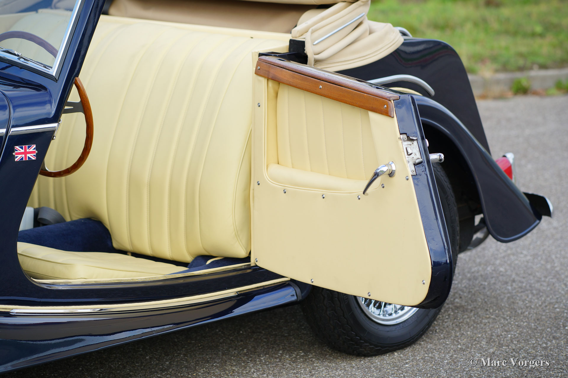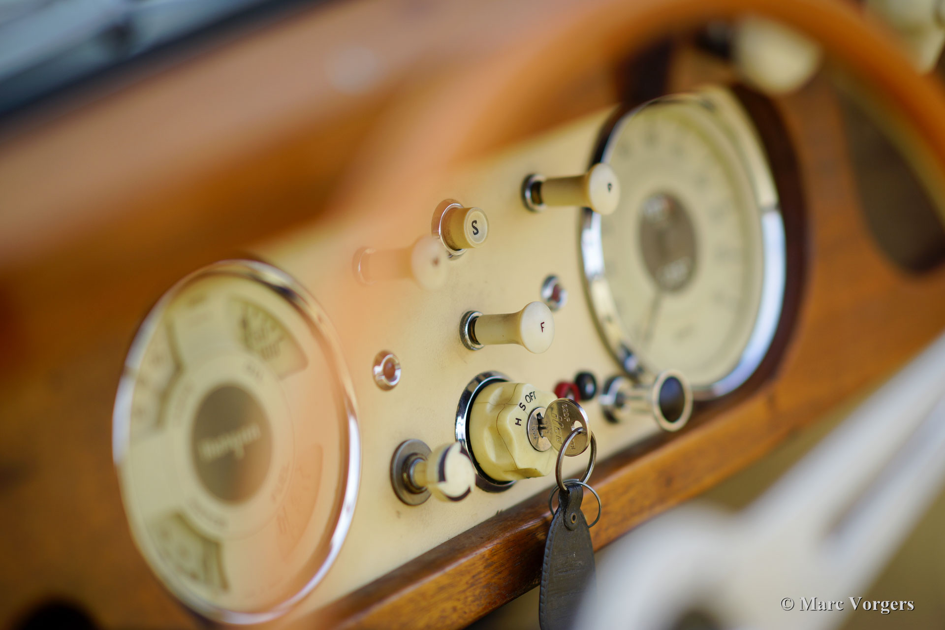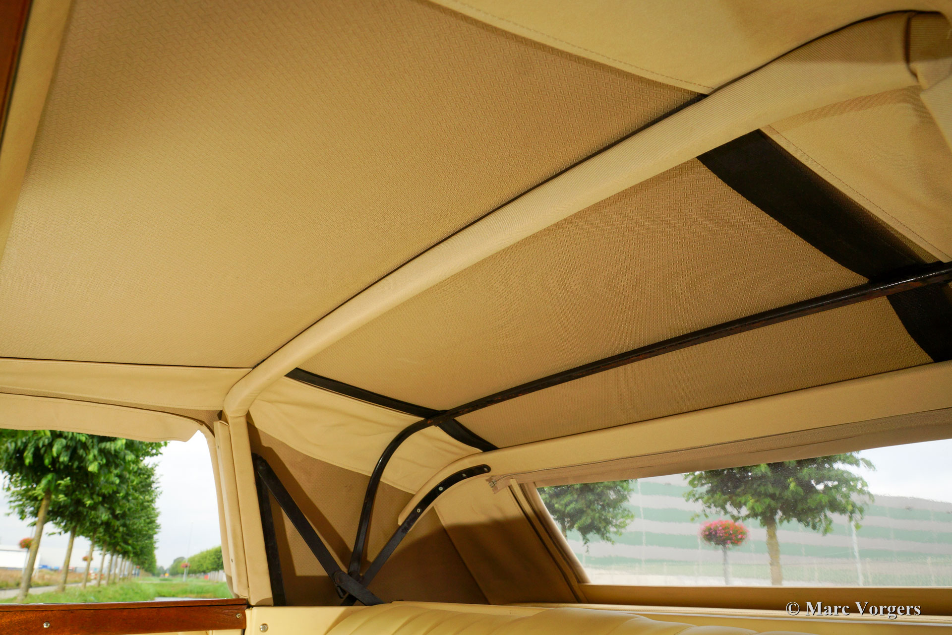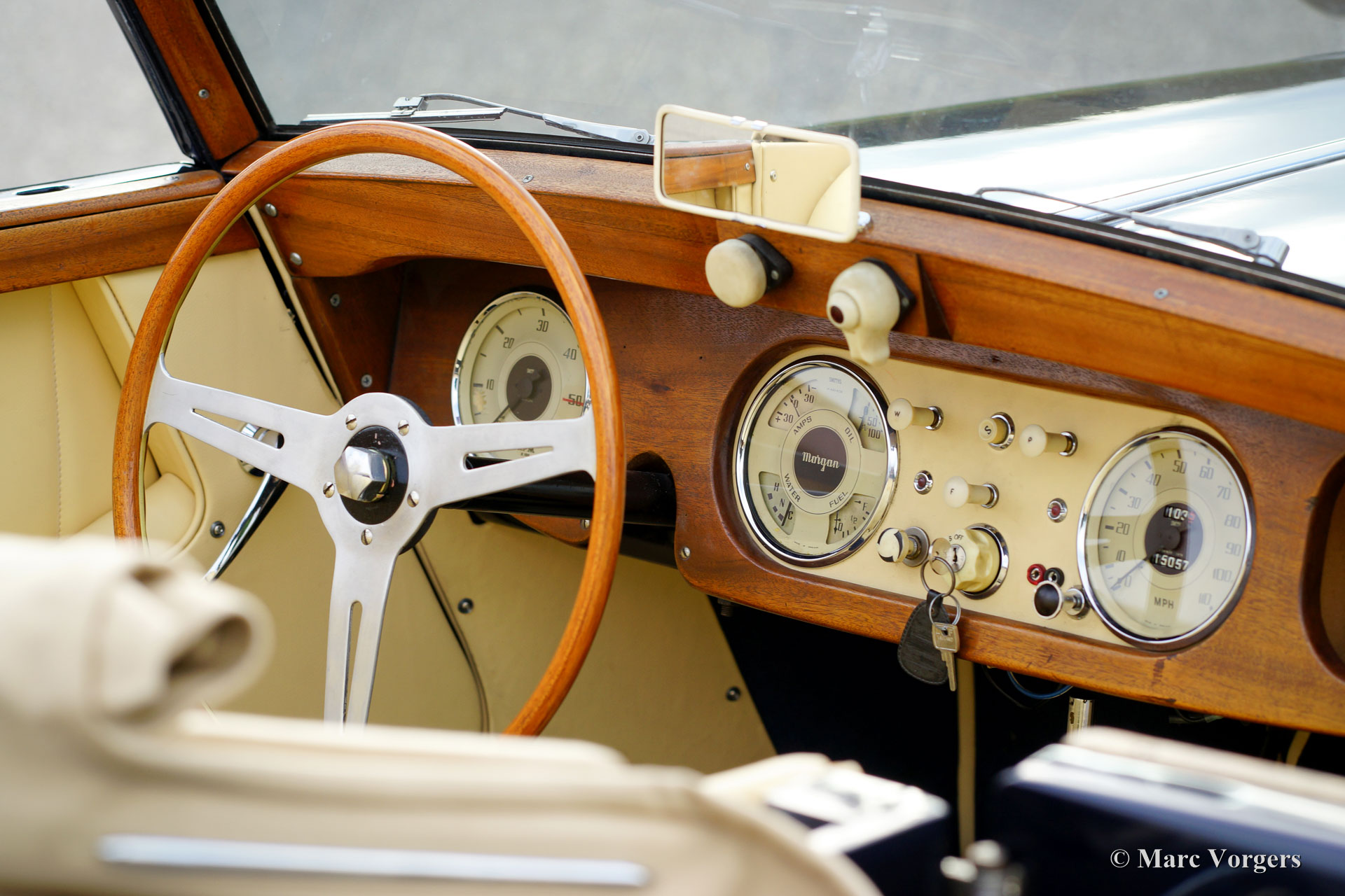 Morgan +4 DHC, year 1961. Colour dark blue with a beige leather interior and blue carpet. Beige mohair hood. This rare Morgan +4 Drop Head Coupe (DHC) was imported from the USA to the Netherlands in the past. In recent years the automobile was restored; the car is in excellent condition! This Morgan DHC drives absolutely perfect. The rugged and strong Triumph TR 4 2.2 Litre engine gives the car a sporty character. The rather high DHC waistline gives the driver and passenger a cosy and delightful semi-enclosed feeling, very different from the very open +4 ‘roadster’. This fine Morgan features chrome wire wheels, a chrome luggage rack, chrome side screens and disc brakes at the front wheels. These very special Morgan DHC models are rarely for sale, this is your chance to purchase an excellent specimen!