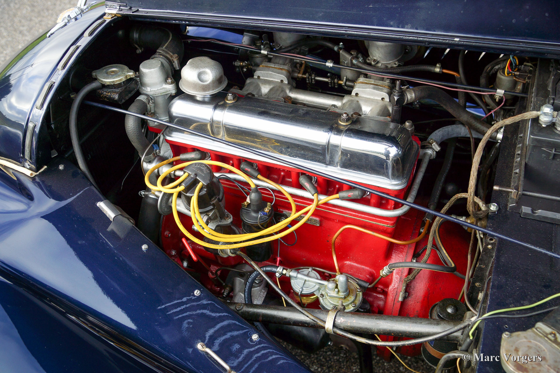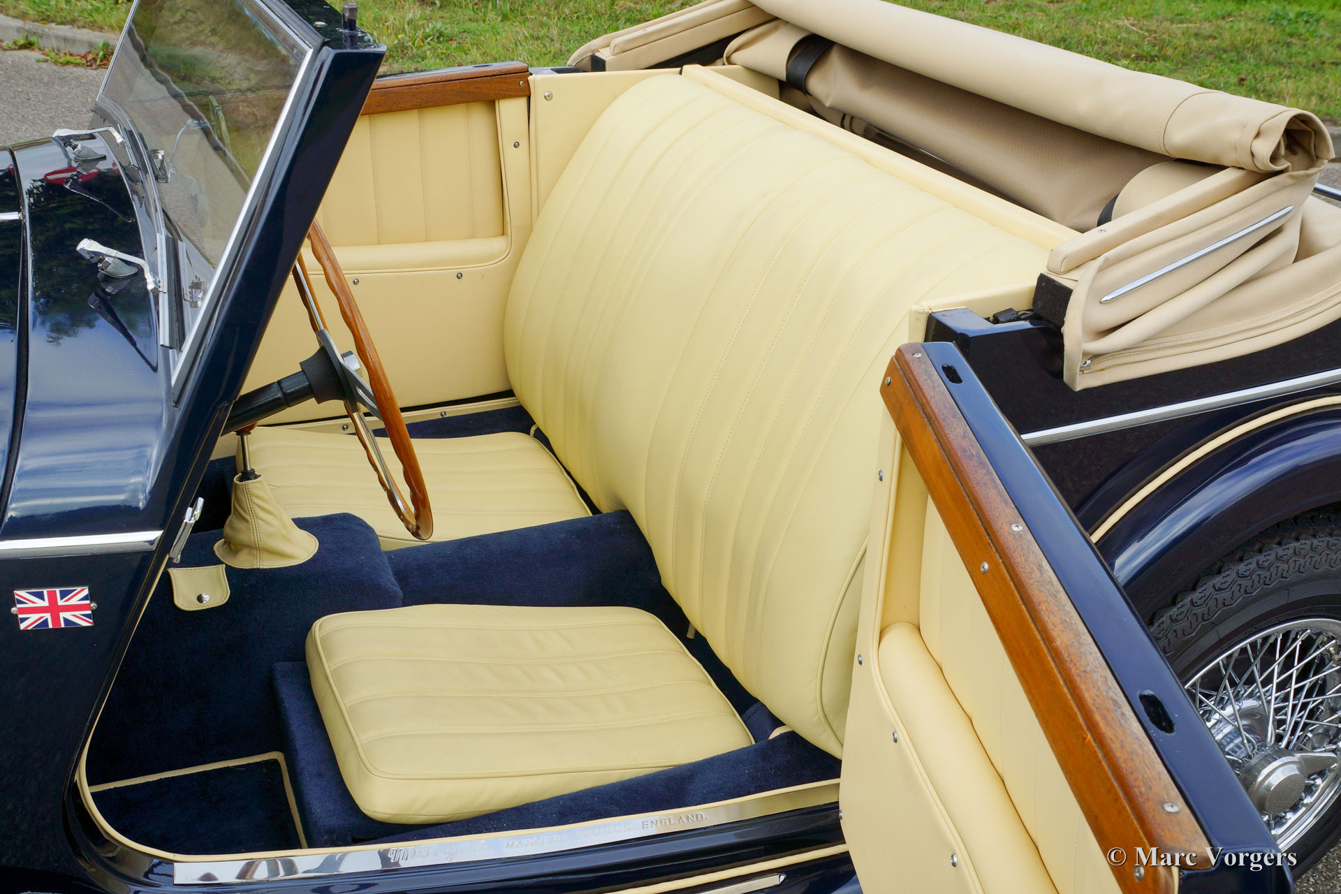 The Morgan 4/4 was built for 50 years. the first model, introduced in the year 1936 was the 4/4 with flat radiator which was built until the year 1951. After a four year break (only the Morgan plus 4 was built those years) the Morgan 4/4 was going to be rebuild. The car did not change a lot (conservative as they are at the Morgan company), only the shape of the radiator changed from flat to cowled. Morgan never built their own engine, the early flat radiator cars were powered by Standard or Ford engines. The cowled radiator models were powered by Ford engines. The Ford engine used was known as the "Kent"engine and was also used in Fords Cortina model. Morgan 4/4 1600 cars were powered by the 1599 cc. Ford Kent engine which had a standard capacity of 98 bhp. giving the light car (two seater 660 kg./ four seater 785 kg.) sporty performance. Drivers who wanted additional torque and power were offered the Triumph TR four cylinder engine which offered a power output of 96 bhp. (TR3) or 105 bhp. (TR4). These cars were named Plus four. The four speed gearbox was fully synchronized. The Morgan 4/4 is a very special car to drive because it has it's own strong character. It cannot be compared with any other roadster or convertible.