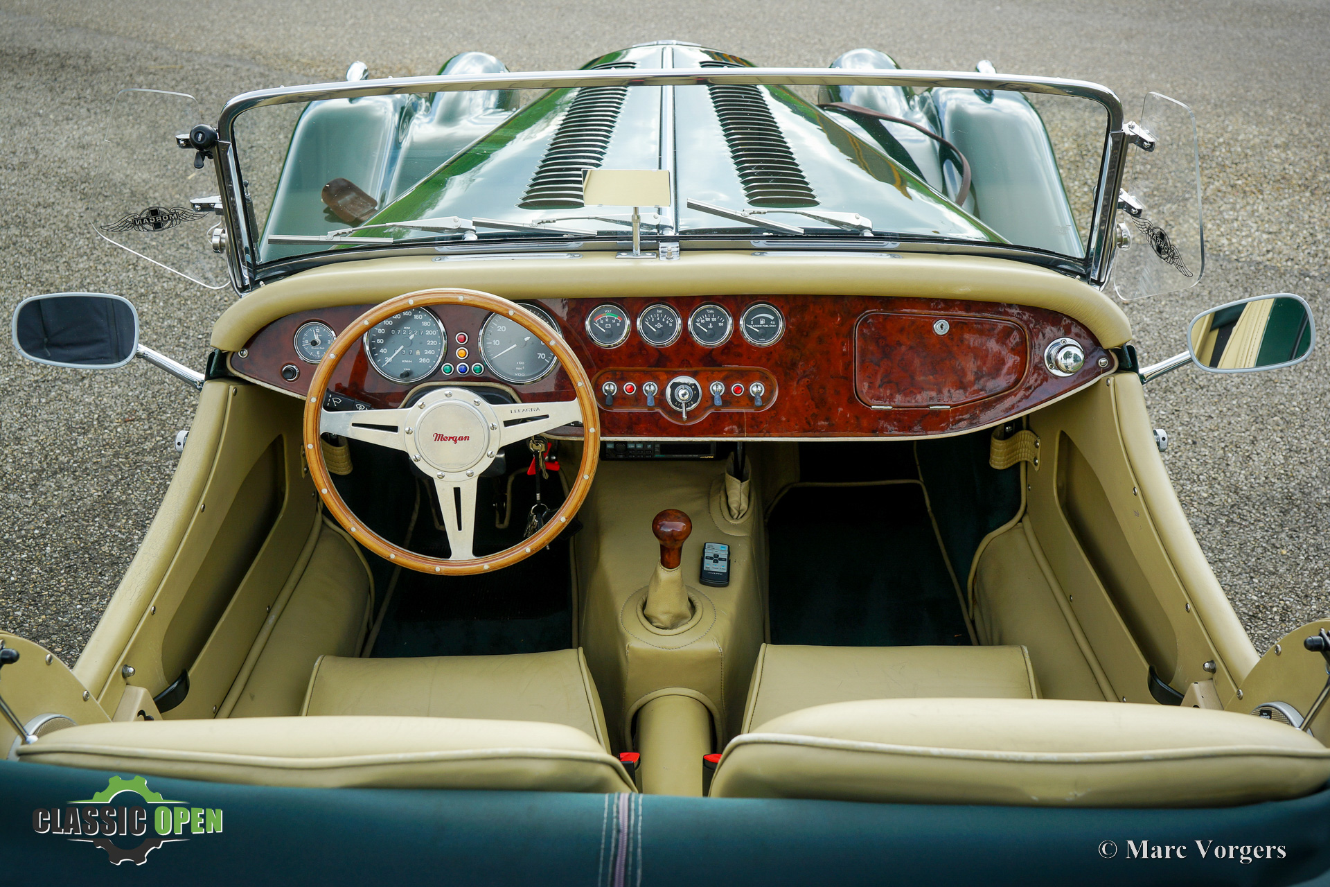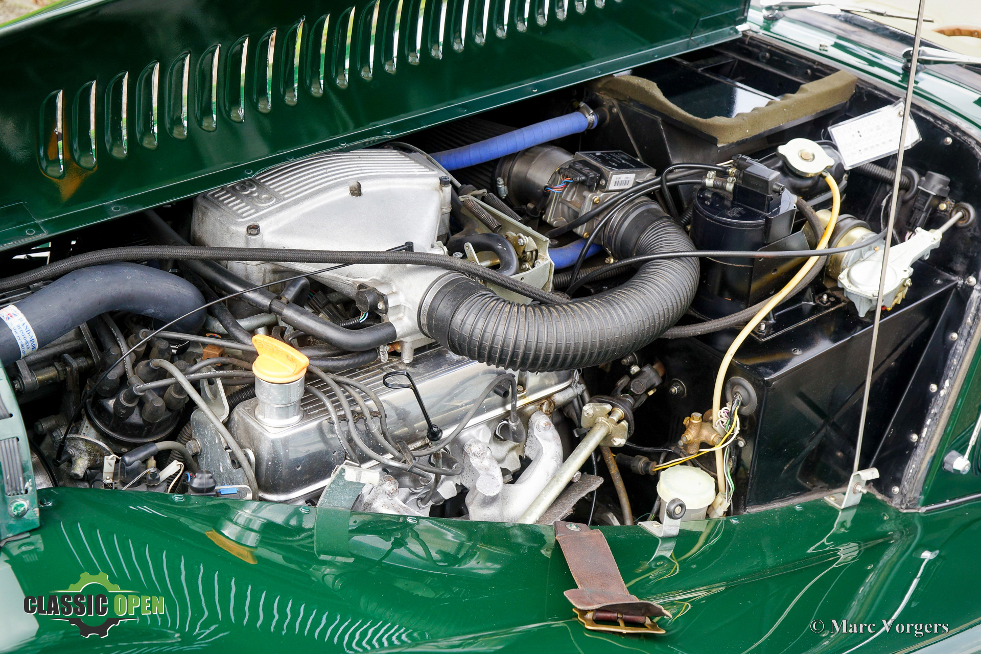 Morgan +8 3.9 Litre, year 1996. Colour British Racing Green combined with a light beige leather interior and green carpet. Green mohair soft top and green side screens. This fabulous Morgan +8 is a very desirable 1990s version fitted with the 3.9 Litre fuel-injected Rover V8 engine. The engine delivers 190 DIN bhp and 312 Nm of torque… A guarantee for swift acceleration and a lot of fun considering that the Morgan only weighs 850 kilogrammes. The power is transmitted to the rear wheels via a manually operated 5-speed gearbox. The interior is fully upholstered with leather and the dashboard is trimmed with a walnut wood panel. The gauges with chrome bezels complete the classy interior. The bonnet features two rows of cooling scoops through which you can see the hot air escape when standing stationary after a fantastic drive. The exhaust is fitted with a special tail piece which adds even more drama to the impressive exhaust note. This wonderful morgan +8 is in an excellent to superb original condition, the car drove only 72.230 kilometres from new. The car is fitted with chrome wire wheels shod with 205/17-15 tyres, a leather belt over the bonnet, additional spot lamps at the front, a badge bar complete with badges, a Stainless-Steel baggage rack and a green mohair spare wheel cover. This is a very desirable Morgan +8 in a fantastic condition! A wonderful find for the Morgan enthusiast.