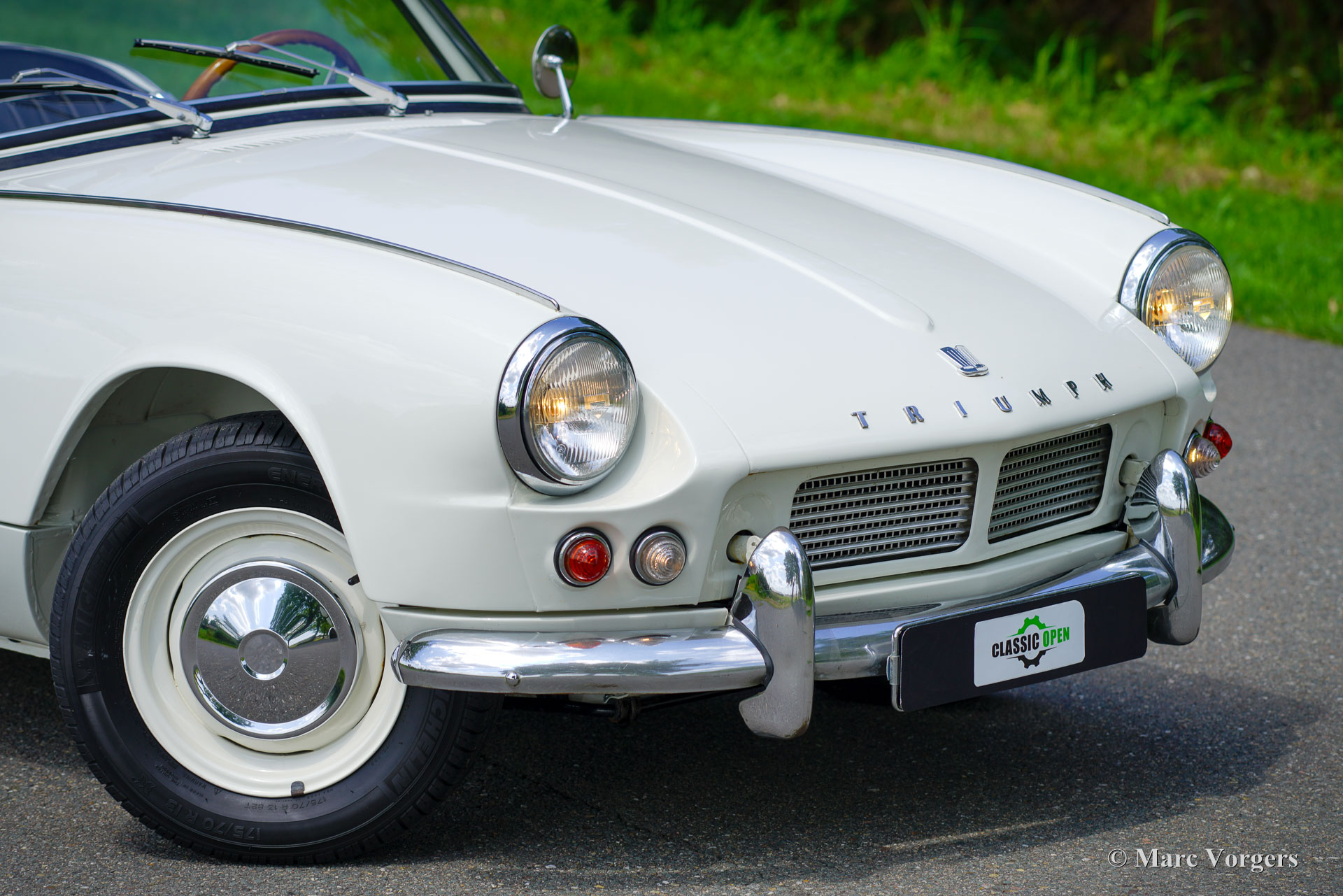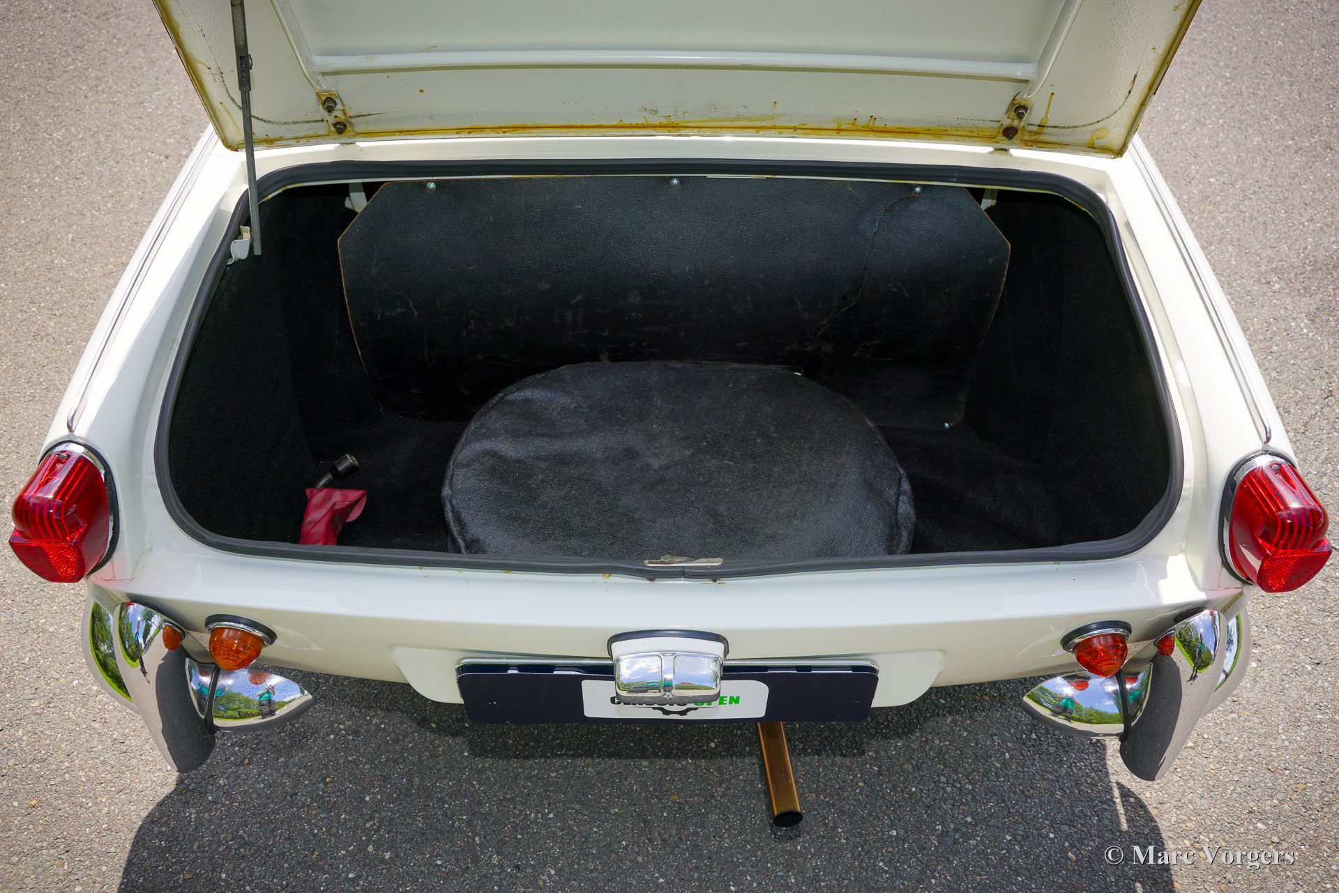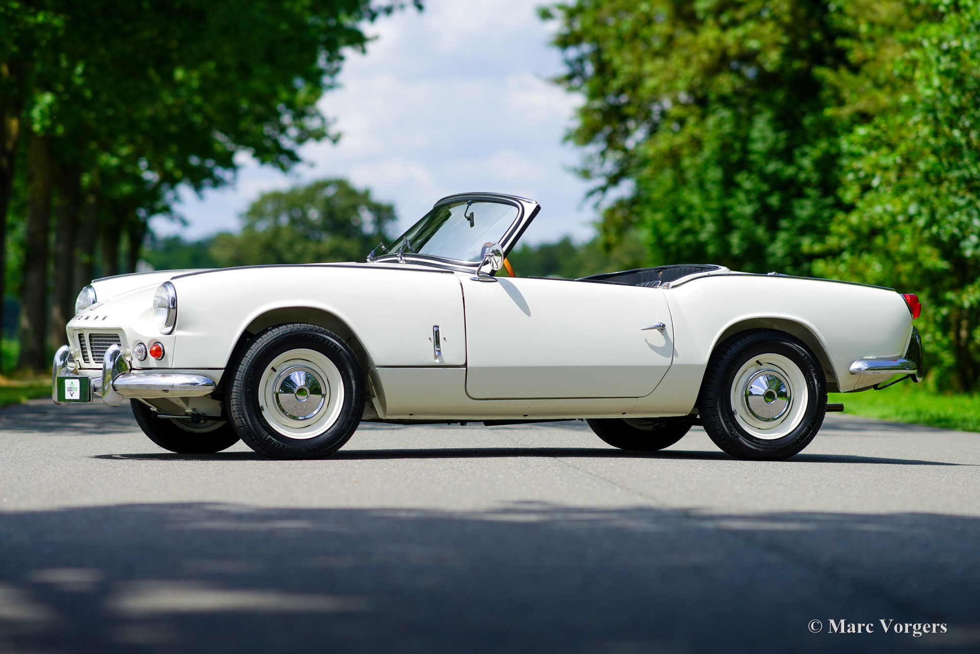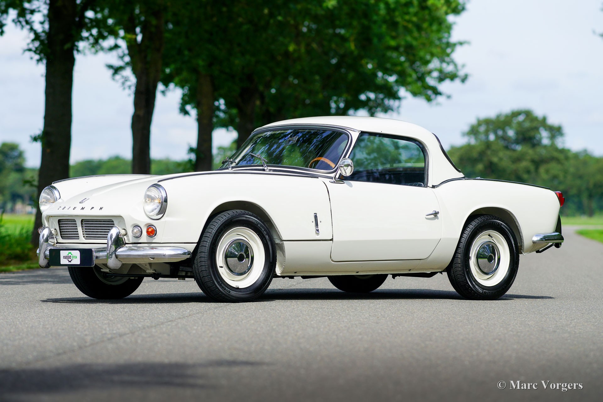 Triumph Spitfire 4, year 1964. Colour Old English White combined with black leatherette interior and black carpet. Black vinyl soft top and a hard top in body colour. The Triumph Spitfire was designed by the famous Italian designer Michelotti. The Spitfire 4 was the first model built between 1962 and 1965 and was retrospectively named Mk I. This beautiful example was ‘body-off’ restored, and the car has driven only 3800 kilometres since the restoration was completed. This Spitfire is in a very good to excellent condition, here and there slight signs of use can be found. The Spitfire drives and handles very well. The hollow spaces and seams of the bodywork and the bonnet are protected against corrosion with Waxoyl/ML type brown wax. The 1147 cc four-cylinder engine features two S.U. carburettors, and the engine delivers a healthy 63 bhp. The four-speed gearbox shifts beautifully and is fitted with the very desirable overdrive option! This Spitfire 4 shows all the original details including the original steering wheel and the original steel disc wheels with chrome hub caps! The odometer reads in km/h. This magnificent Triumph Spitfire is a sought after early model complete with original hard top!