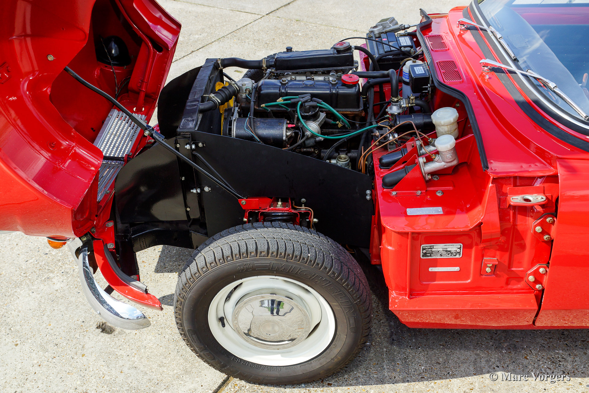 The Triumph Spitfire was equipped with an uprated four cylinder Triumph Herald engine. The engine was covered by a large bonnet enveloping the entire front of the car just like we see with the Jaguar E-type. The Spitfire was designed by the Italian designer Michelotti who had drawn the TR 4 and Triumph Herald too.