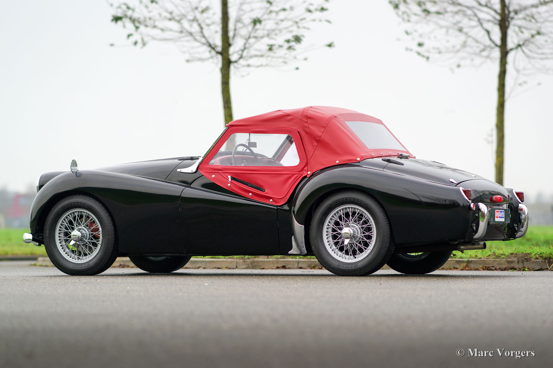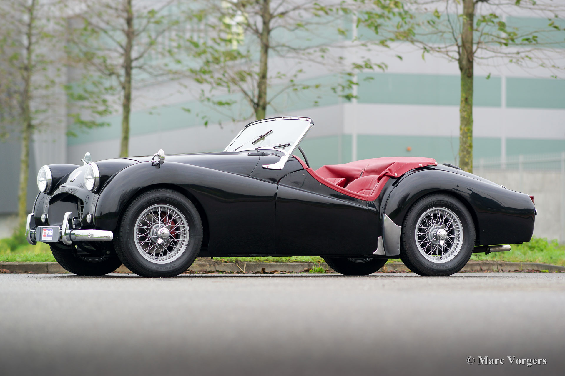 Triumph TR 2 ‘long door’, year 1954. Chassis number TS 112XX. Colour black with a red leather interior and black carpet. Red soft top and side screens, red tonneau cover. This rare Triumph TR 2 ‘long door’ was extensively ‘body off’ restored a few years ago. The automobile is in excellent condition! The car shows all details of the first TR model series including the long doors which cover the sills, the small Lucas rear lights and the cable operated hood/bonnet release. Also the cylinder head design differs from the later four cylinder TR’s. With this car the original drum brakes at the front wheels have been replaced by disc brakes from a TR 3a. This fine and rare TR 2 is fitted with enamelled wire wheels.